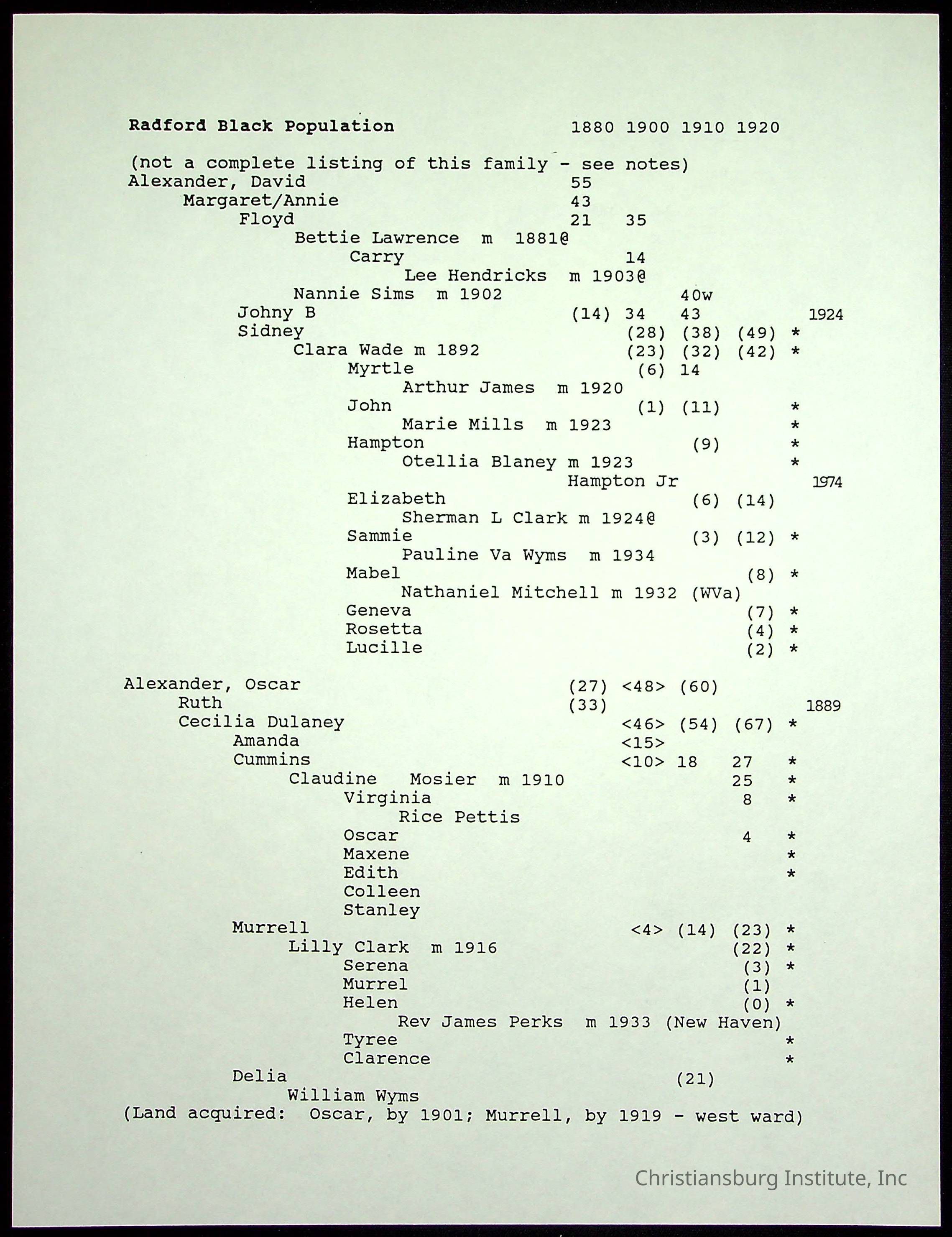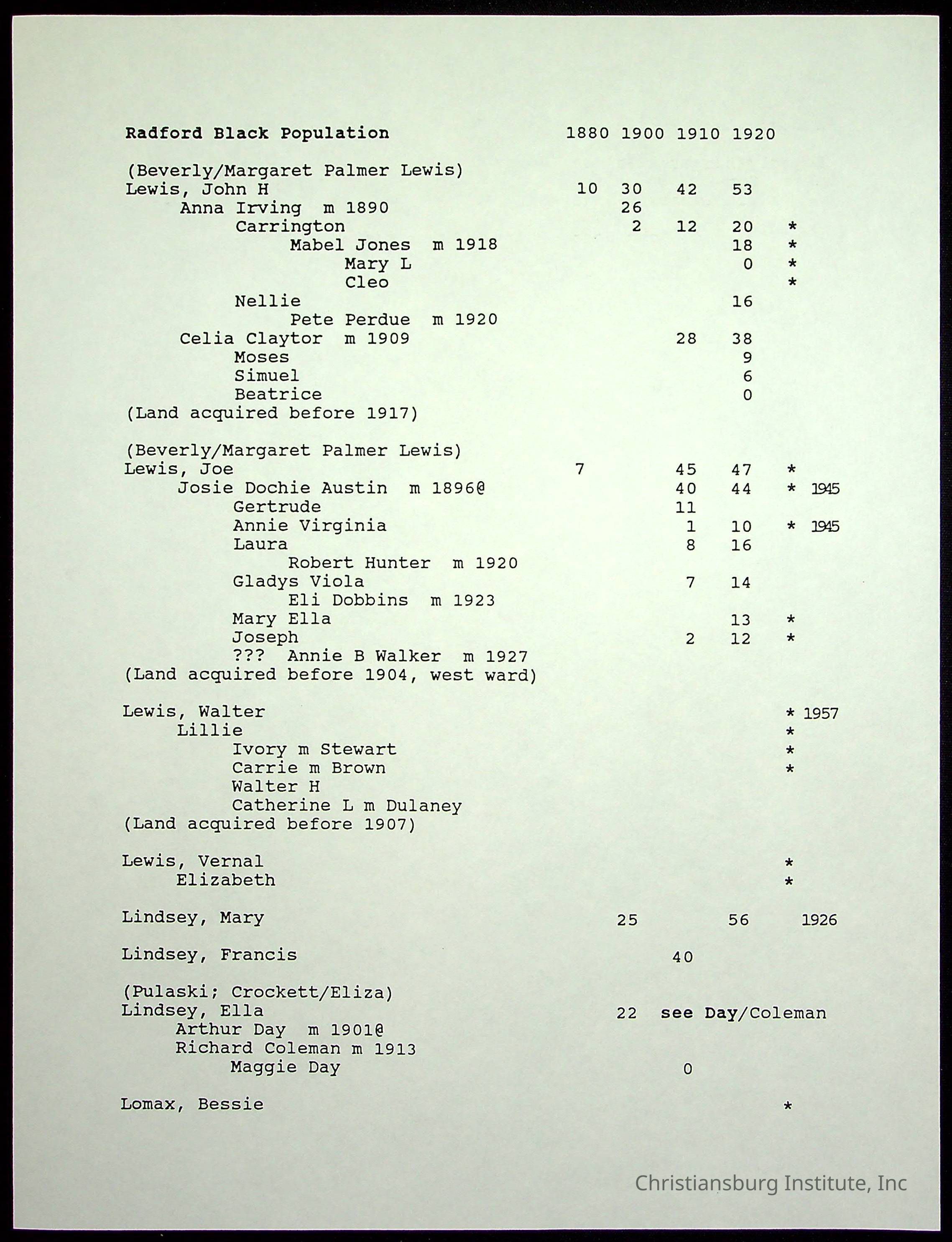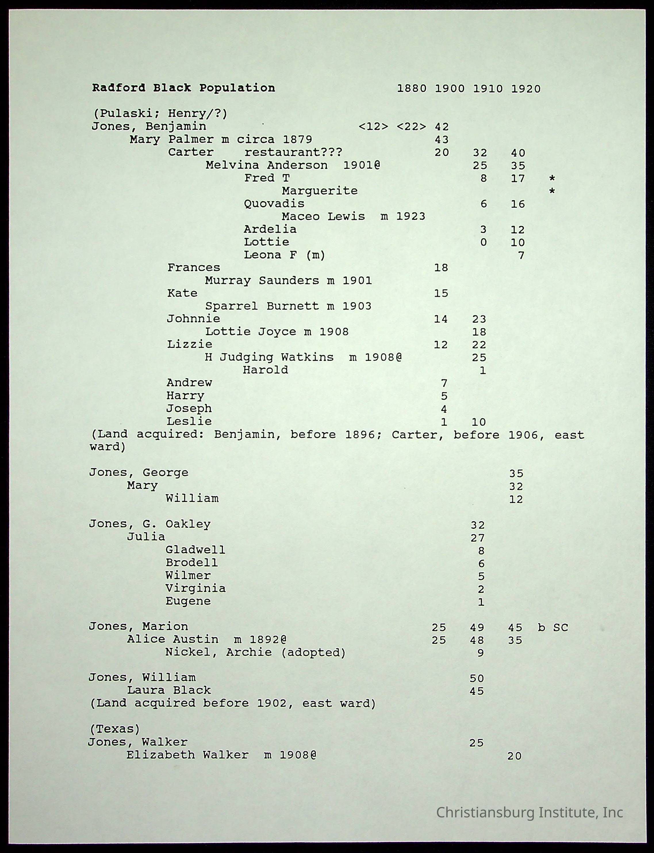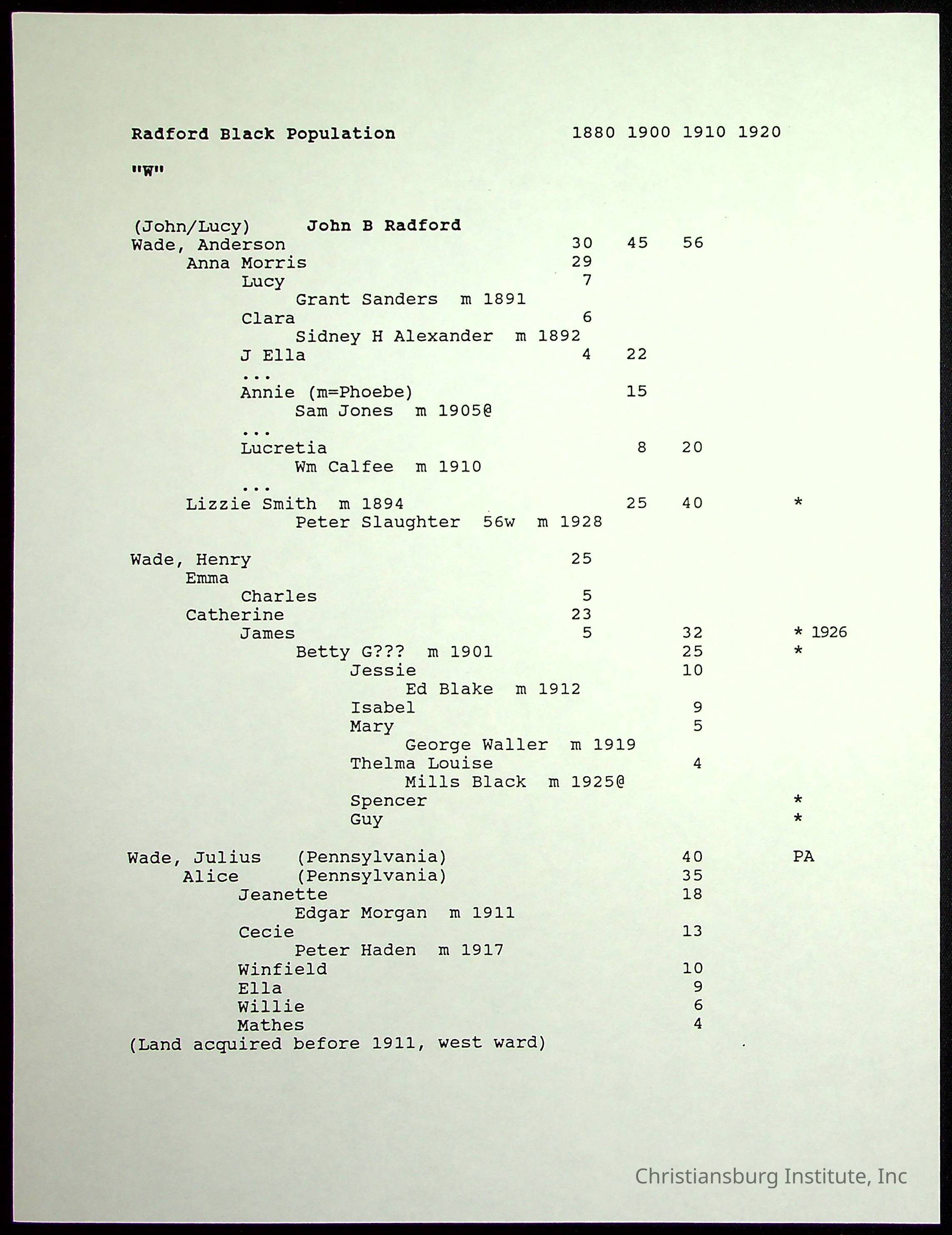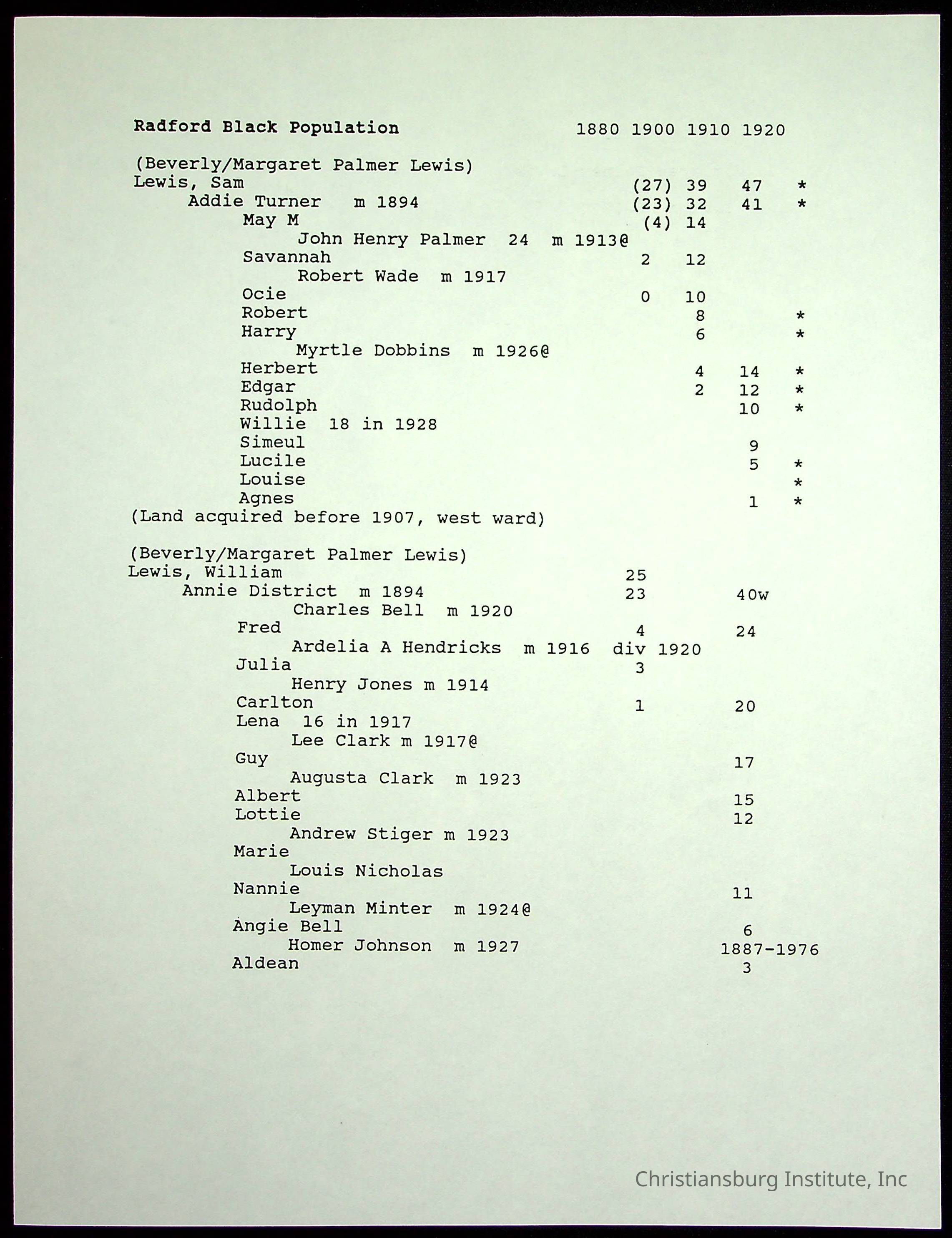 A folder of research materials collected by Radford University professor, Dr Linda Killen. This folder is titled 'Radford's Early Black Residents' and includes Killen's research on the Black population of Radford, Virginia. This research file includes census records.