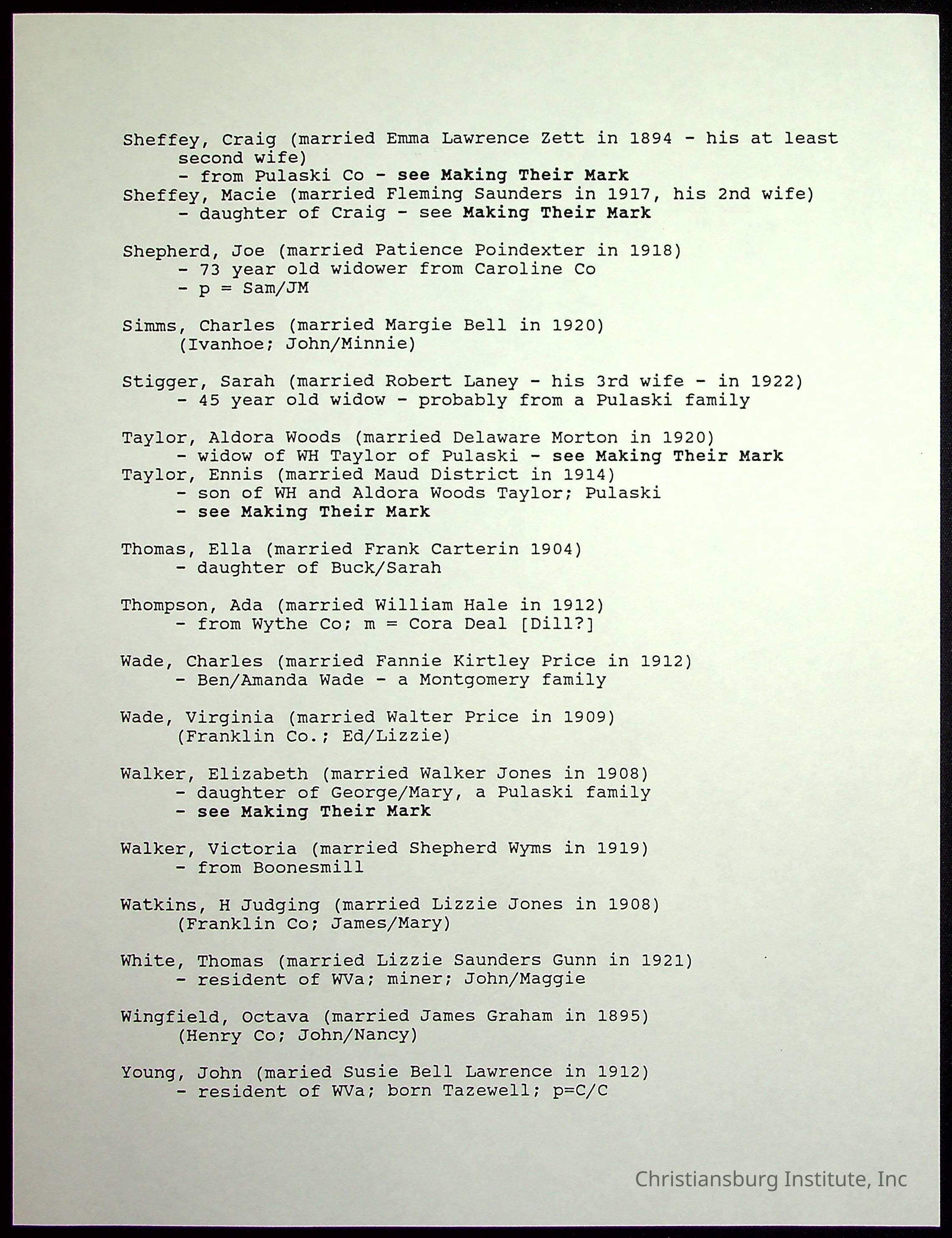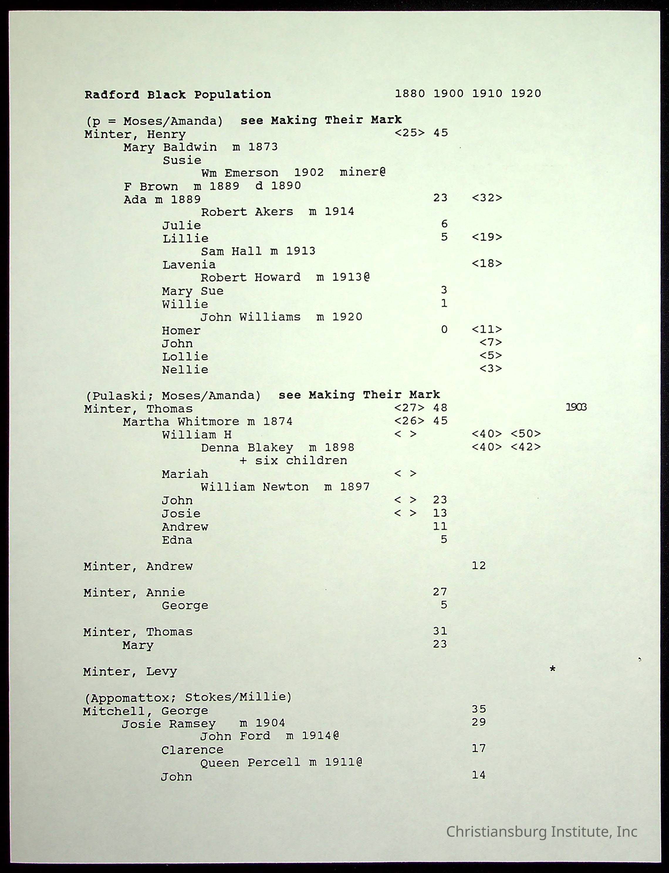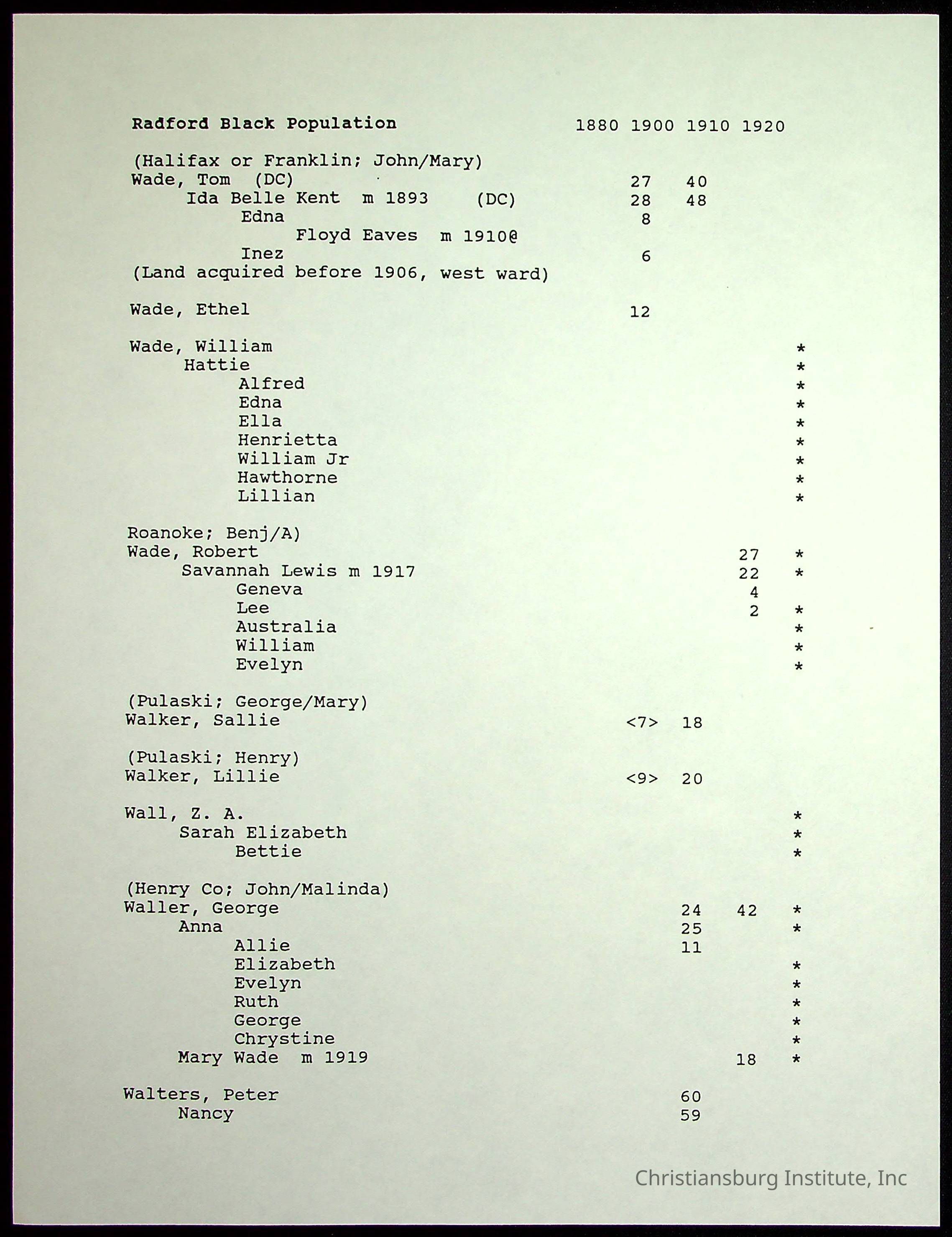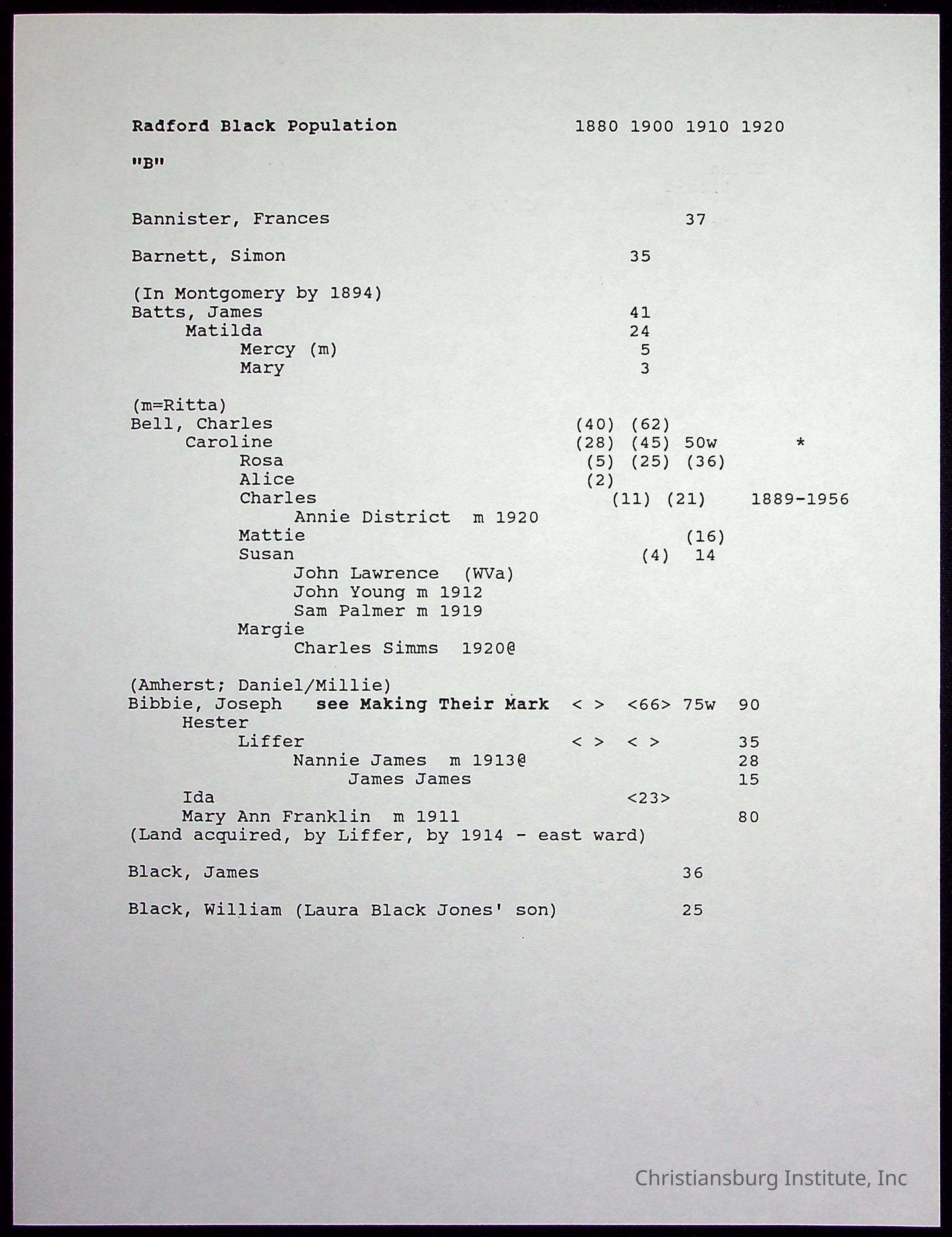 Farm Land, Boom Town, Village: A History of Belspring, Virginia, 1750-1940, The Reports of Charles S. Schaeffer from the Virginia counties of Montgomery and Pulaski, with additional information on the counties of Floyd, Giles, Craig, Wythe, and Roanoke., Ingles Ferry Ledgers (1840s-1880s), These people lived in a pleasant valley, Making their mark: Black Families of New River Depot, 1870-1940., Whartons’ Town New River Depot, 1870-1940., Radford’s Early Black Residents, 1880-1925