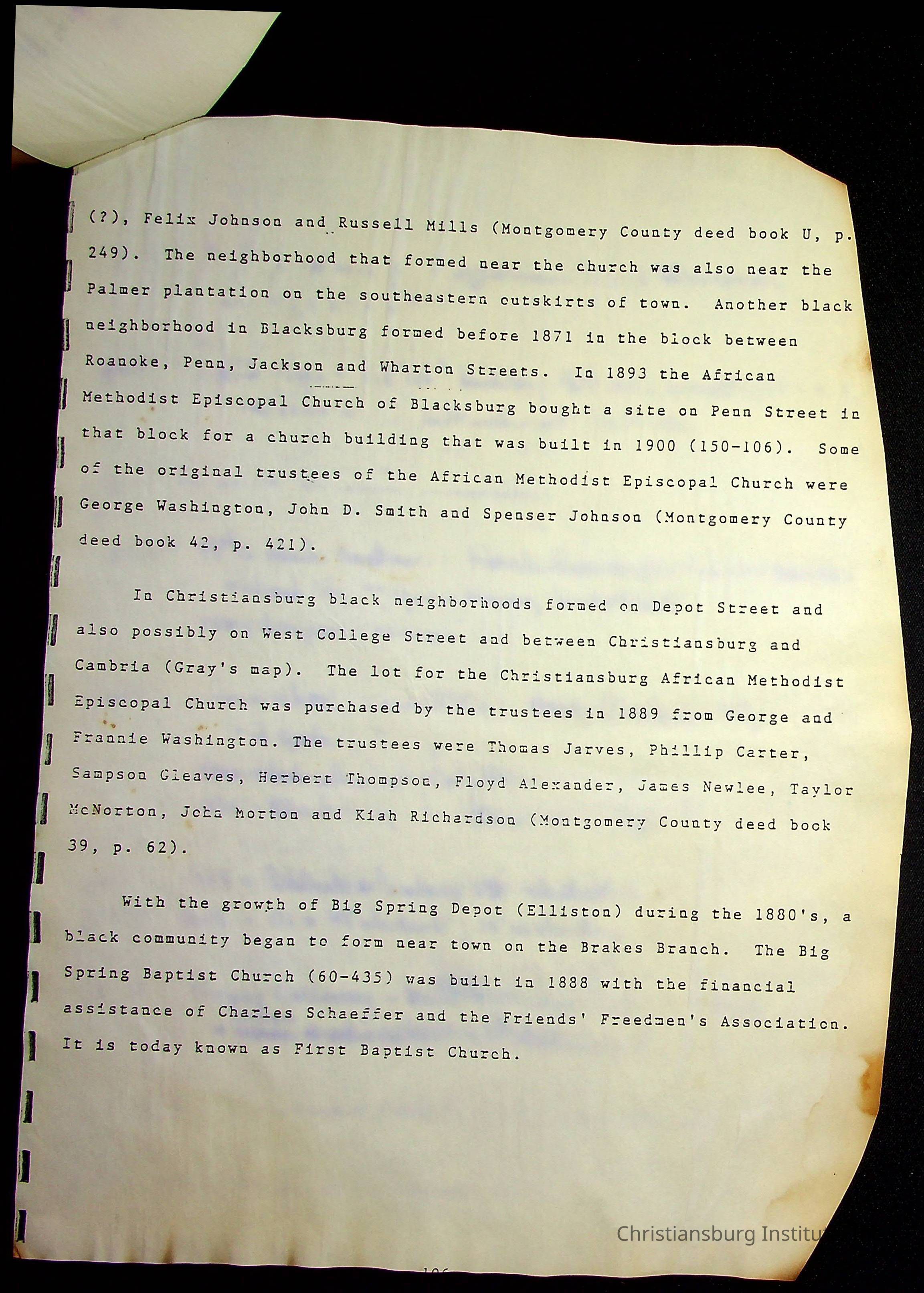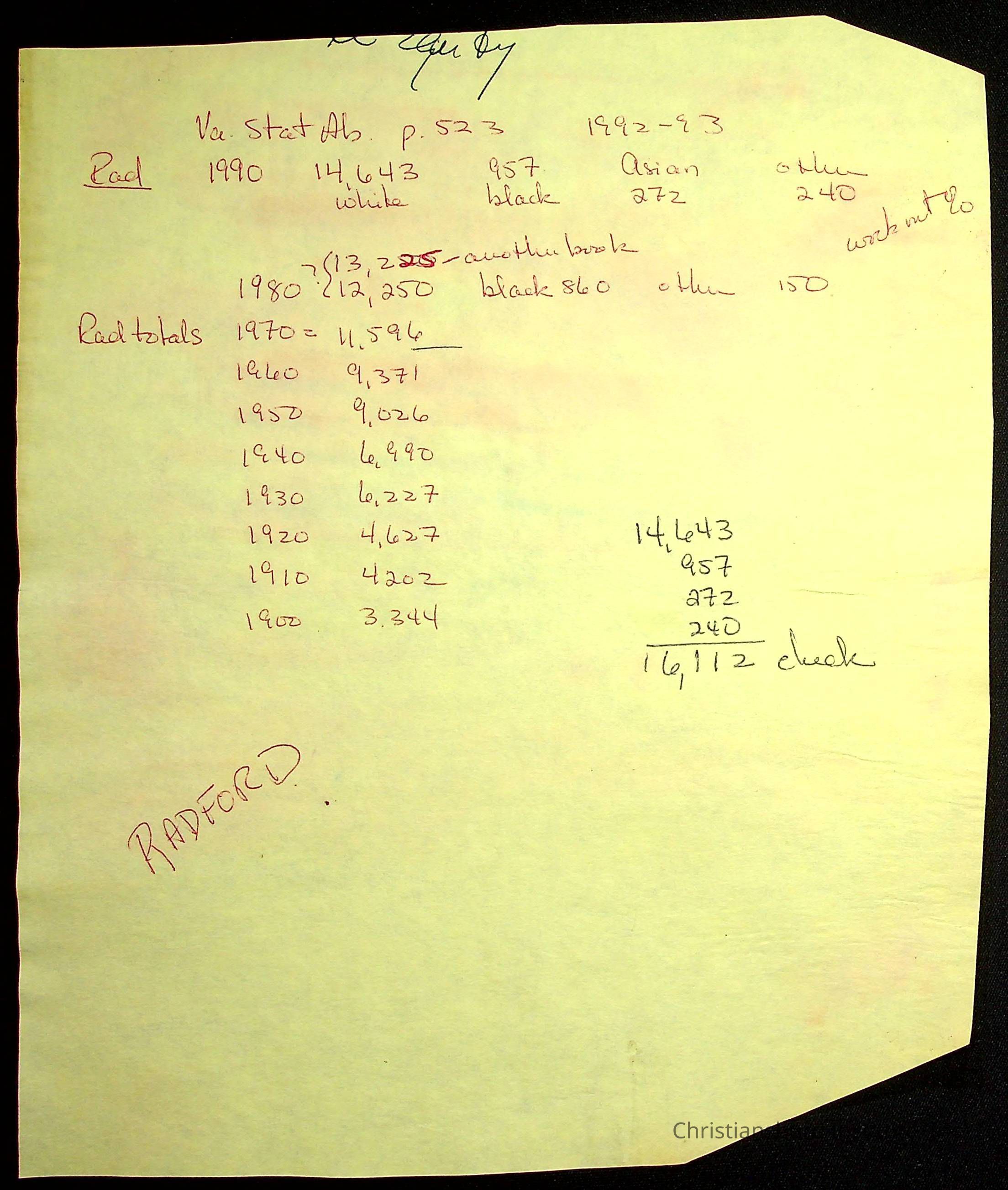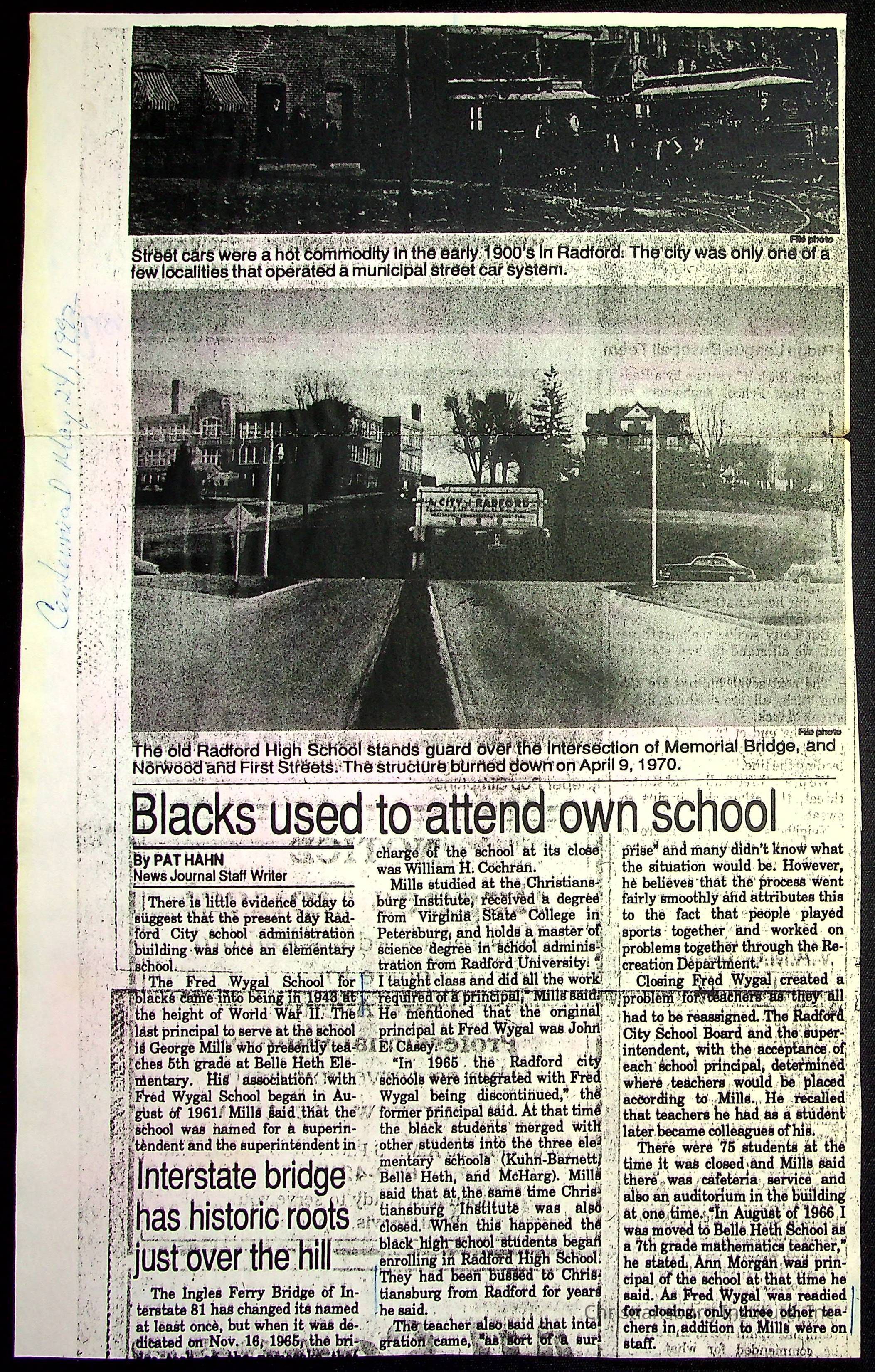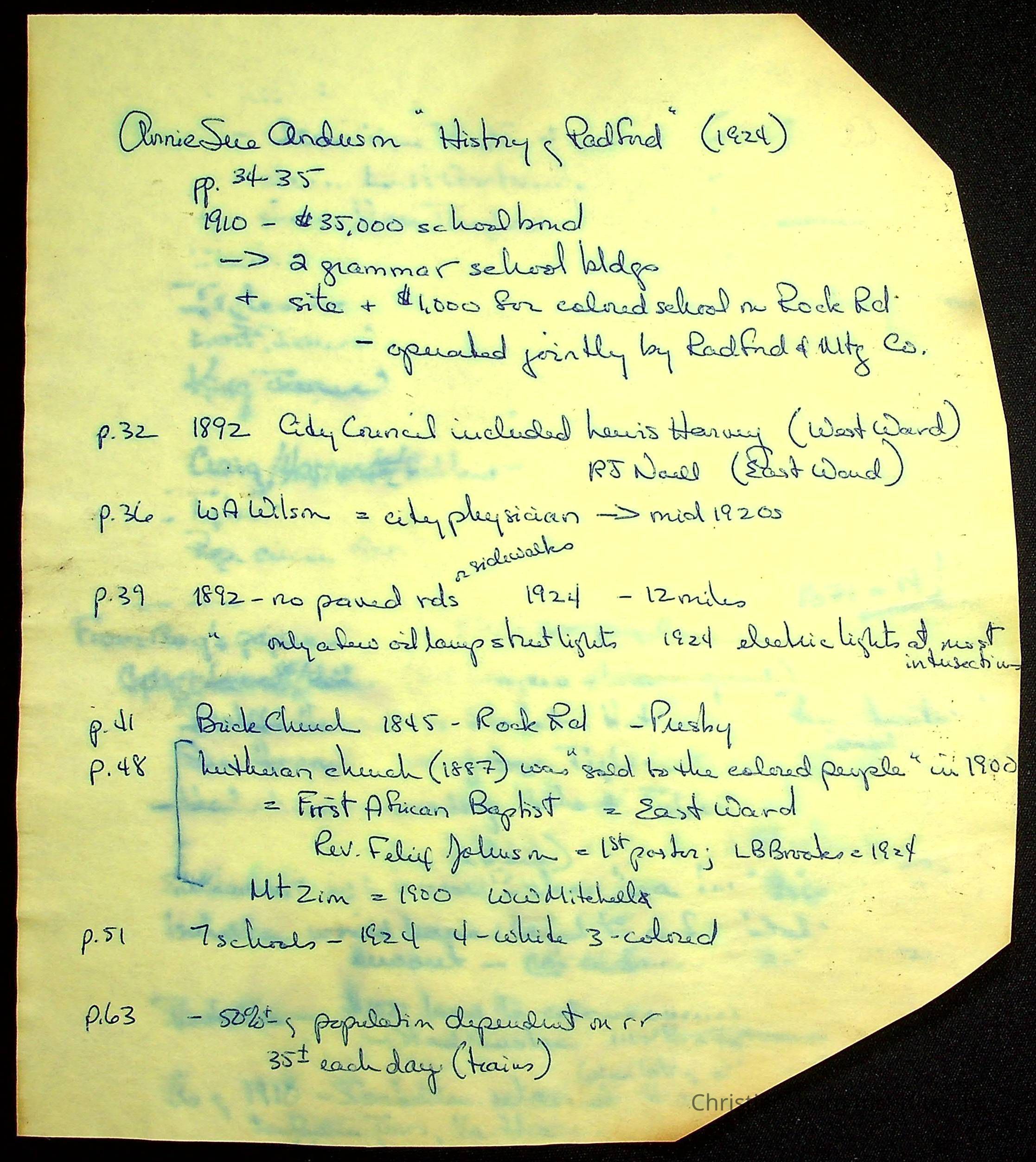 A folder of research materials collected by Radford University professor, Dr. Linda Killen. This folder is titled 'Miscellaneous Radford Black History' and includes various research conducted about Black history in Radford, Virginia. Please note: some of the documents were damaged by fire.