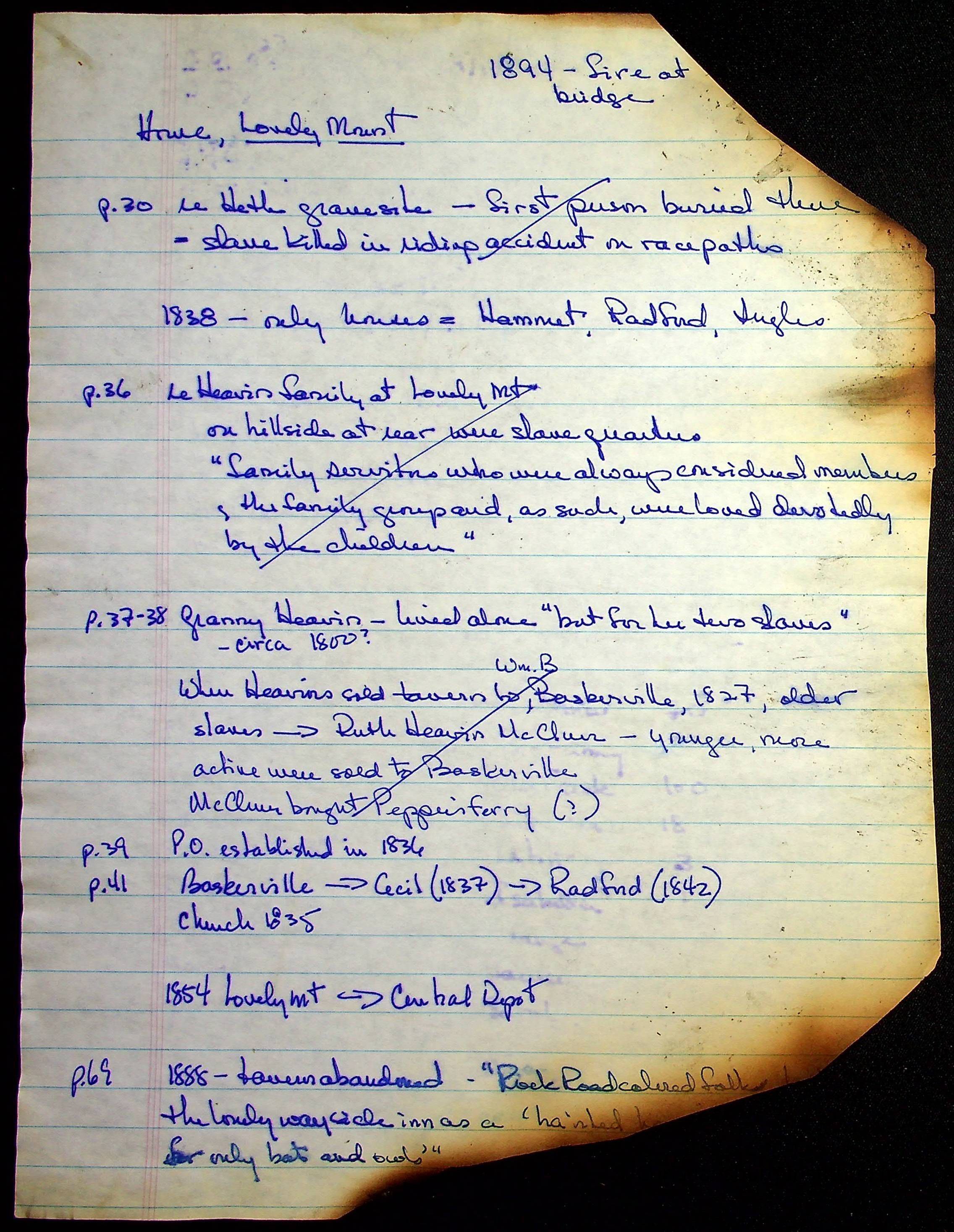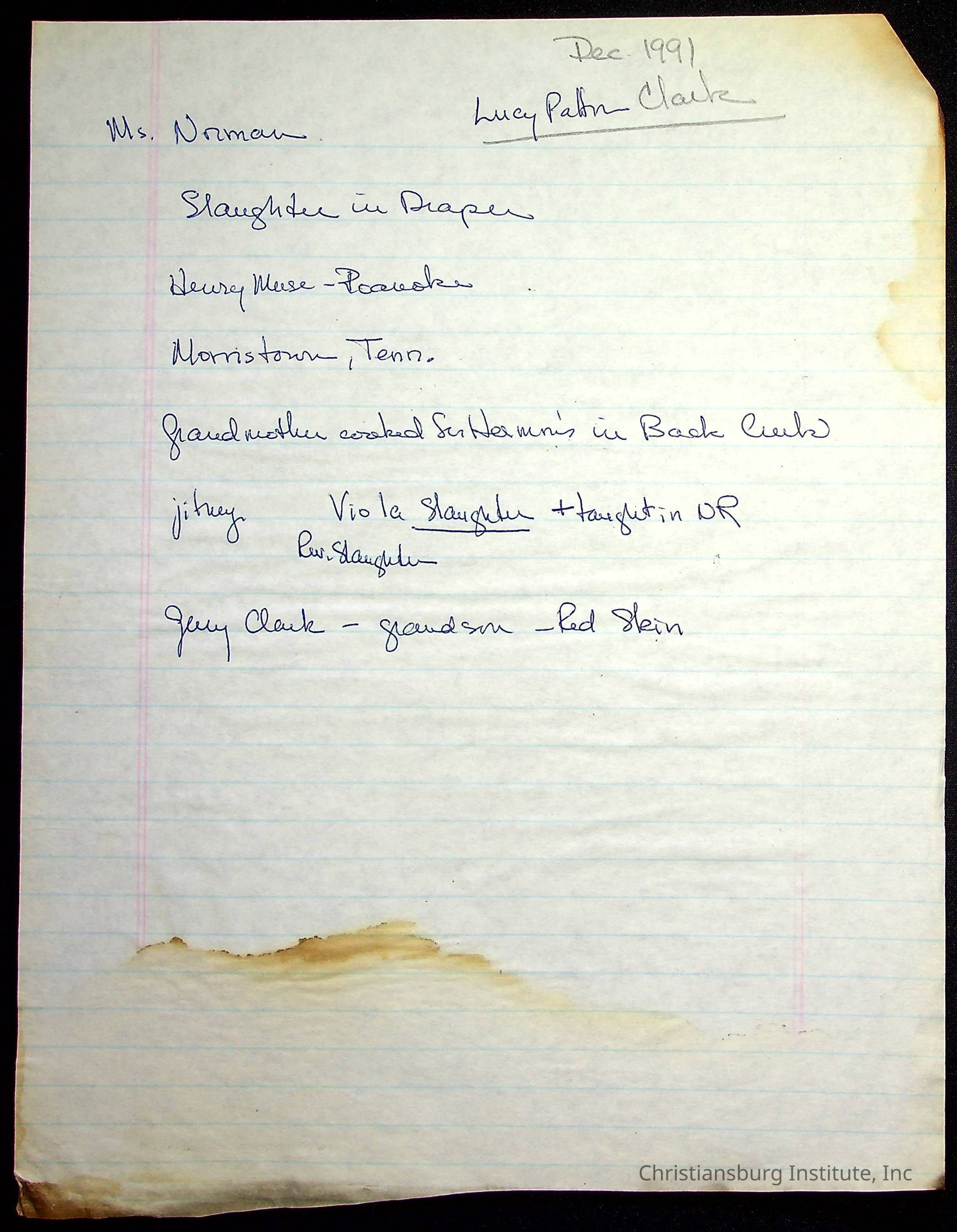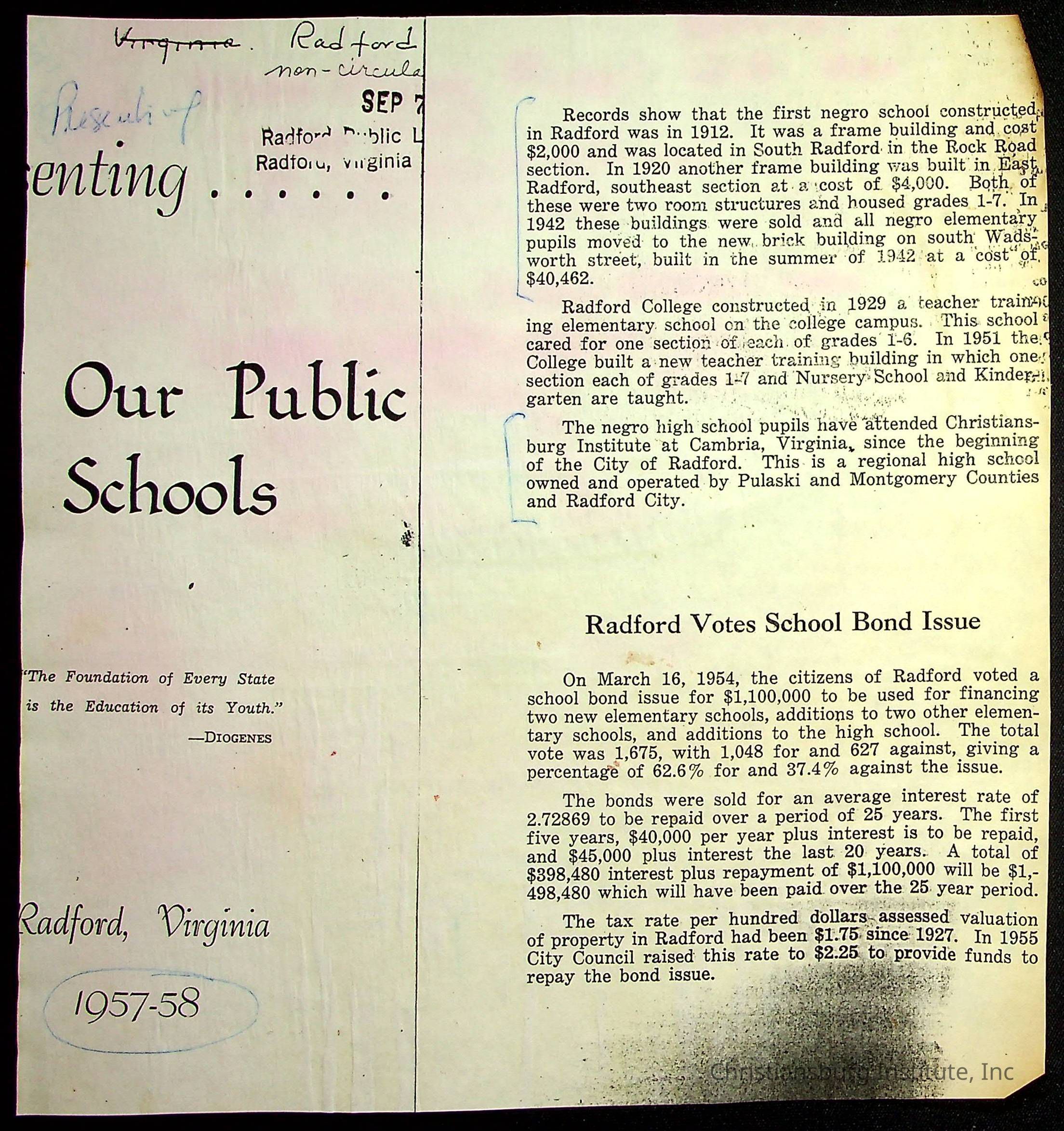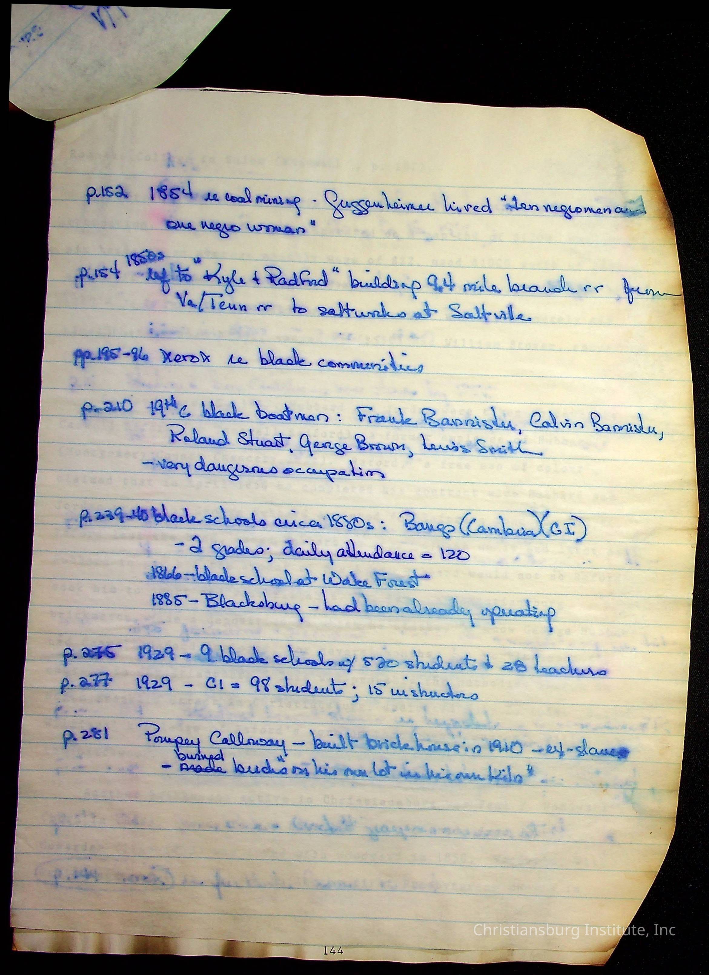 A folder of research materials collected by Radford University professor, Dr. Linda Killen. This folder is titled 'Miscellaneous Radford Black History' and includes various research conducted about Black history in Radford, Virginia. Please note: some of the documents were damaged by fire.