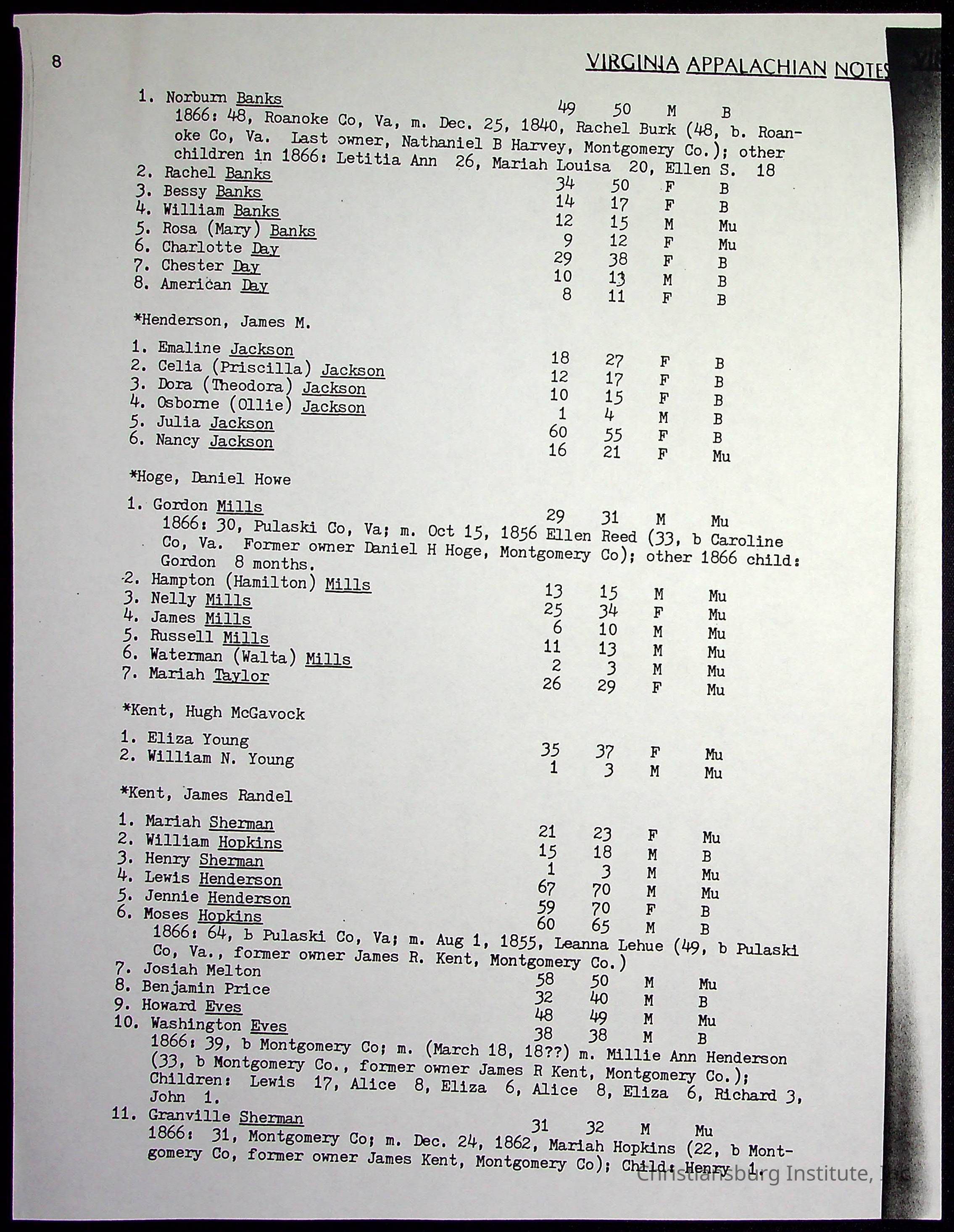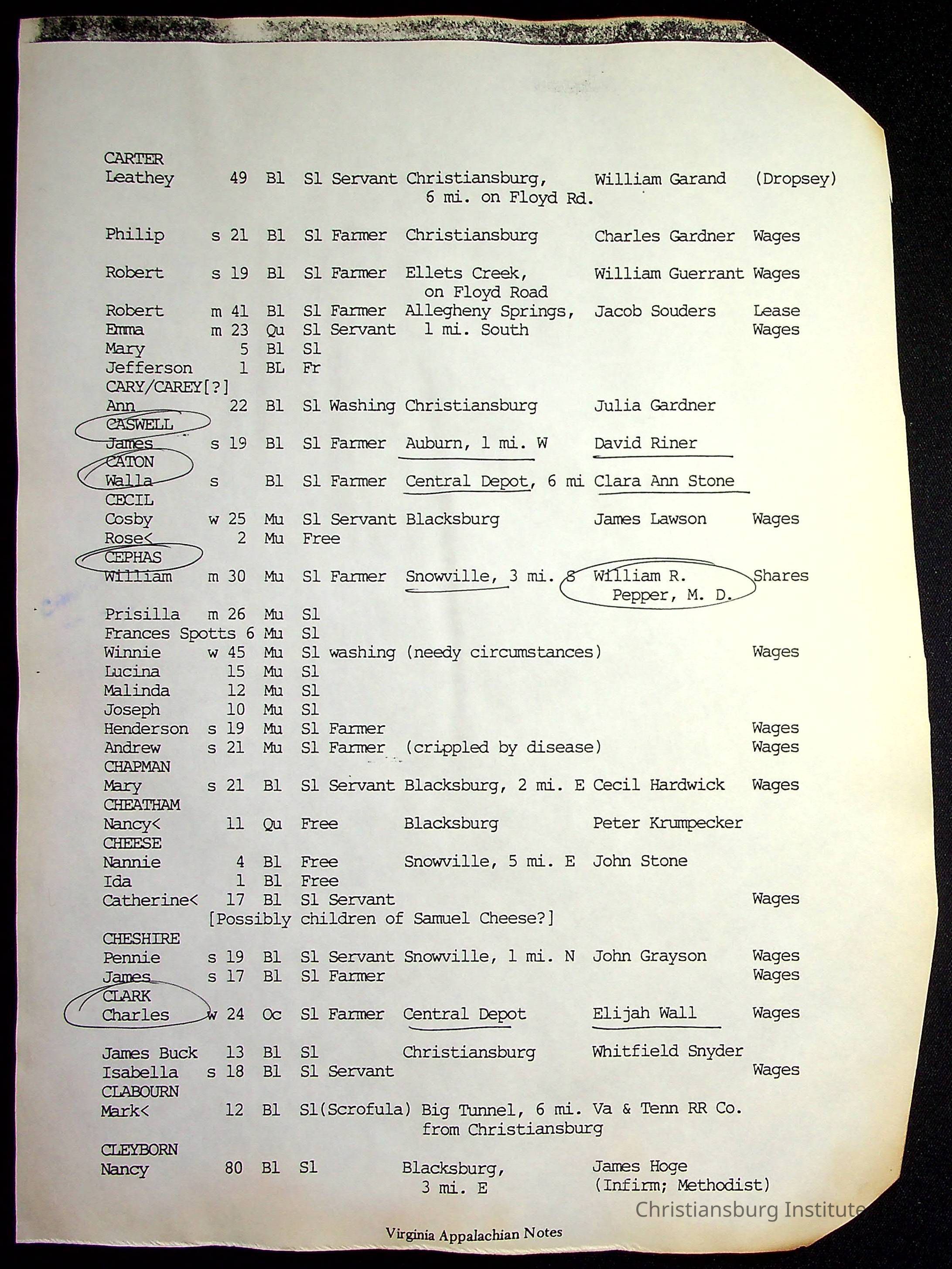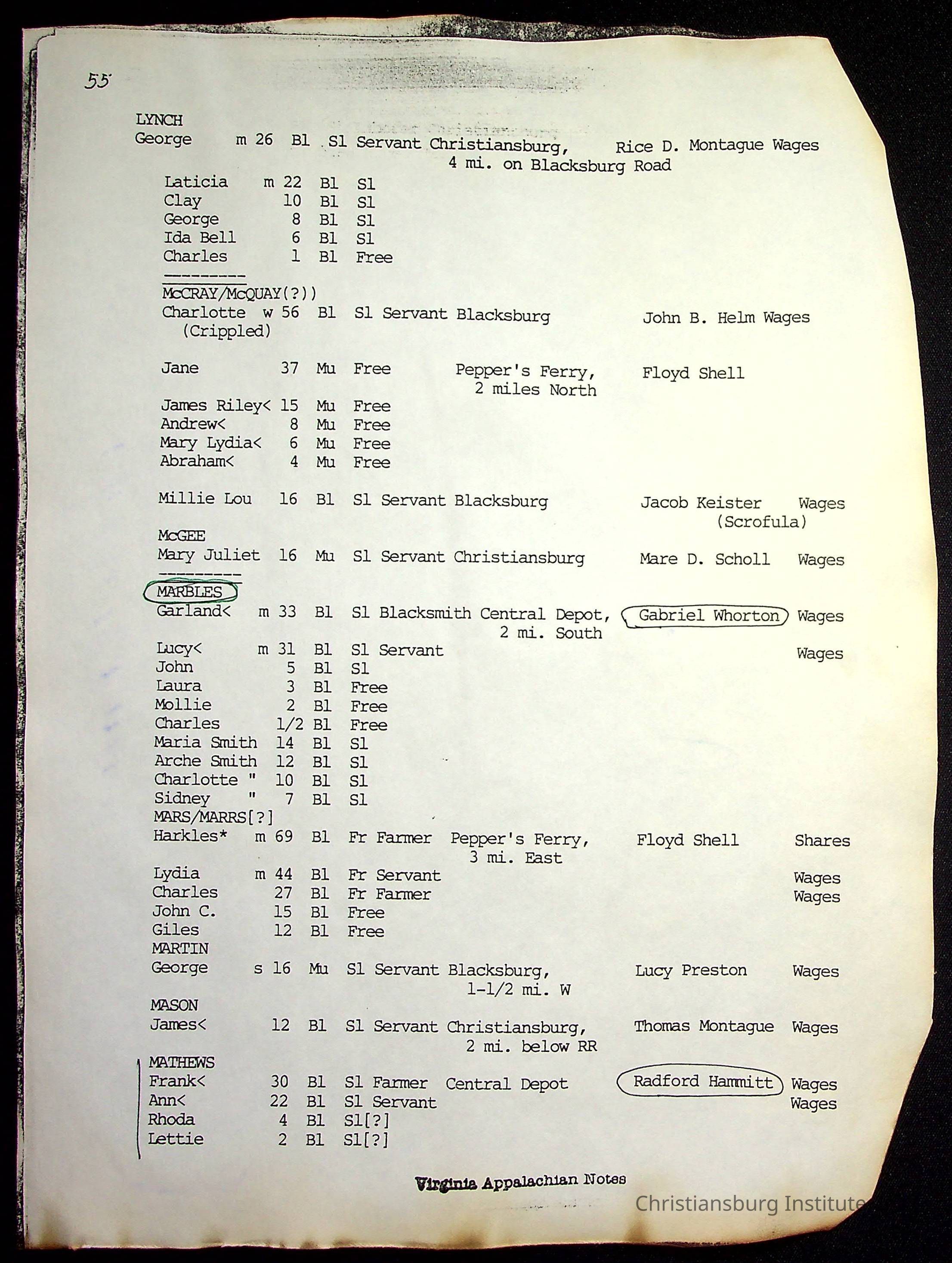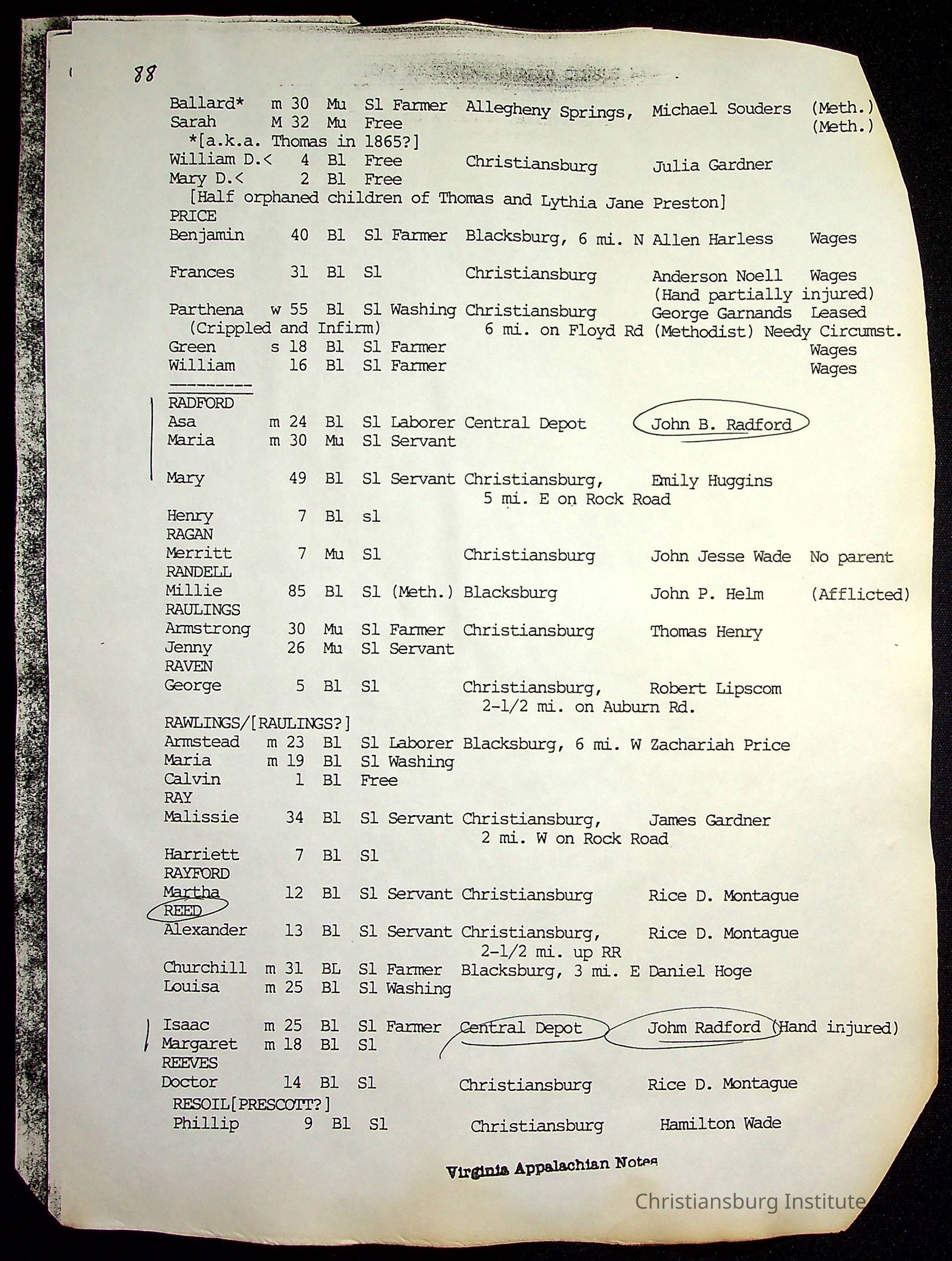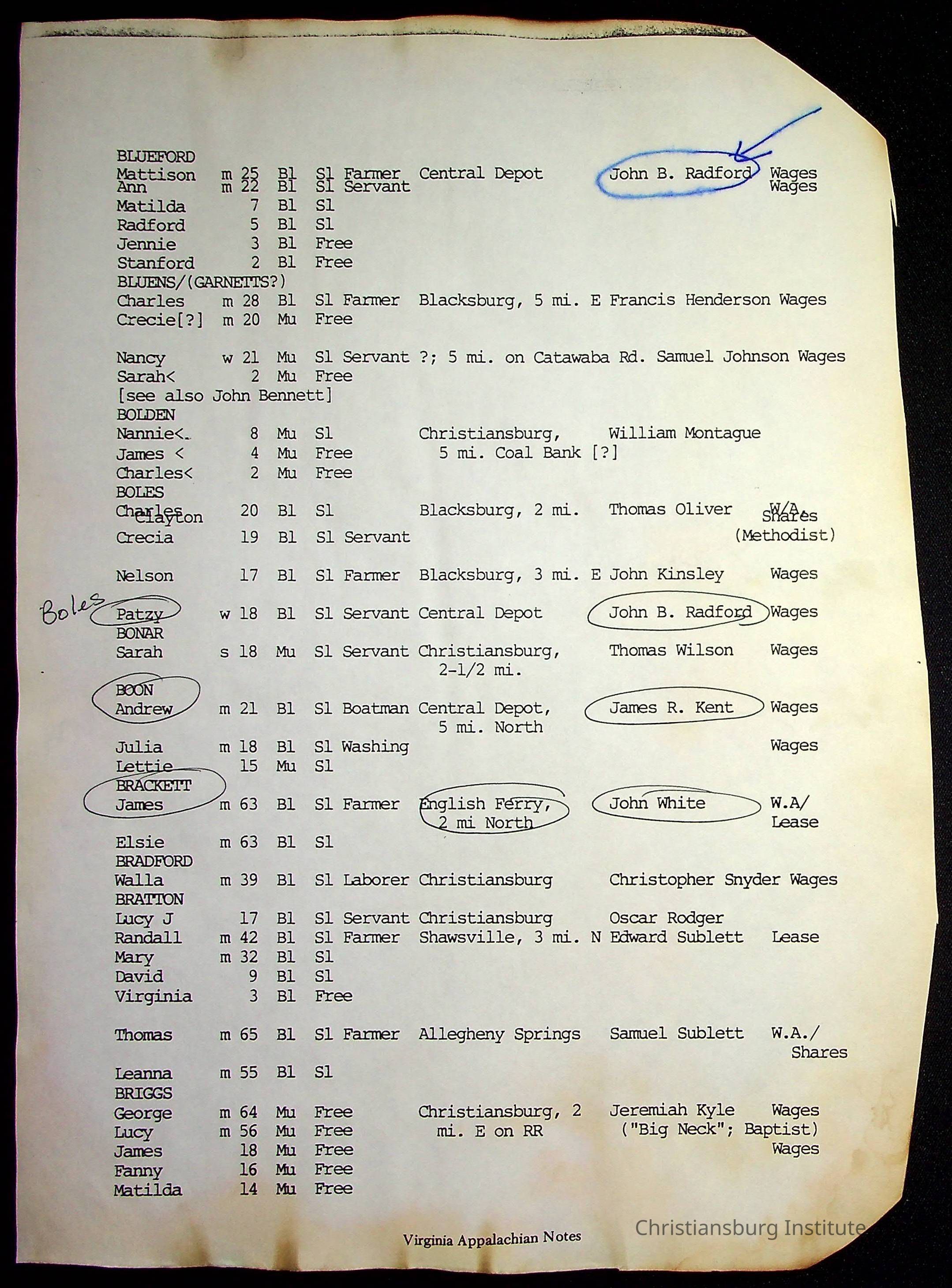 Farm Land, Boom Town, Village: A History of Belspring, Virginia, 1750-1940, The Reports of Charles S. Schaeffer from the Virginia counties of Montgomery and Pulaski, with additional information on the counties of Floyd, Giles, Craig, Wythe, and Roanoke., Ingles Ferry Ledgers (1840s-1880s), These people lived in a pleasant valley, Making their mark: Black Families of New River Depot, 1870-1940., Whartons’ Town New River Depot, 1870-1940., Radford’s Early Black Residents, 1880-1925