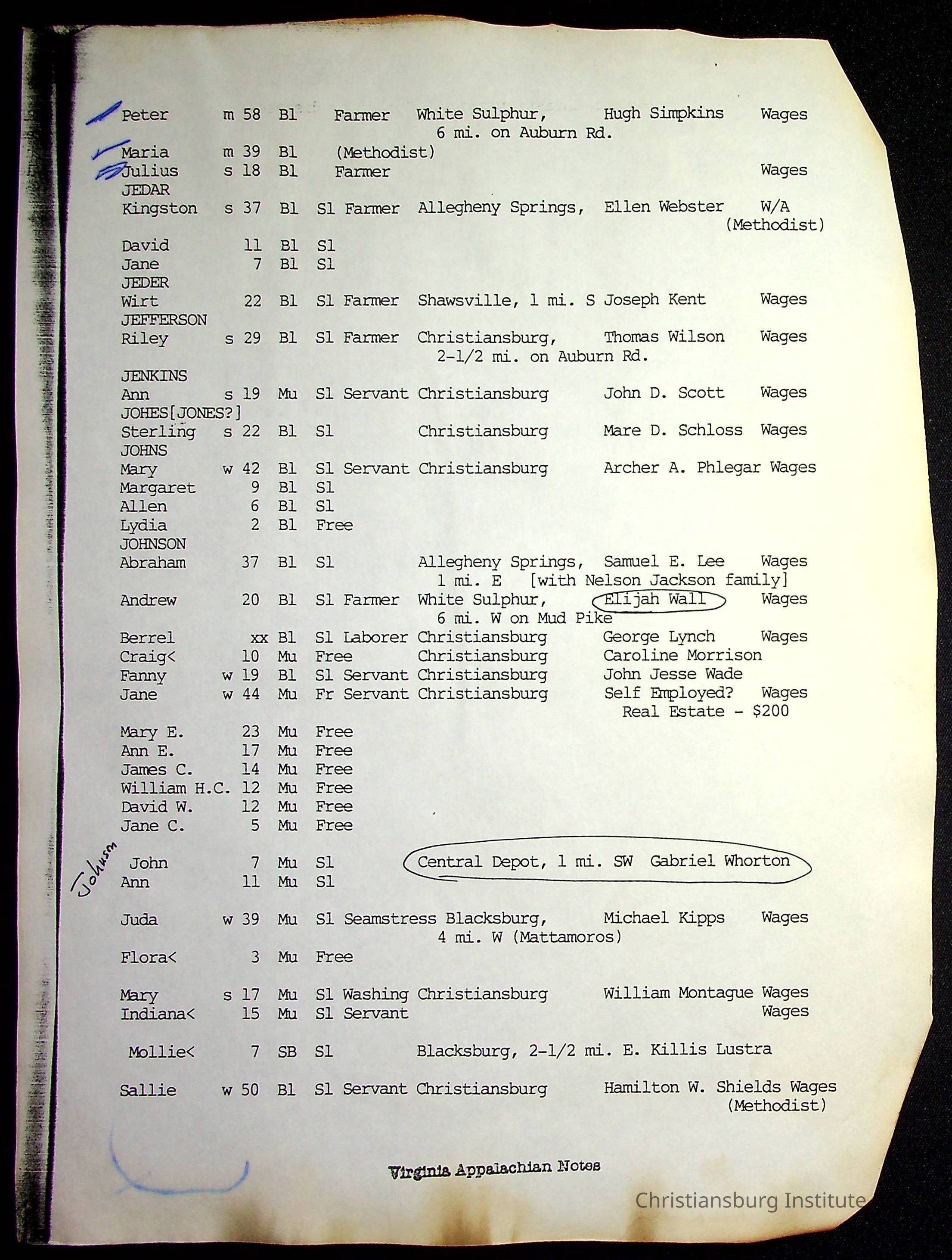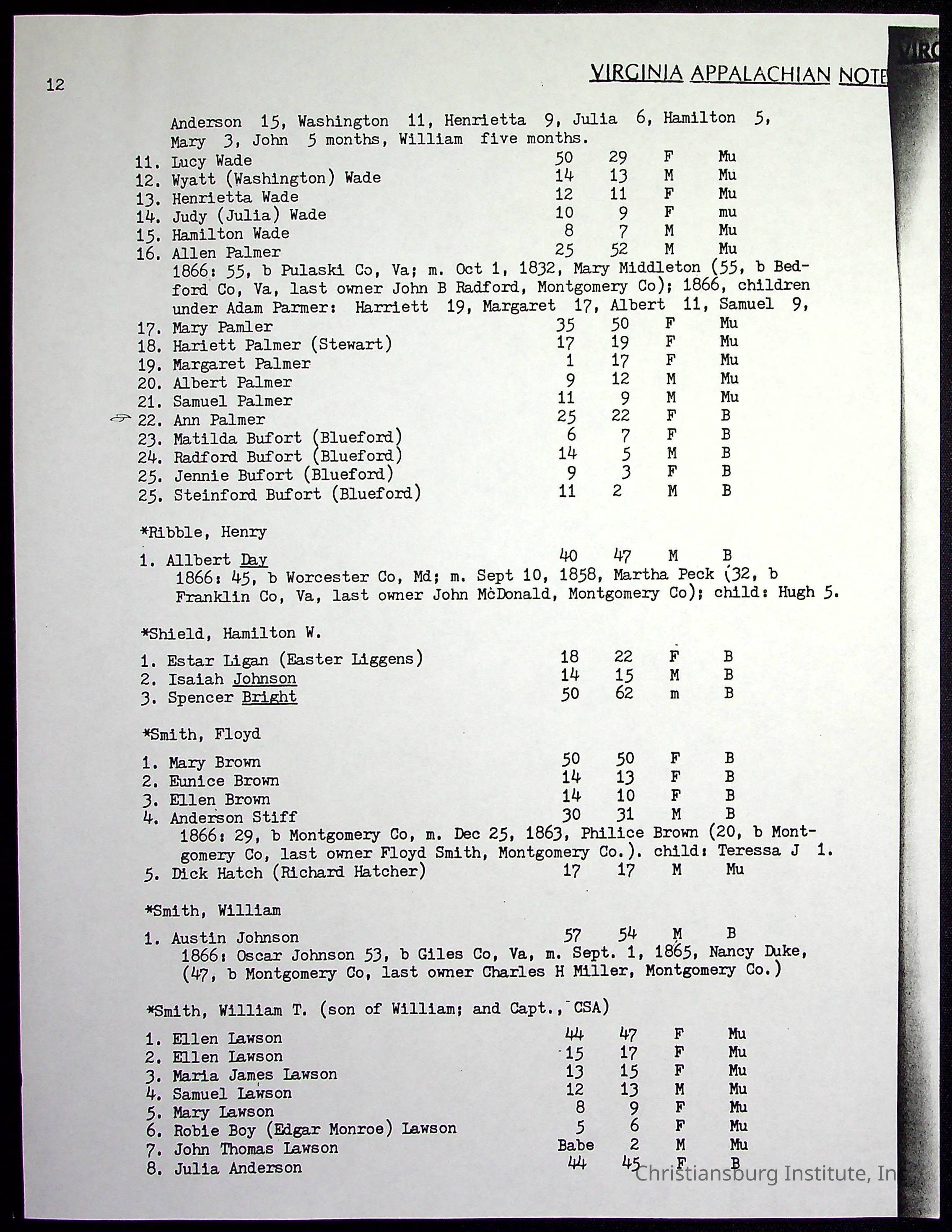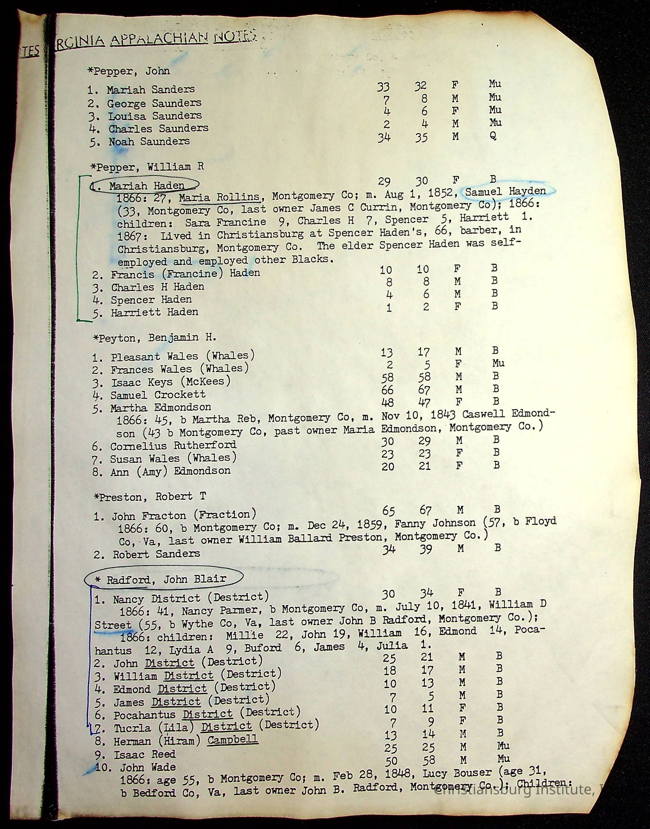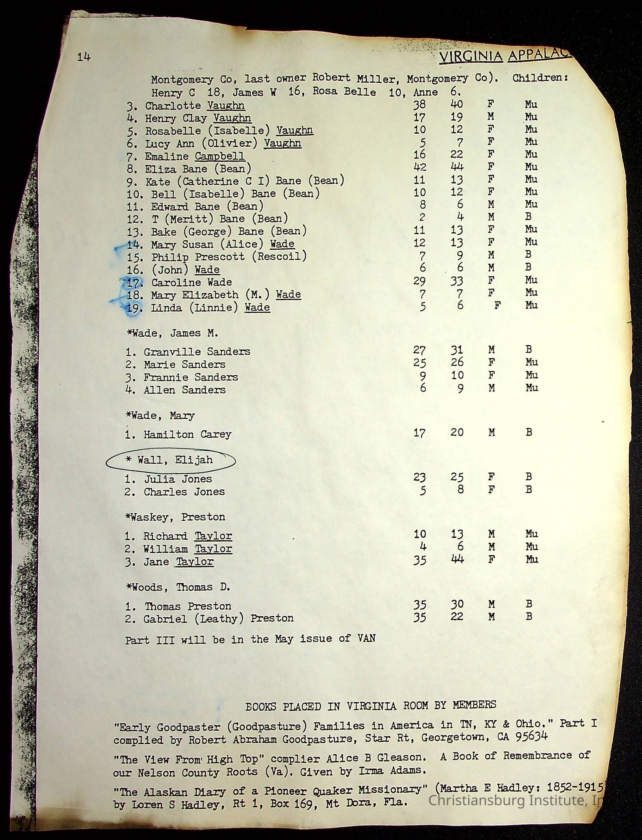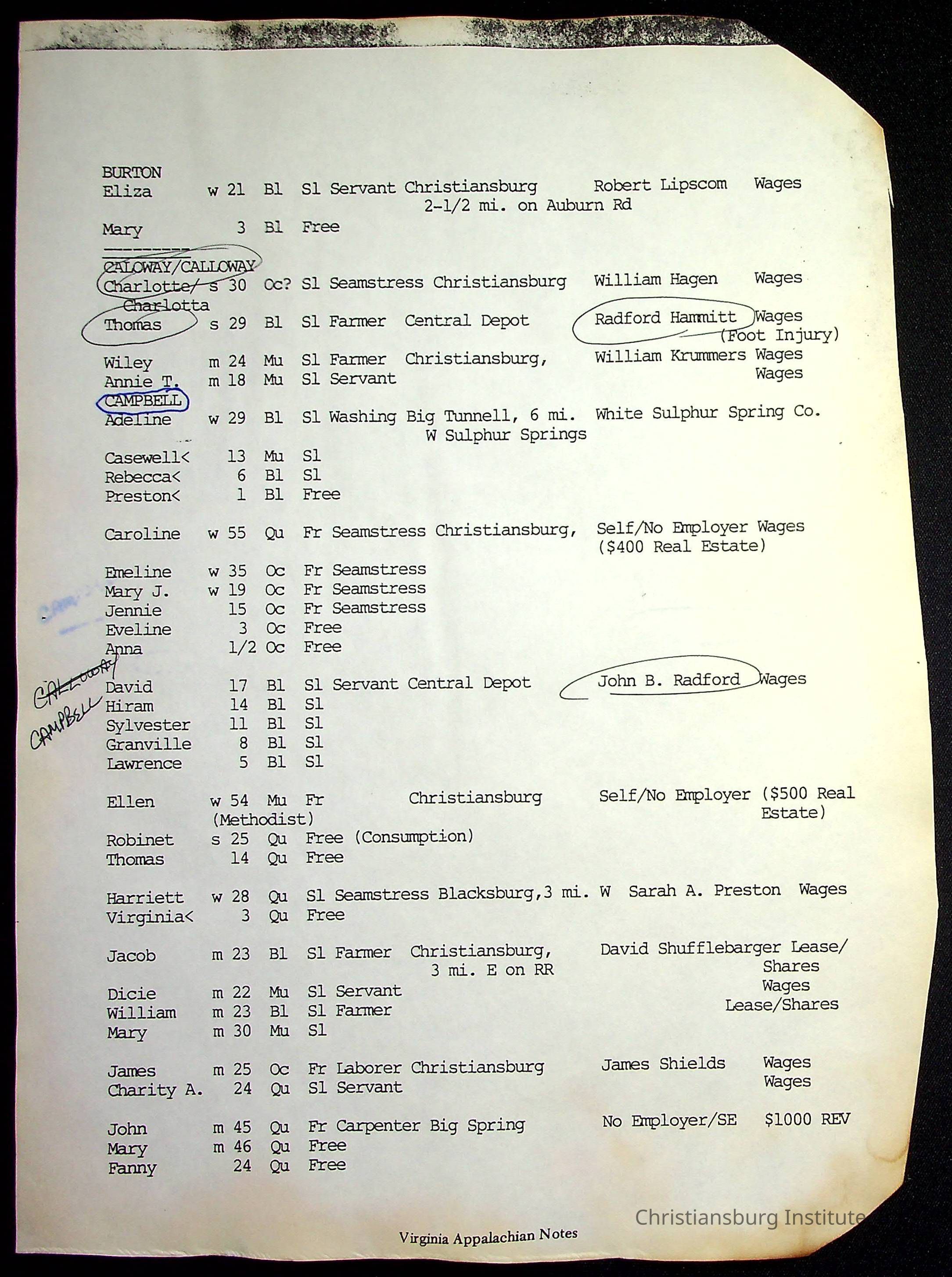 Farm Land, Boom Town, Village: A History of Belspring, Virginia, 1750-1940, The Reports of Charles S. Schaeffer from the Virginia counties of Montgomery and Pulaski, with additional information on the counties of Floyd, Giles, Craig, Wythe, and Roanoke., Ingles Ferry Ledgers (1840s-1880s), These people lived in a pleasant valley, Making their mark: Black Families of New River Depot, 1870-1940., Whartons’ Town New River Depot, 1870-1940., Radford’s Early Black Residents, 1880-1925
