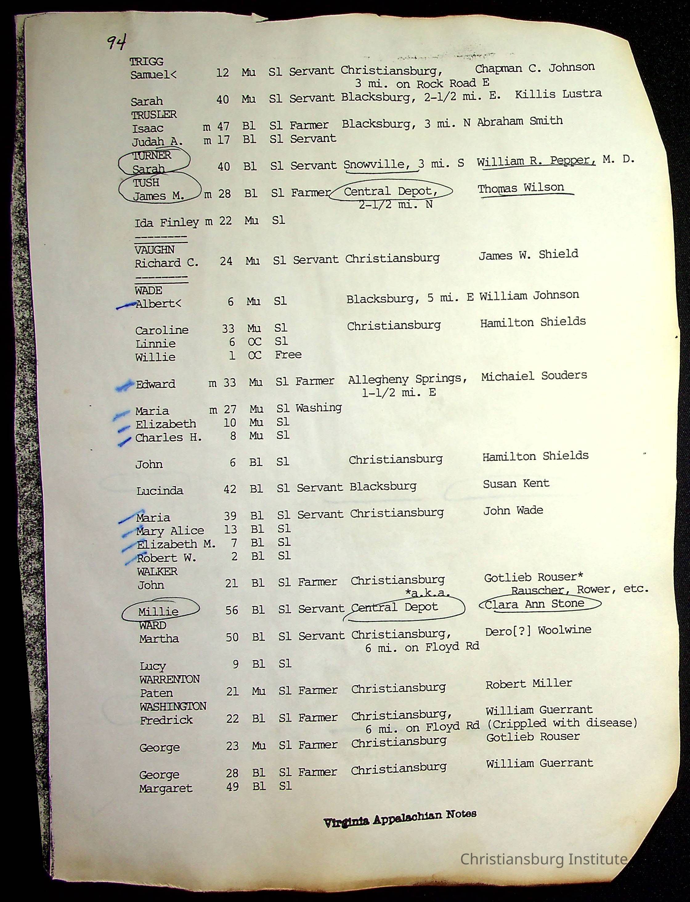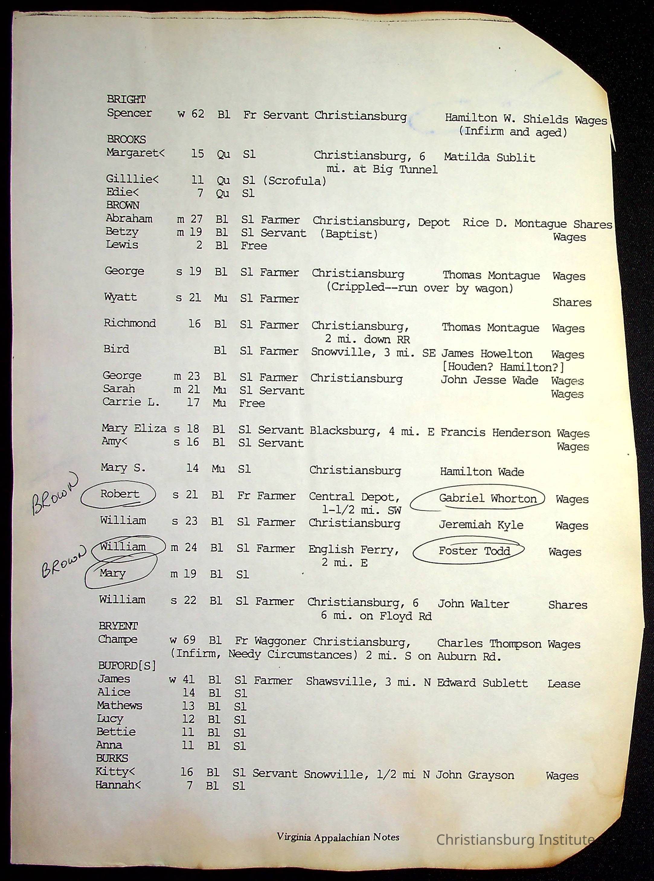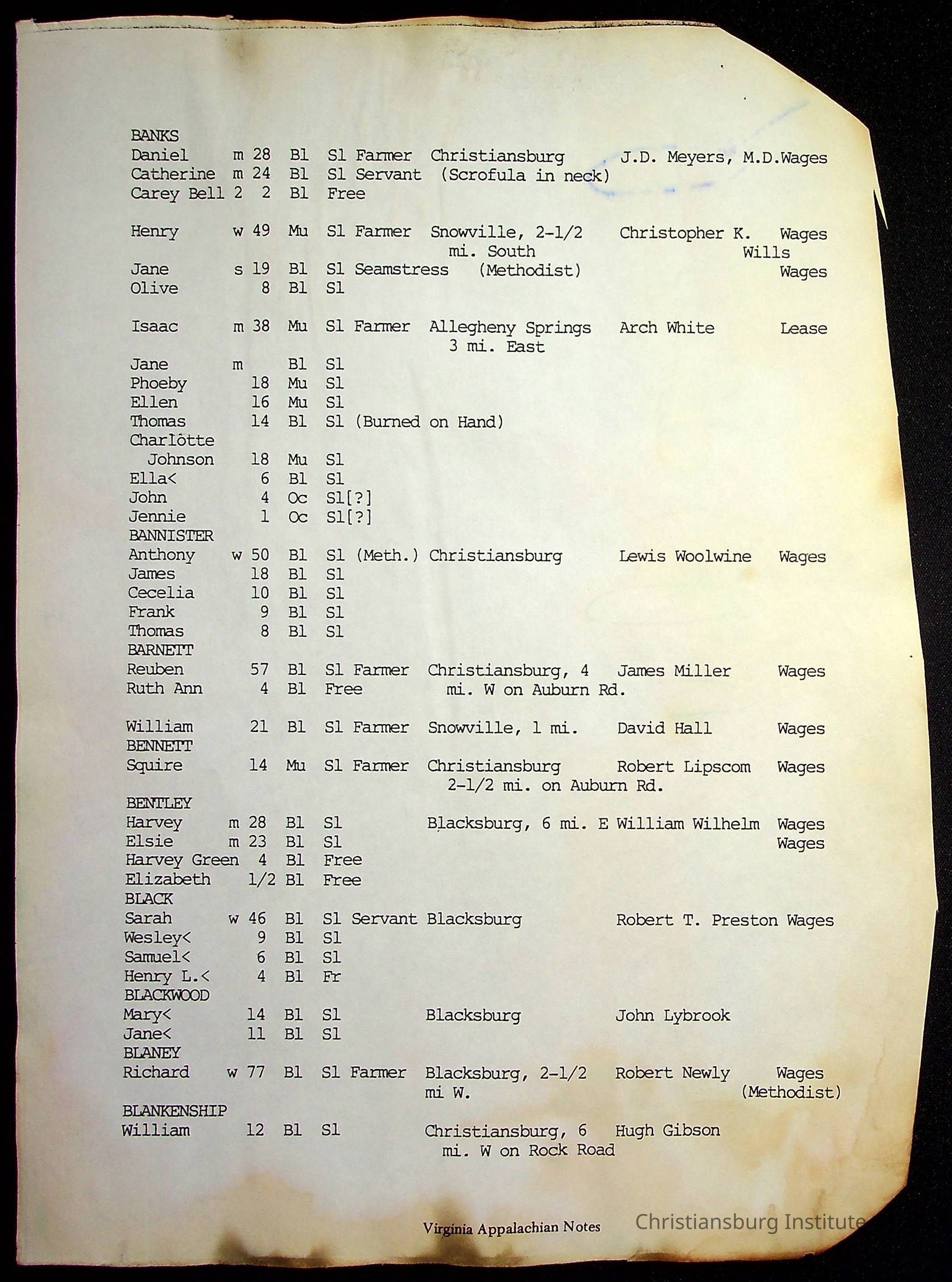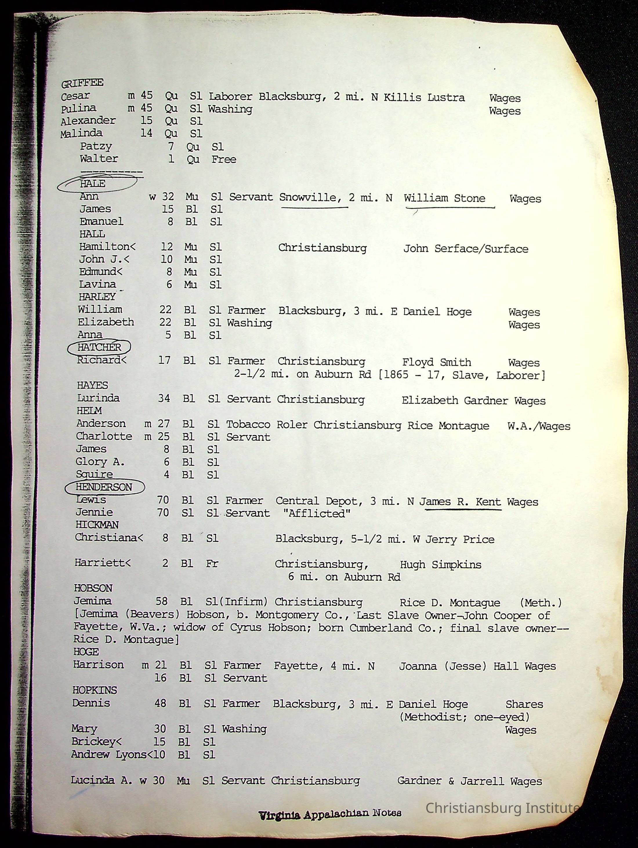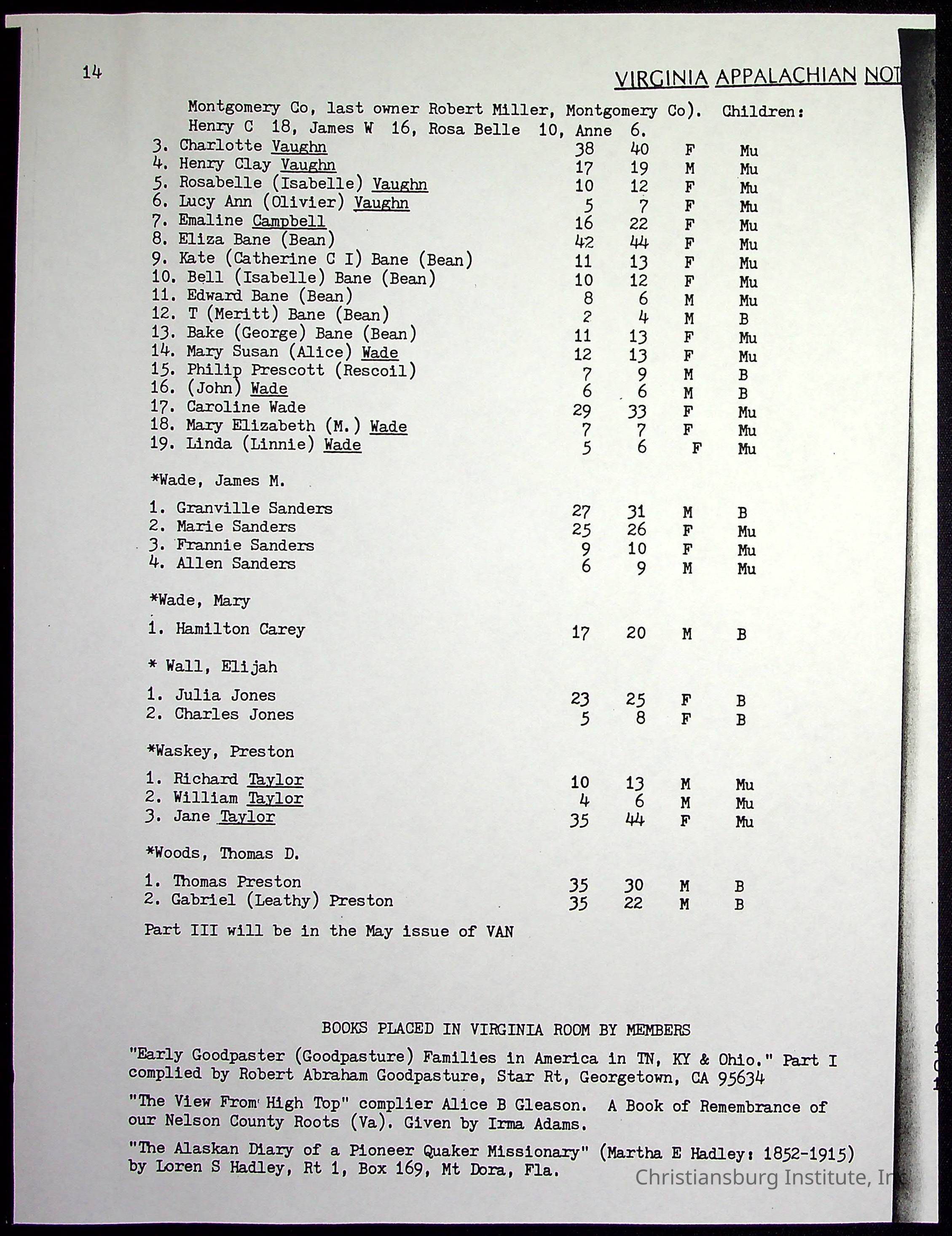 Farm Land, Boom Town, Village: A History of Belspring, Virginia, 1750-1940, The Reports of Charles S. Schaeffer from the Virginia counties of Montgomery and Pulaski, with additional information on the counties of Floyd, Giles, Craig, Wythe, and Roanoke., Ingles Ferry Ledgers (1840s-1880s), These people lived in a pleasant valley, Making their mark: Black Families of New River Depot, 1870-1940., Whartons’ Town New River Depot, 1870-1940., Radford’s Early Black Residents, 1880-1925
