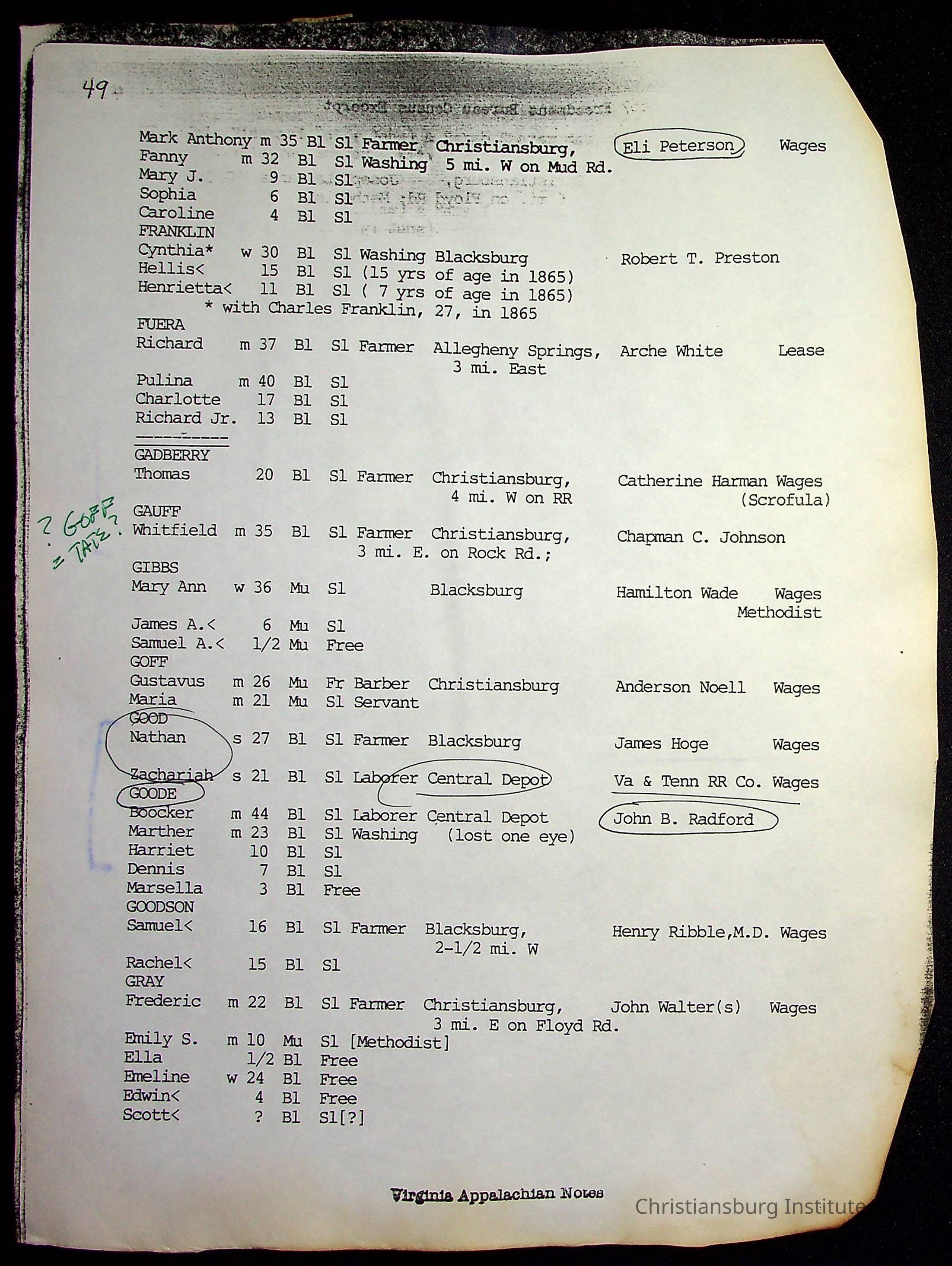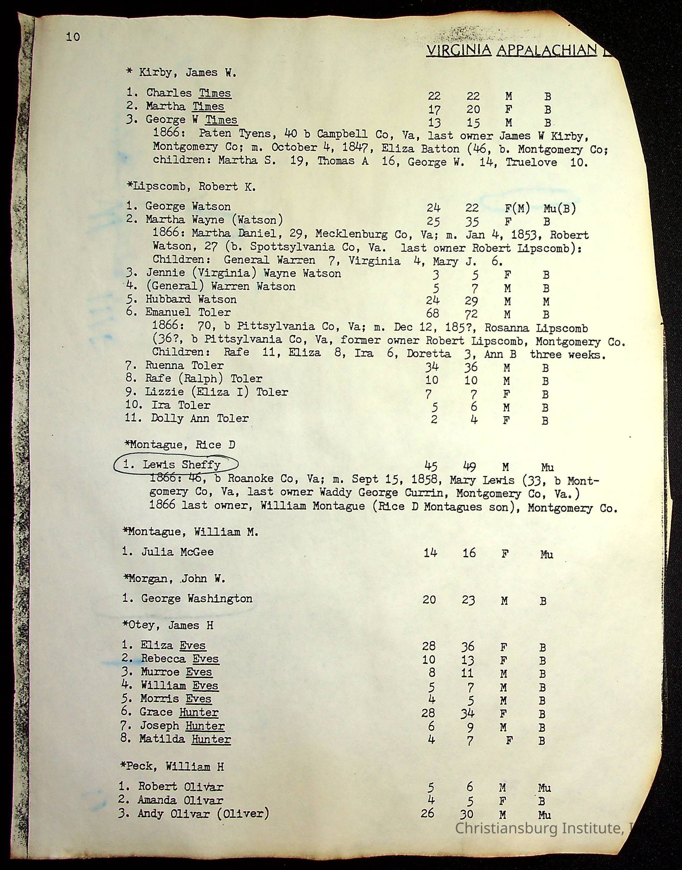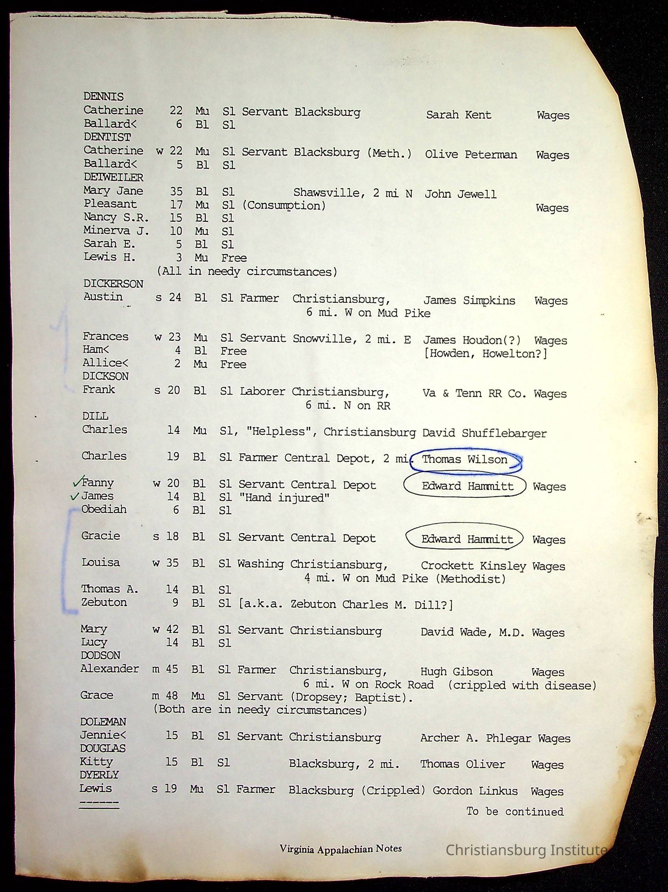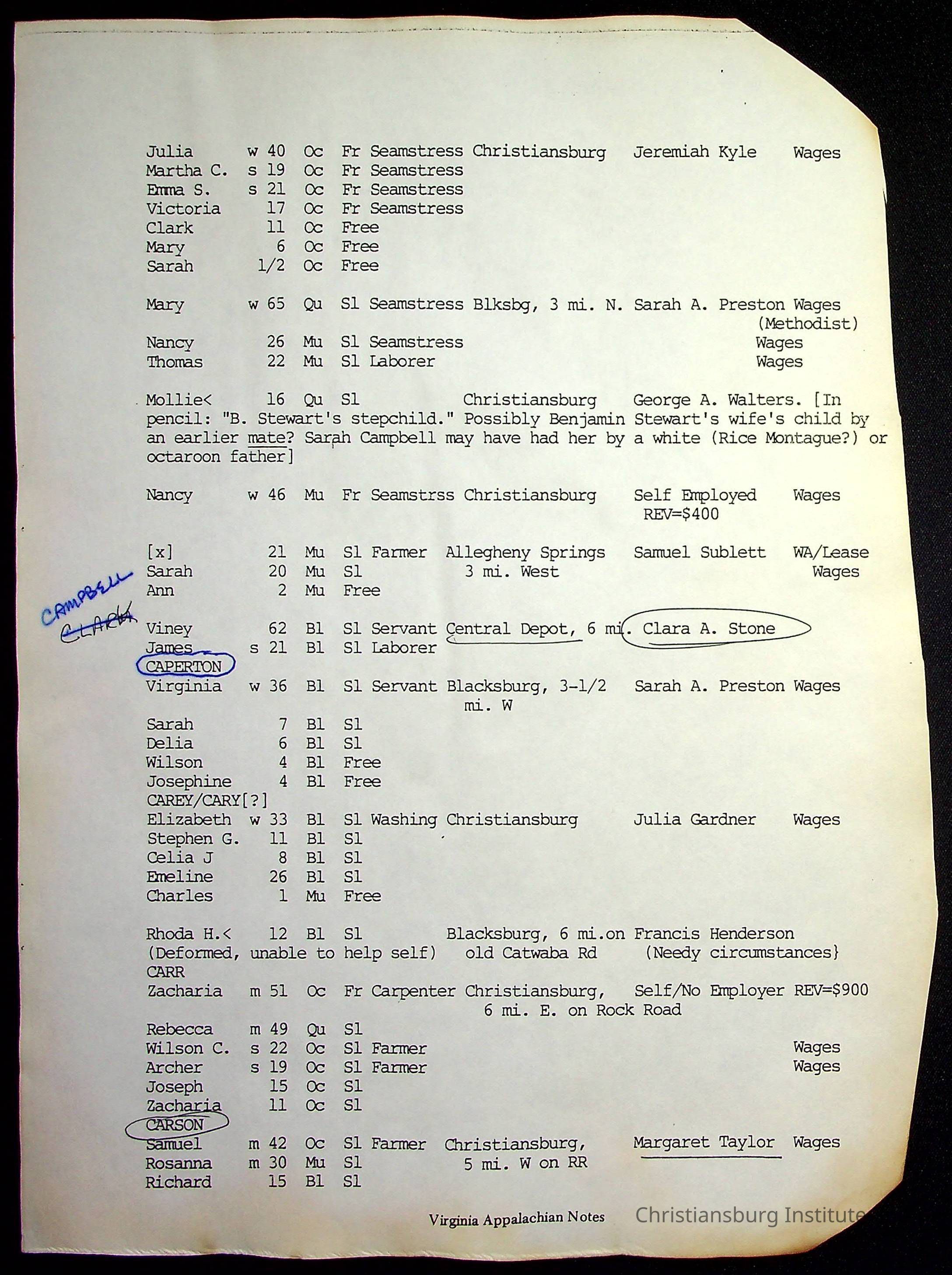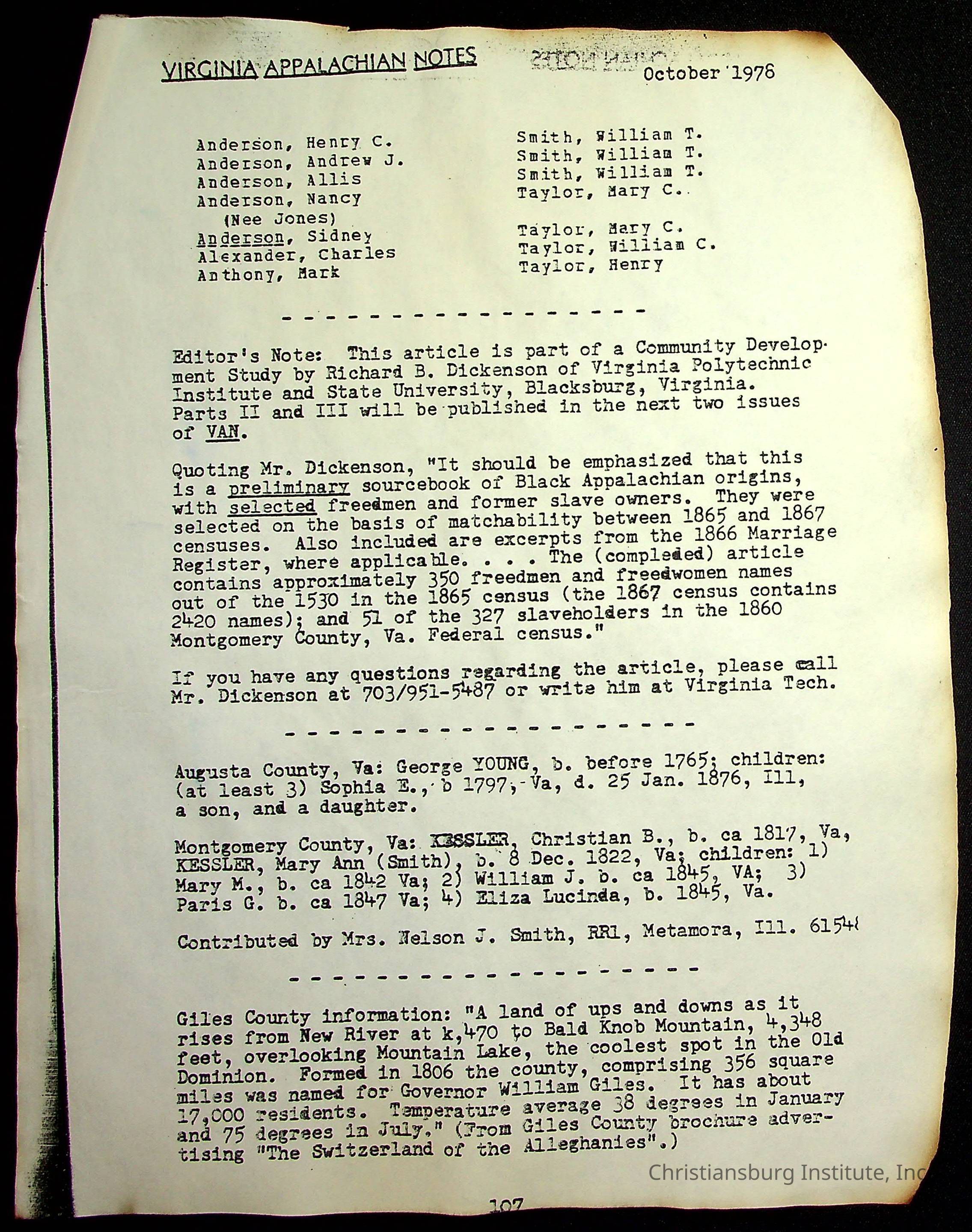 Farm Land, Boom Town, Village: A History of Belspring, Virginia, 1750-1940, The Reports of Charles S. Schaeffer from the Virginia counties of Montgomery and Pulaski, with additional information on the counties of Floyd, Giles, Craig, Wythe, and Roanoke., Ingles Ferry Ledgers (1840s-1880s), These people lived in a pleasant valley, Making their mark: Black Families of New River Depot, 1870-1940., Whartons’ Town New River Depot, 1870-1940., Radford’s Early Black Residents, 1880-1925