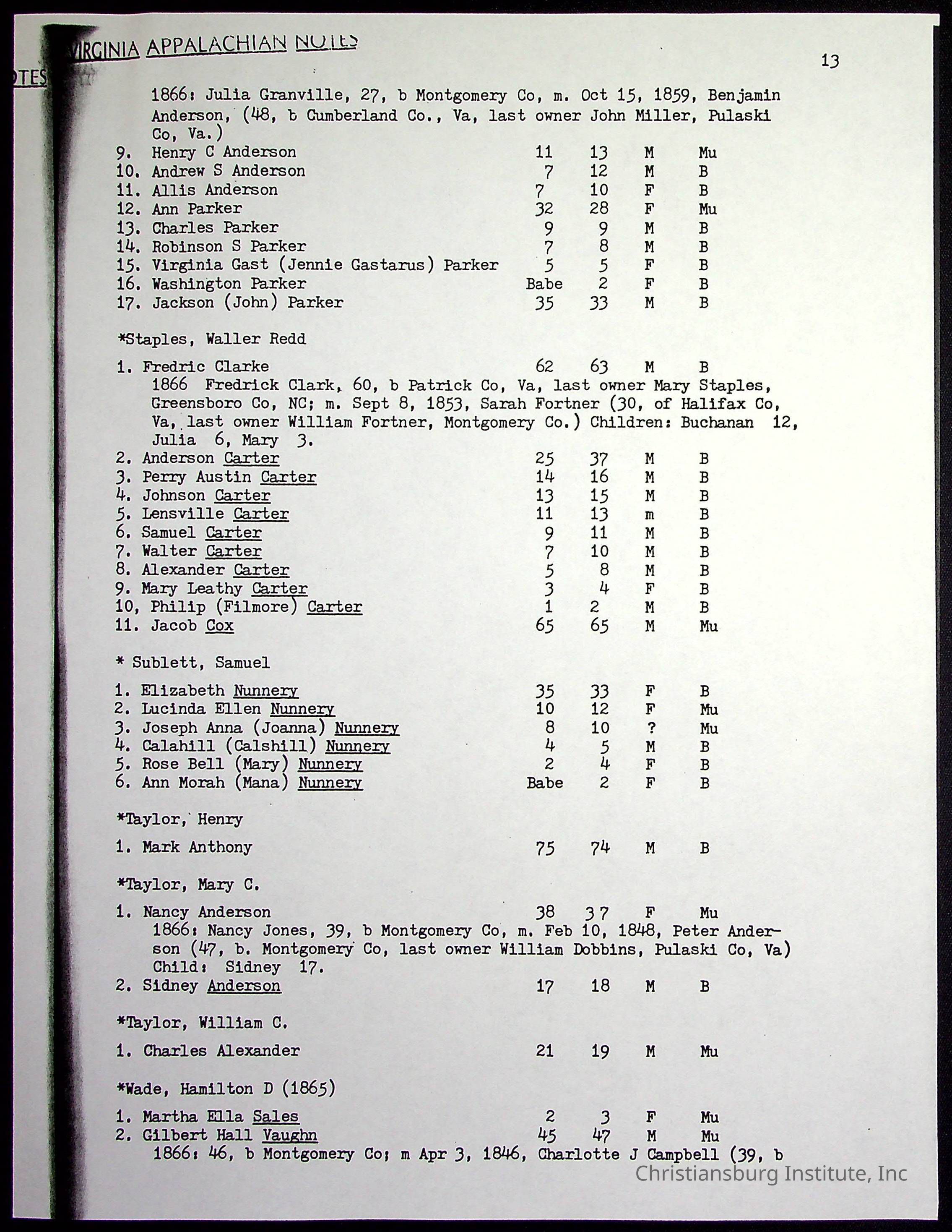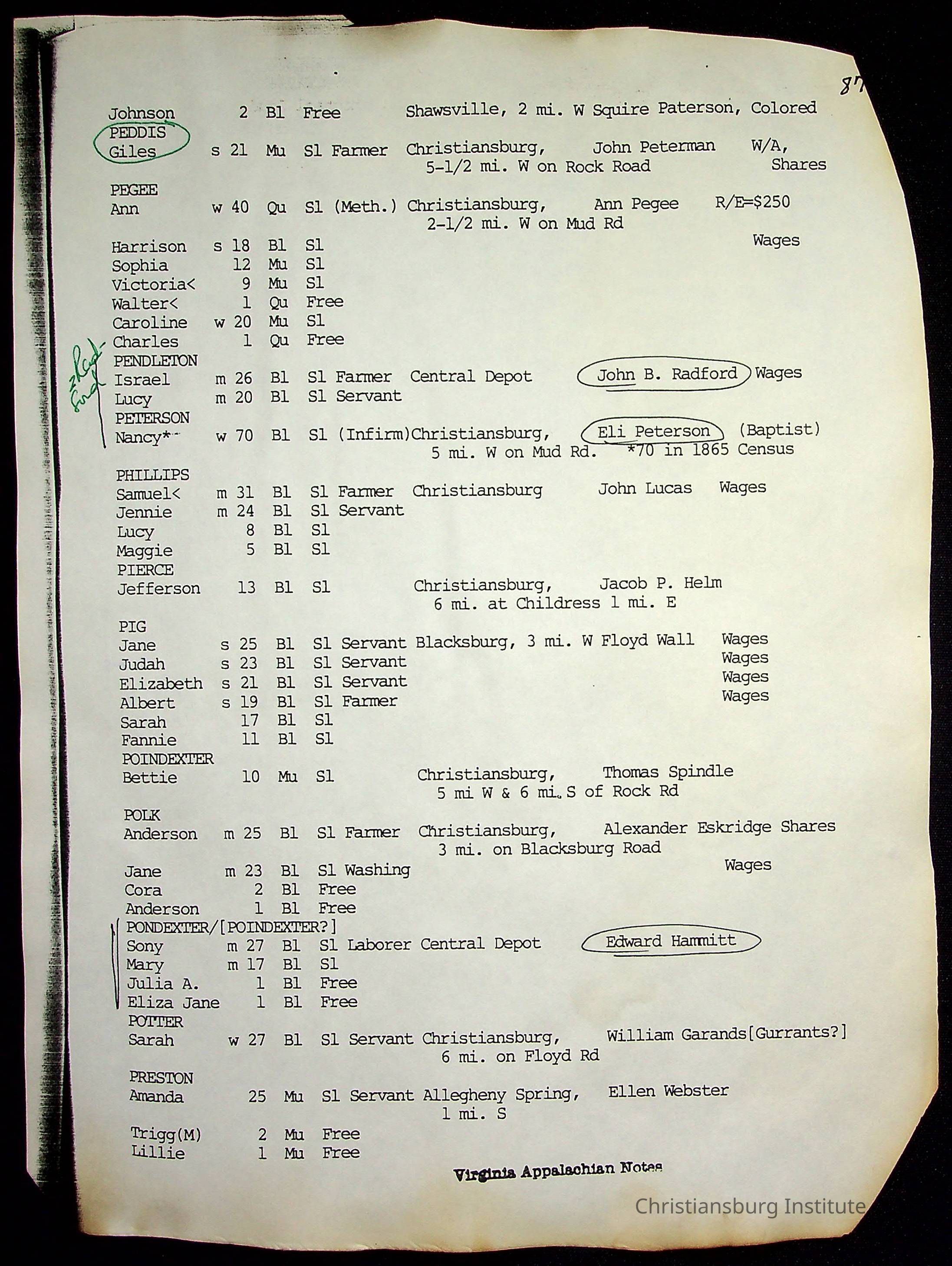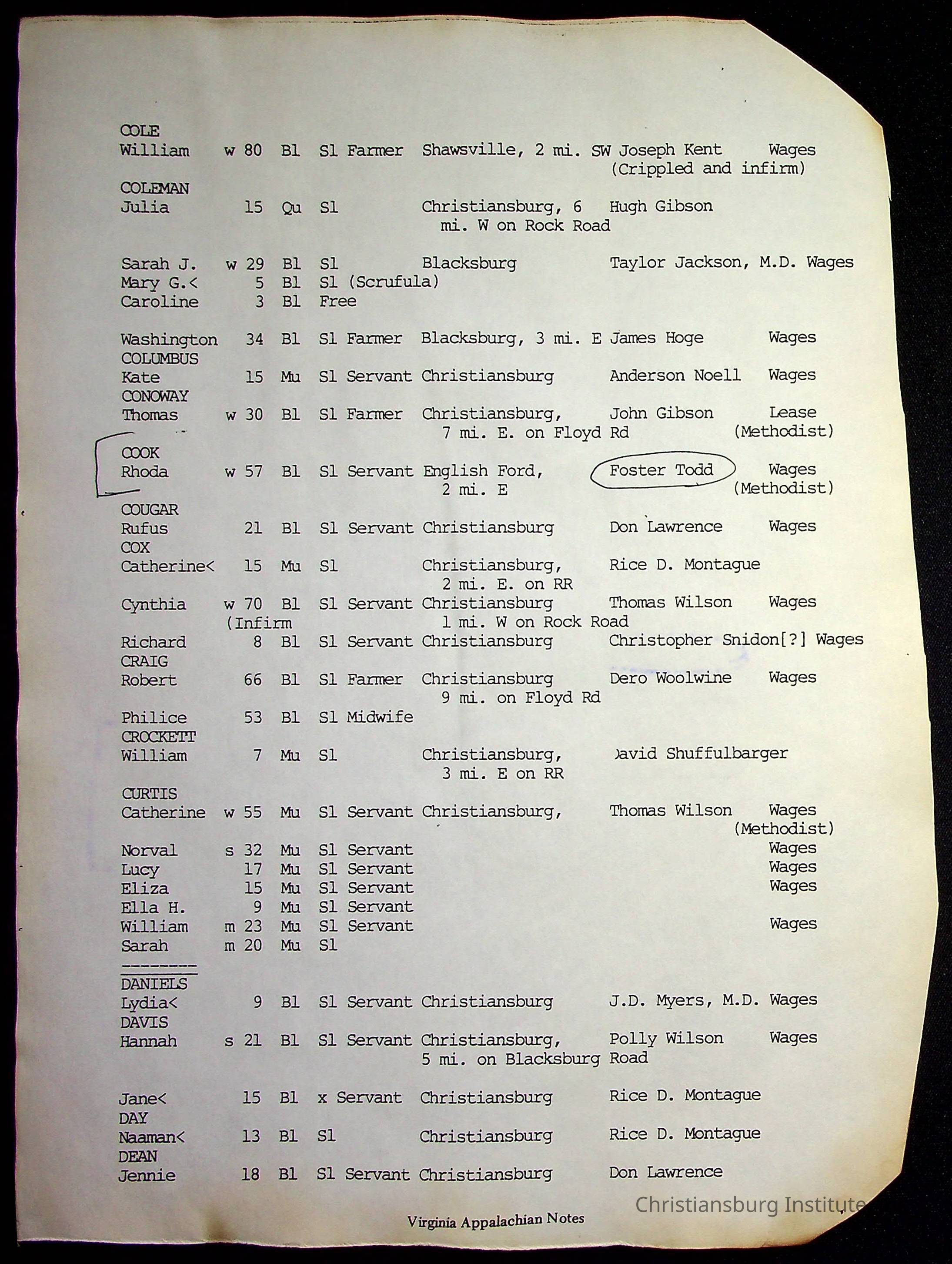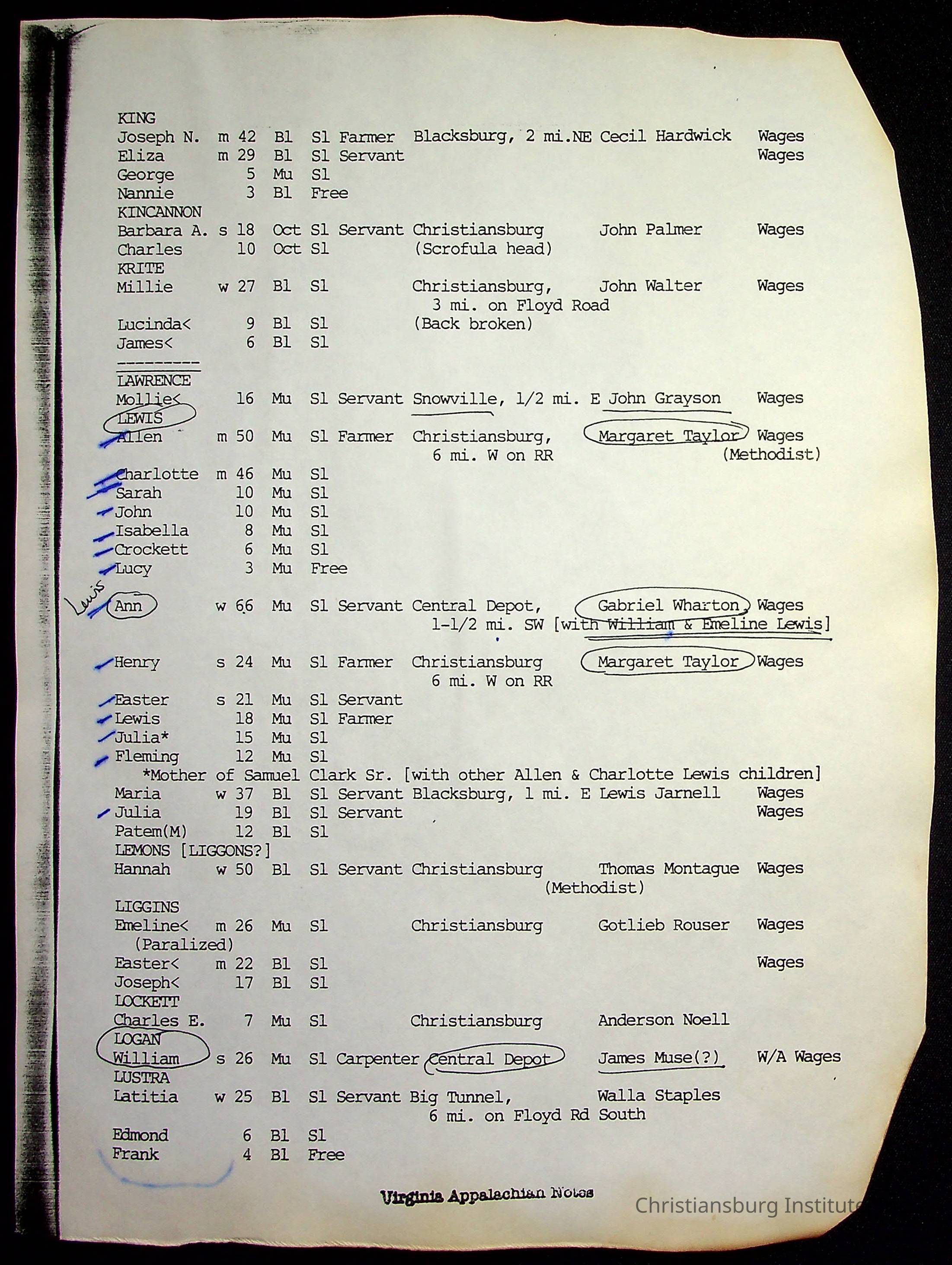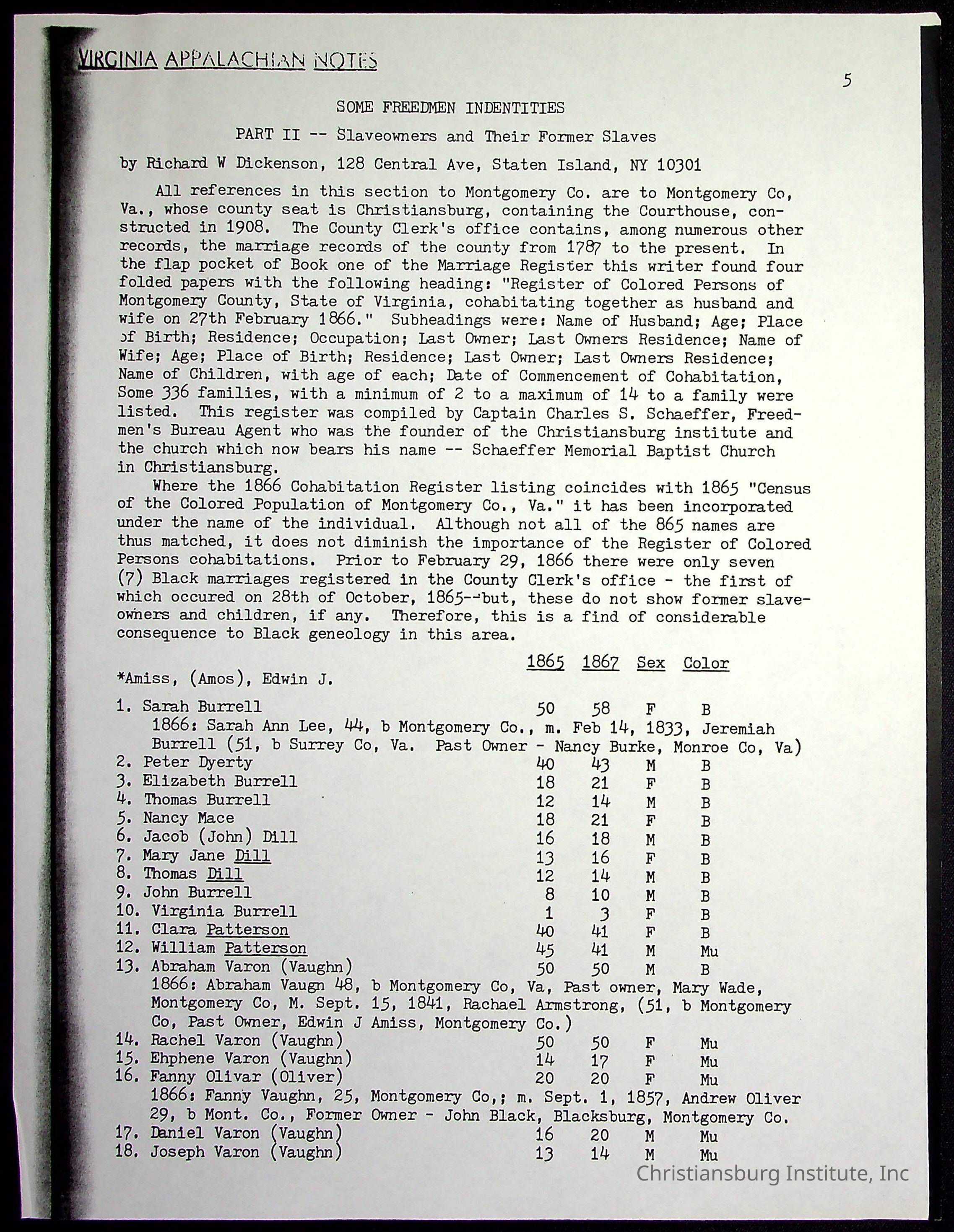Farm Land, Boom Town, Village: A History of Belspring, Virginia, 1750-1940, The Reports of Charles S. Schaeffer from the Virginia counties of Montgomery and Pulaski, with additional information on the counties of Floyd, Giles, Craig, Wythe, and Roanoke., Ingles Ferry Ledgers (1840s-1880s), These people lived in a pleasant valley, Making their mark: Black Families of New River Depot, 1870-1940., Whartons’ Town New River Depot, 1870-1940., Radford’s Early Black Residents, 1880-1925
