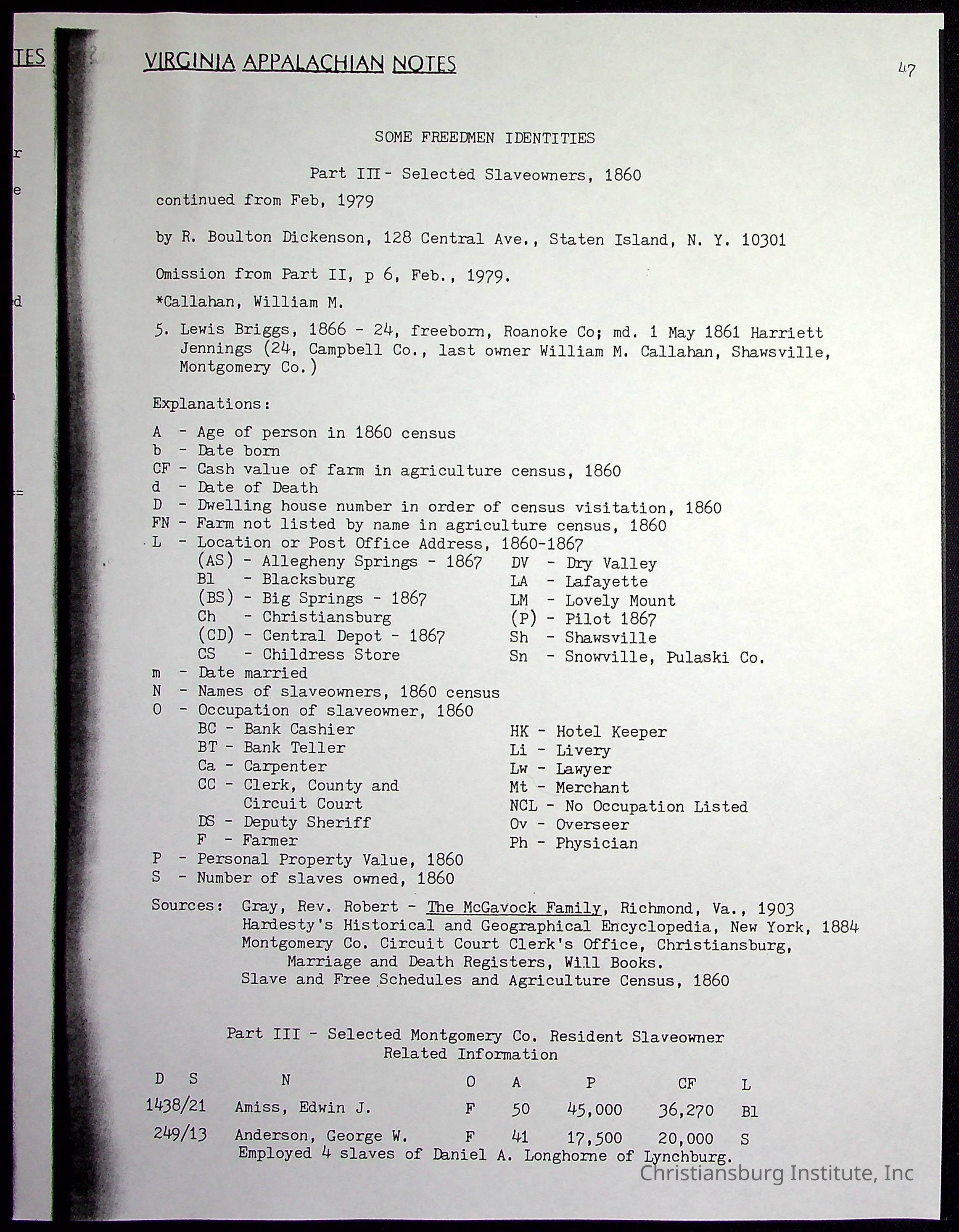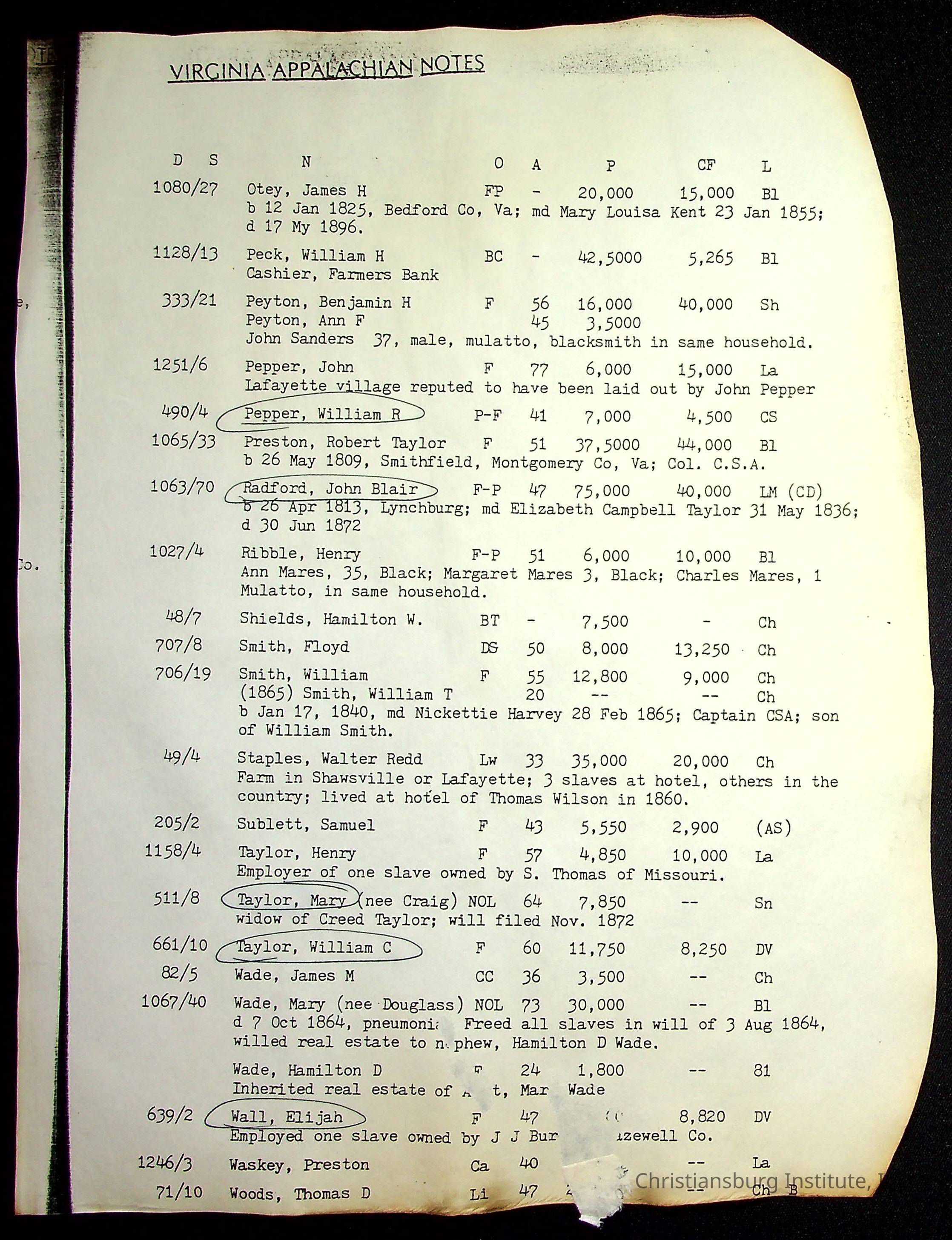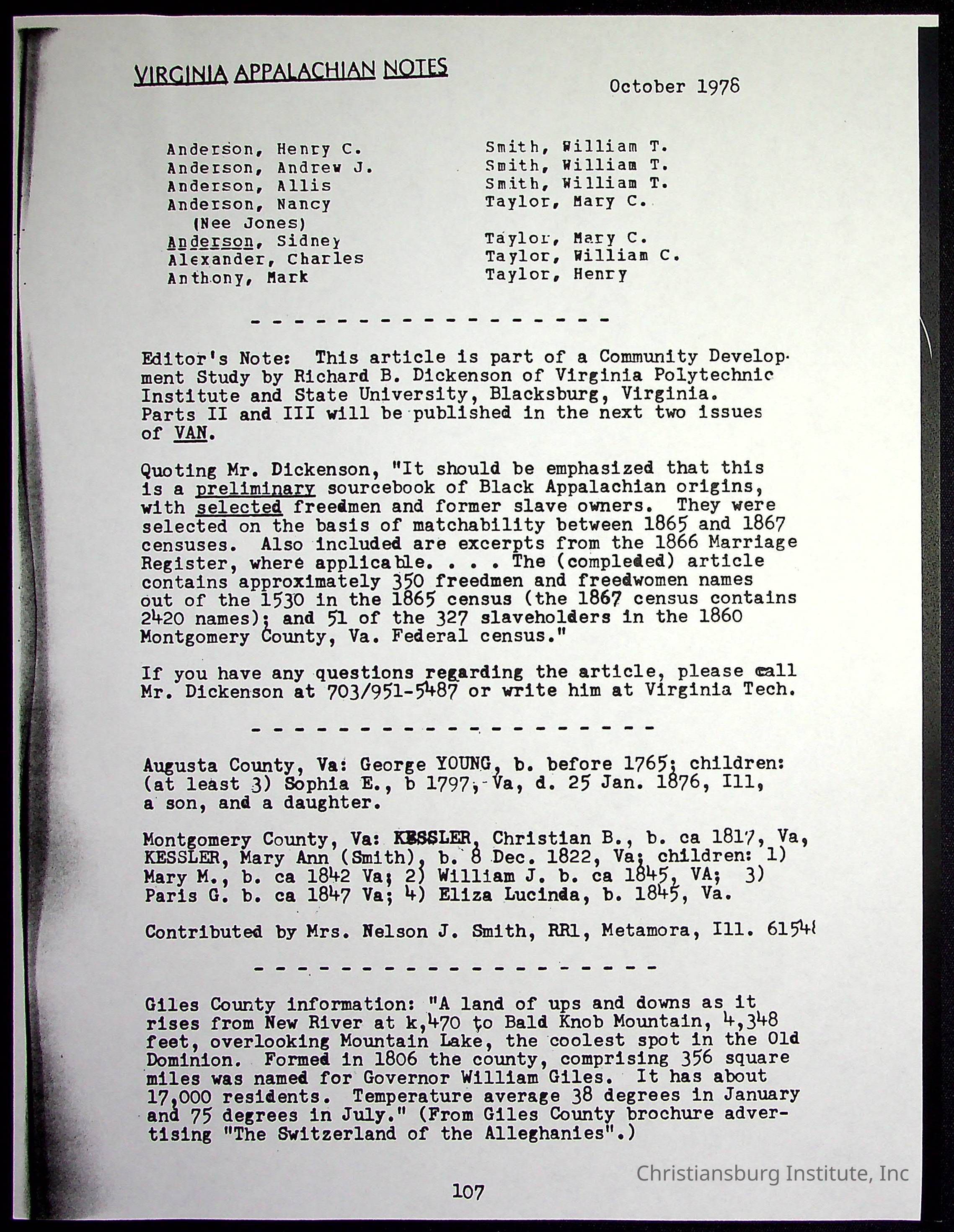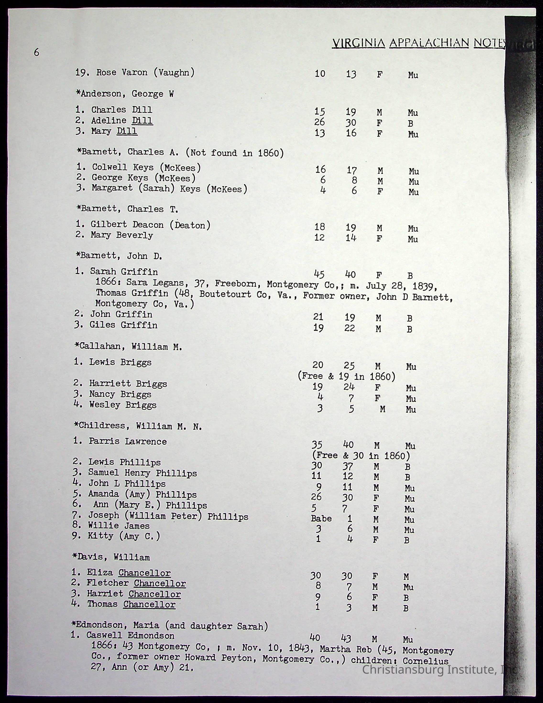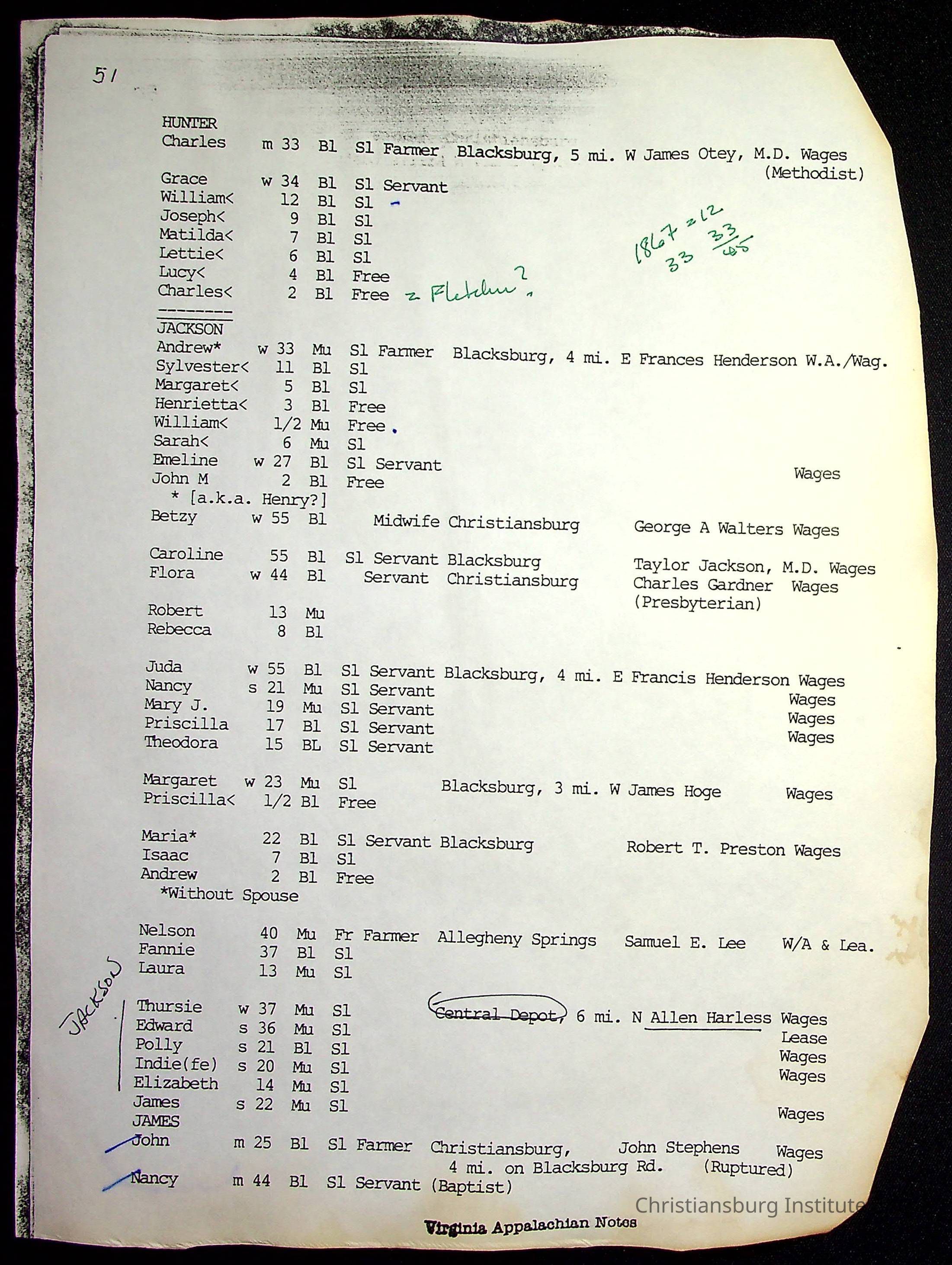 Farm Land, Boom Town, Village: A History of Belspring, Virginia, 1750-1940, The Reports of Charles S. Schaeffer from the Virginia counties of Montgomery and Pulaski, with additional information on the counties of Floyd, Giles, Craig, Wythe, and Roanoke., Ingles Ferry Ledgers (1840s-1880s), These people lived in a pleasant valley, Making their mark: Black Families of New River Depot, 1870-1940., Whartons’ Town New River Depot, 1870-1940., Radford’s Early Black Residents, 1880-1925