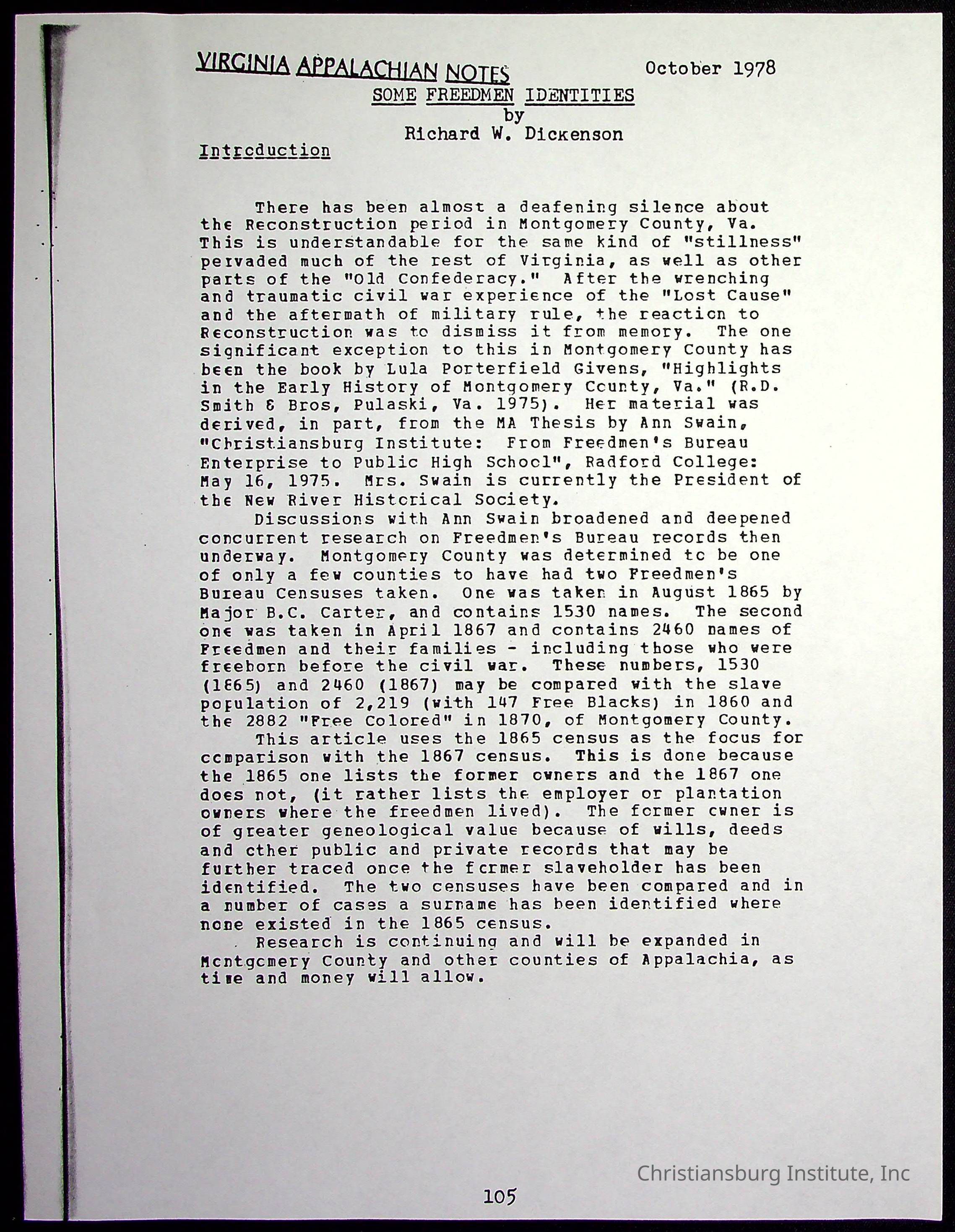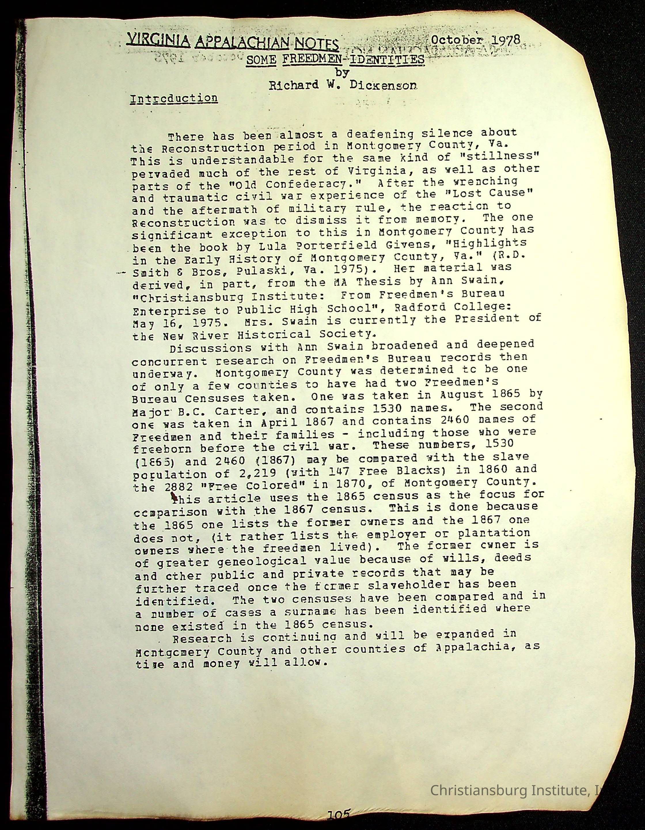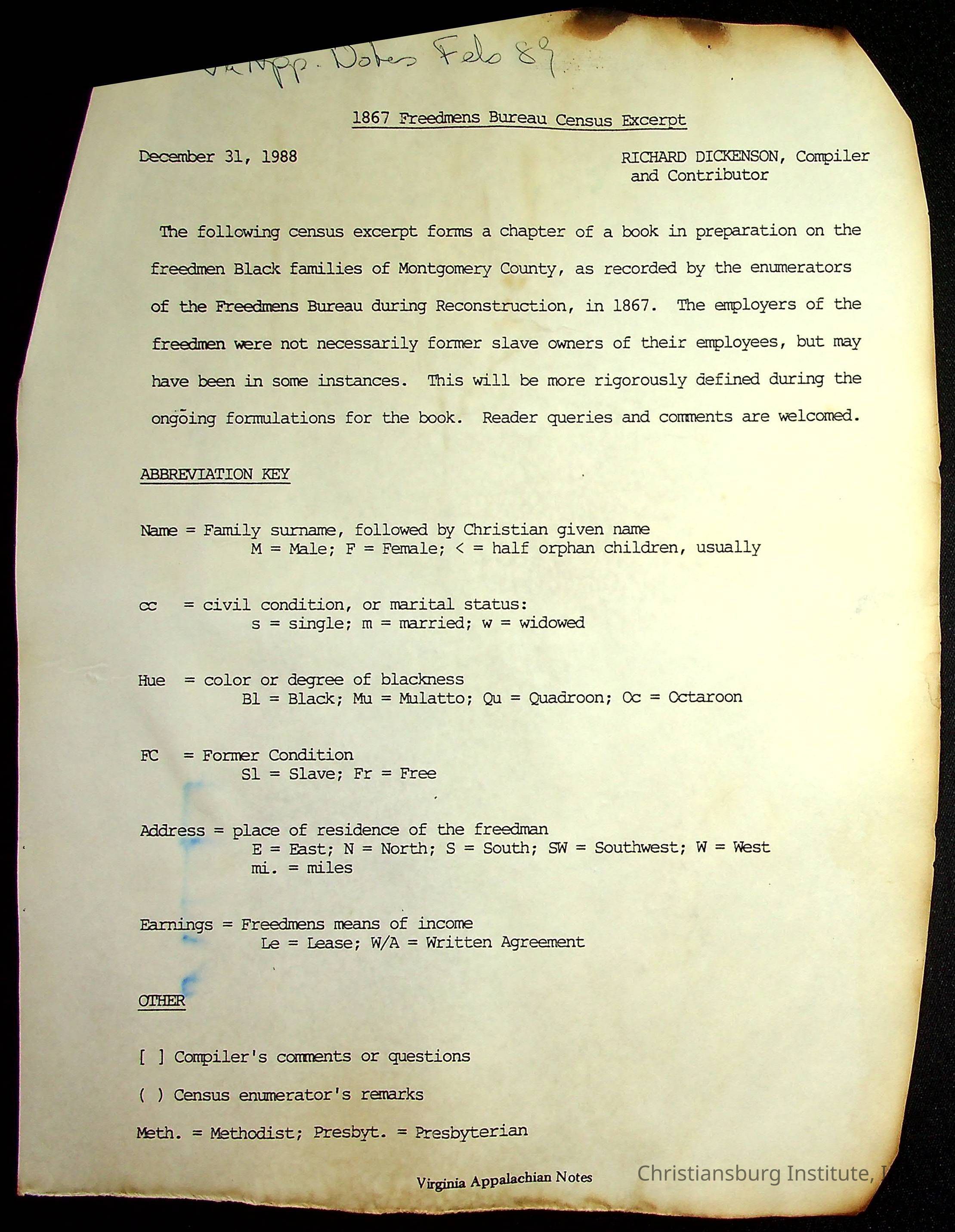 A folder of research materials collected by Radford University professor, Dr. Linda Killen. This folder is titled 'Dickenson Material' and includes research conducted about freedmen in the Southwest Virginia region by genealogist, Richard Dickenson.