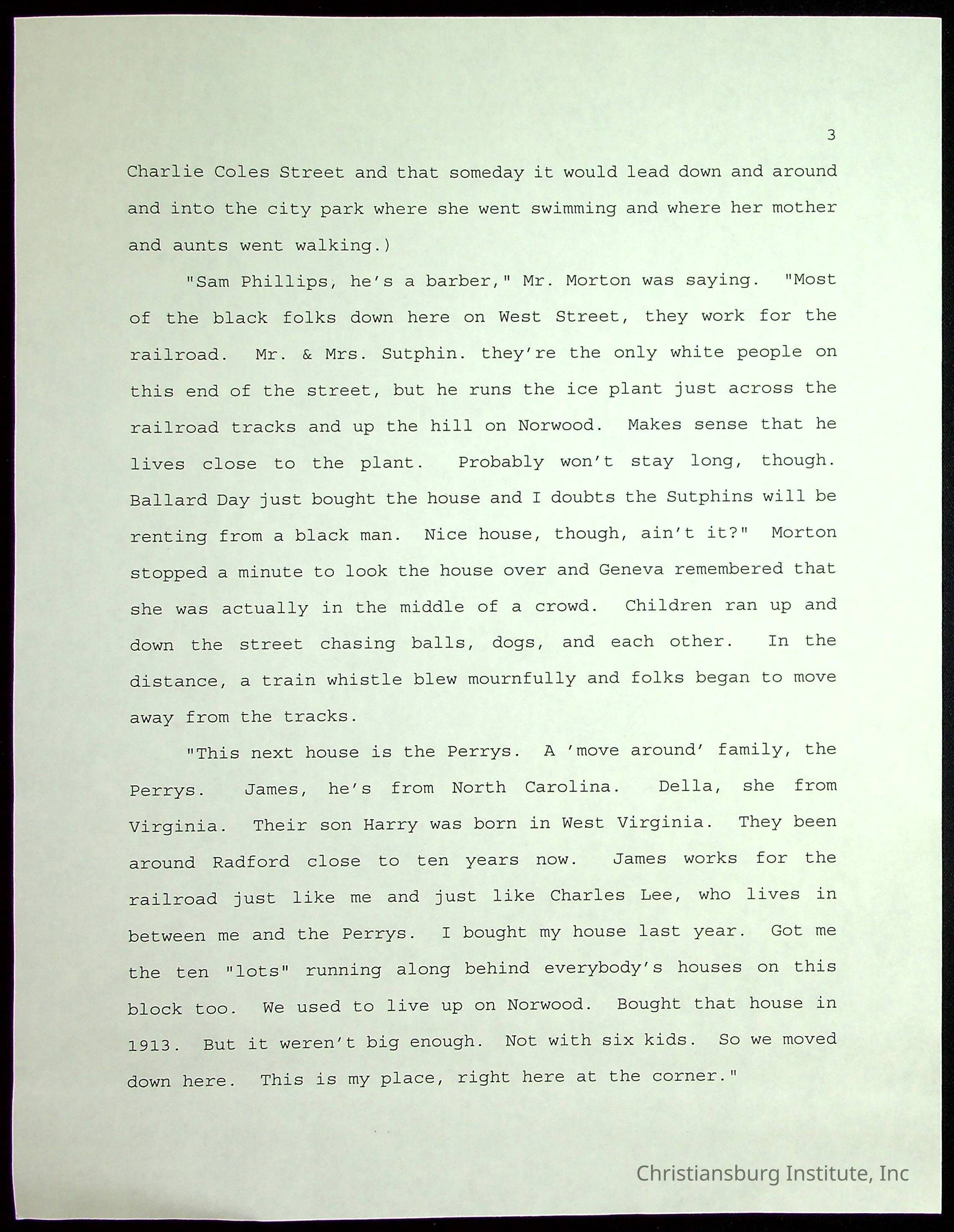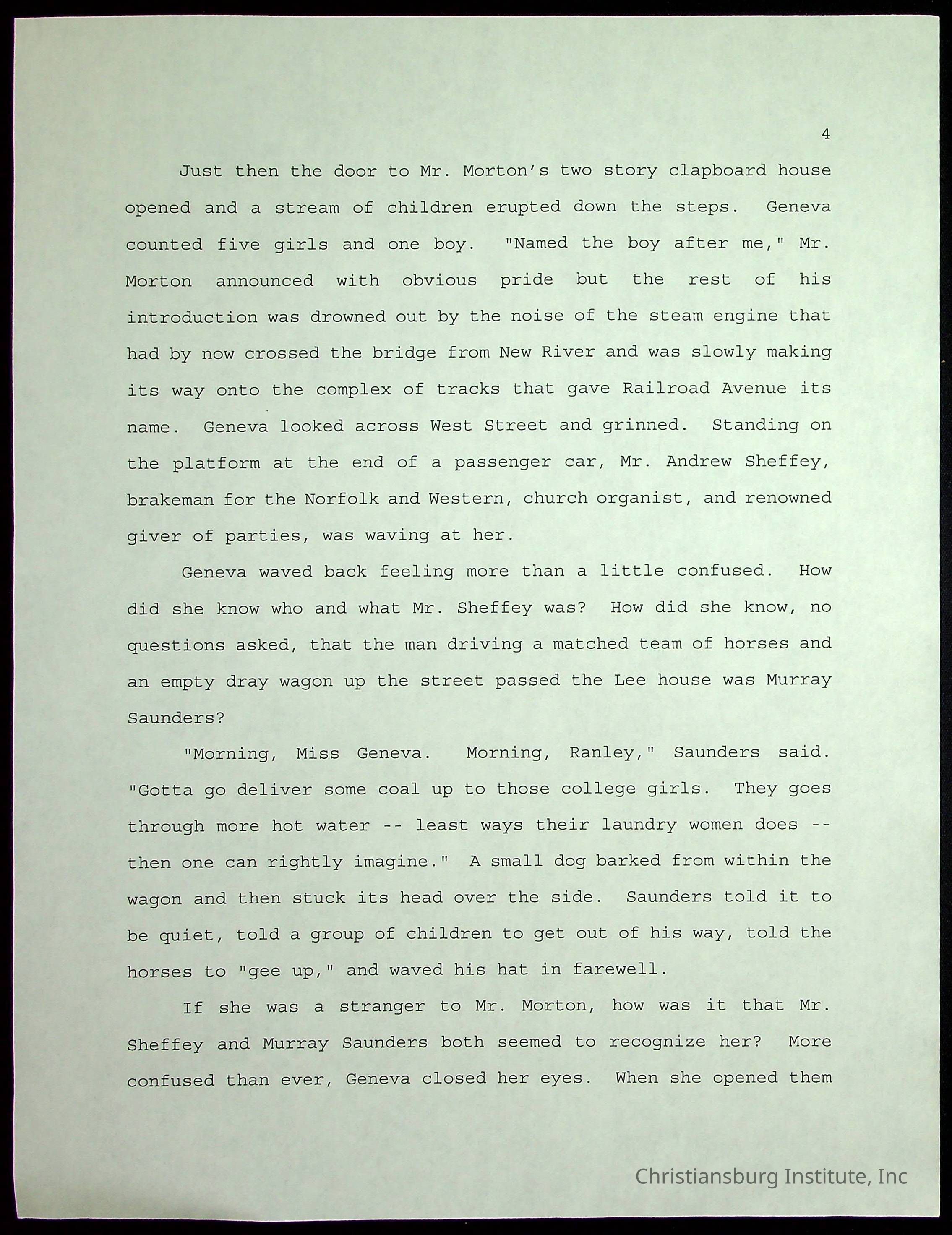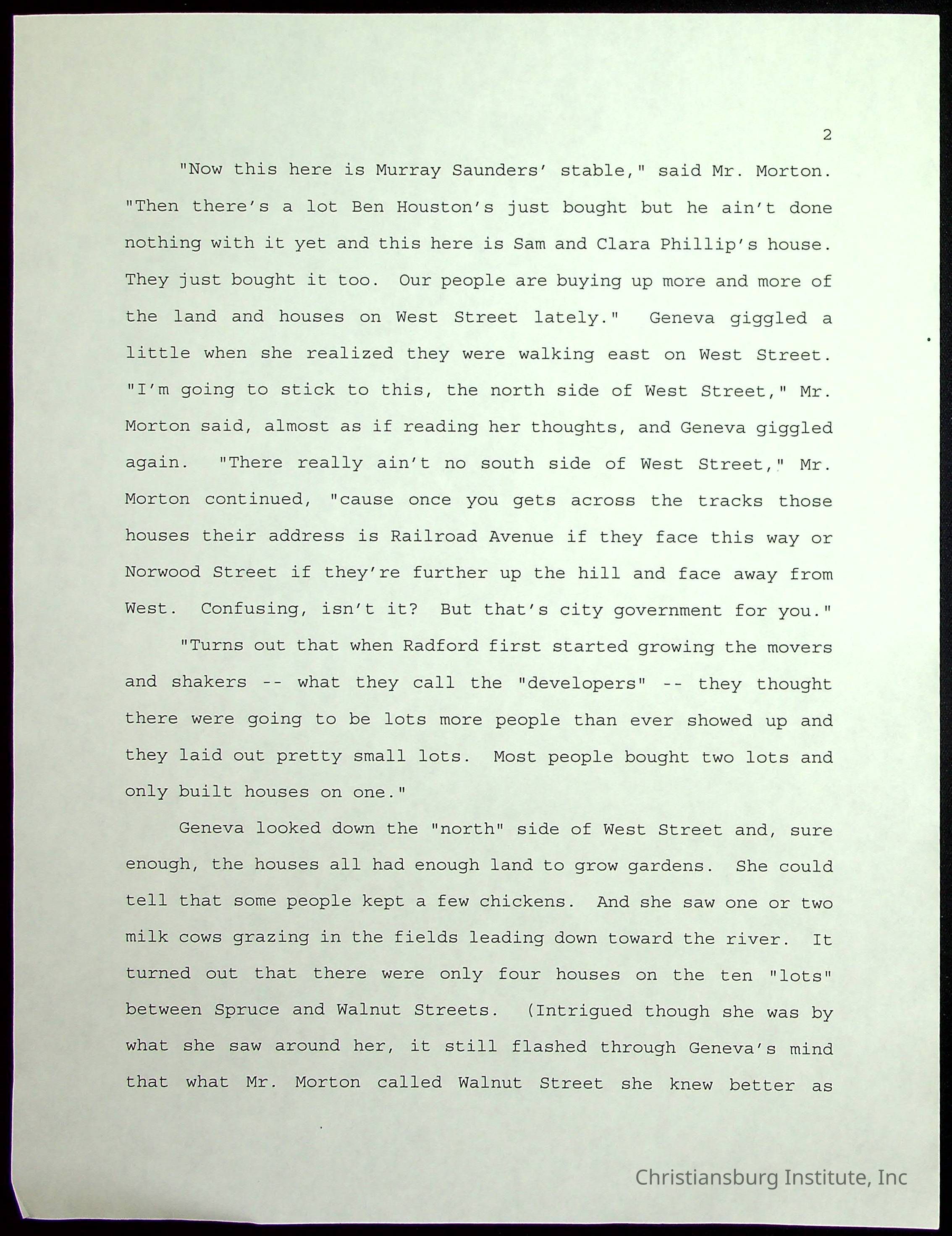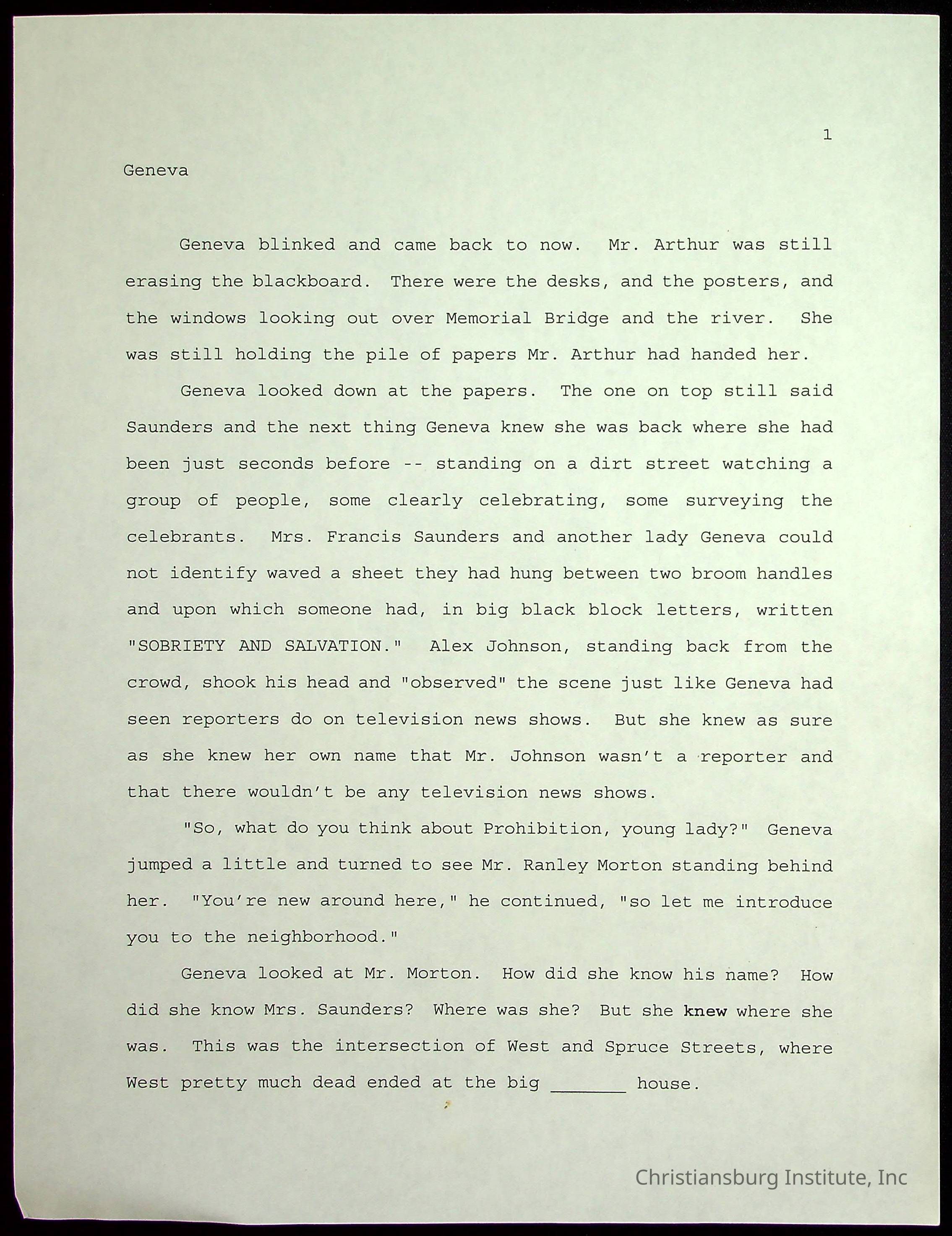 A folder of research materials collected by Radford University professor, Dr Linda Killen. This folder is titled 'Geneva' and includes a story about 'Geneva' set in Radford, Virginia, undated.
