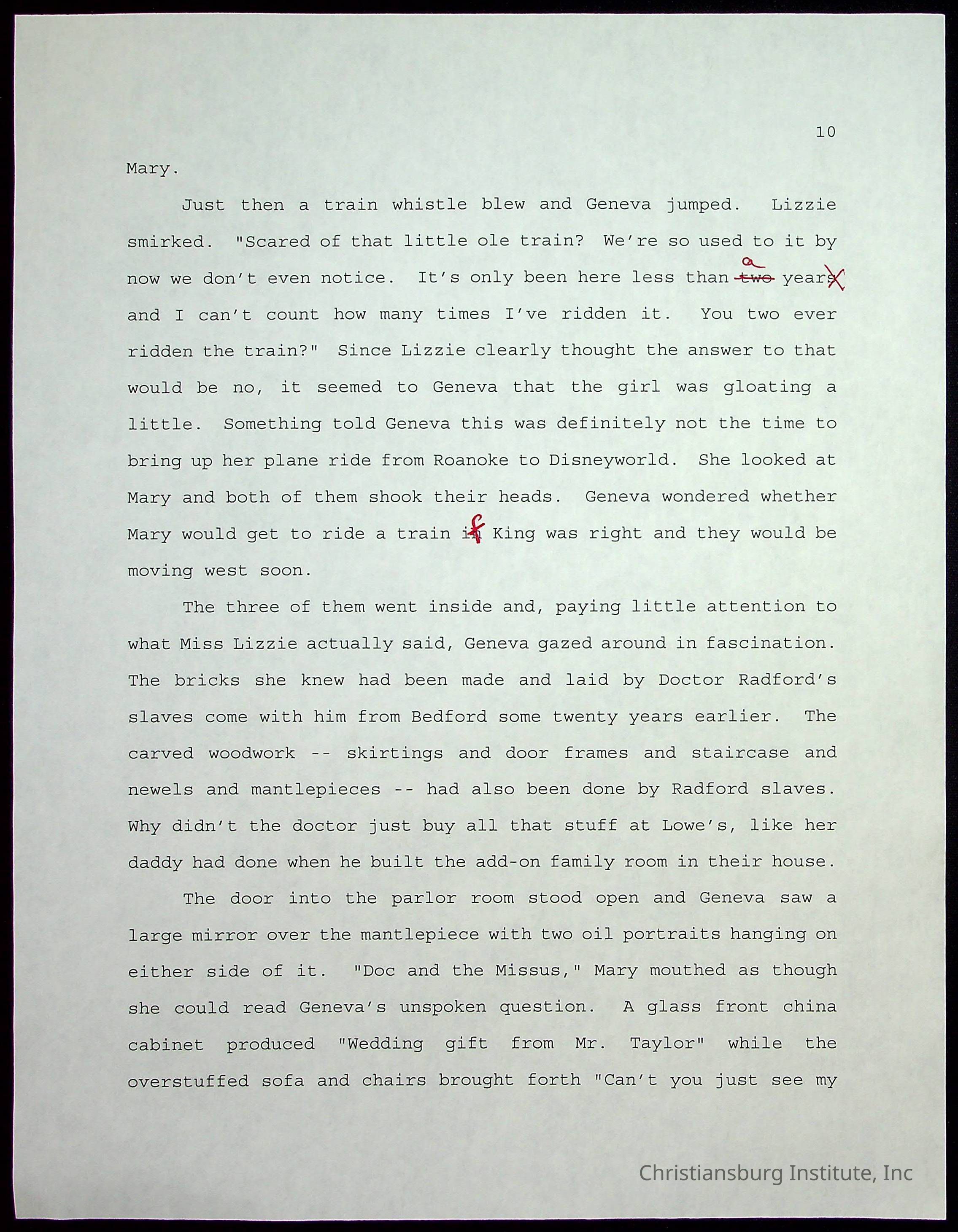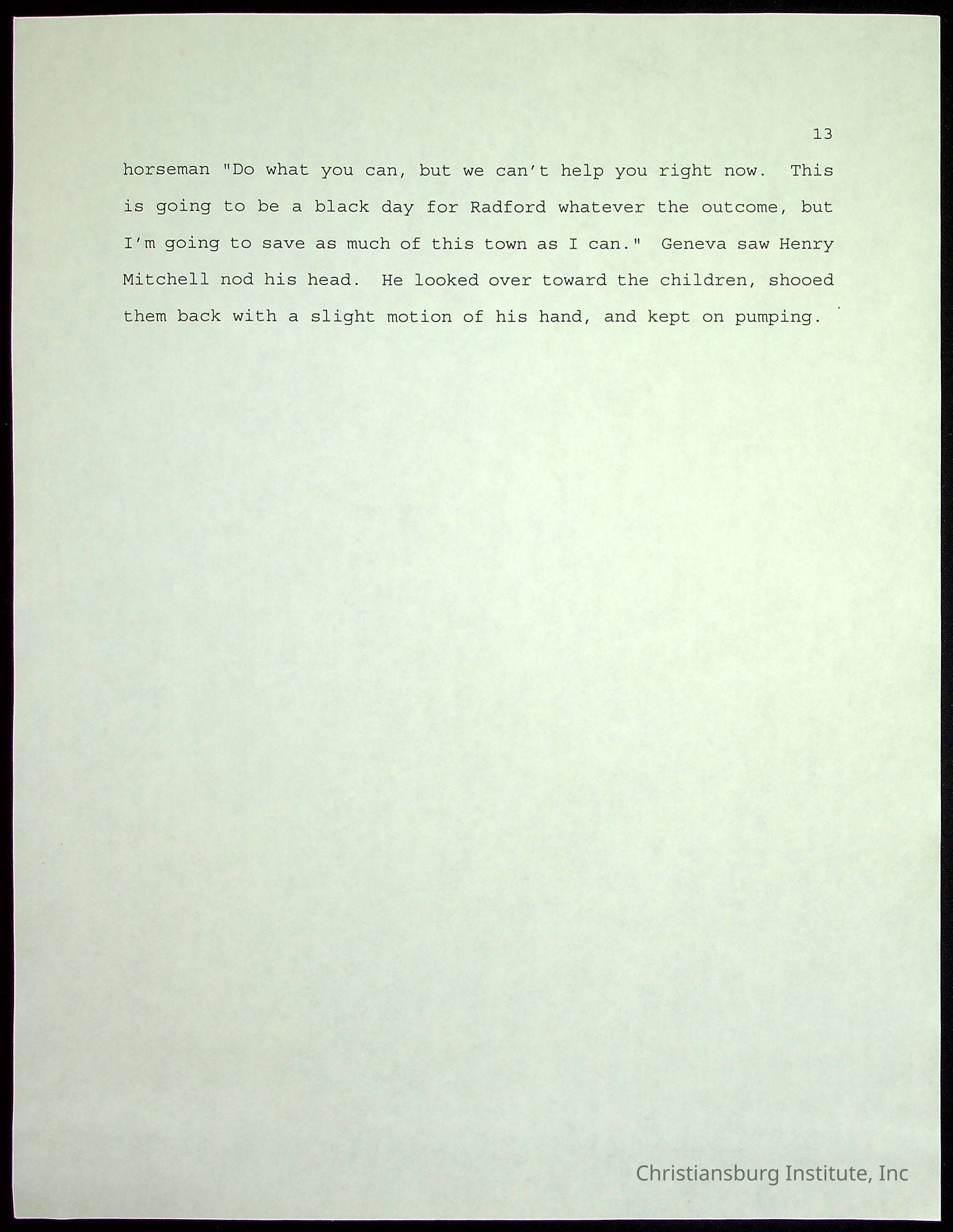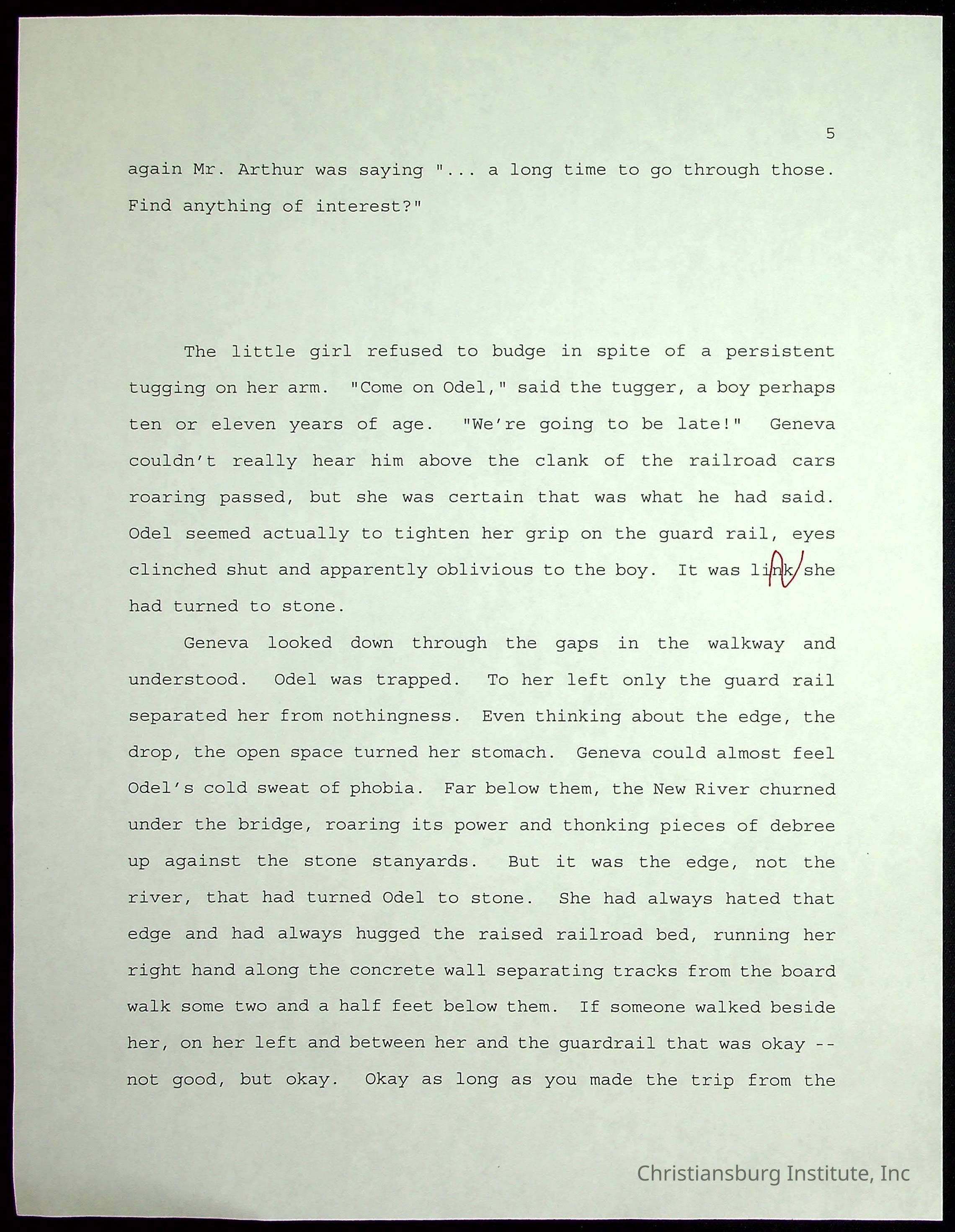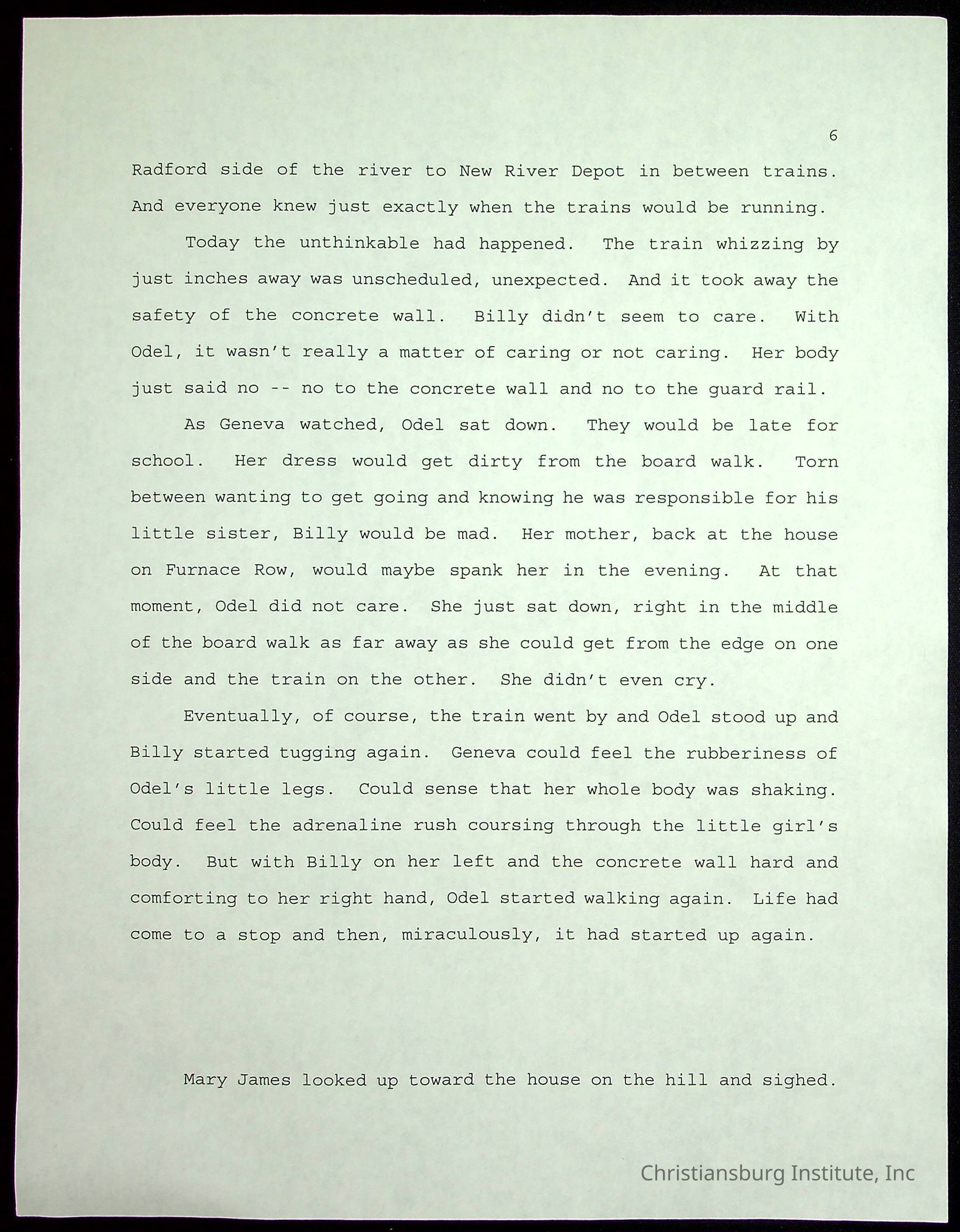 A folder of research materials collected by Radford University professor, Dr Linda Killen. This folder is titled 'Geneva' and includes a story about 'Geneva' set in Radford, Virginia, undated.