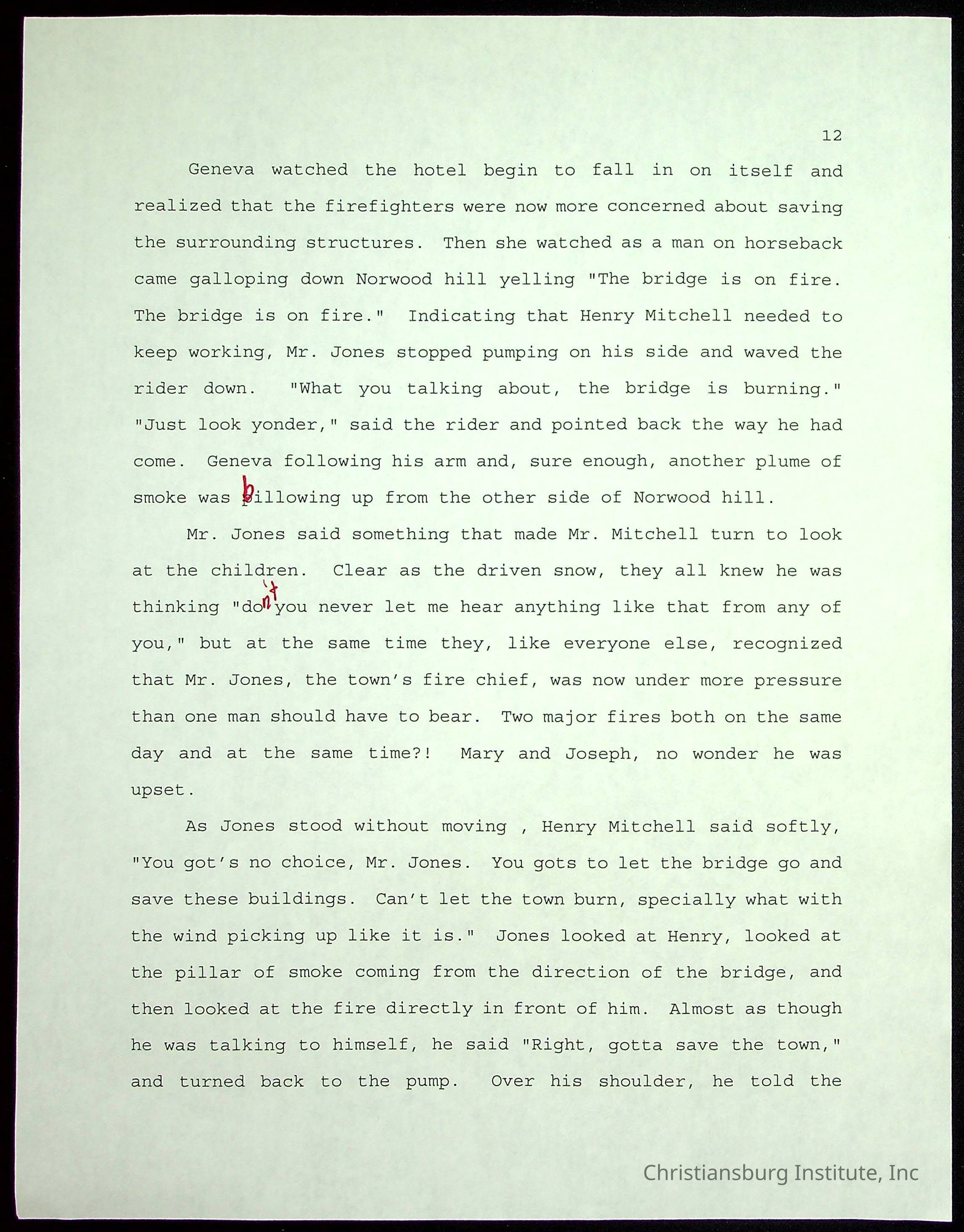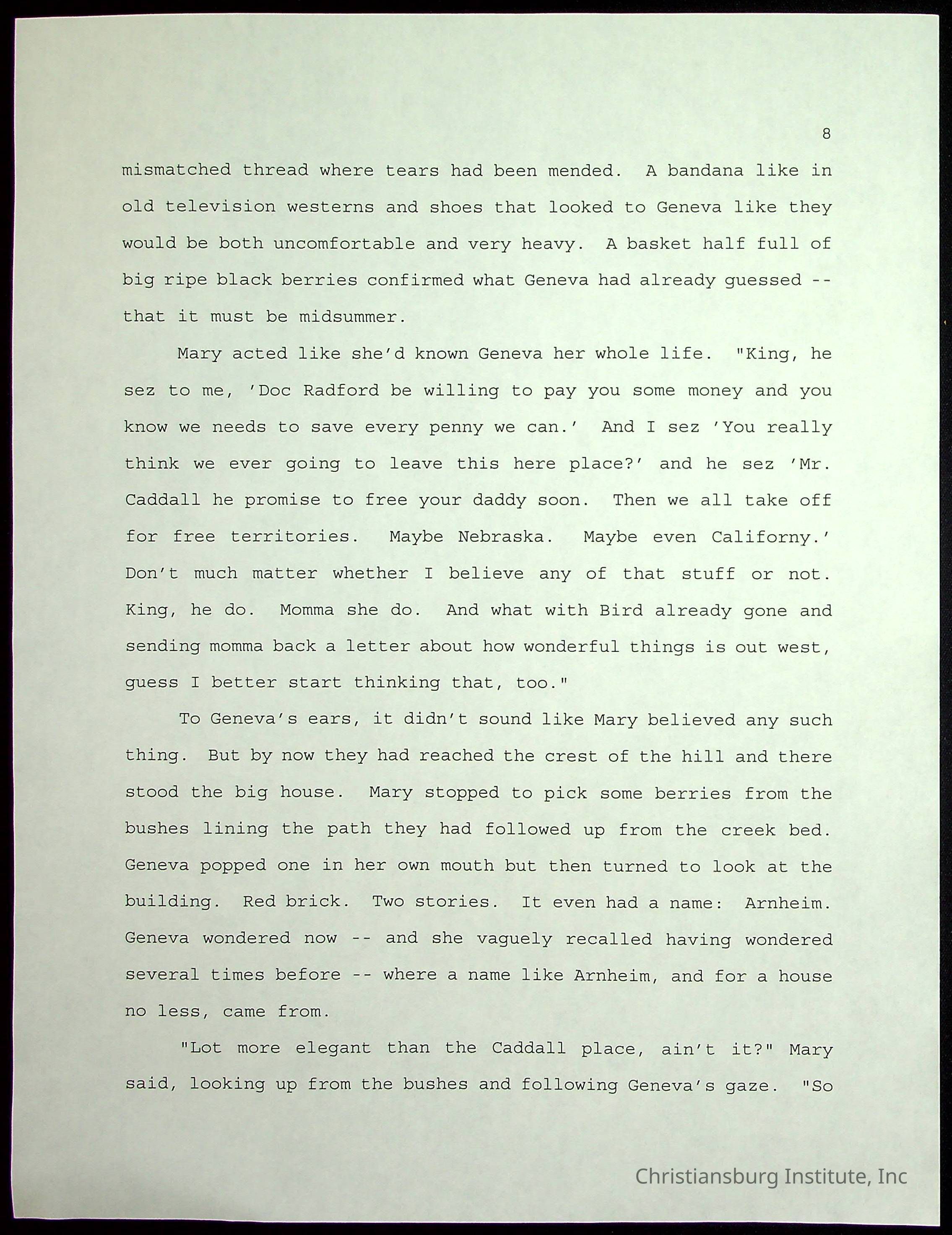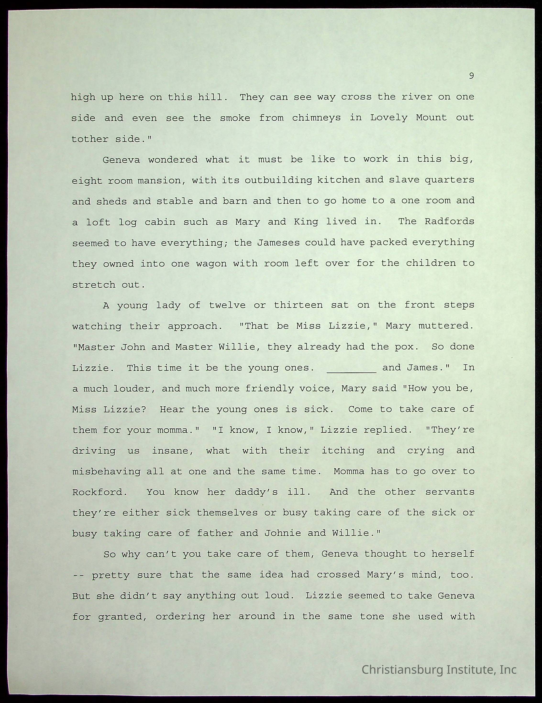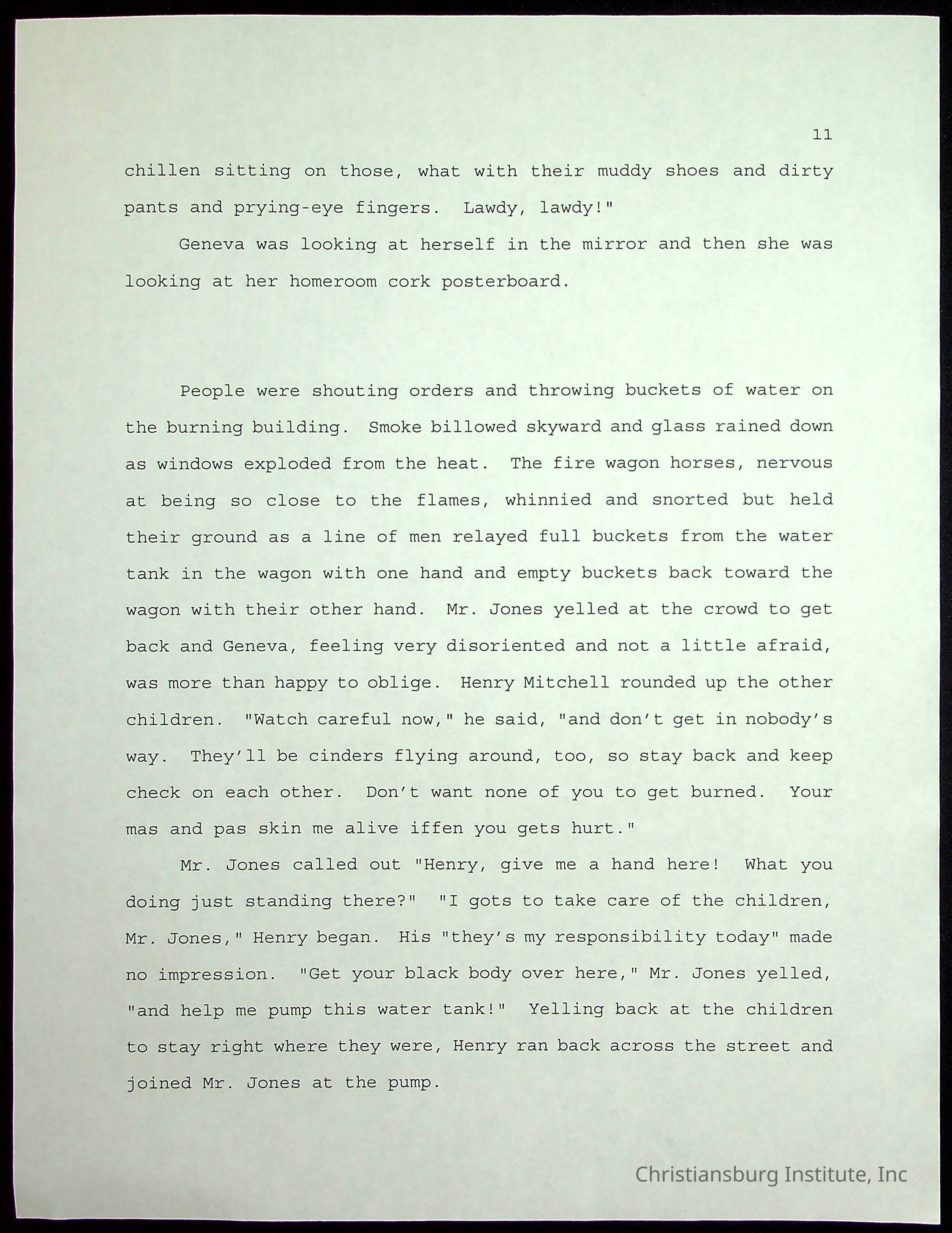 A folder of research materials collected by Radford University professor, Dr Linda Killen. This folder is titled 'Geneva' and includes a story about 'Geneva' set in Radford, Virginia, undated.