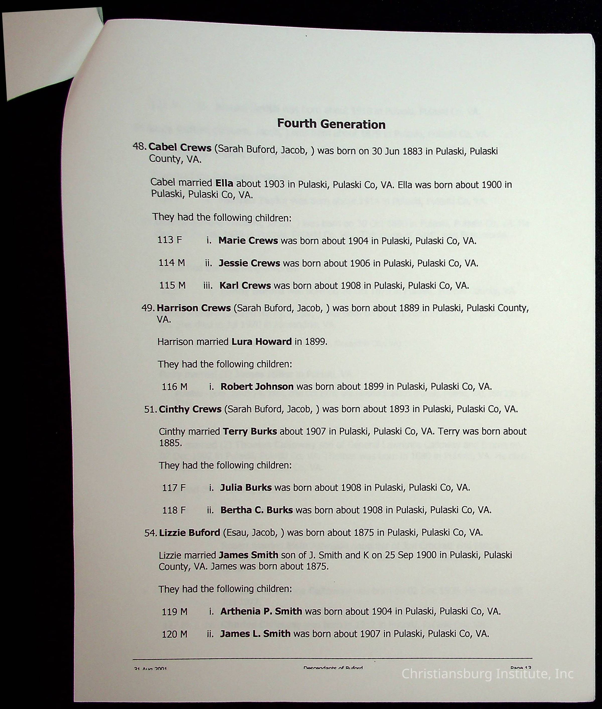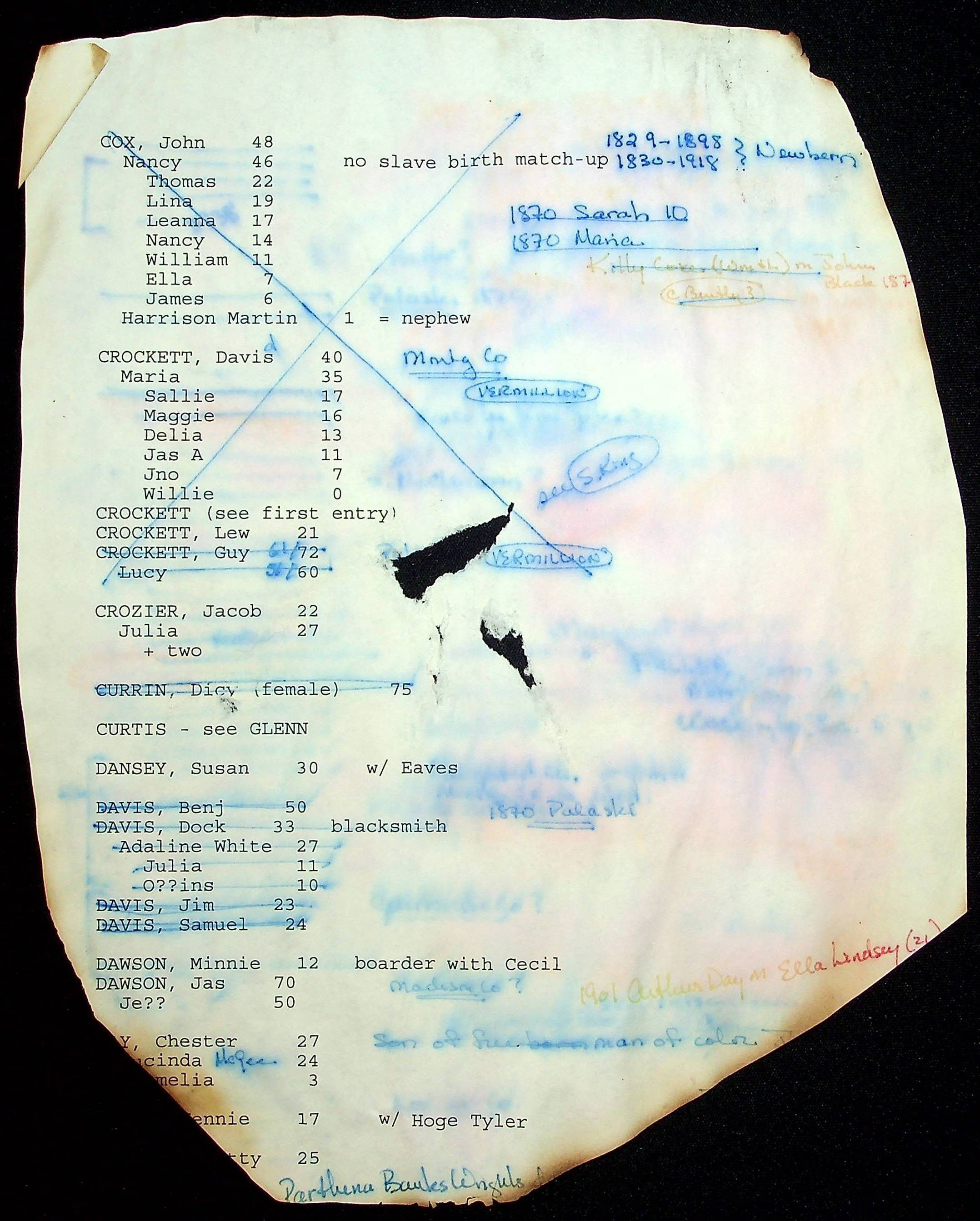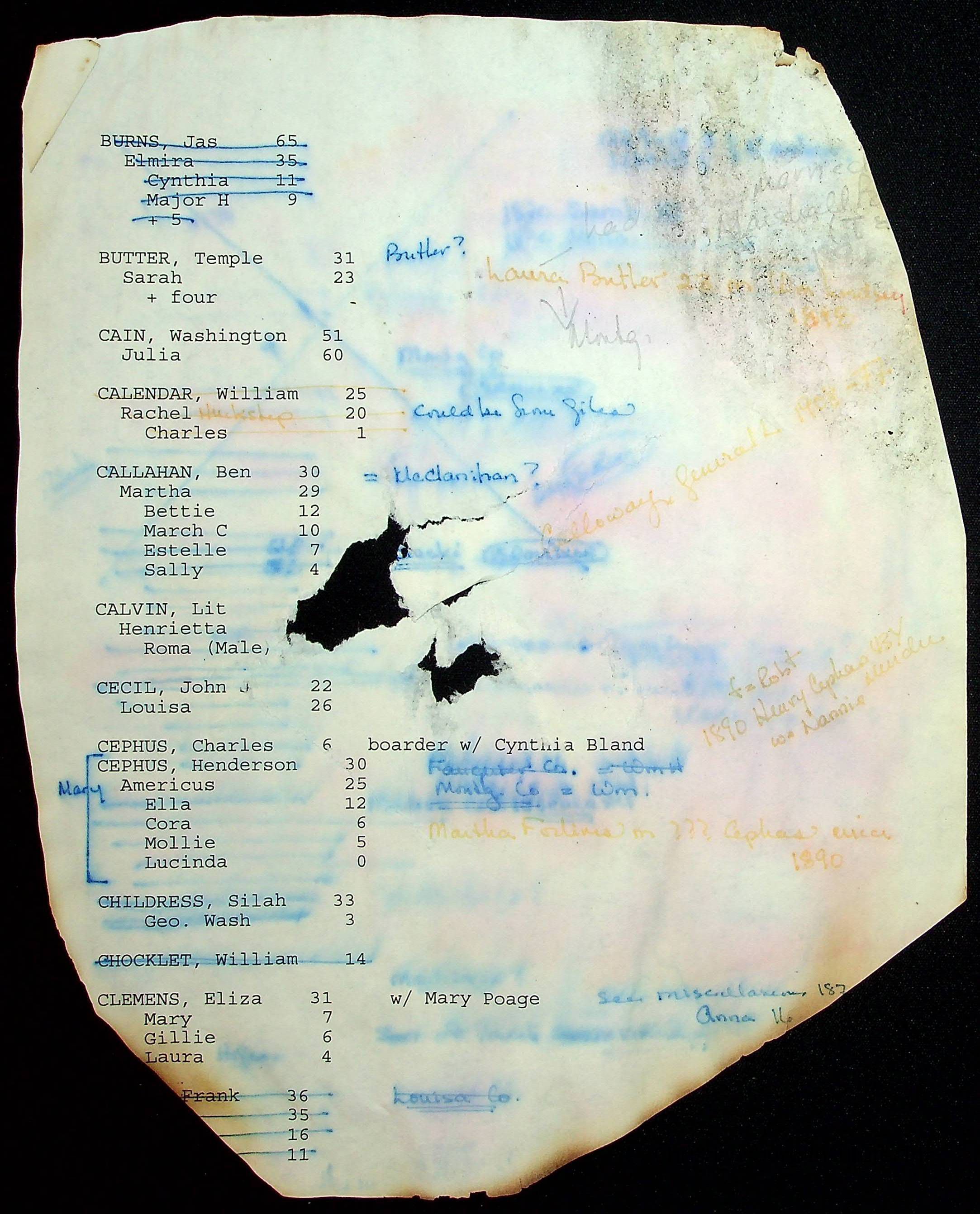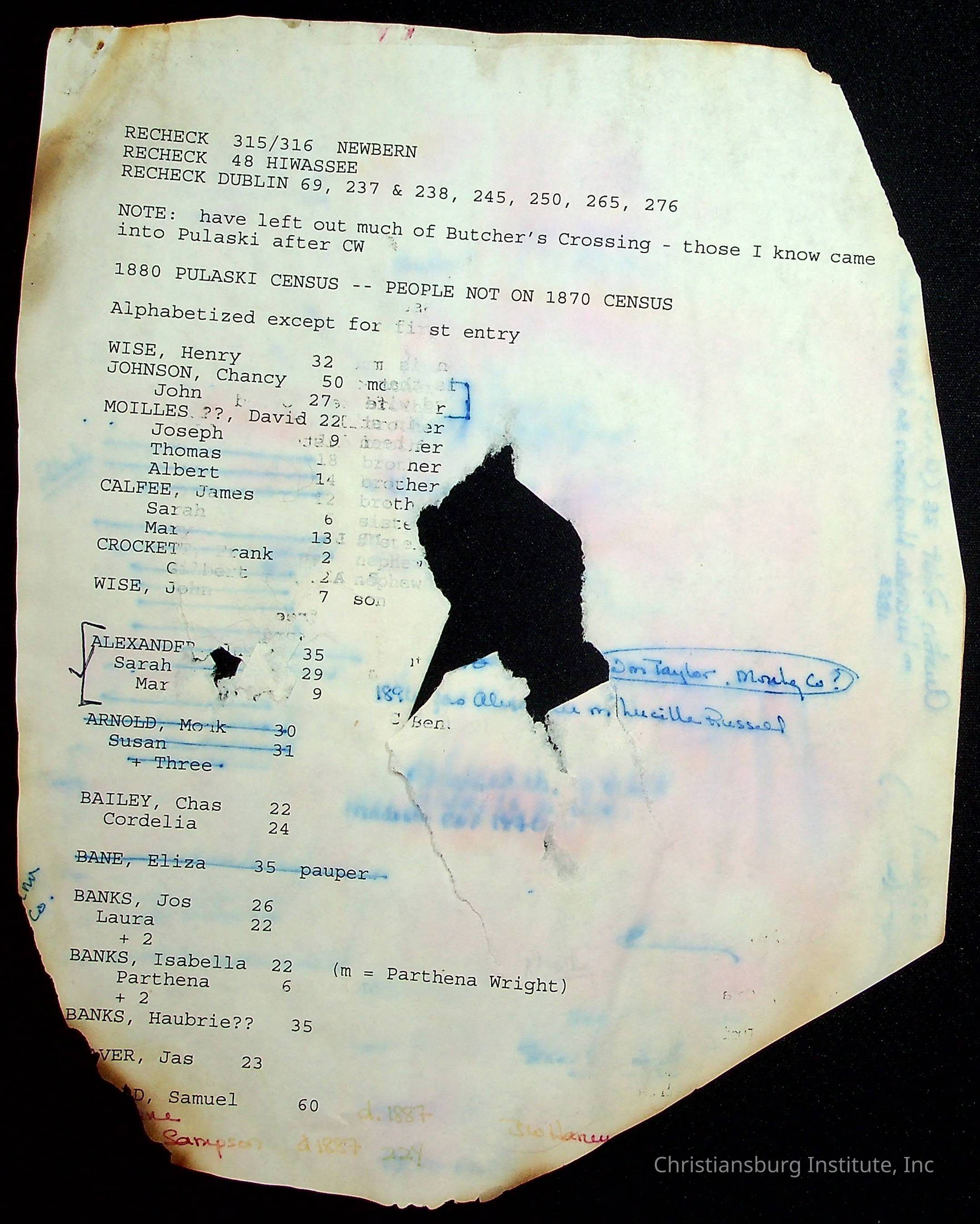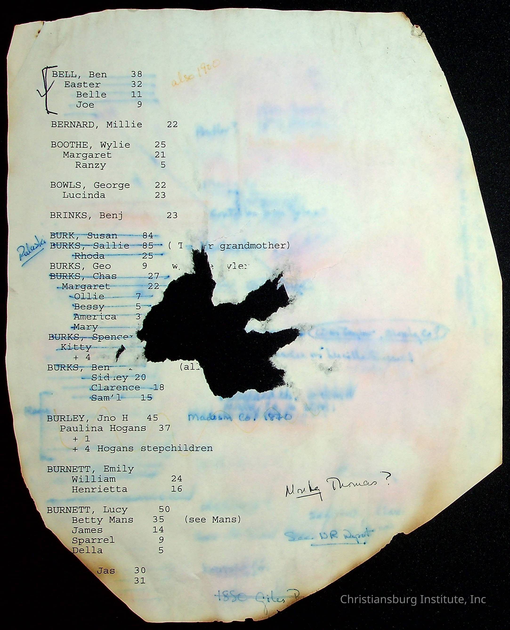 A folder of research materials collected by Radford University professor, Dr Linda Killen. This folder is titled 'A & B' and includes Killen's research on the A and B families names of Pulaski County, Virginia. This folder includes genealogy record, marriage licenses, and census records.