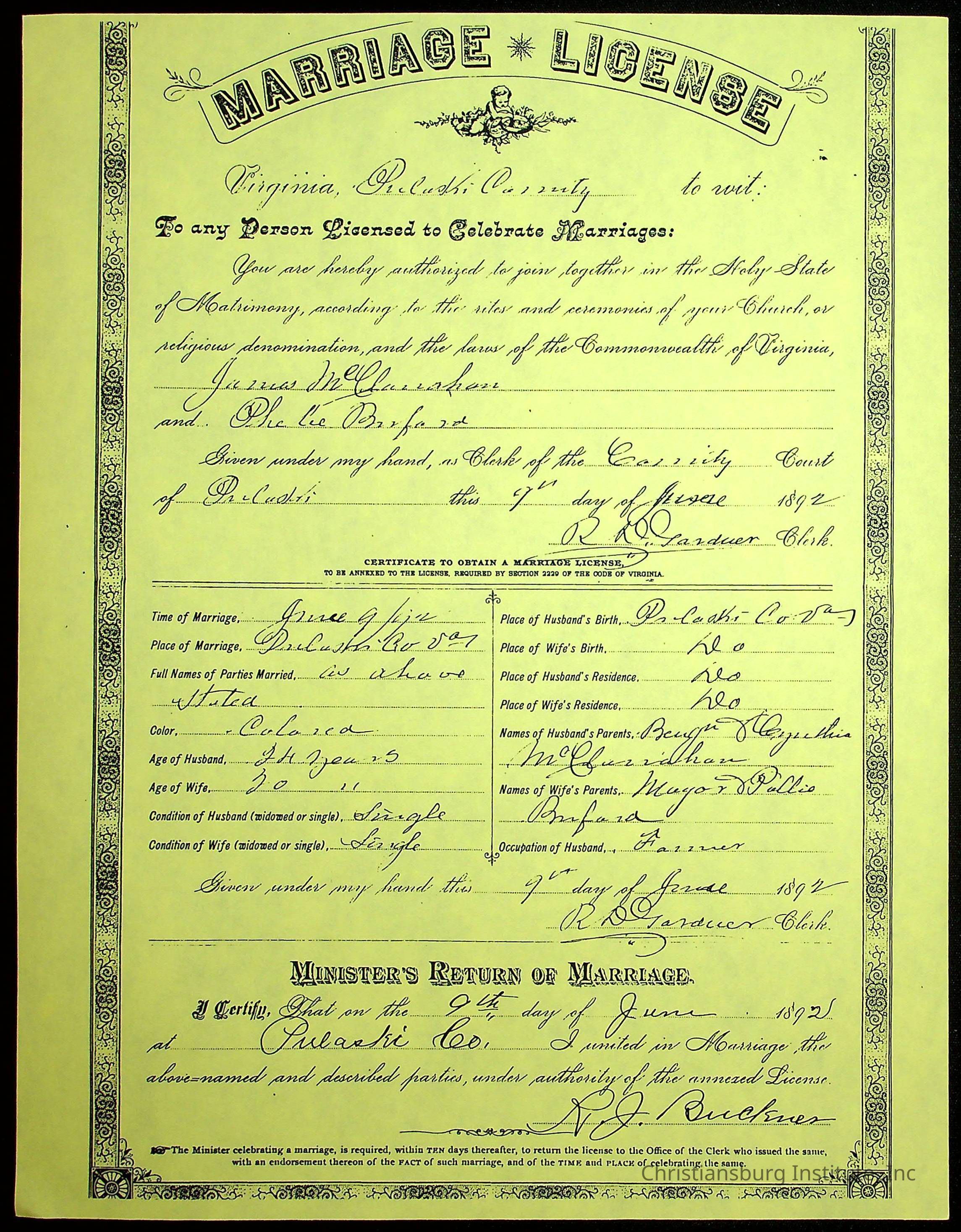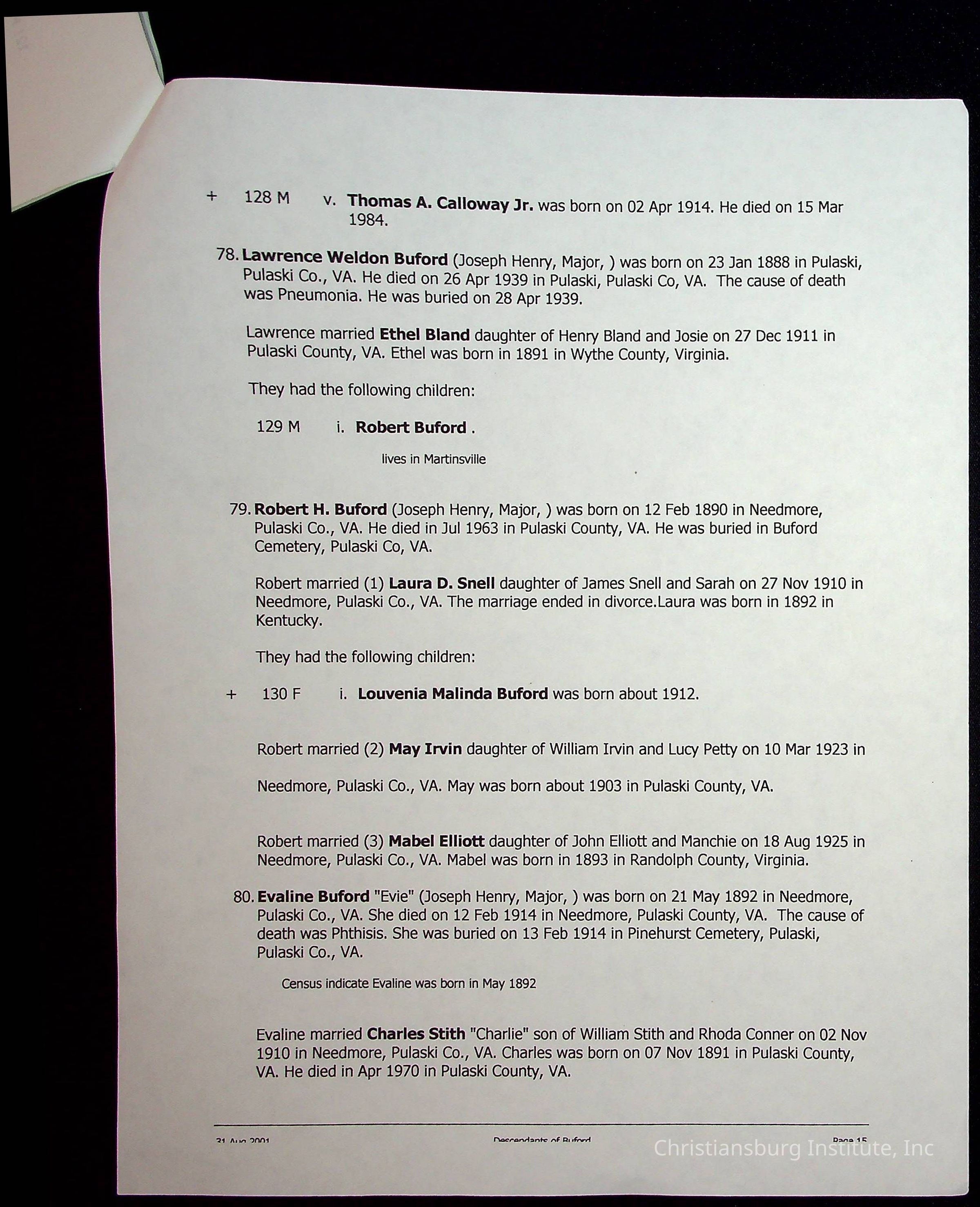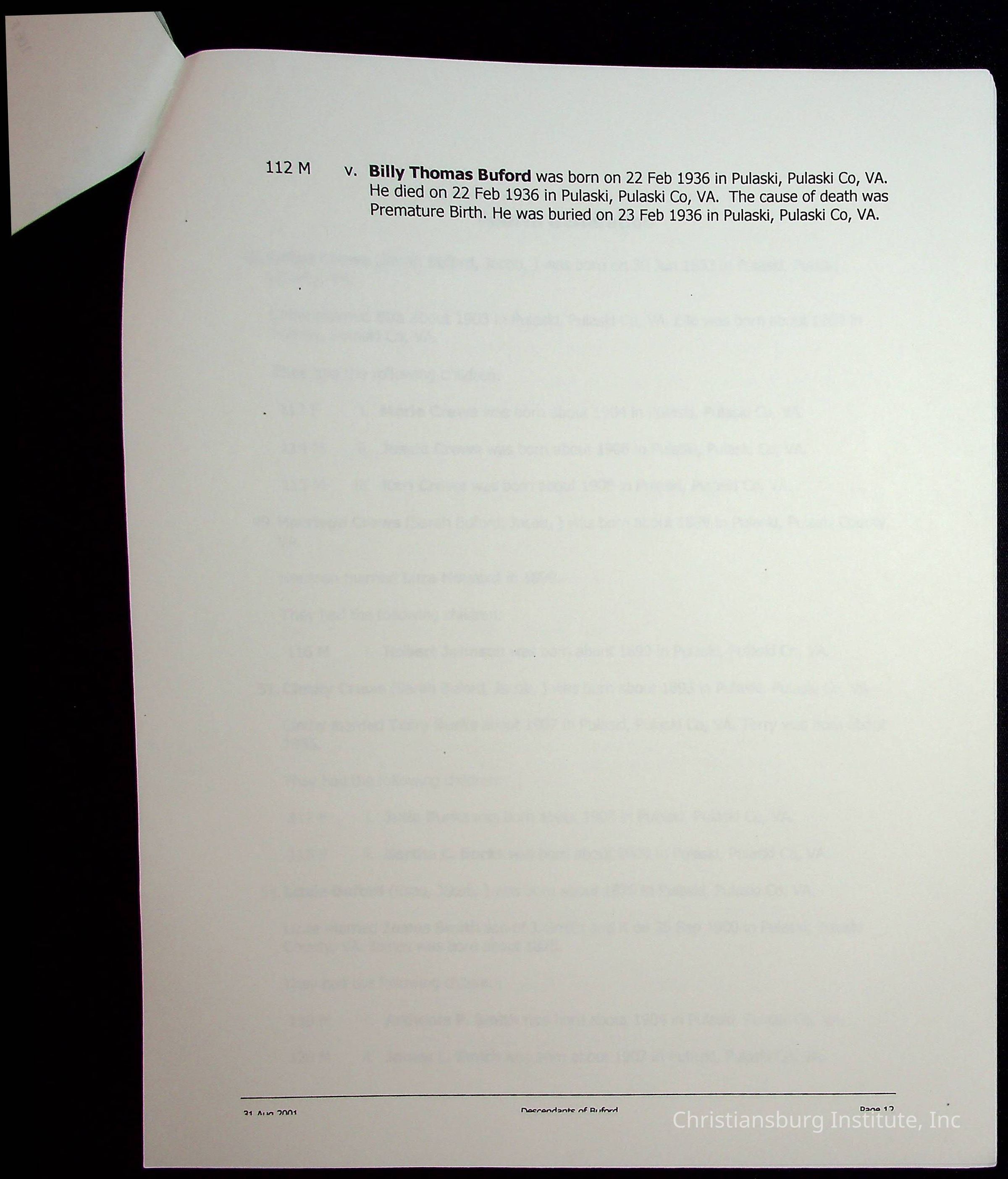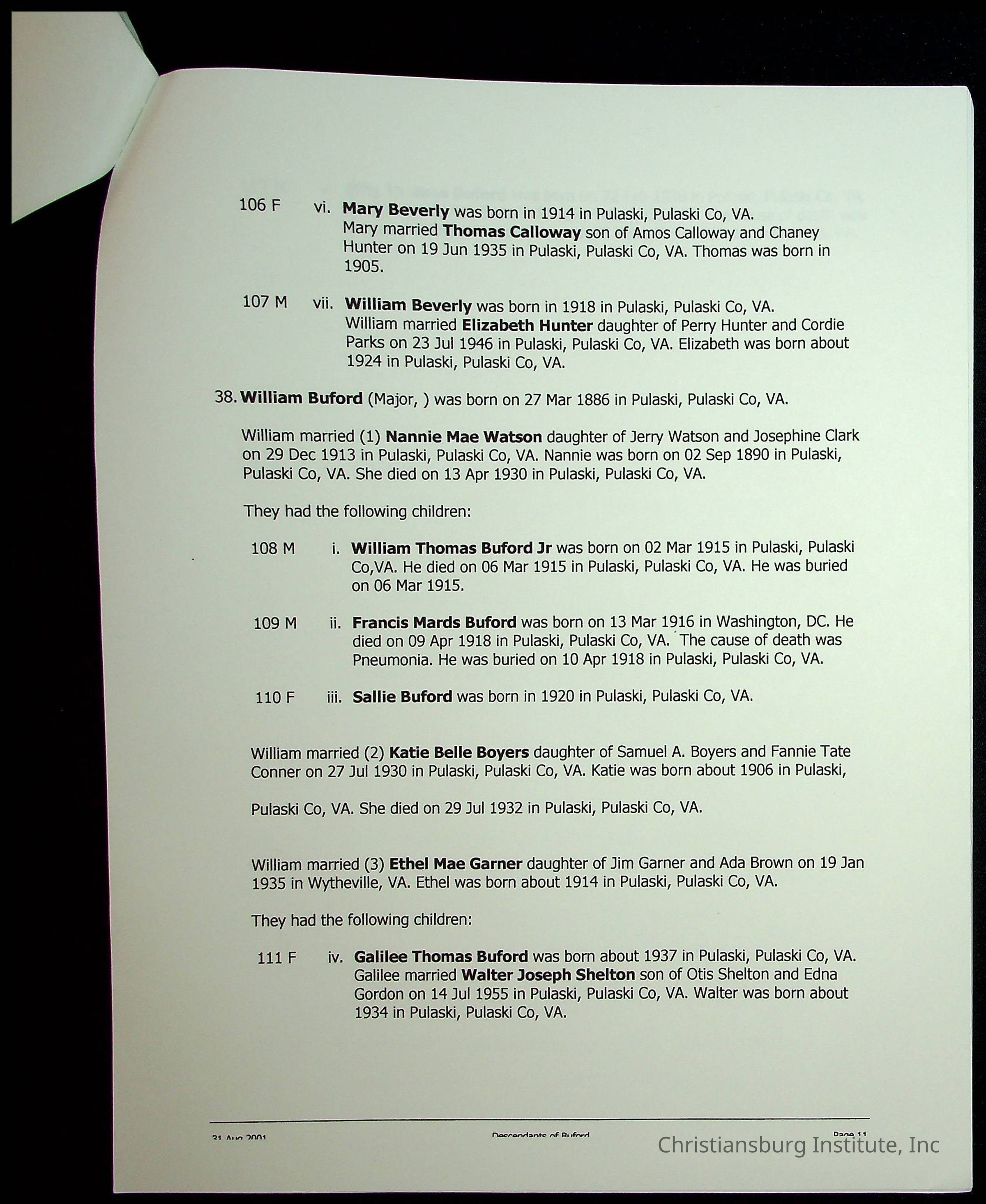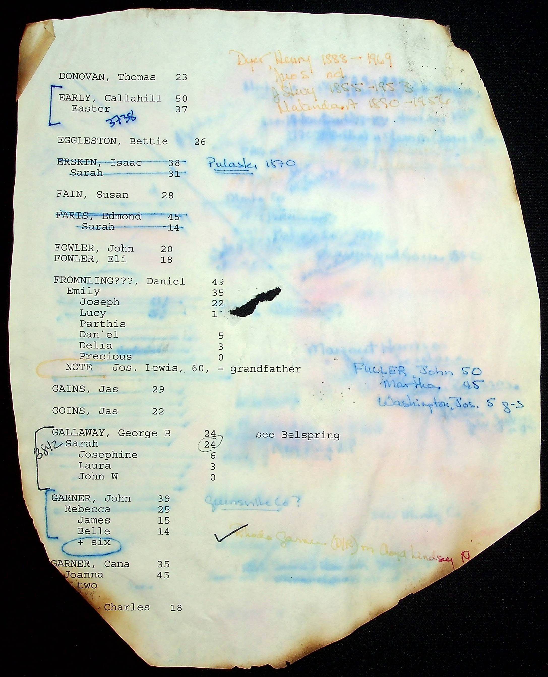 A folder of research materials collected by Radford University professor, Dr Linda Killen. This folder is titled 'A & B' and includes Killen's research on the A and B families names of Pulaski County, Virginia. This folder includes genealogy record, marriage licenses, and census records.