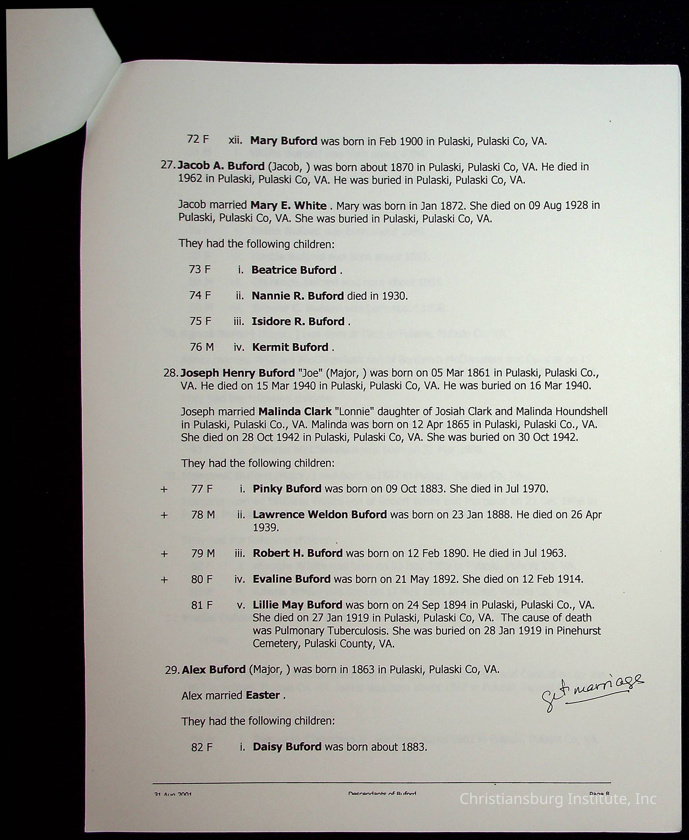 A folder of research materials collected by Radford University professor, Dr Linda Killen. This folder is titled 'A & B' and includes Killen's research on the A and B families names of Pulaski County, Virginia. This folder includes genealogy record, marriage licences, and census records.