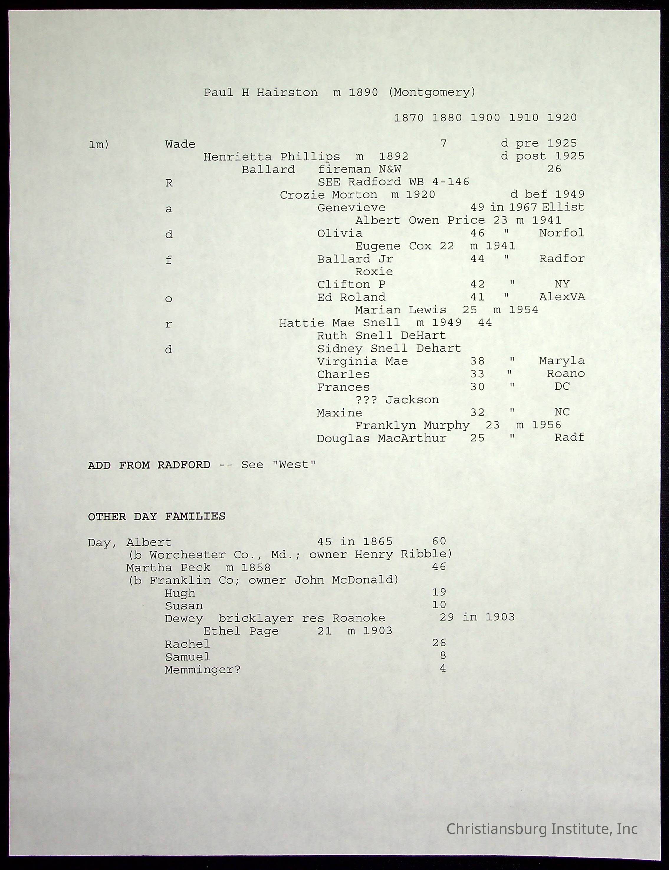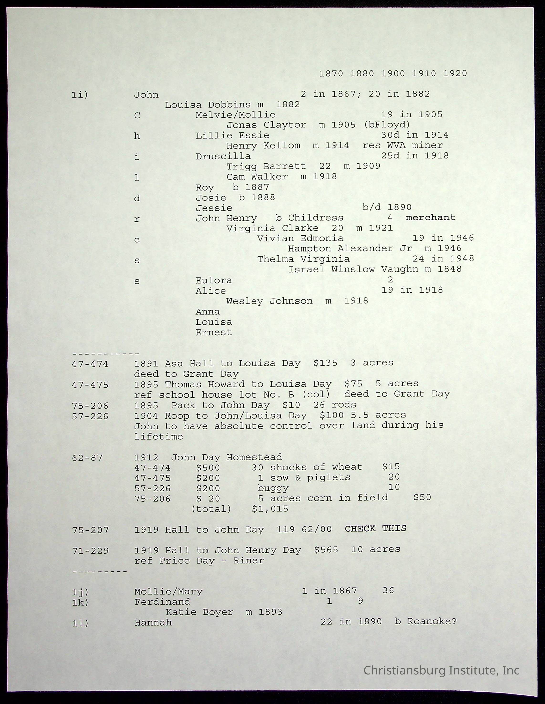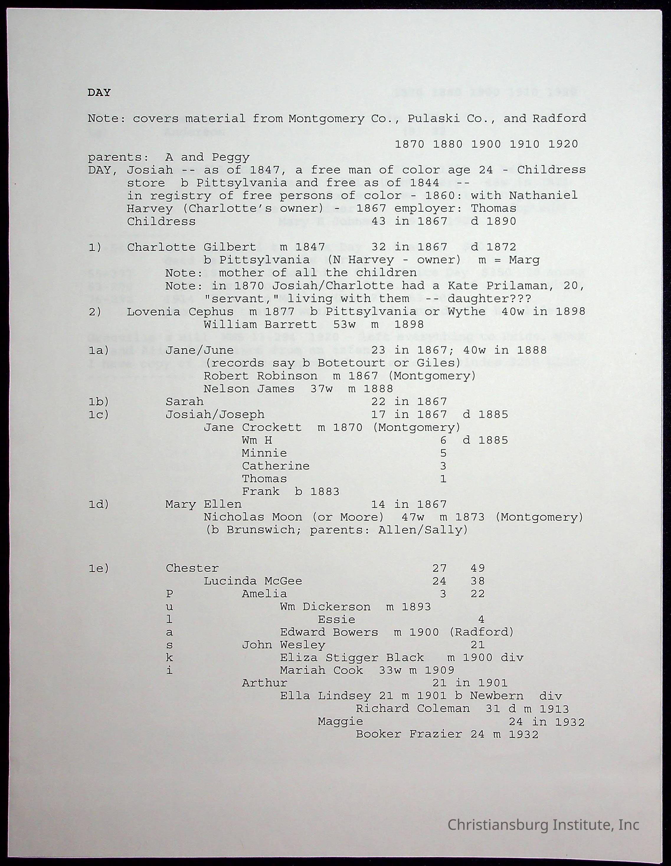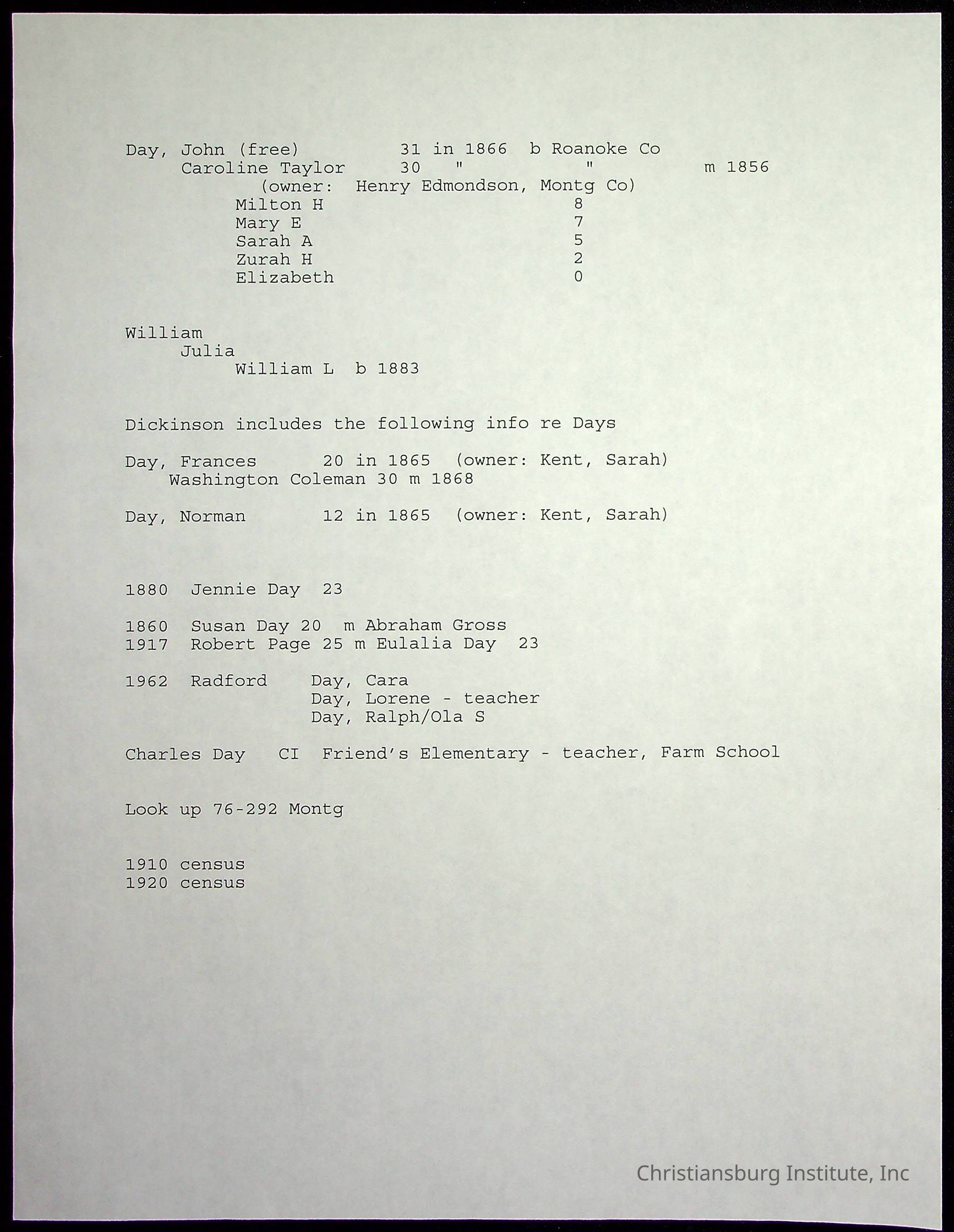 A folder of research materials collected by Radford University professor, Dr Linda Killen. This folder is titled 'Day' and includes Killen's research on the Day families of Pulaski County, Virginia. This folder includes genealogy records and census records.