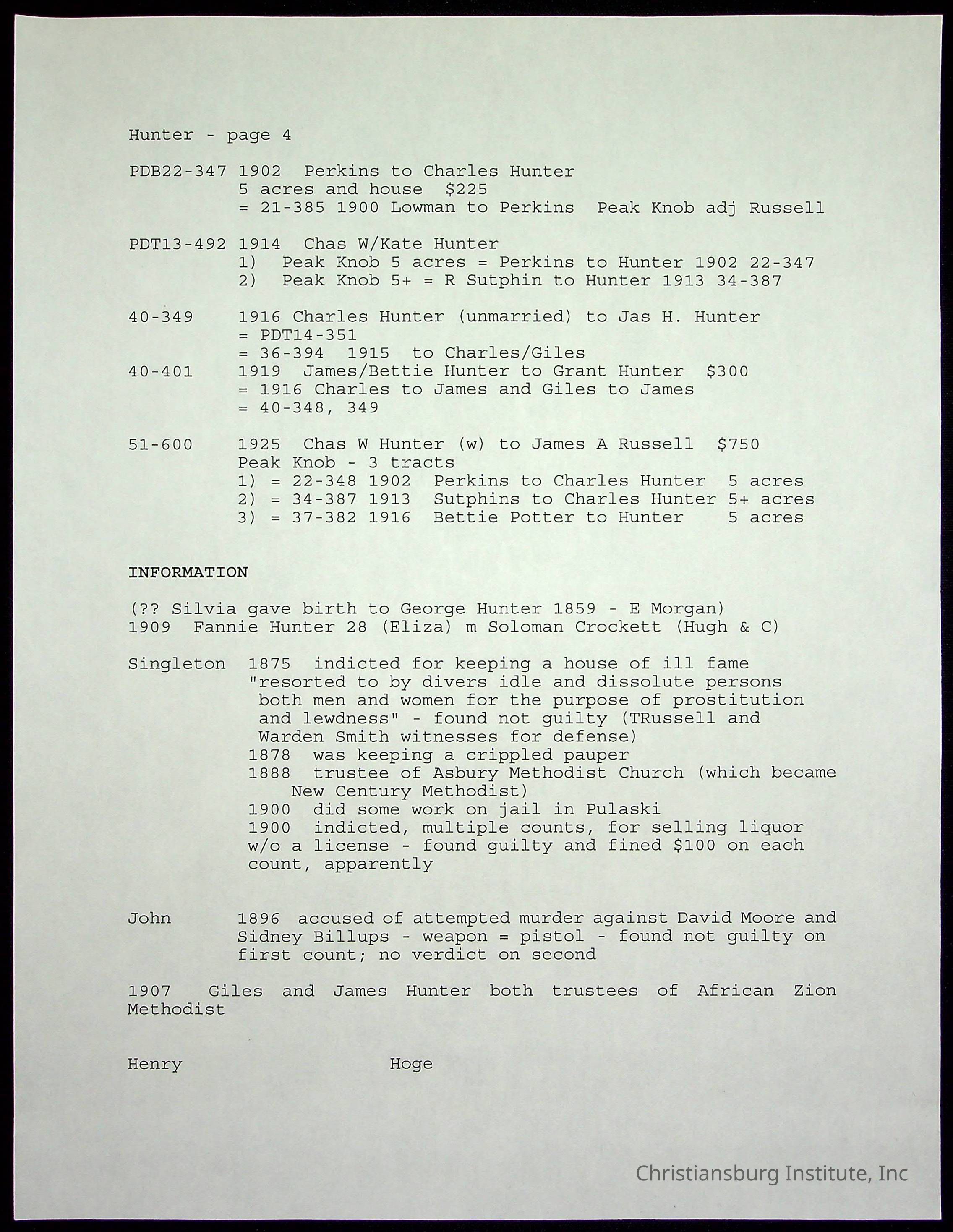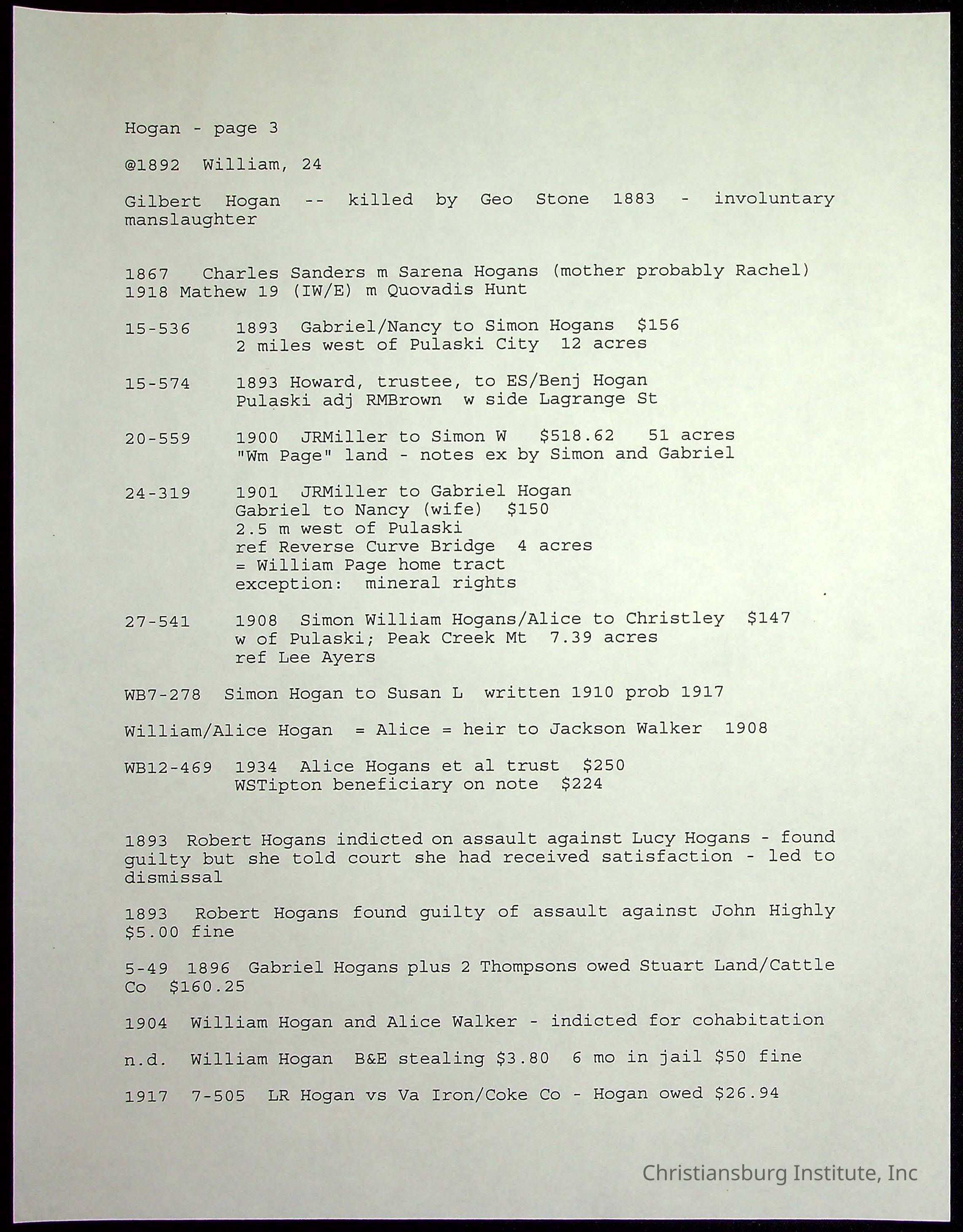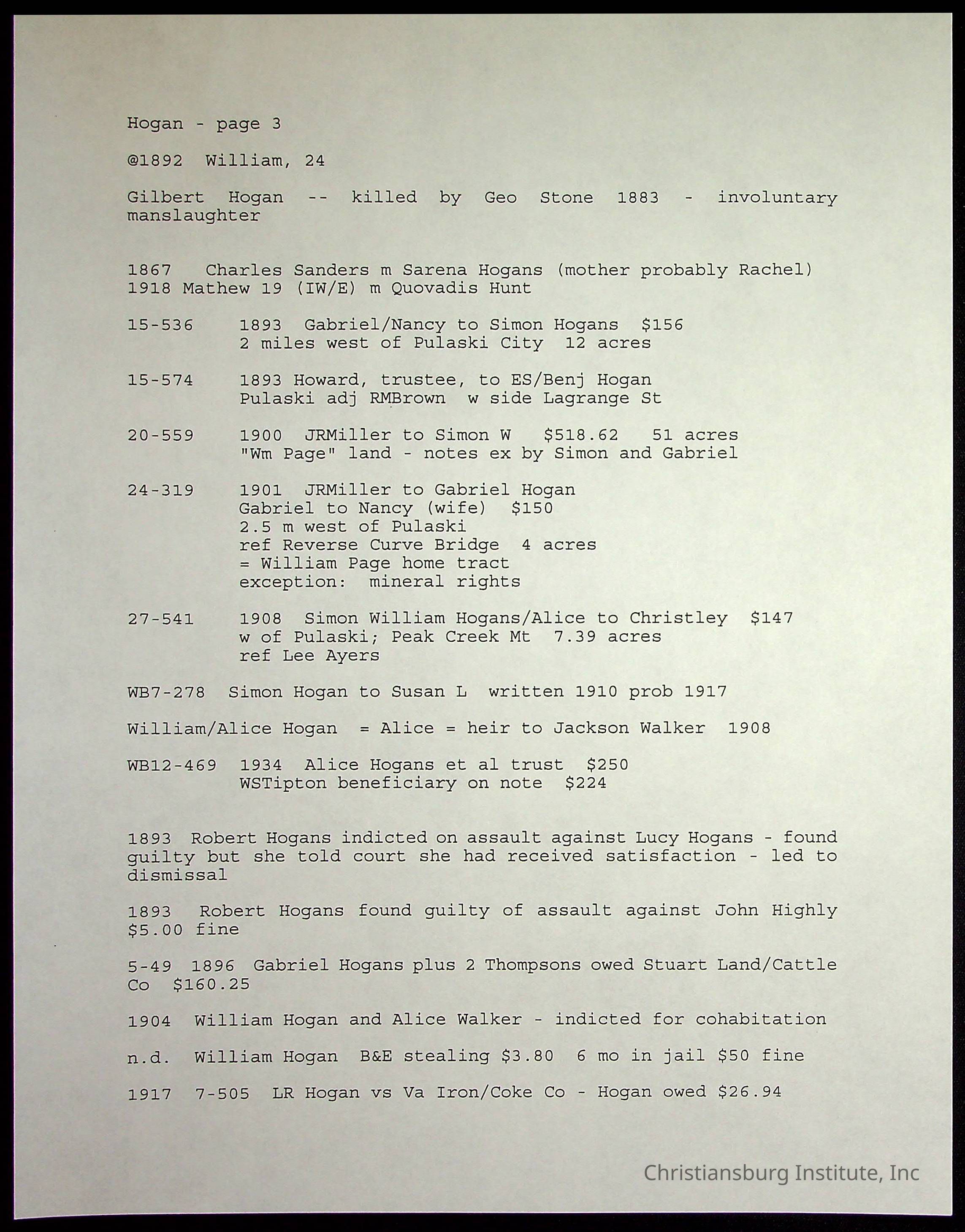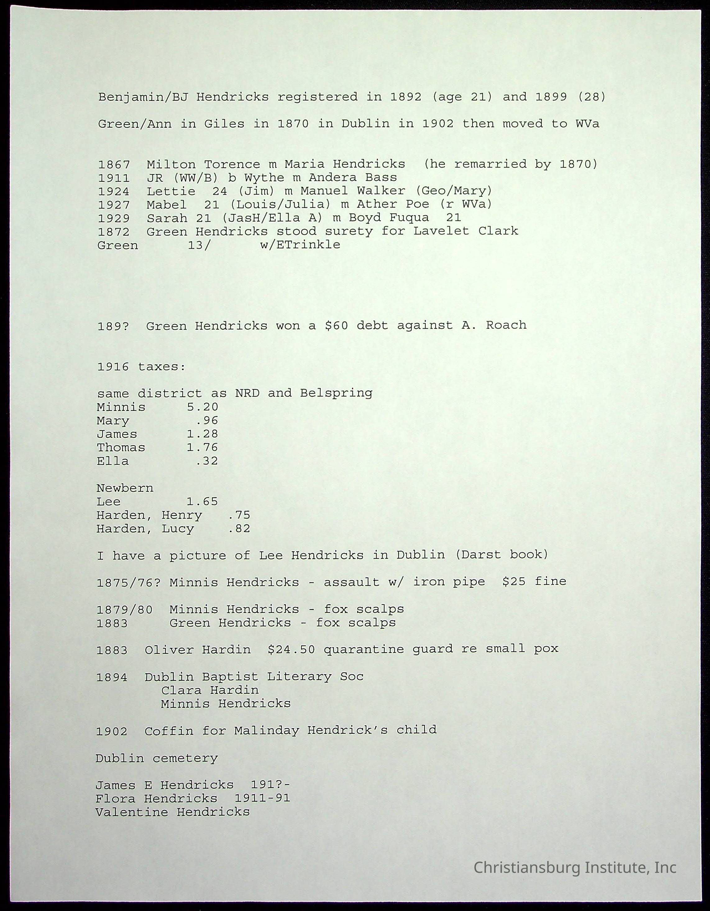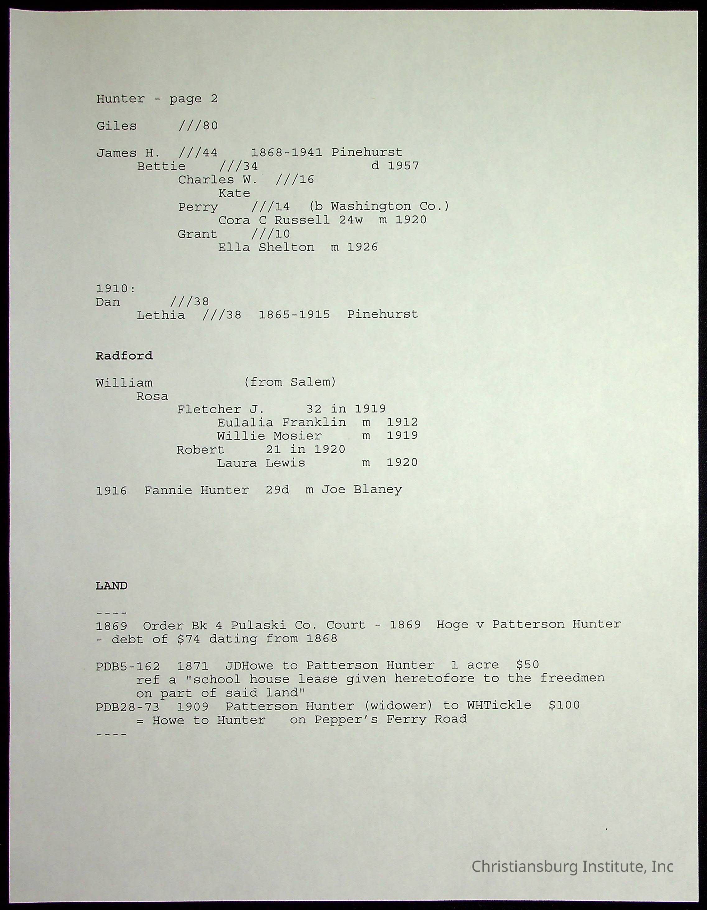 A folder of research materials collected by Radford University professor, Dr Linda Killen. This folder is titled 'H' and includes Killen's research on the H families names of Pulaski County, Virginia. This folder includes genealogy records and census records.