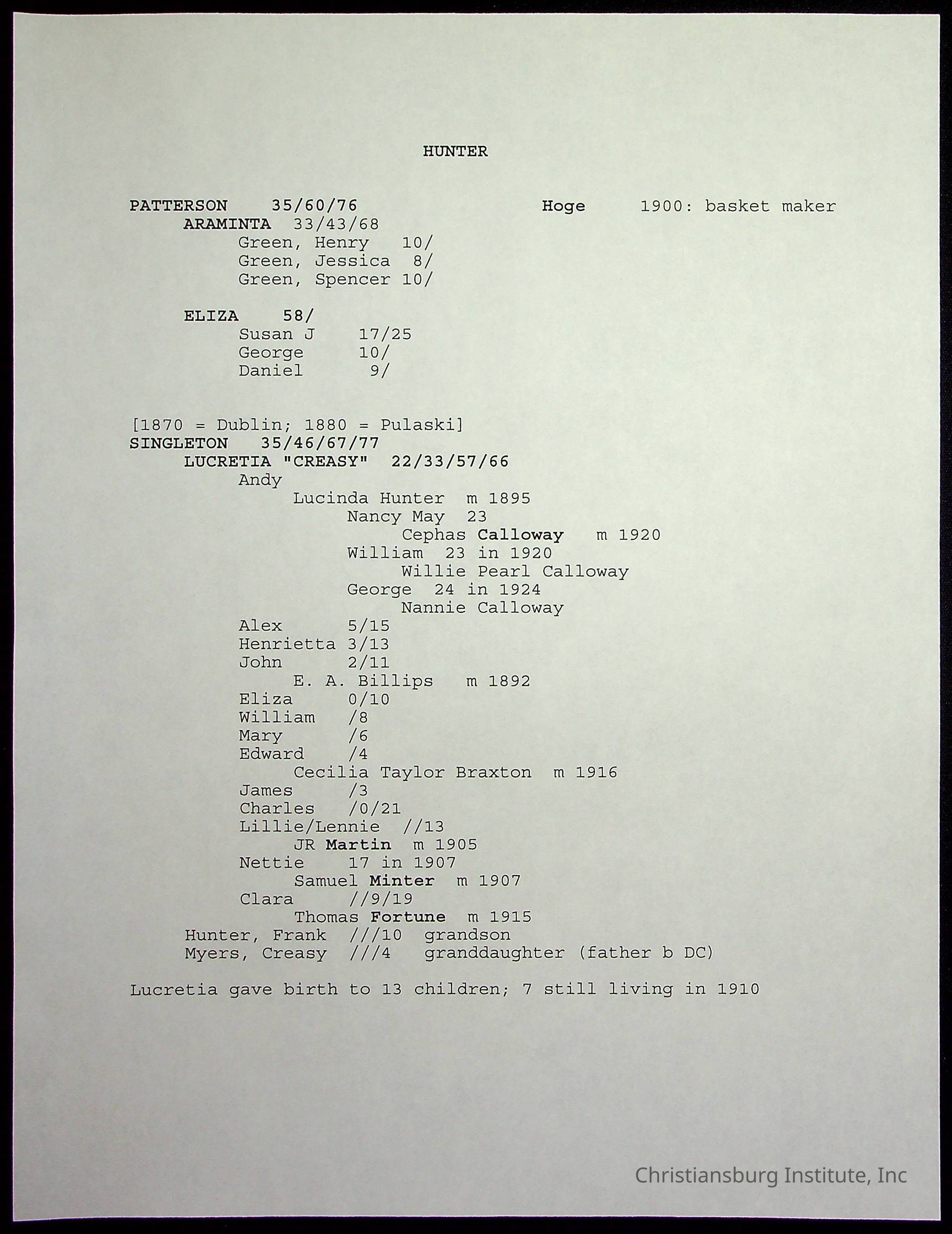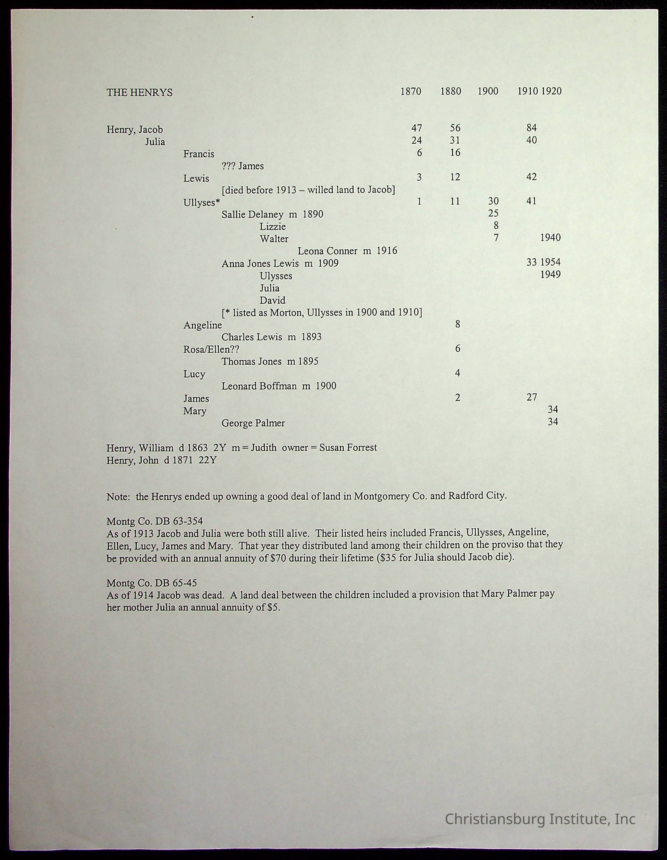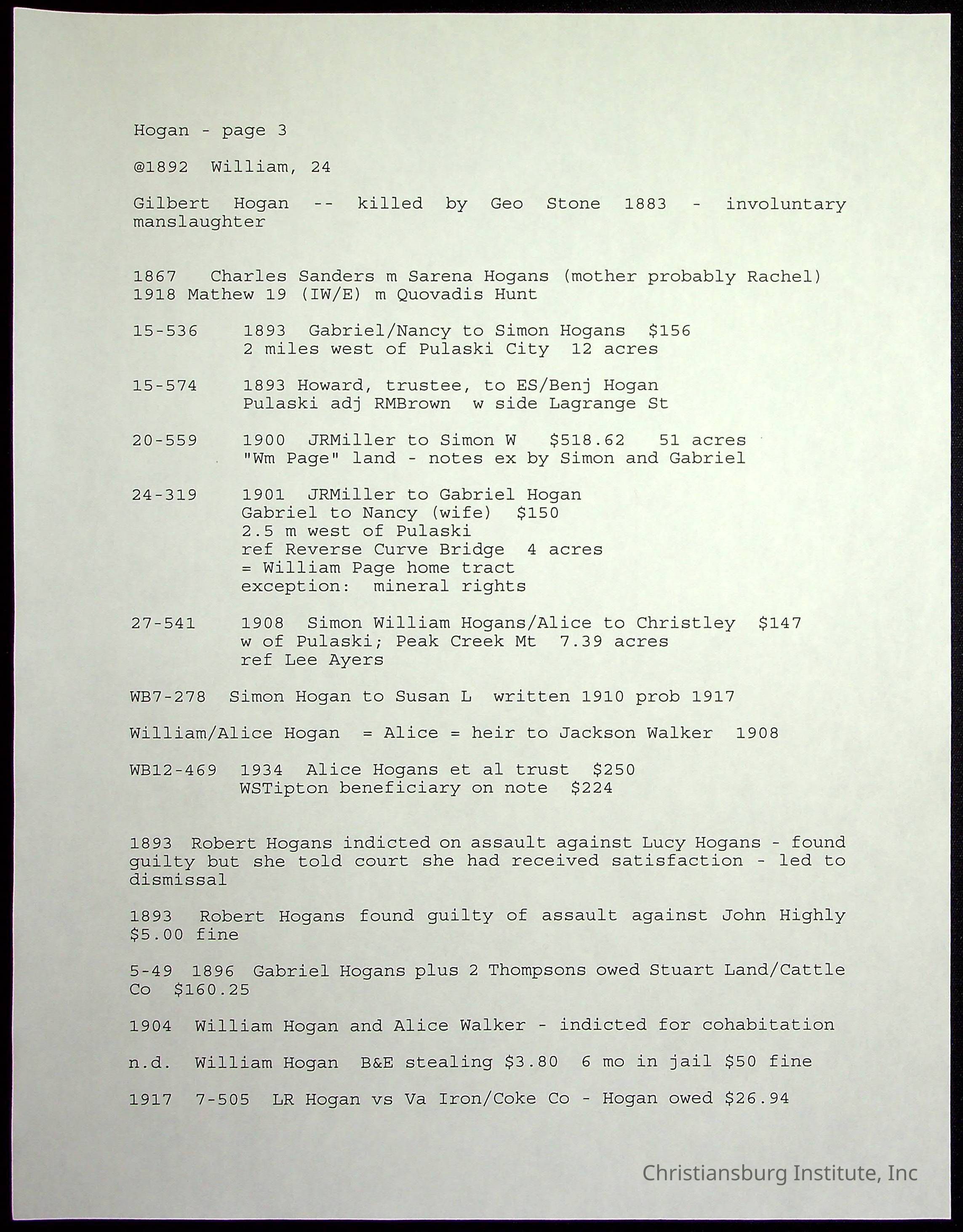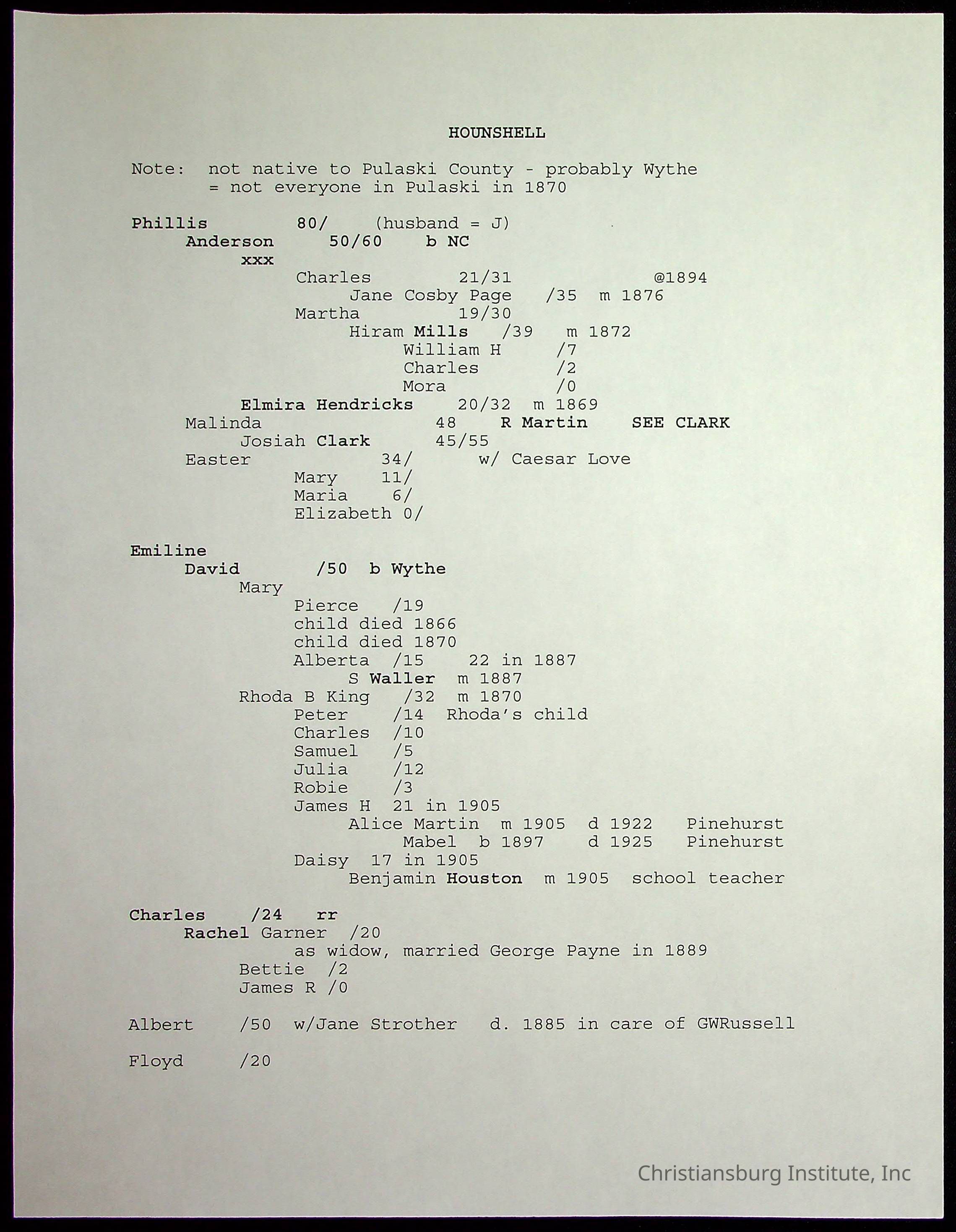 A folder of research materials collected by Radford University professor, Dr Linda Killen. This folder is titled 'H' and includes Killen's research on the H families names of Pulaski County, Virginia. This folder includes genealogy records and census records.