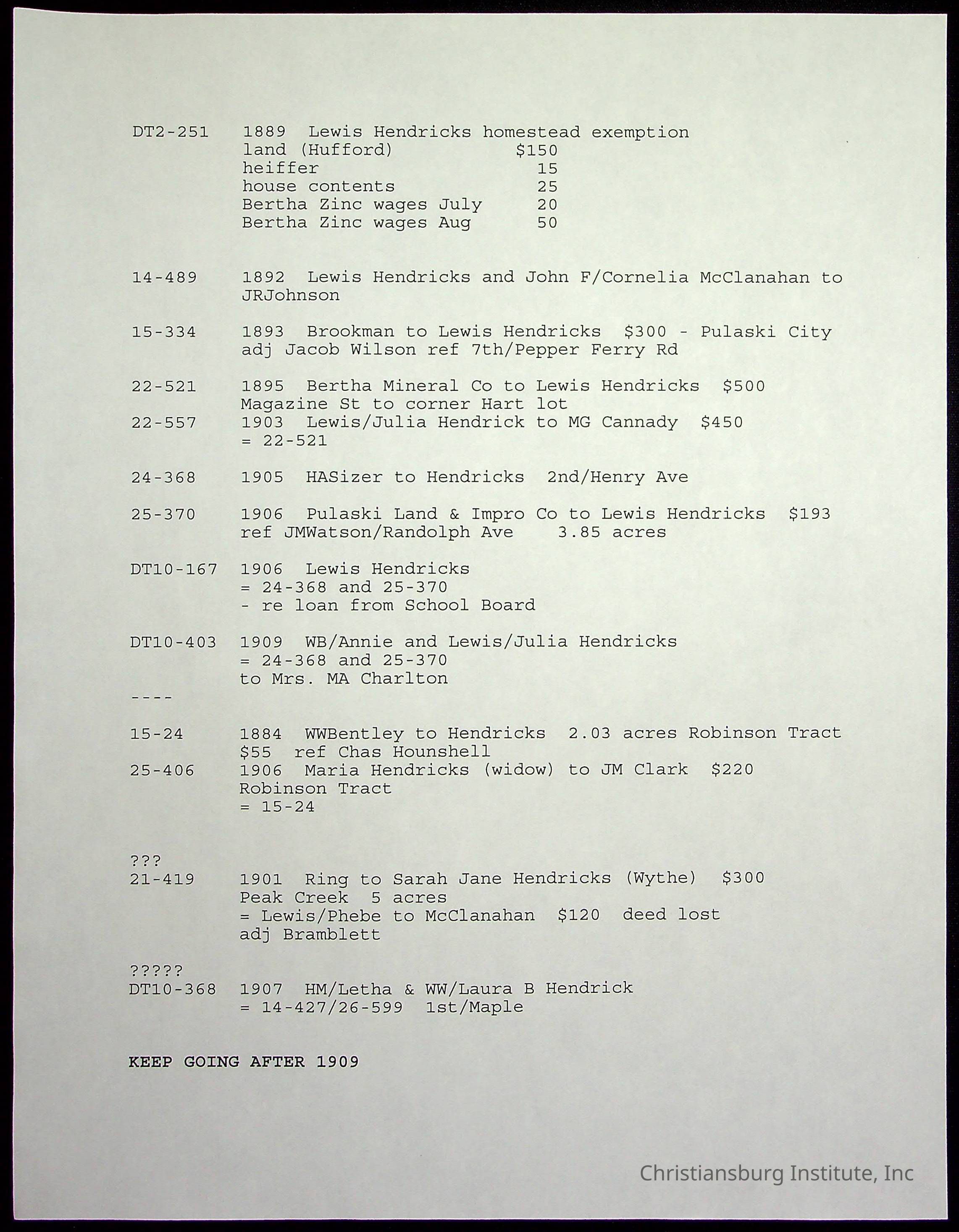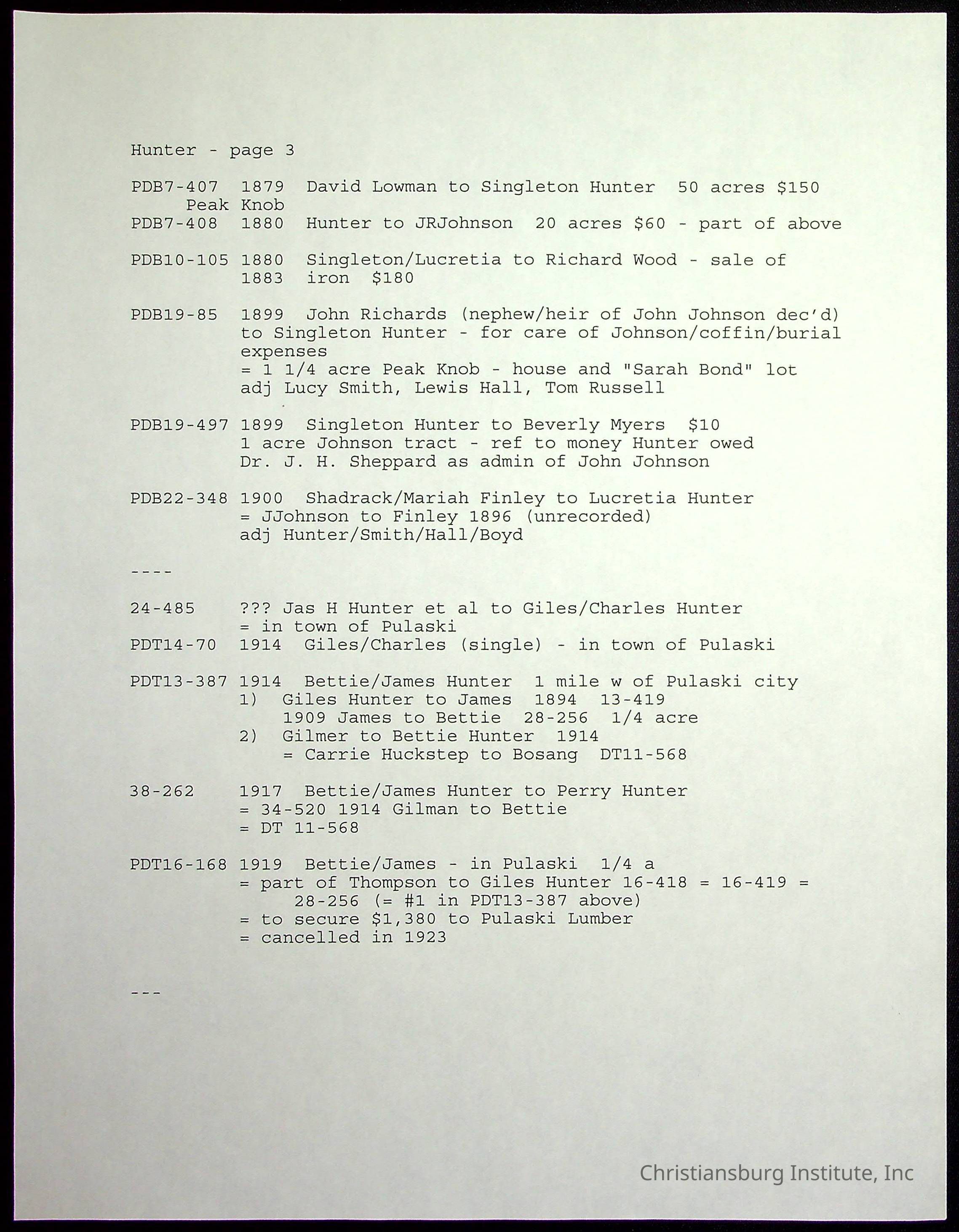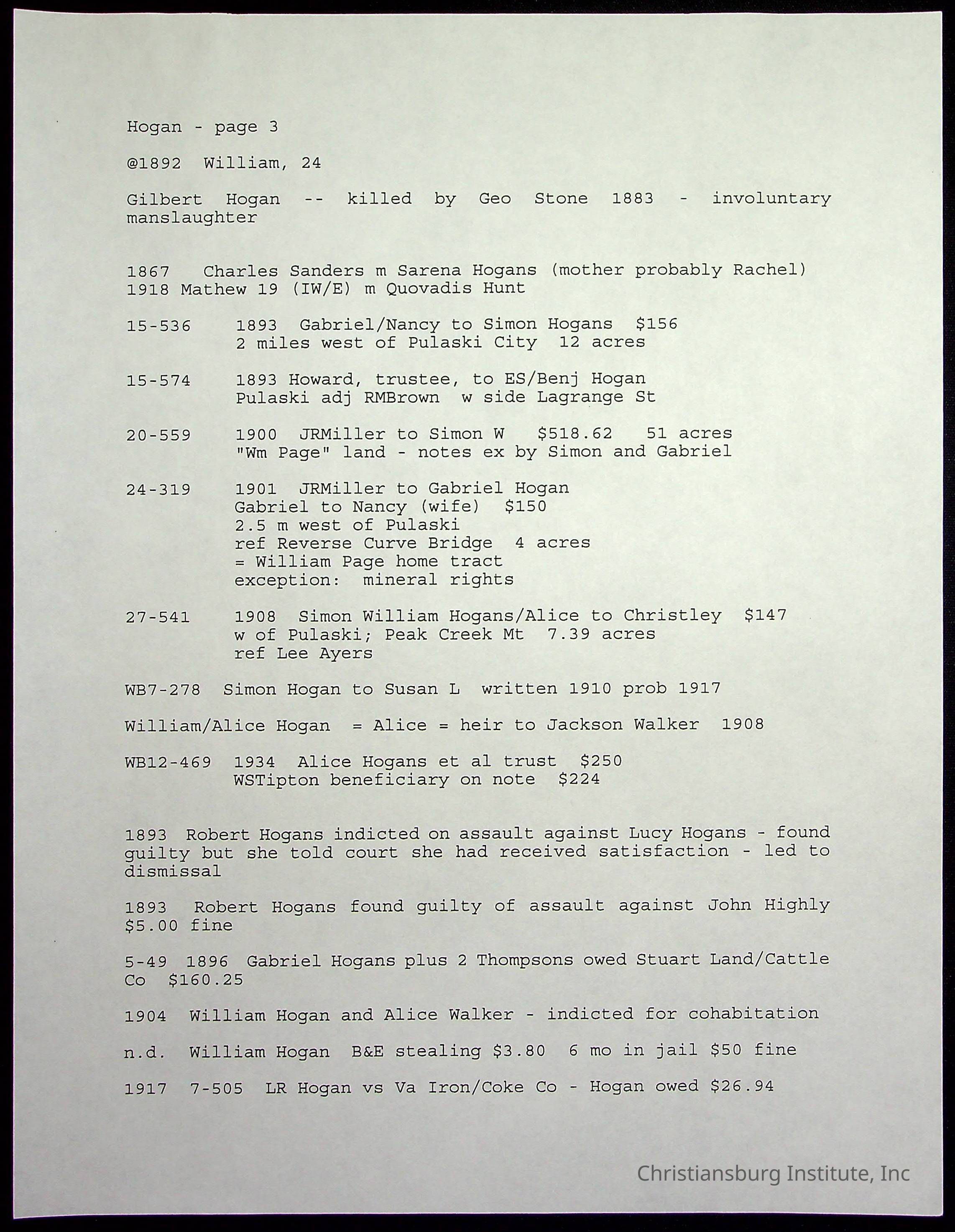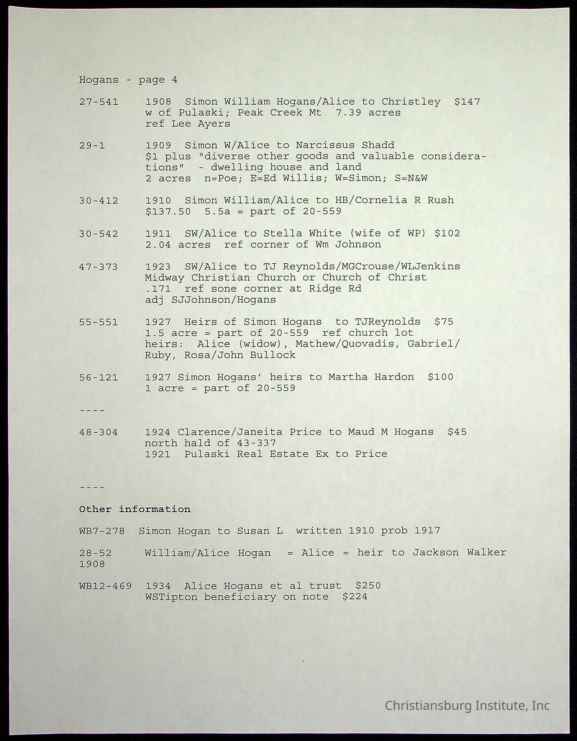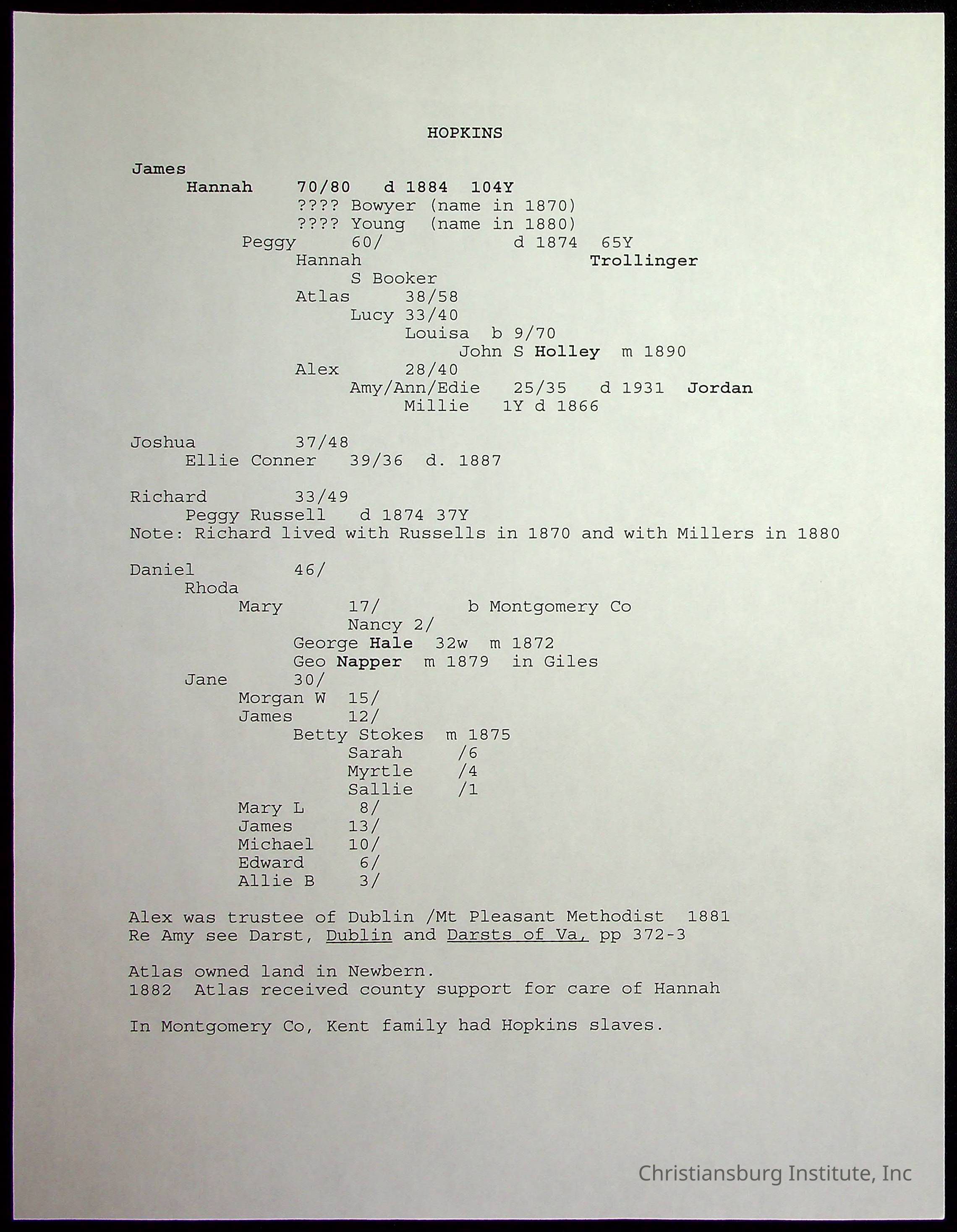 A folder of research materials collected by Radford University professor, Dr Linda Killen. This folder is titled 'H' and includes Killen's research on the H families names of Pulaski County, Virginia. This folder includes genealogy records and census records.