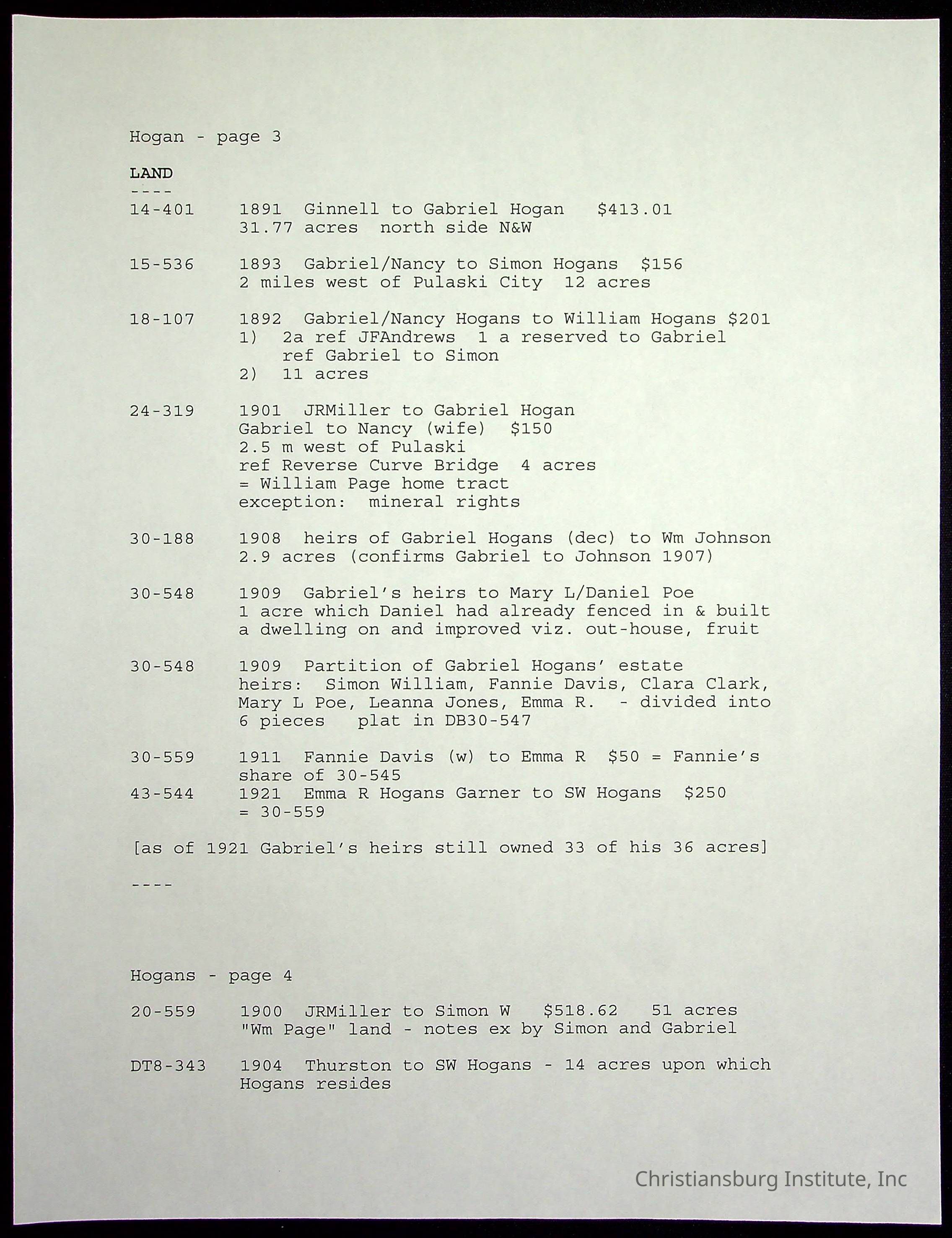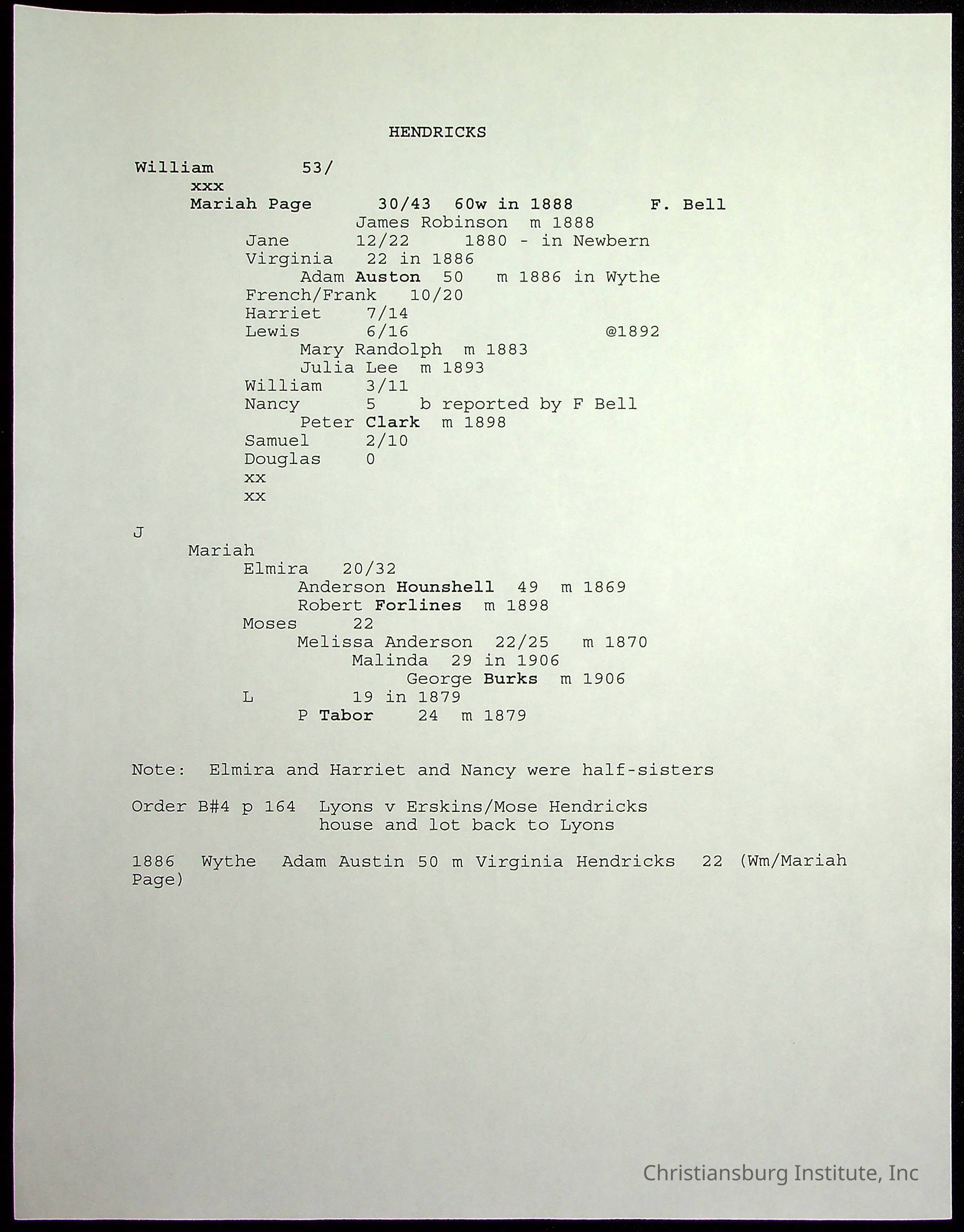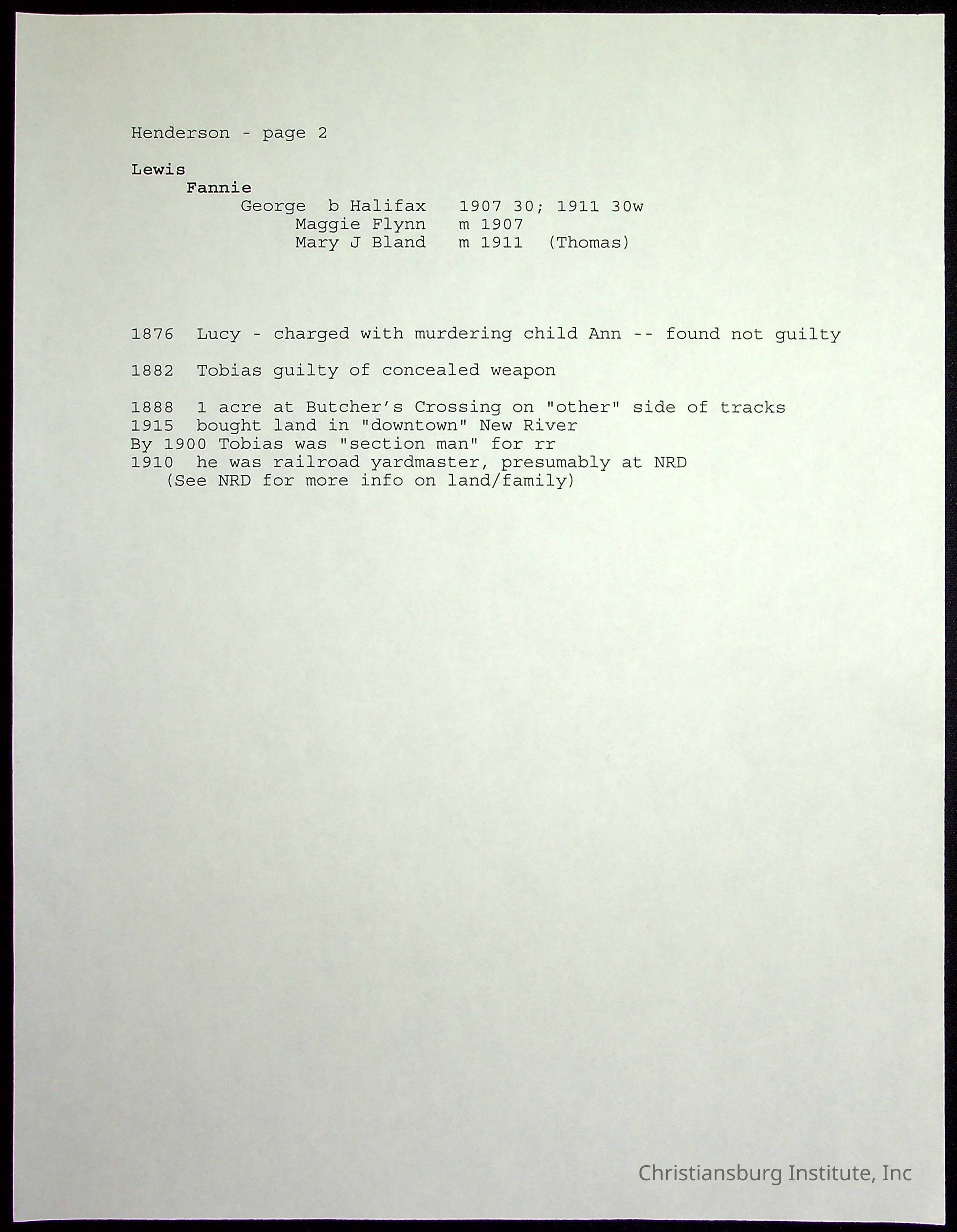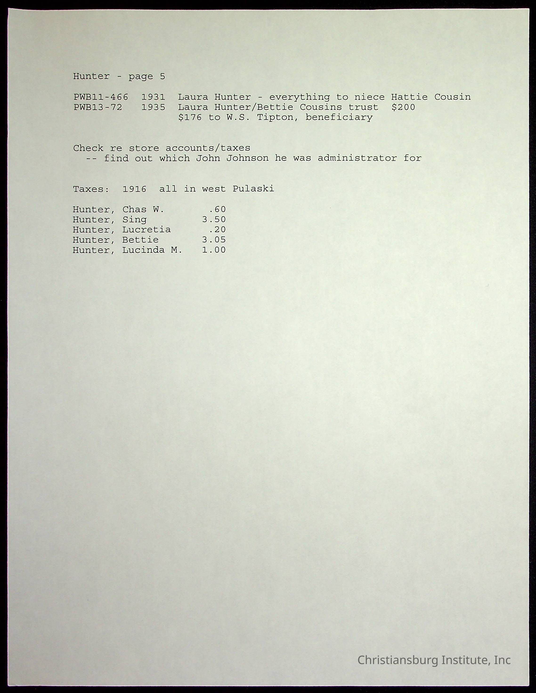 A folder of research materials collected by Radford University professor, Dr Linda Killen. This folder is titled 'H' and includes Killen's research on the H families names of Pulaski County, Virginia. This folder includes genealogy records and census records.
