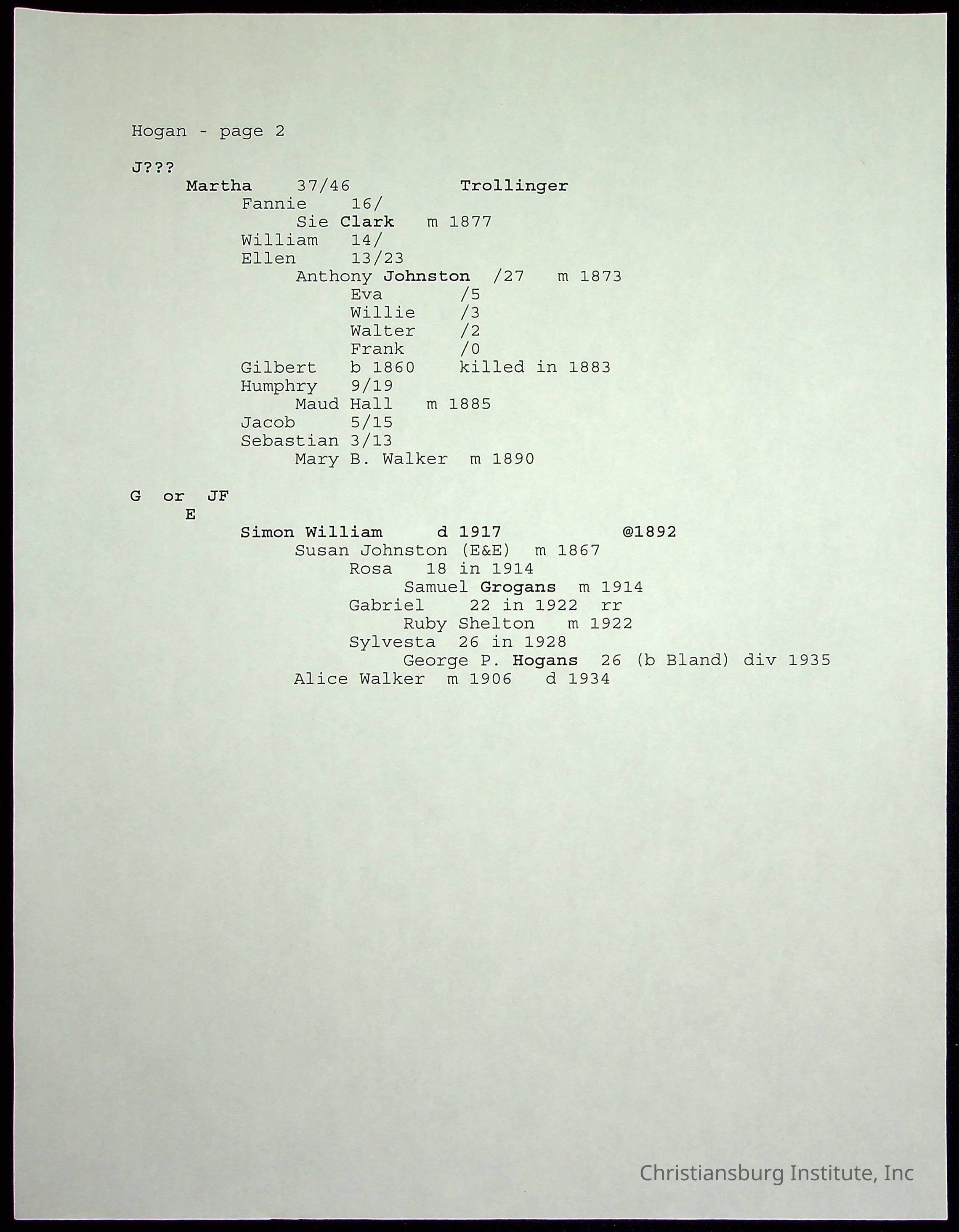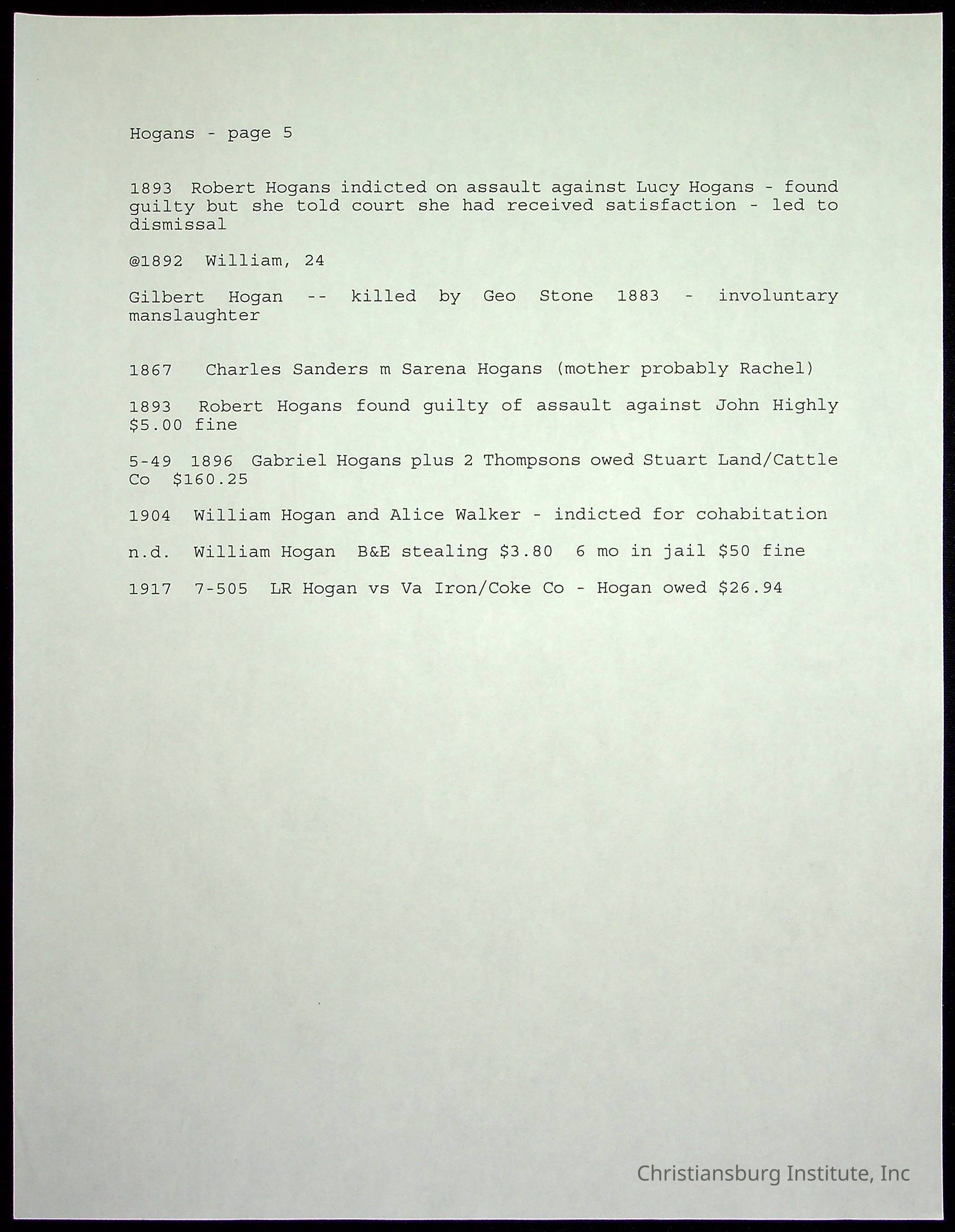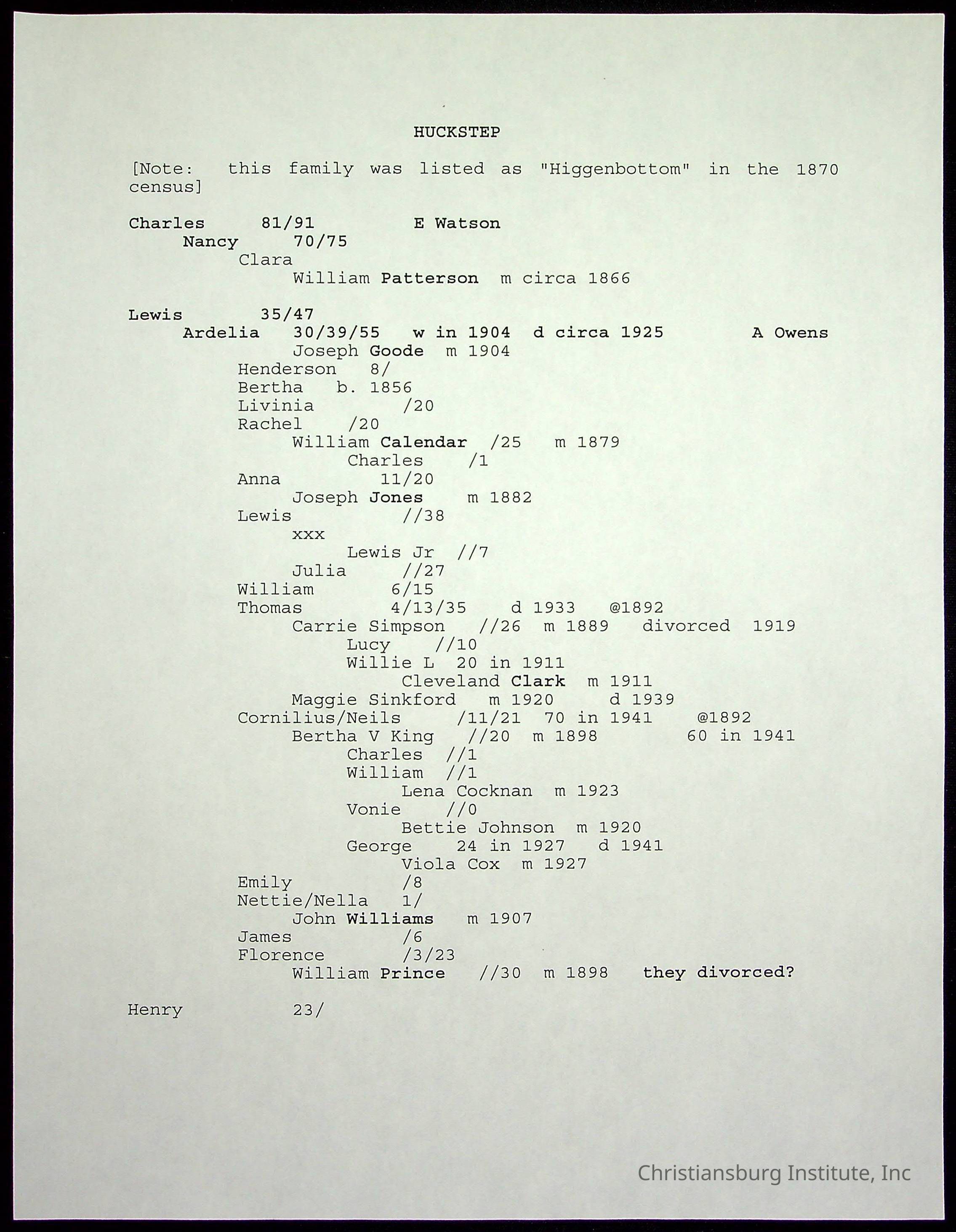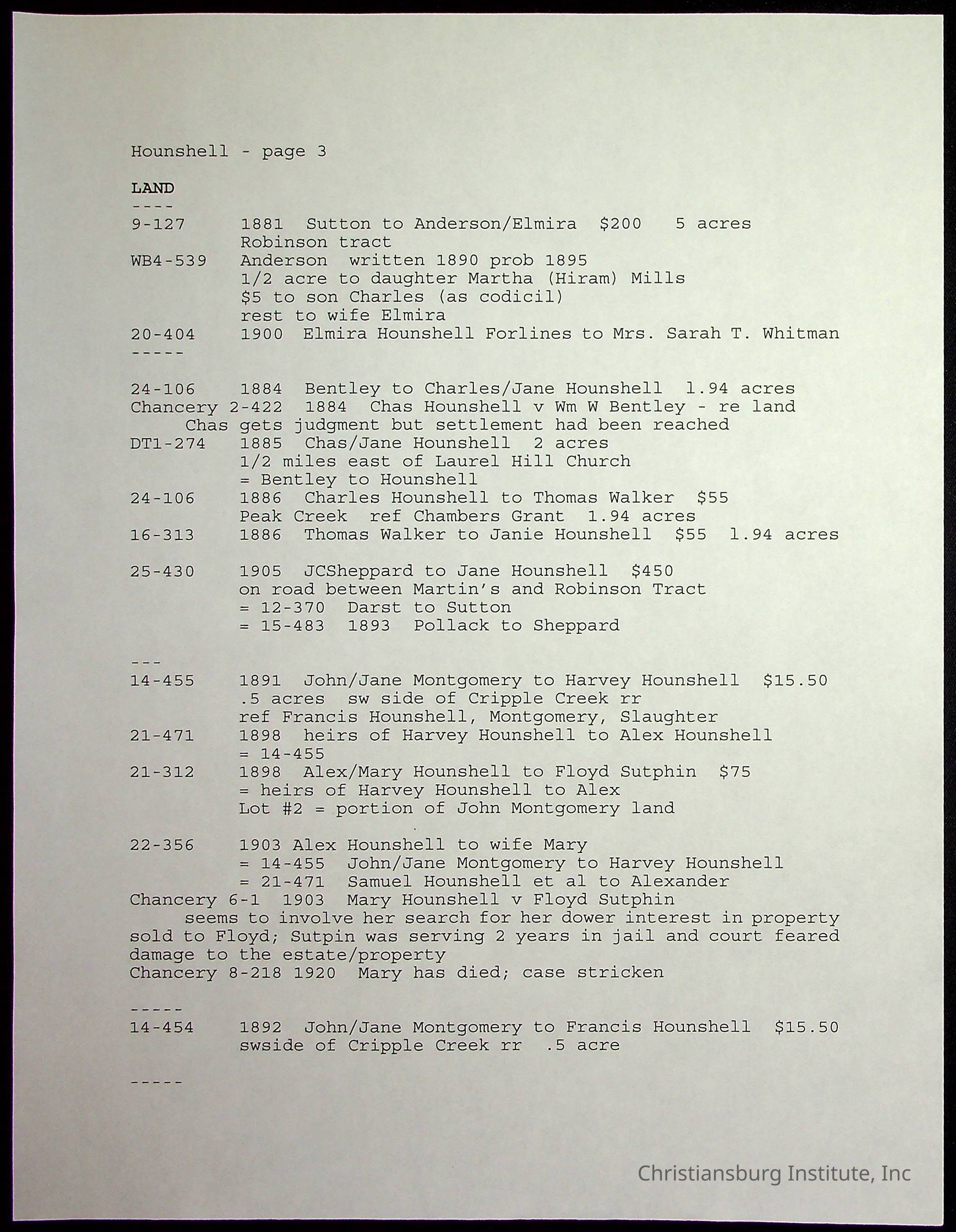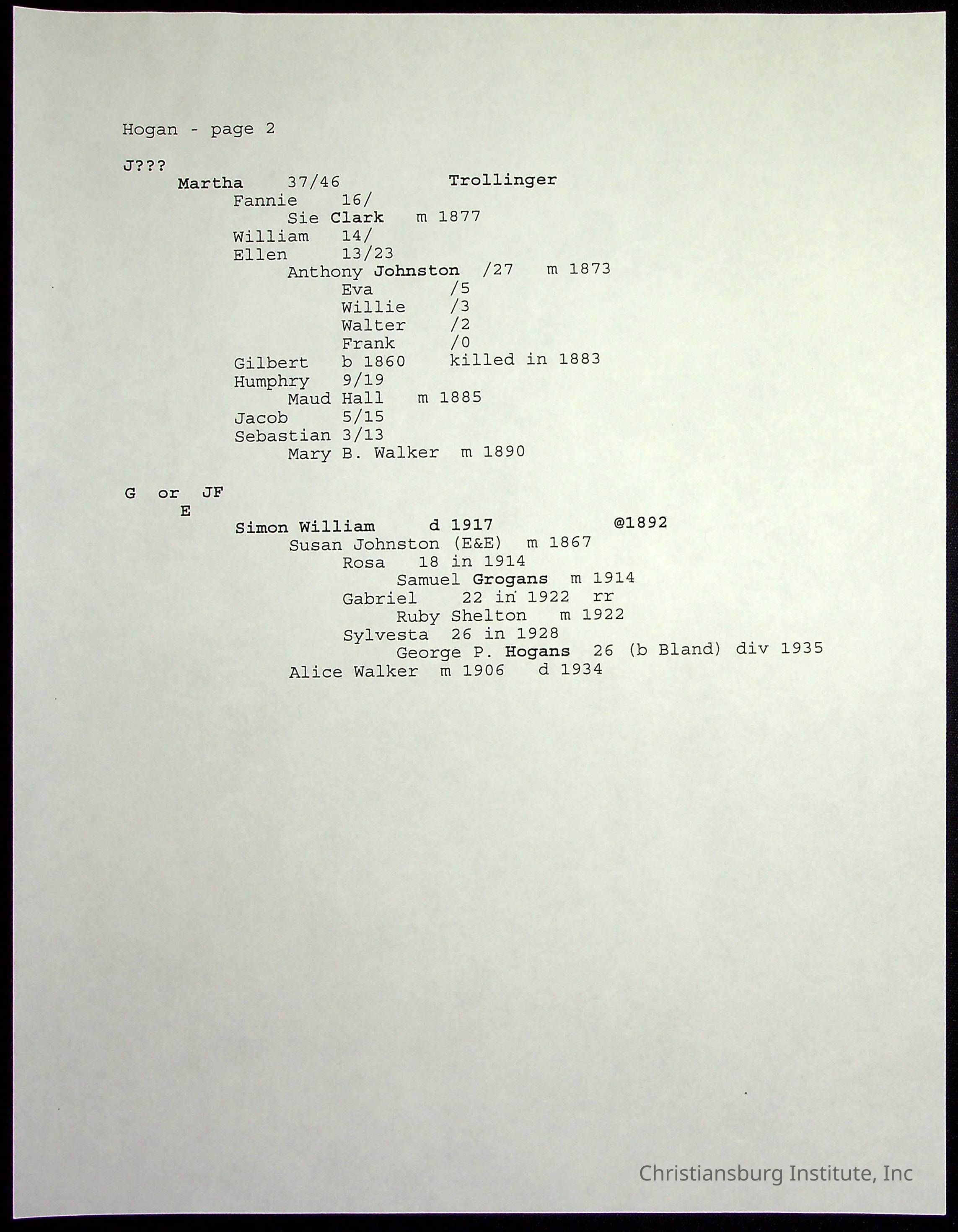 A folder of research materials collected by Radford University professor, Dr Linda Killen. This folder is titled 'H' and includes Killen's research on the H families names of Pulaski County, Virginia. This folder includes genealogy records and census records.