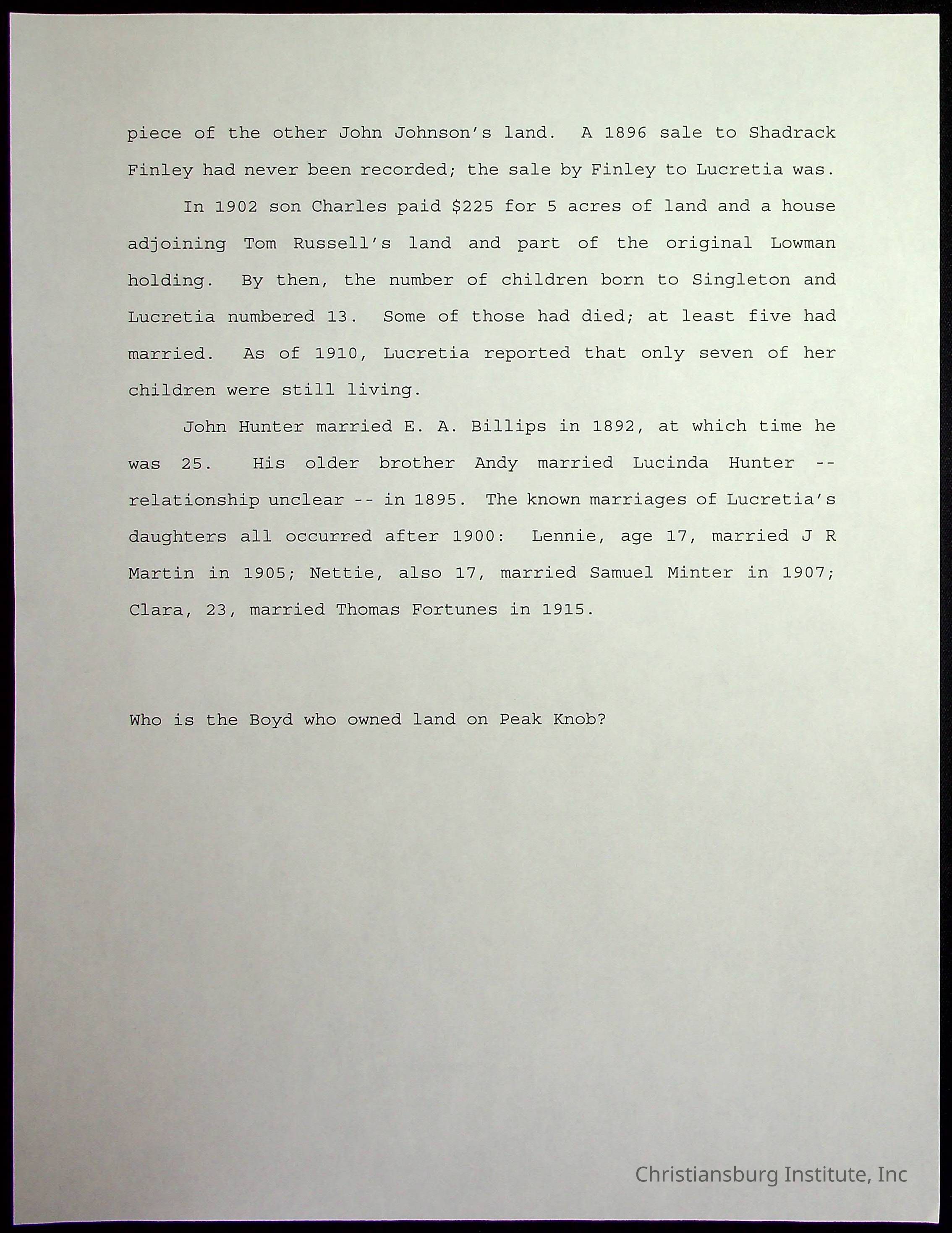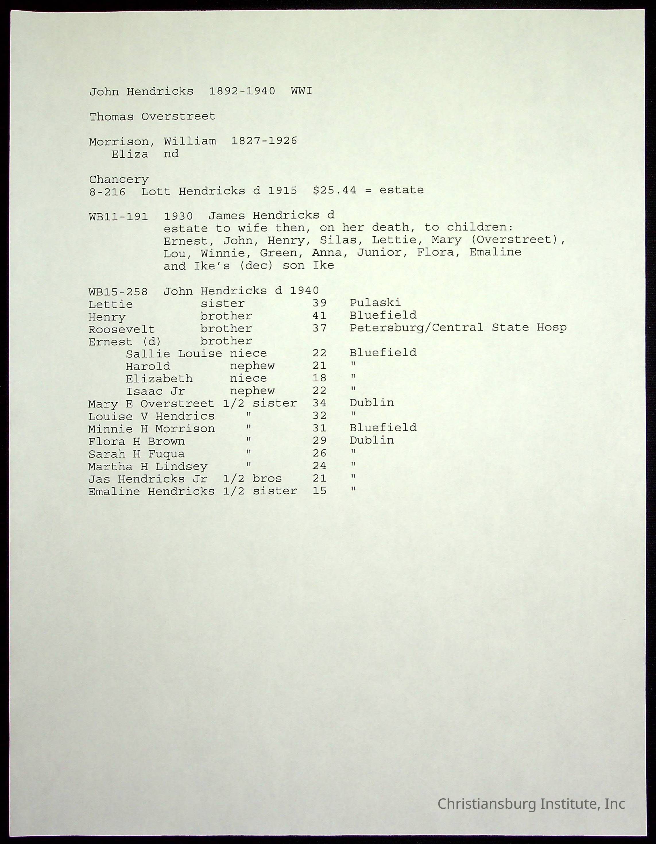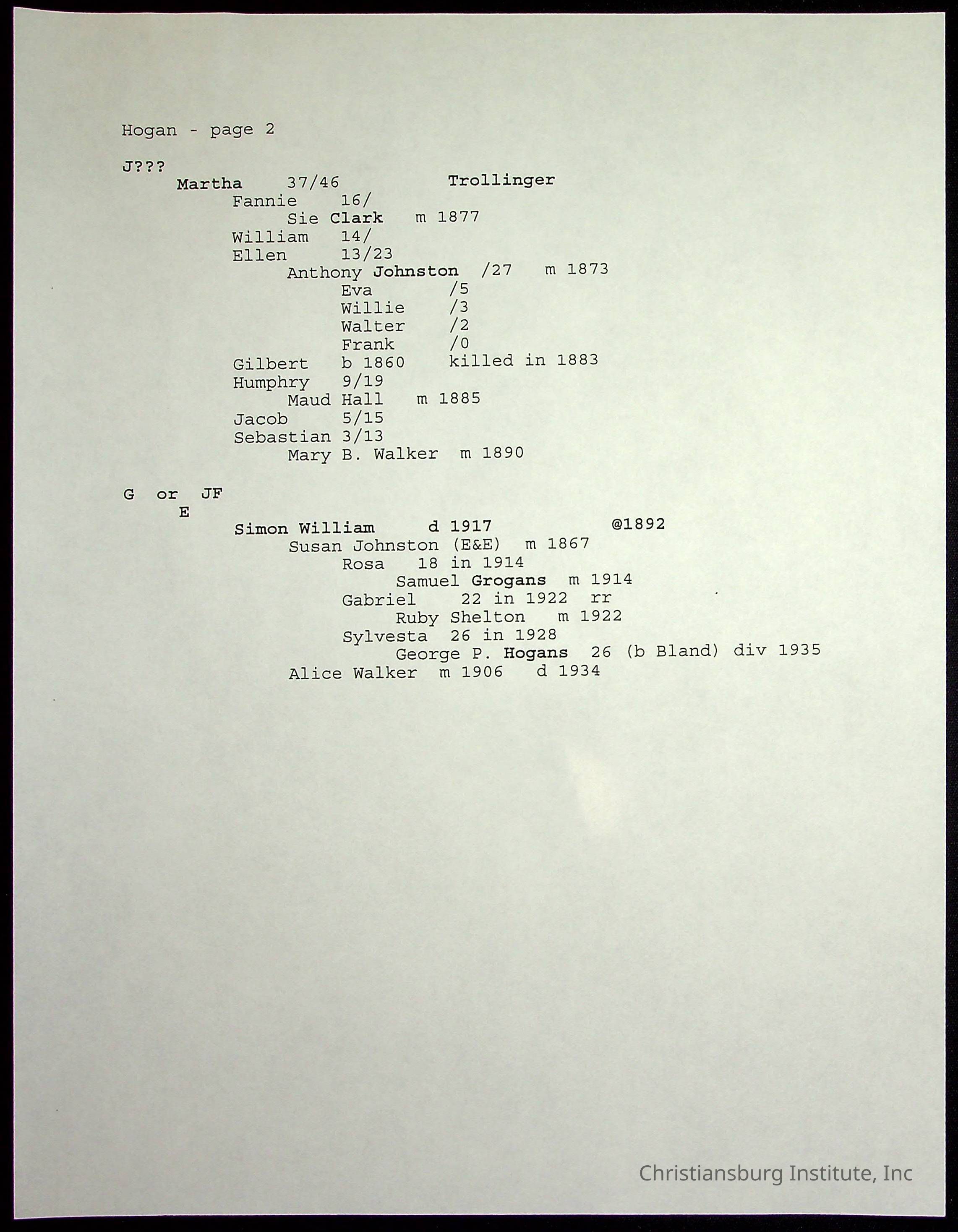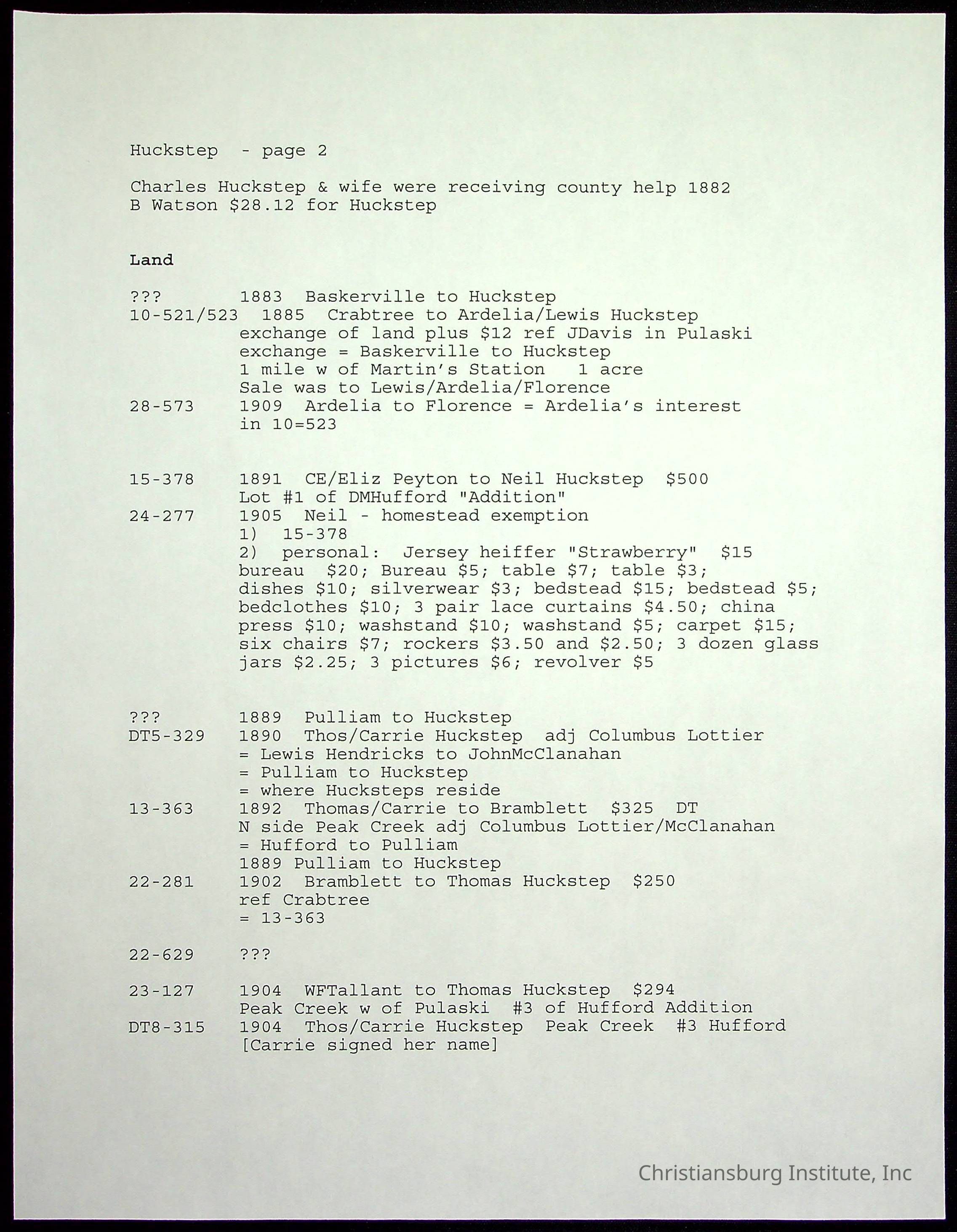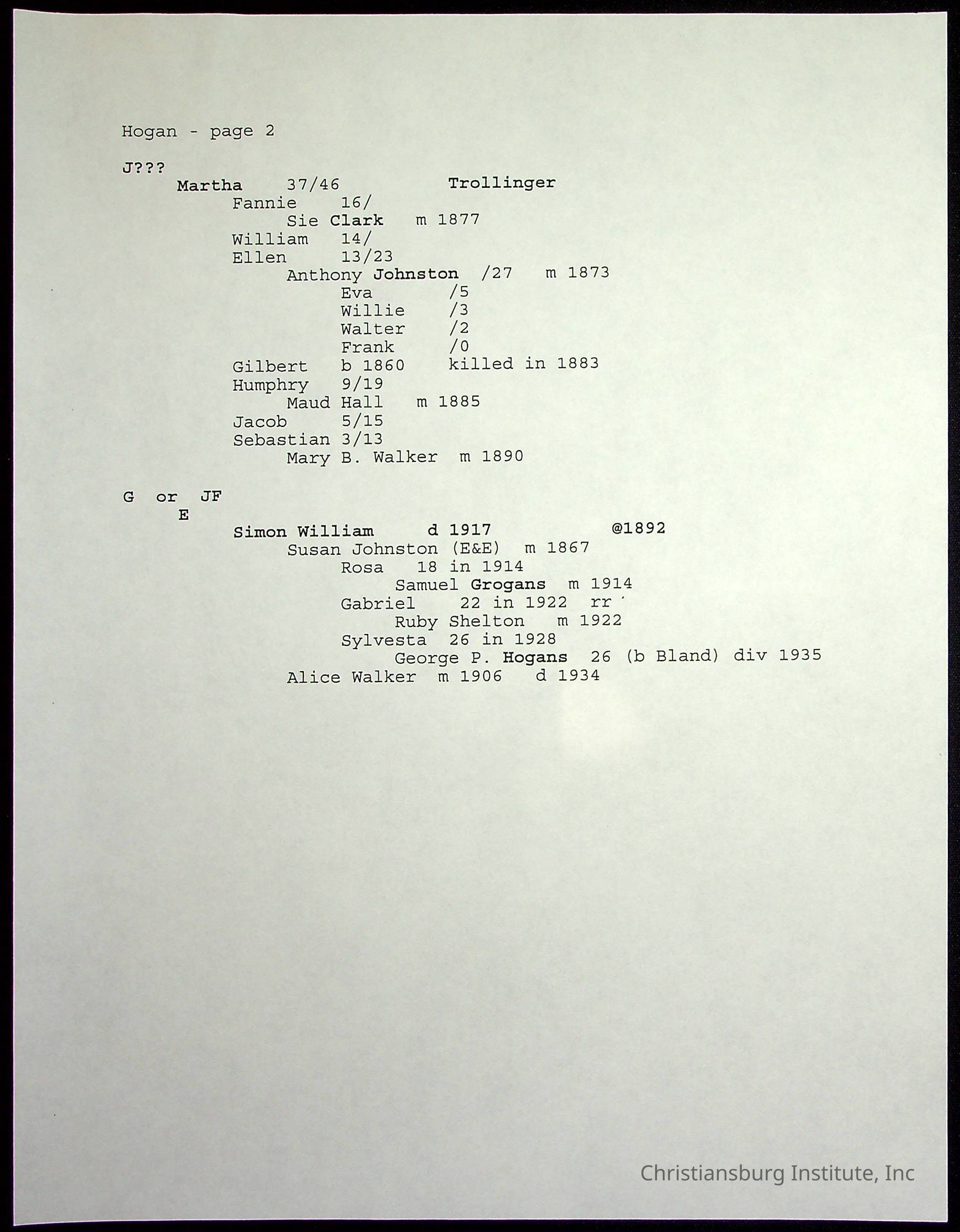 A folder of research materials collected by Radford University professor, Dr Linda Killen. This folder is titled 'H' and includes Killen's research on the H families names of Pulaski County, Virginia. This folder includes genealogy records and census records.