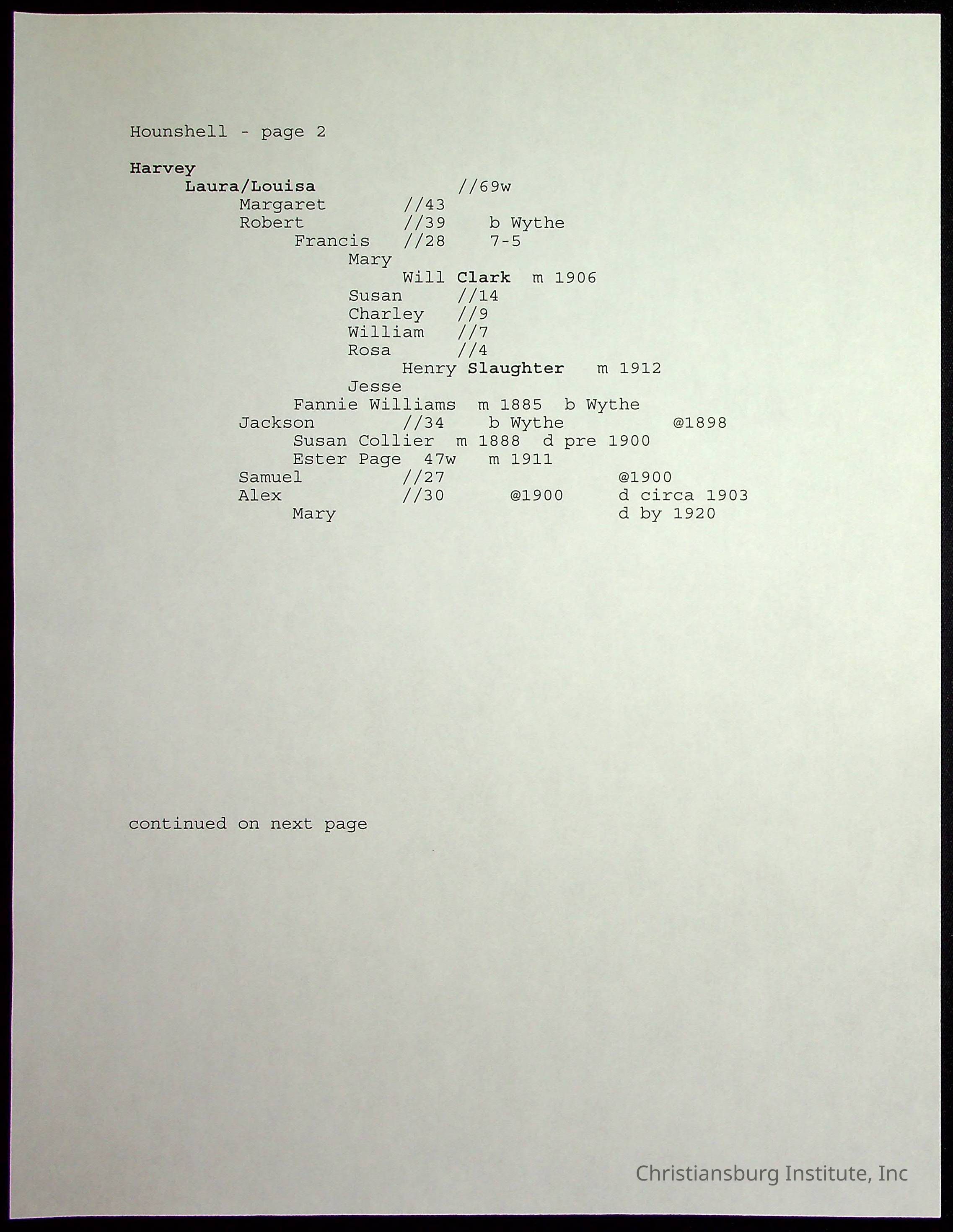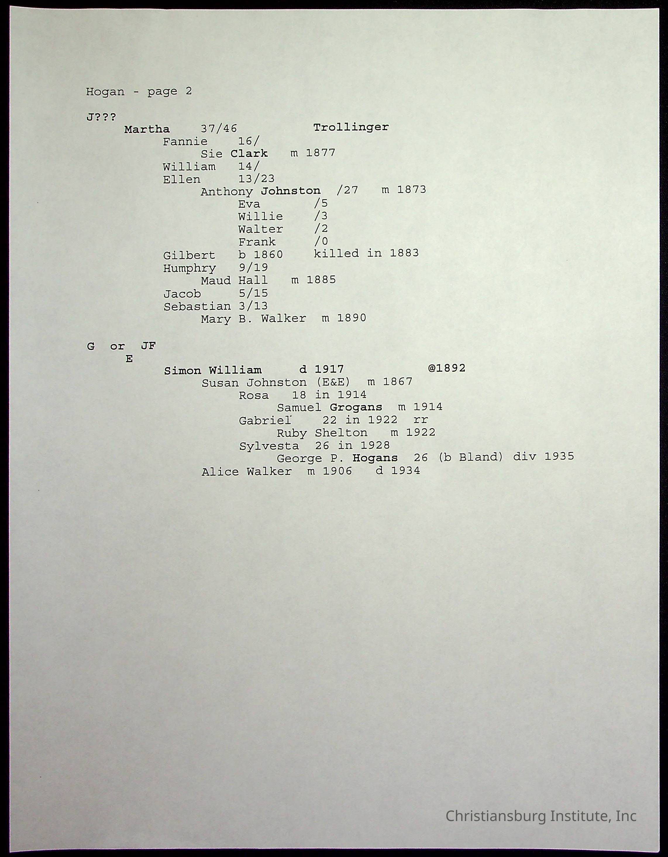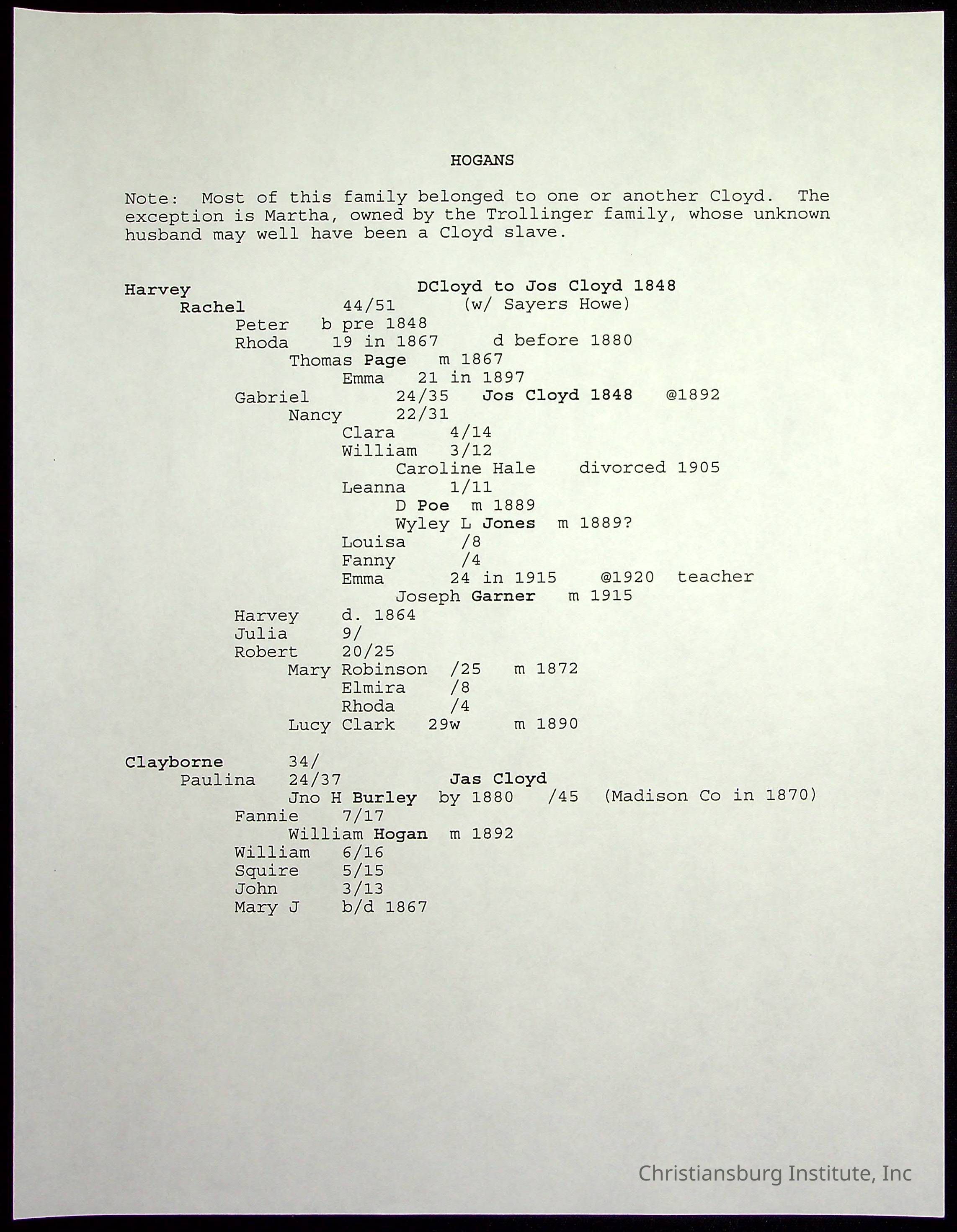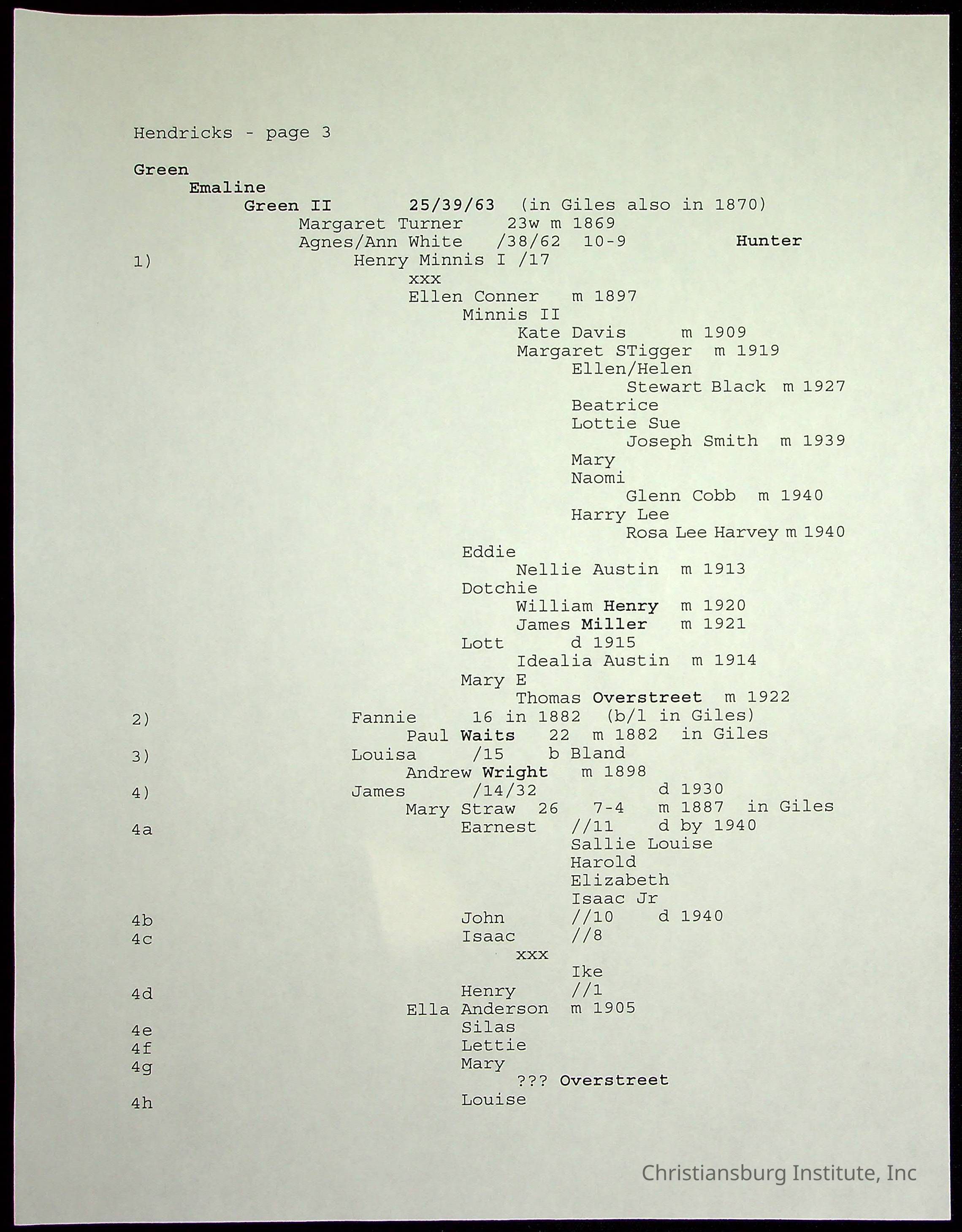 A folder of research materials collected by Radford University professor, Dr Linda Killen. This folder is titled 'H' and includes Killen's research on the H families names of Pulaski County, Virginia. This folder includes genealogy records and census records.
