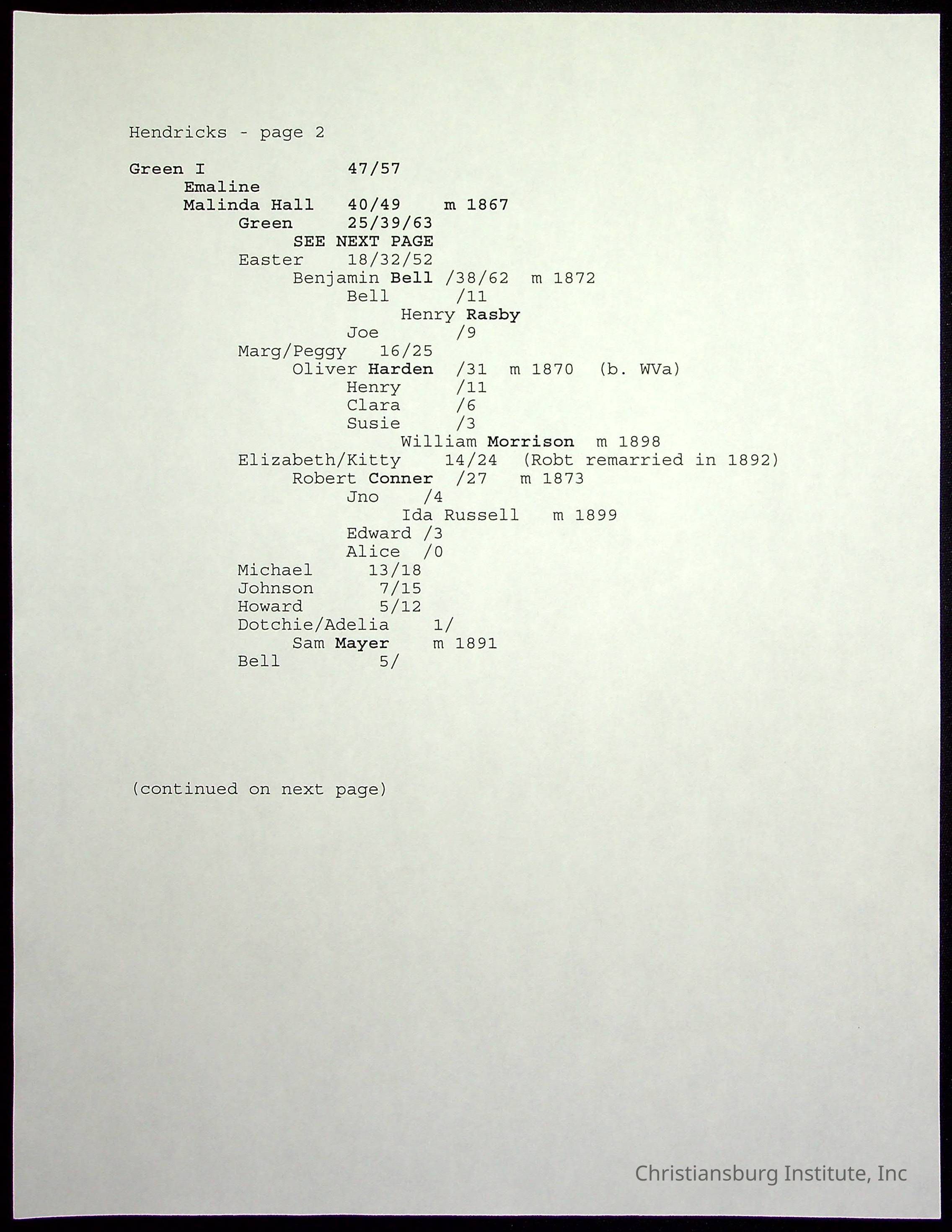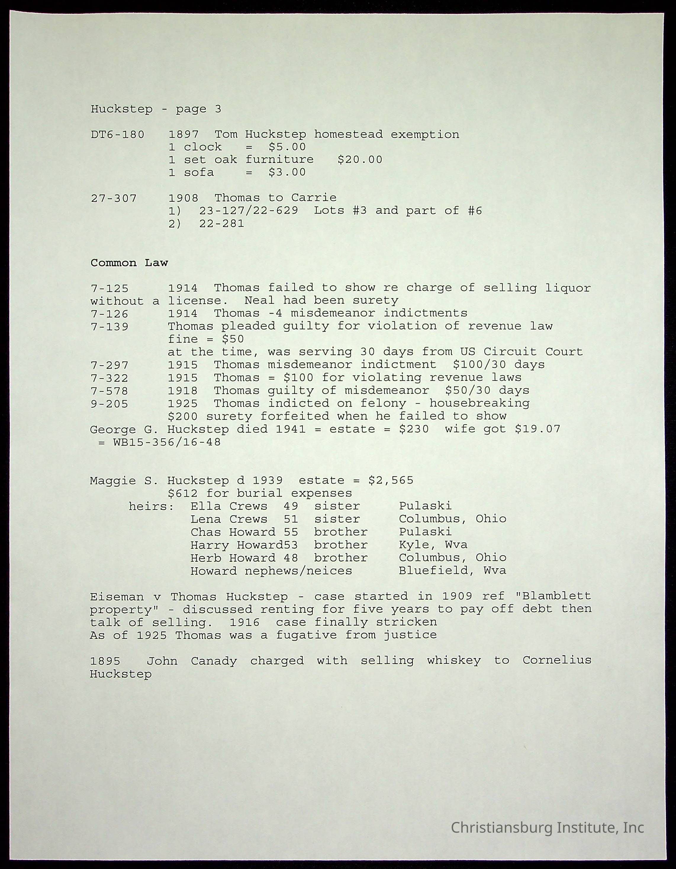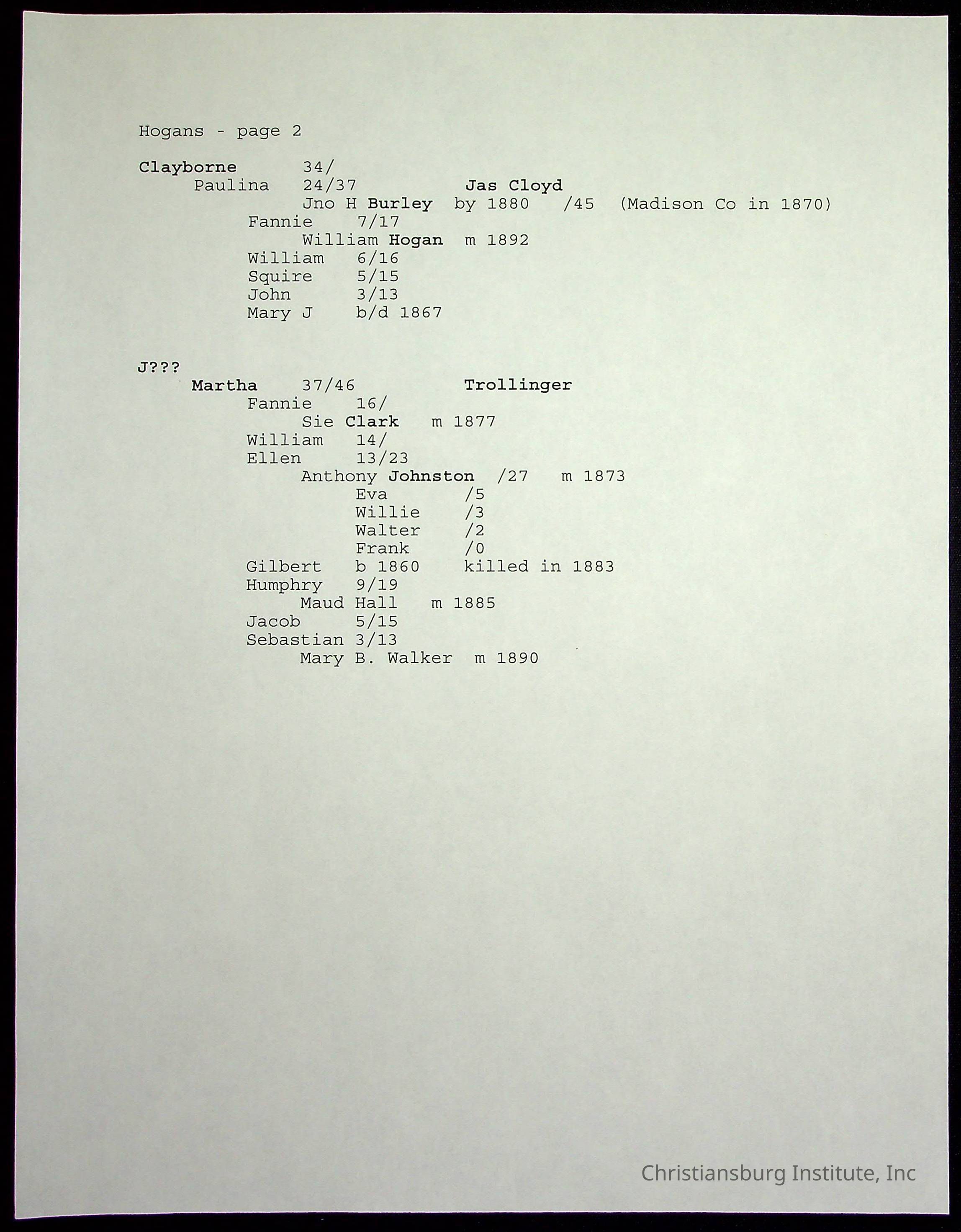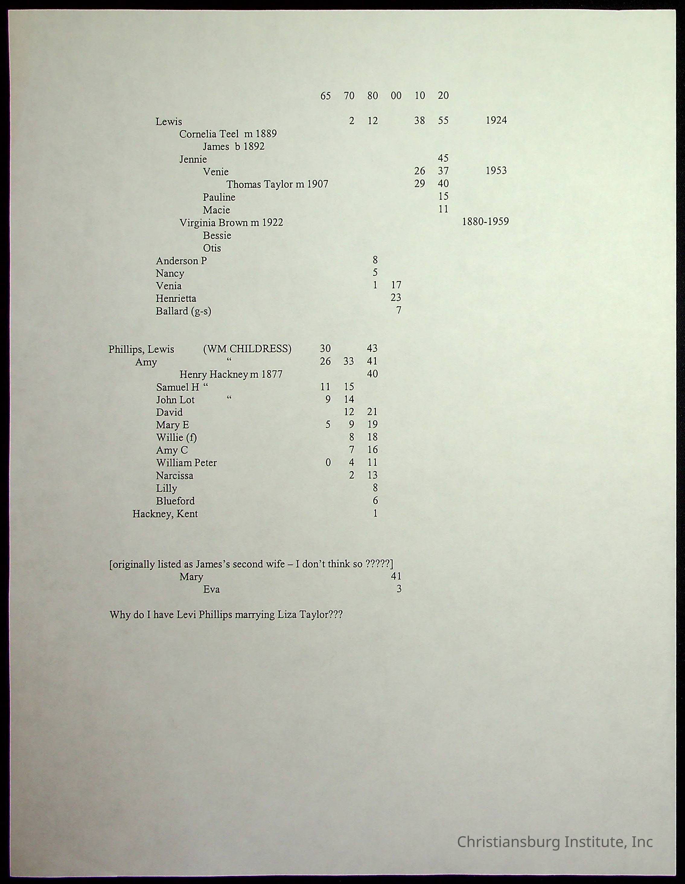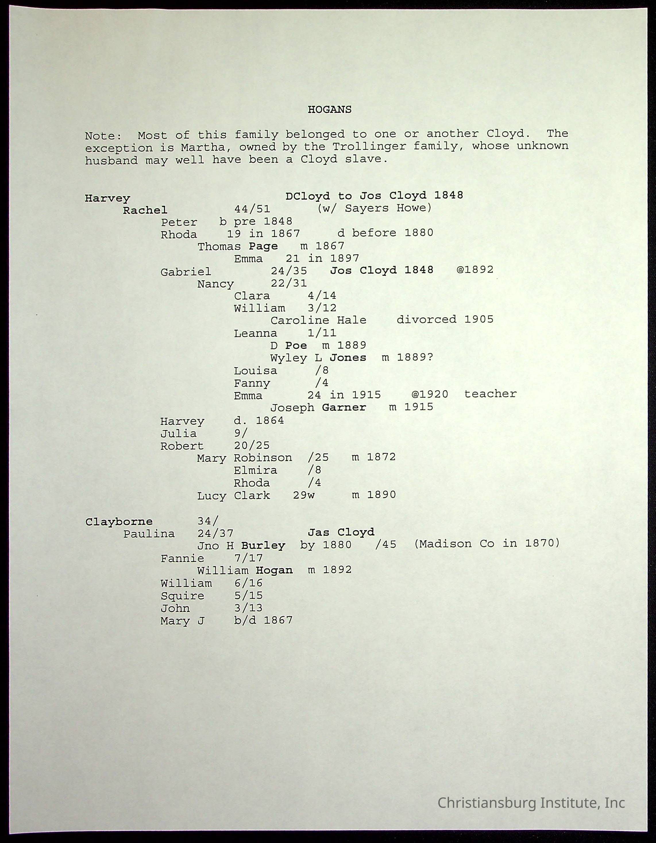 A folder of research materials collected by Radford University professor, Dr Linda Killen. This folder is titled 'H' and includes Killen's research on the H families names of Pulaski County, Virginia. This folder includes genealogy records and census records.