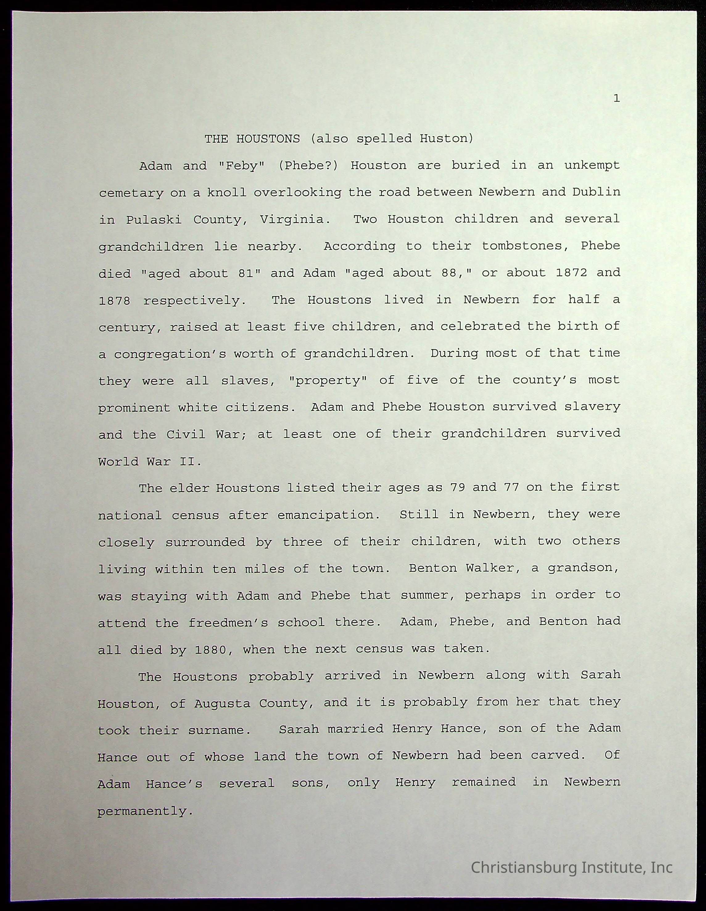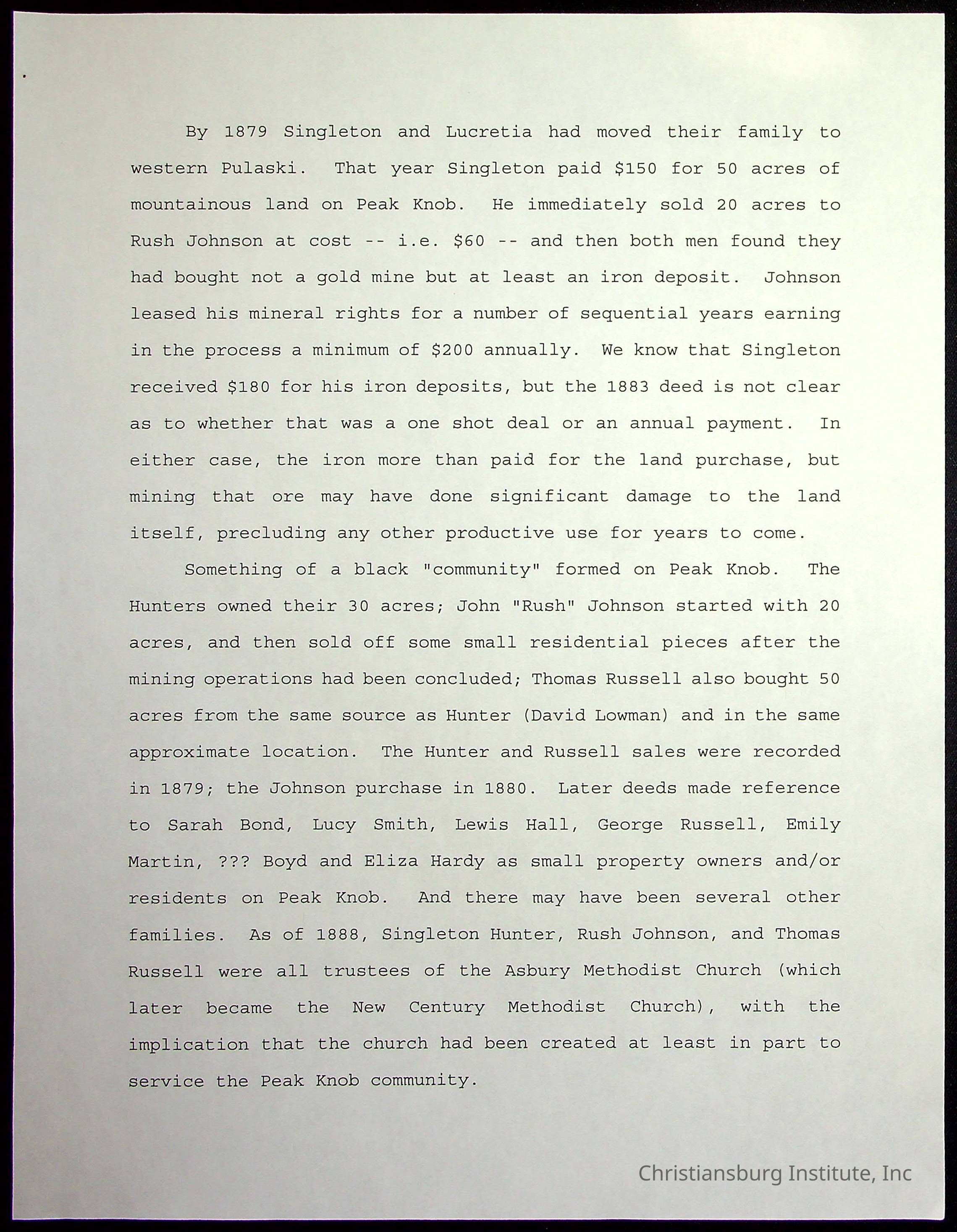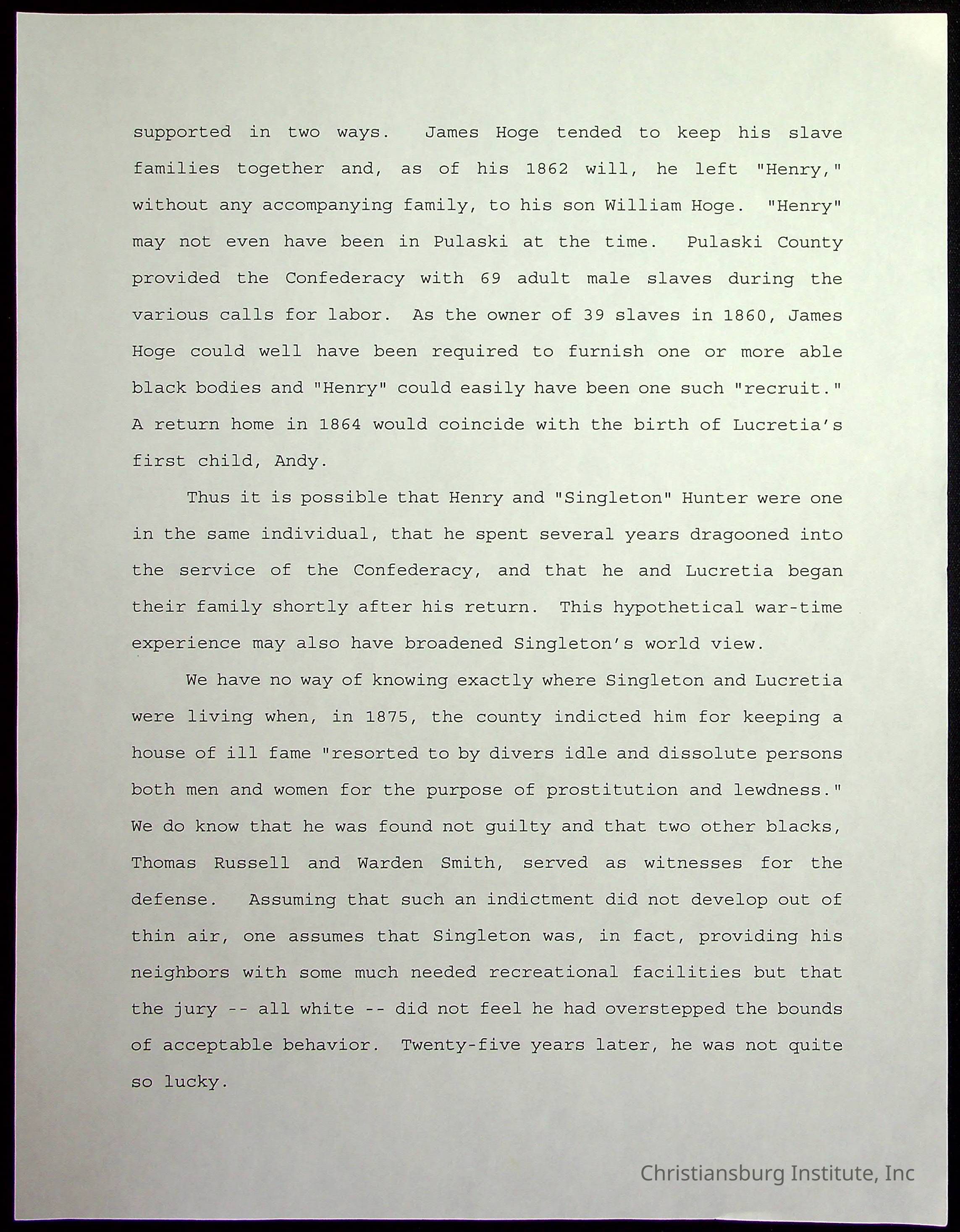 Farm Land, Boom Town, Village: A History of Belspring, Virginia, 1750-1940, The Reports of Charles S. Schaeffer from the Virginia counties of Montgomery and Pulaski, with additional information on the counties of Floyd, Giles, Craig, Wythe, and Roanoke., Ingles Ferry Ledgers (1840s-1880s), These people lived in a pleasant valley, Making their mark: Black Families of New River Depot, 1870-1940., Whartons’ Town New River Depot, 1870-1940., Radford’s Early Black Residents, 1880-1925