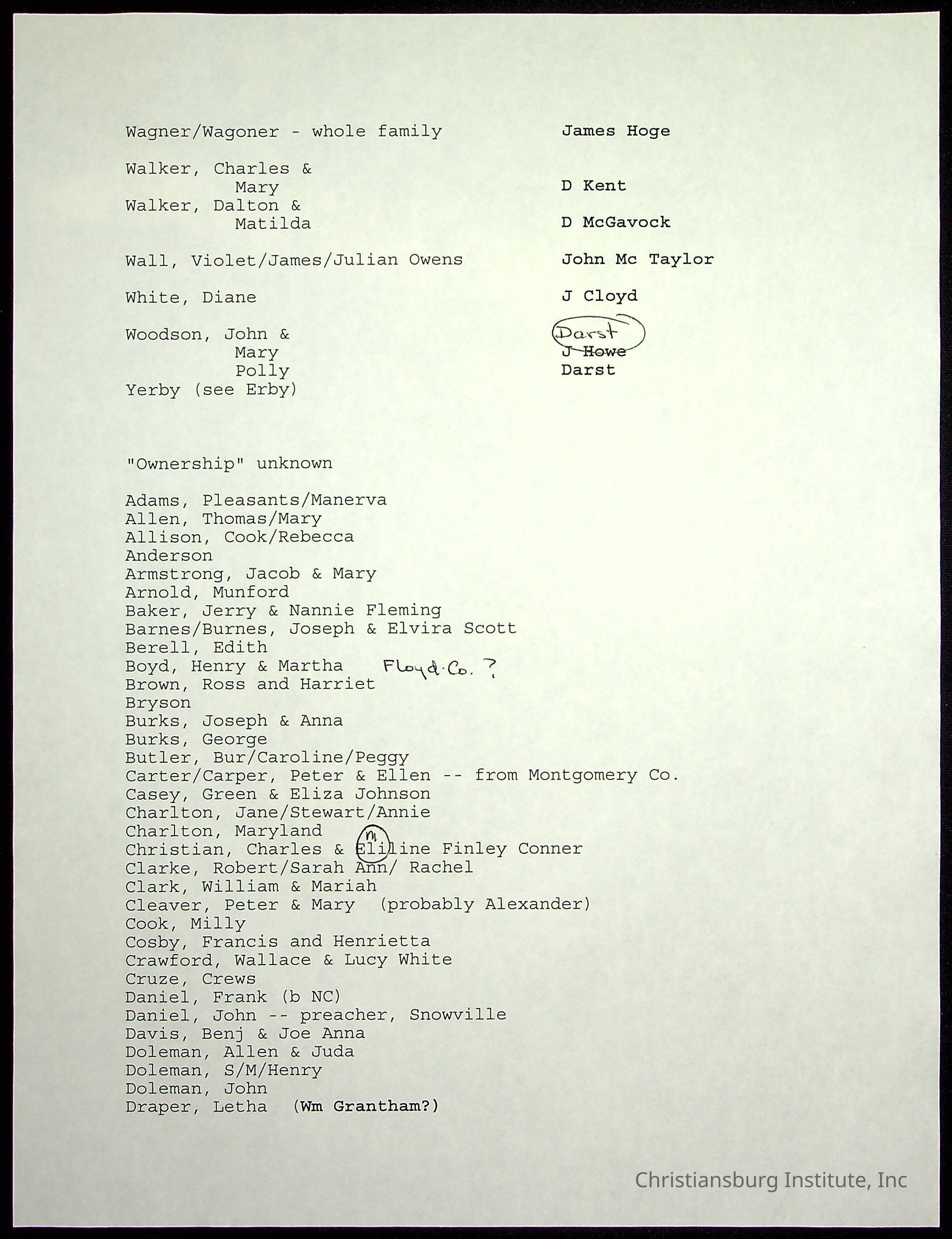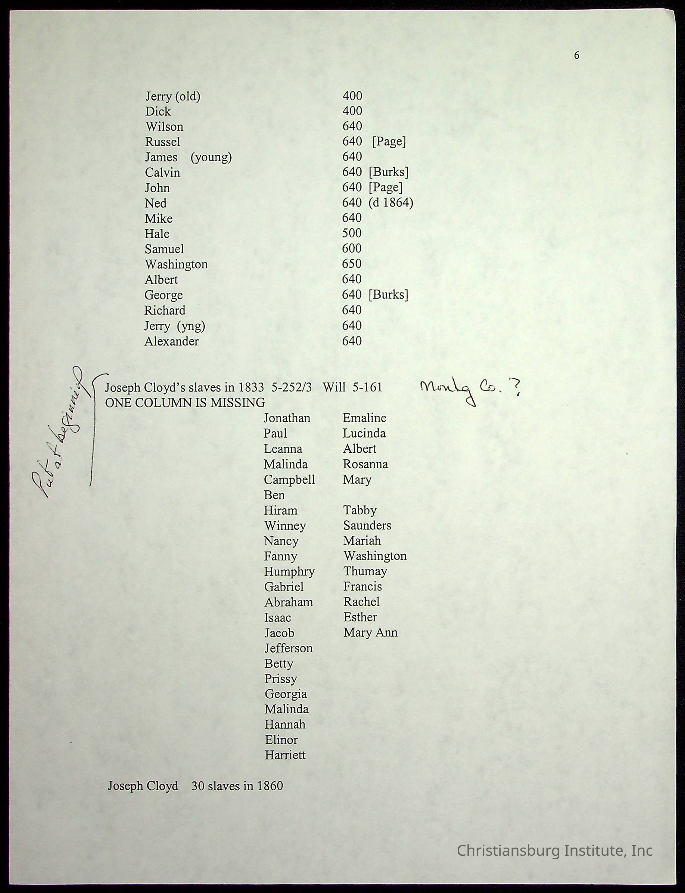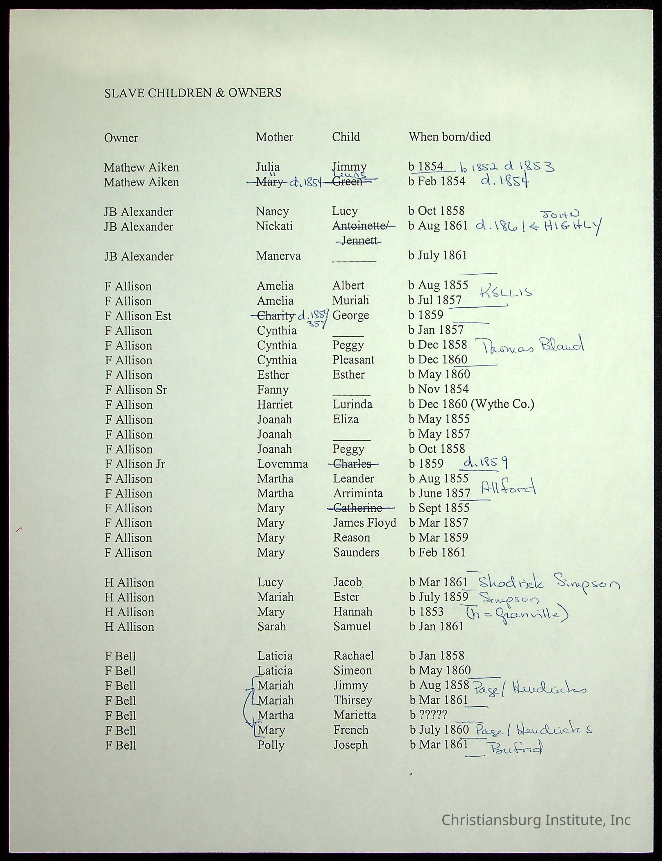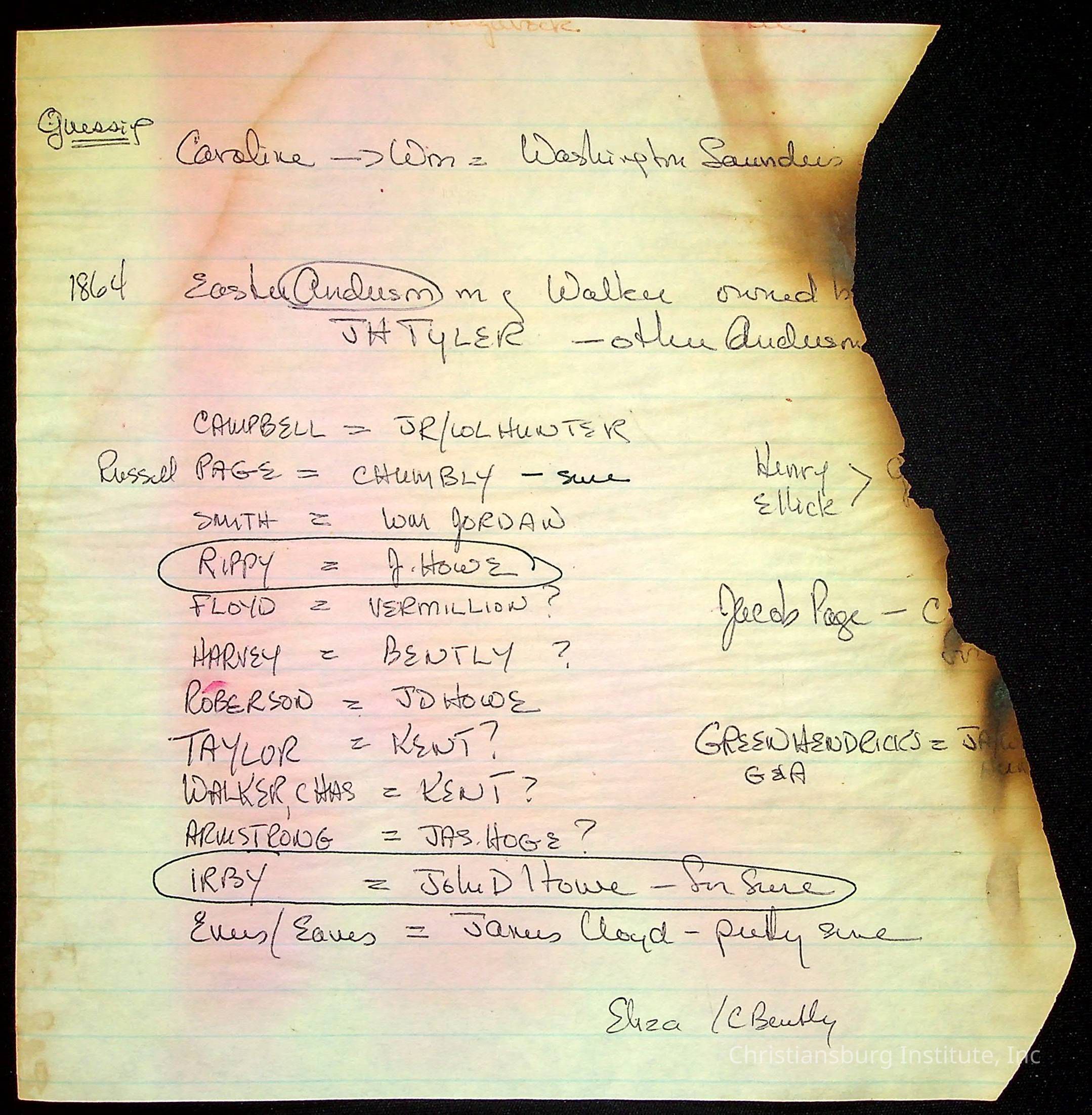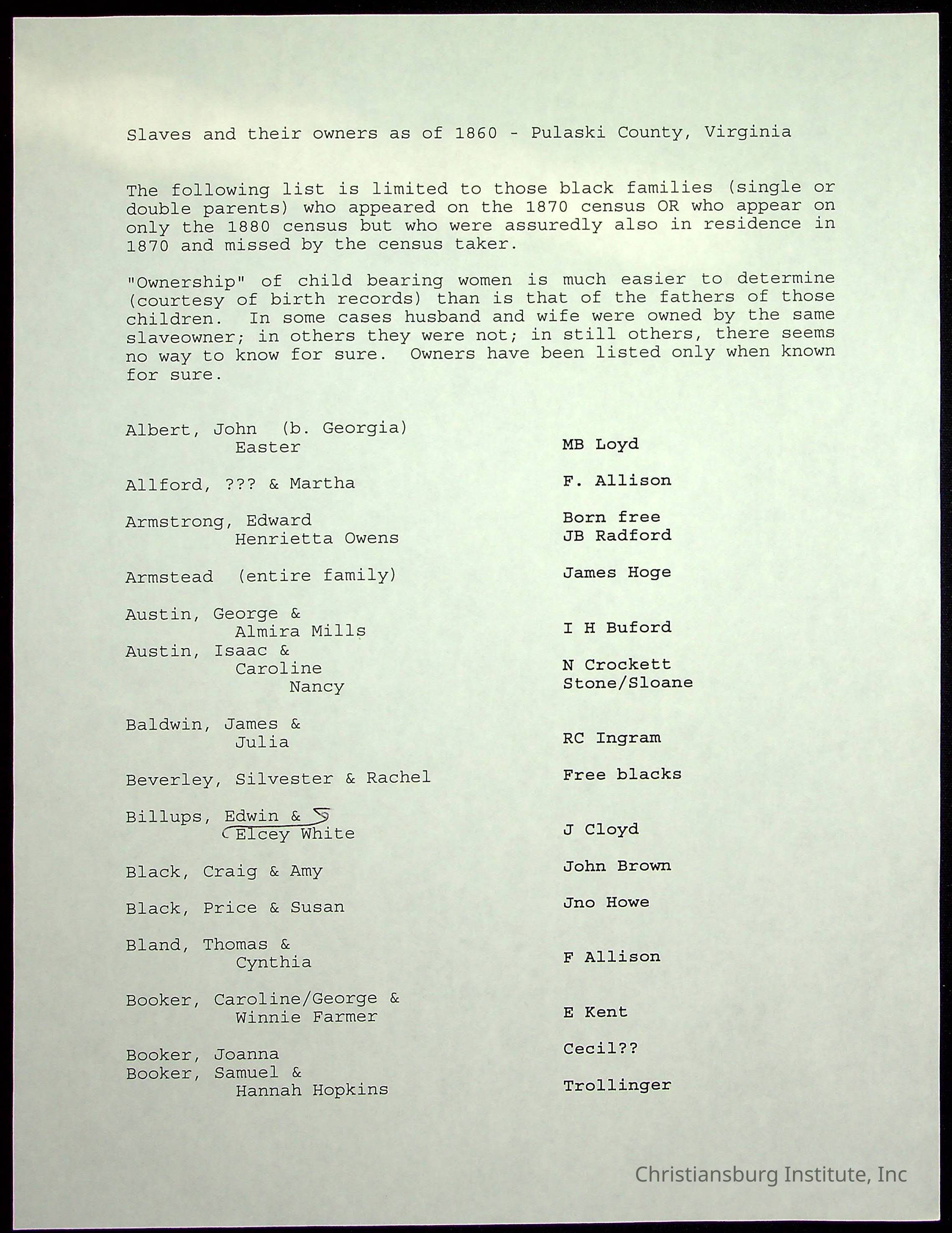 A folder of research materials collected by Radford University professor, Dr Linda Killen. This folder is titled 'Pulaski Slaves/Owners' and includes Killen's research on the enslaved population and their owners from Pulaski County, Virginia. Please note: some of the documents were damaged by fire.