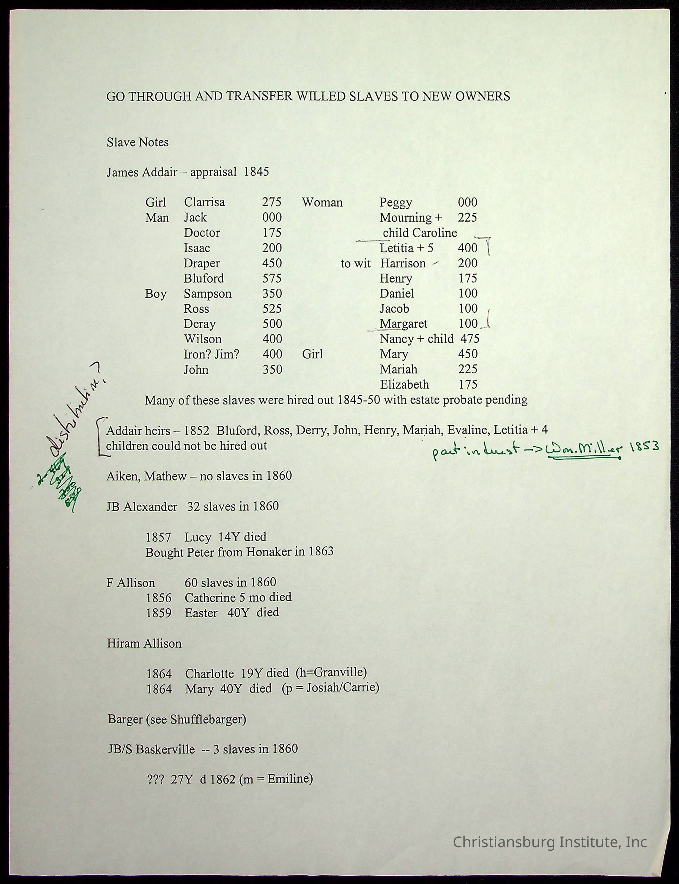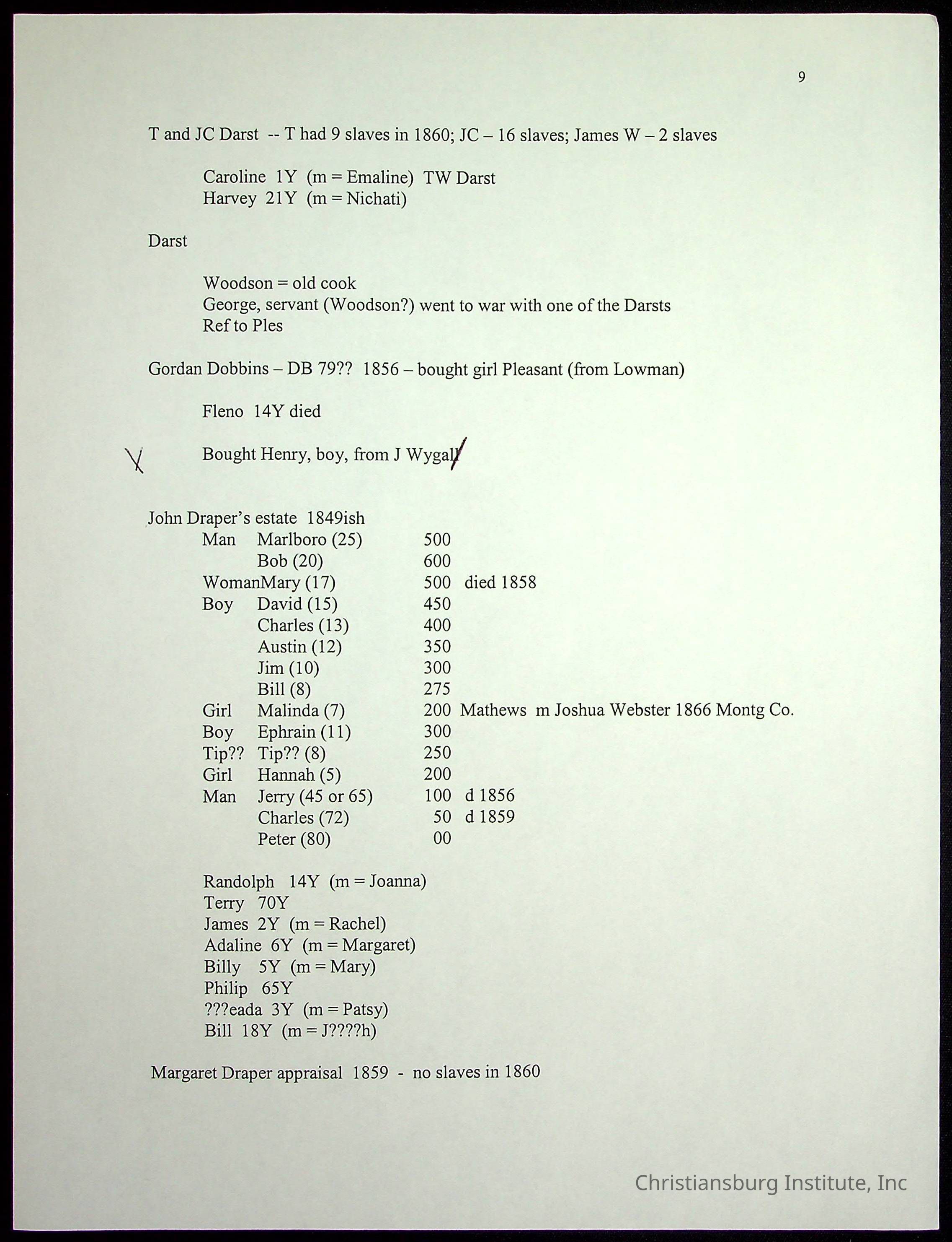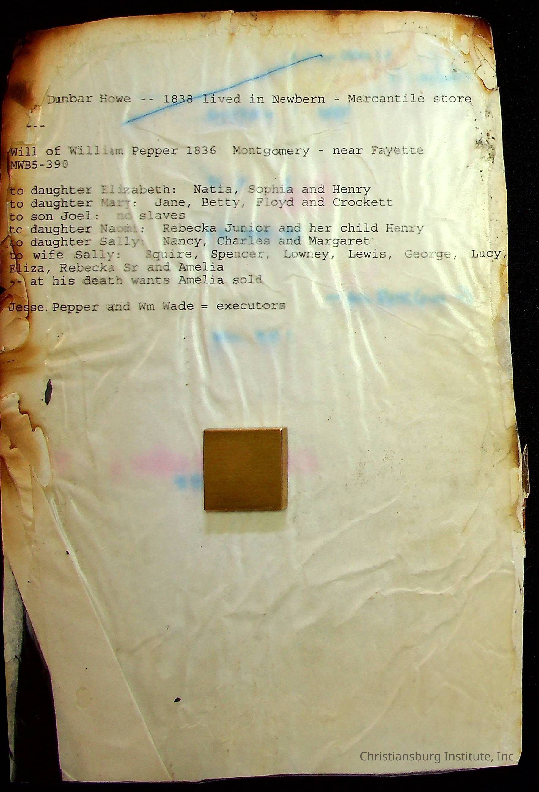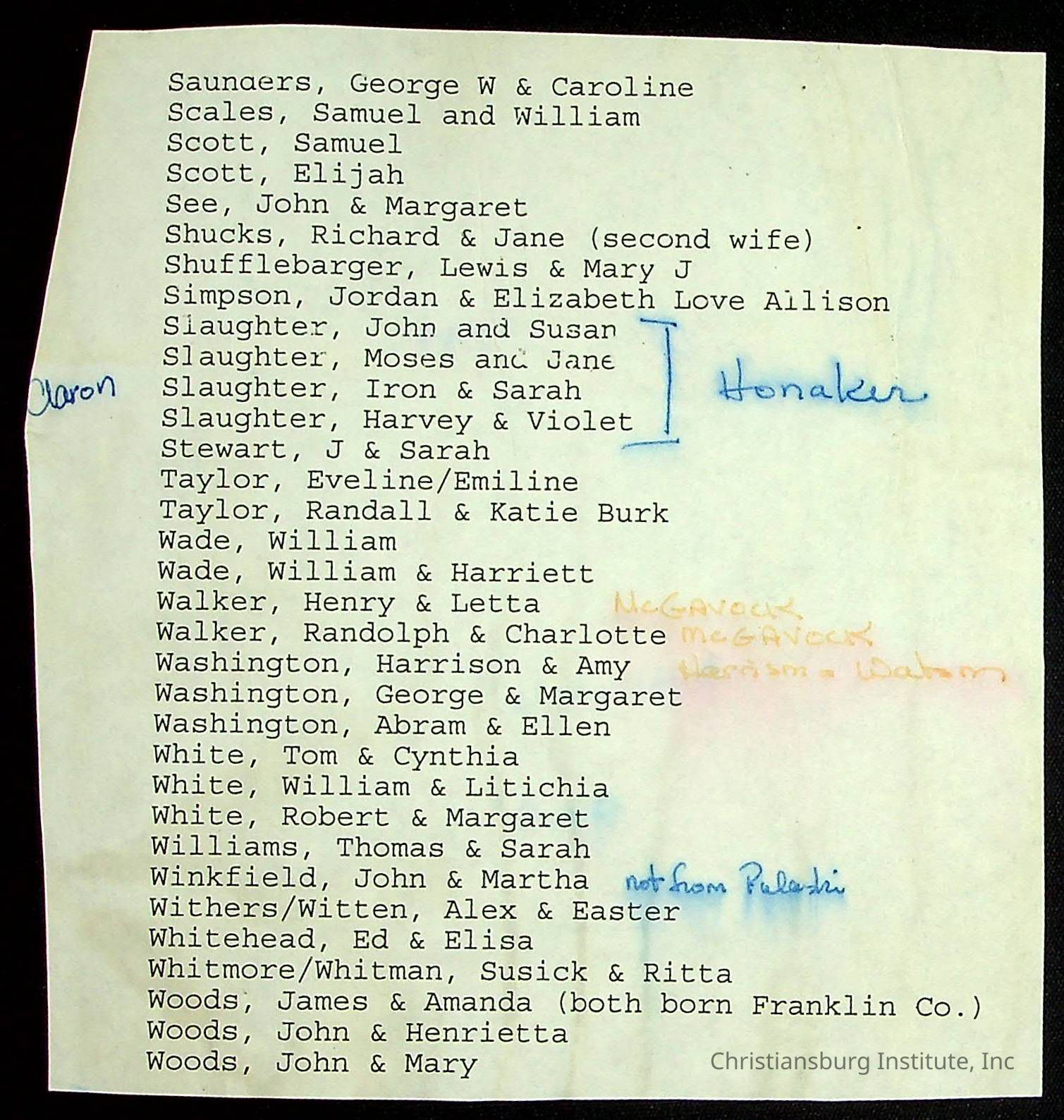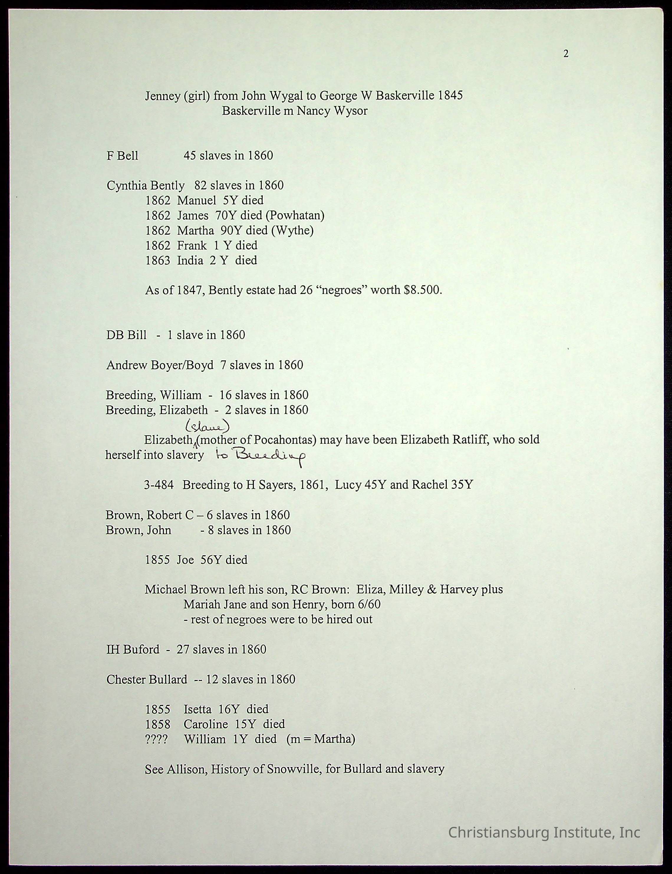 A folder of research materials collected by Radford University professor, Dr Linda Killen. This folder is titled 'Pulaski Slaves/Owners' and includes Killen's research on the enslaved population and their owners from Pulaski County, Virginia. Please note: some of the documents were damaged by fire.