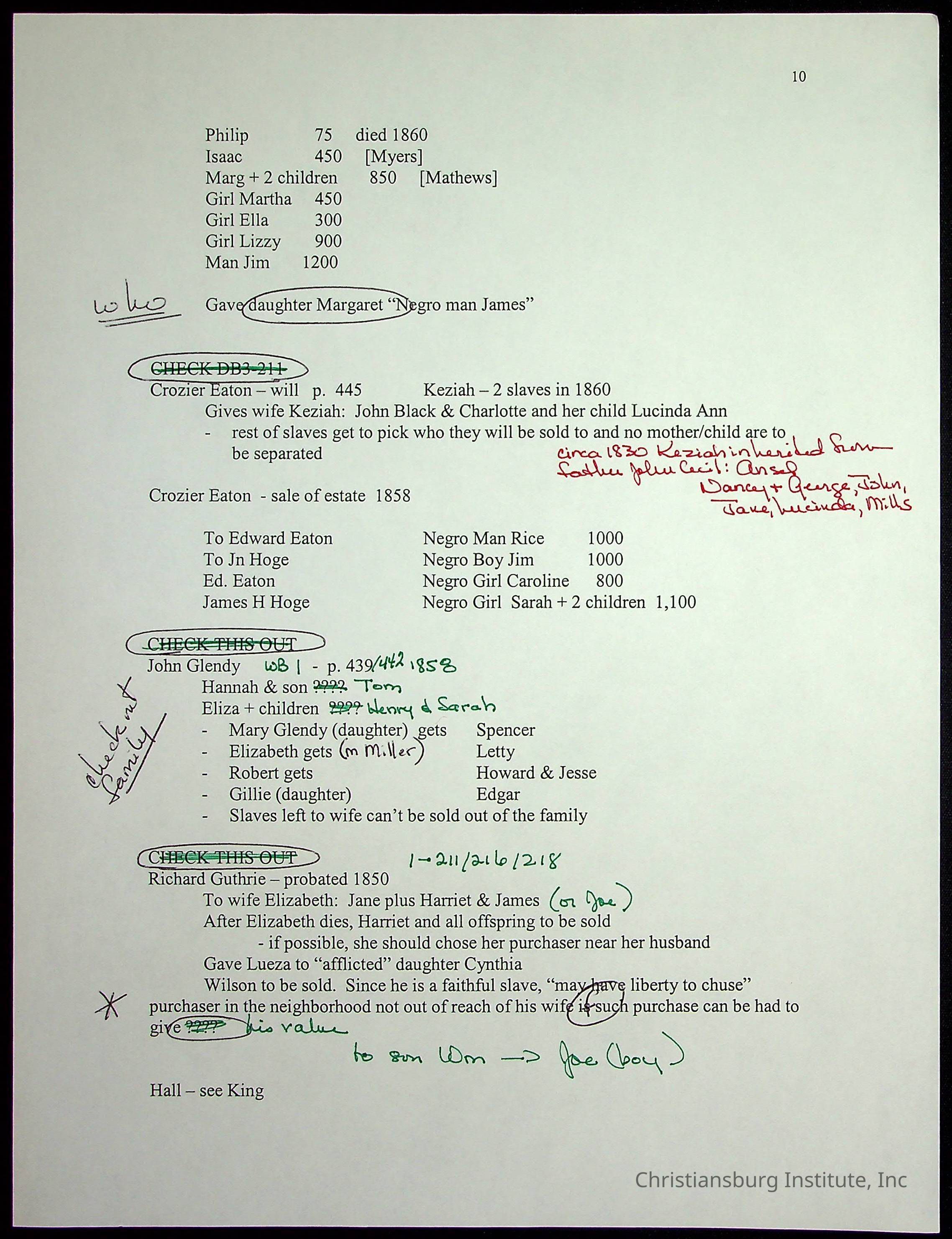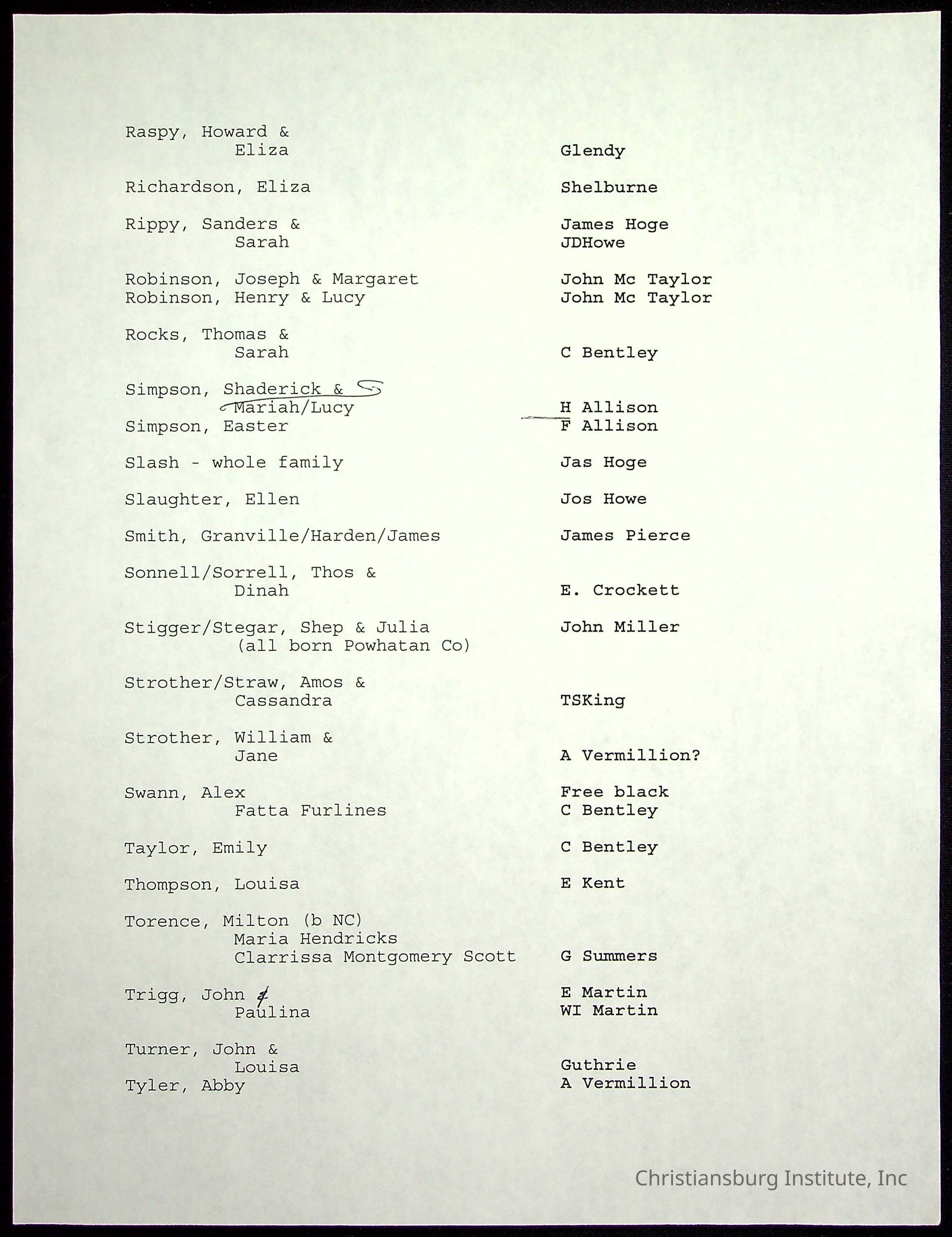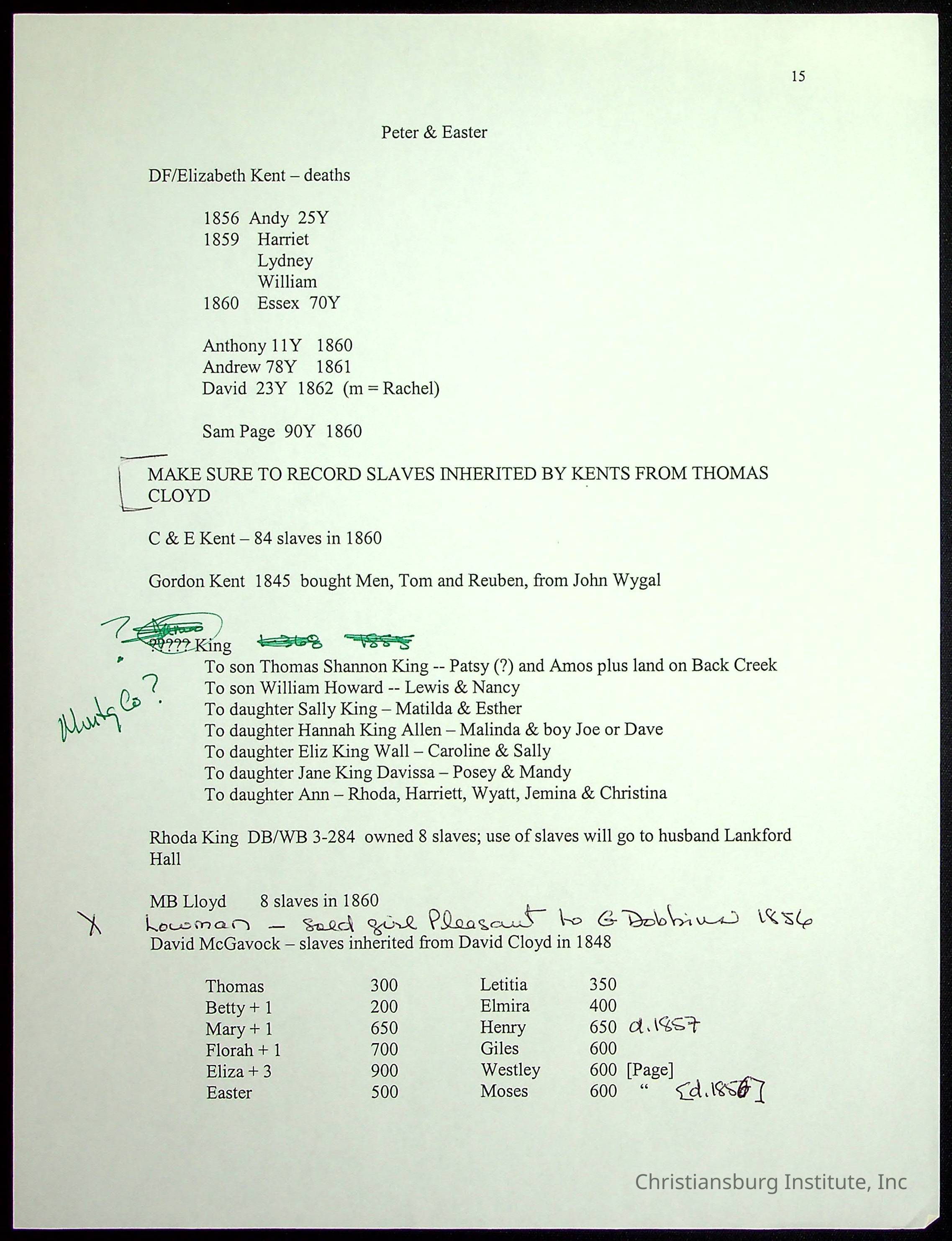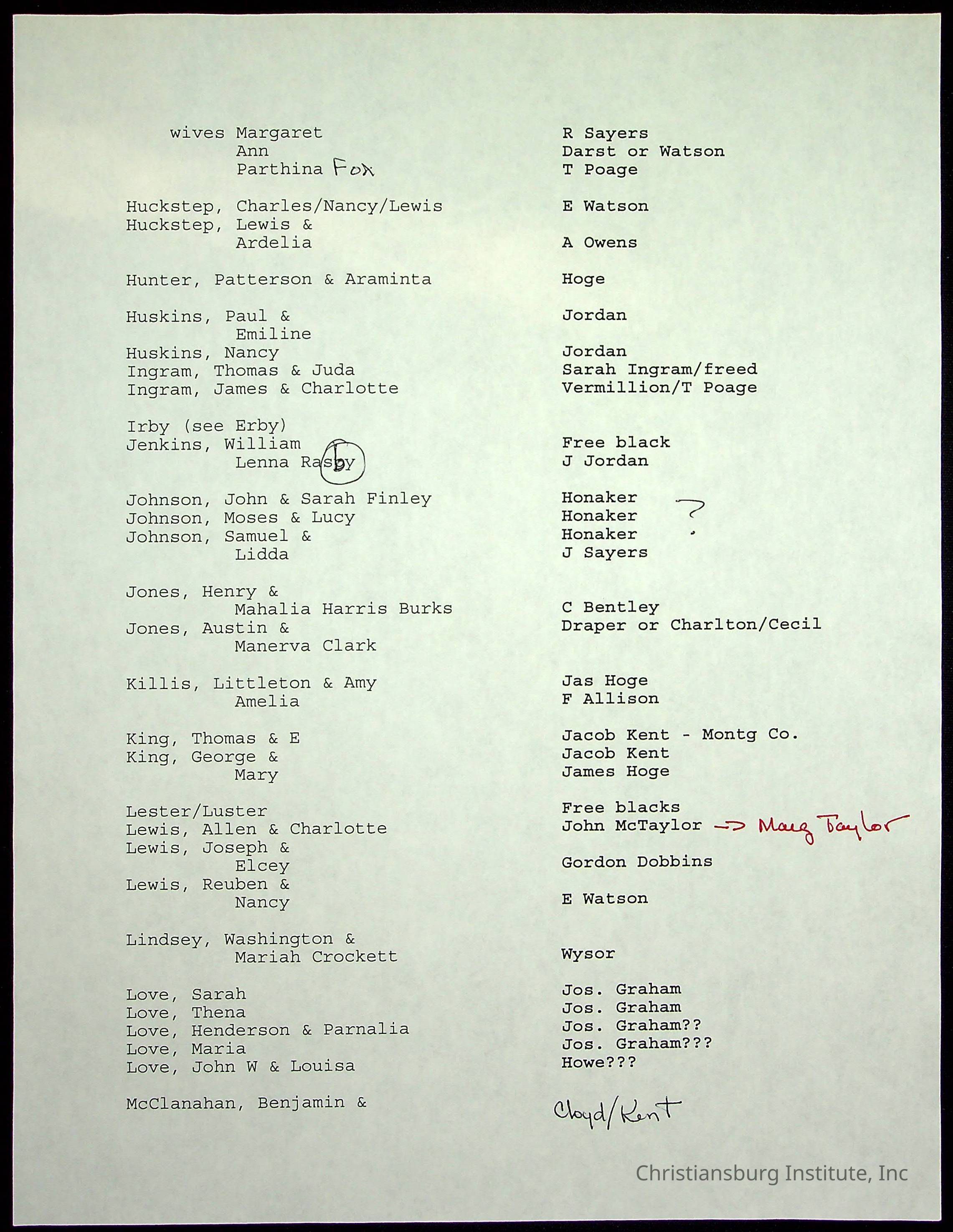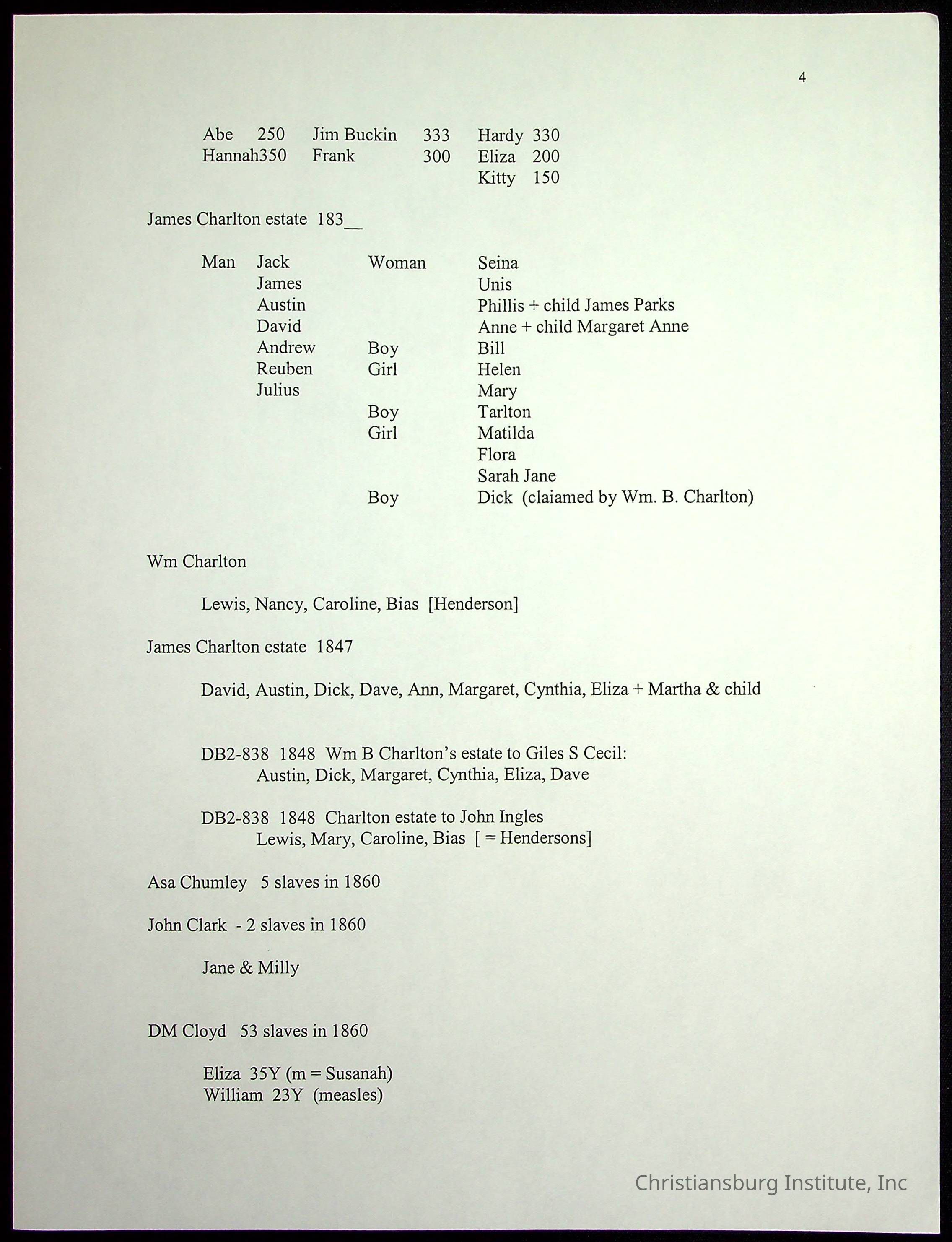 A folder of research materials collected by Radford University professor, Dr Linda Killen. This folder is titled 'Pulaski Slaves/Owners' and includes Killen's research on the enslaved population and their owners from Pulaski County, Virginia. Please note: some of the documents were damaged by fire.
