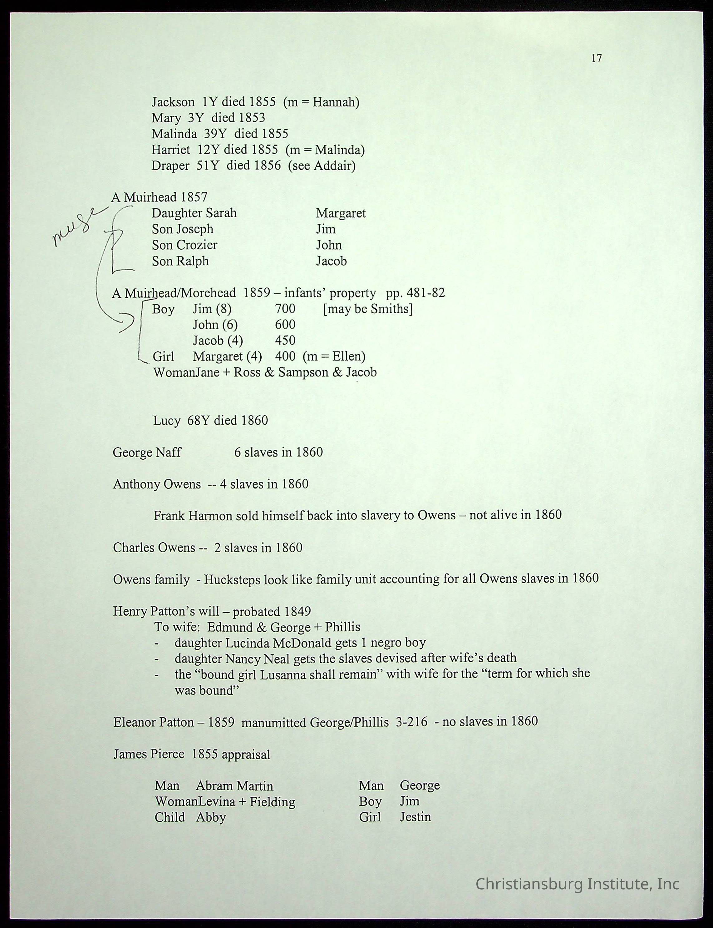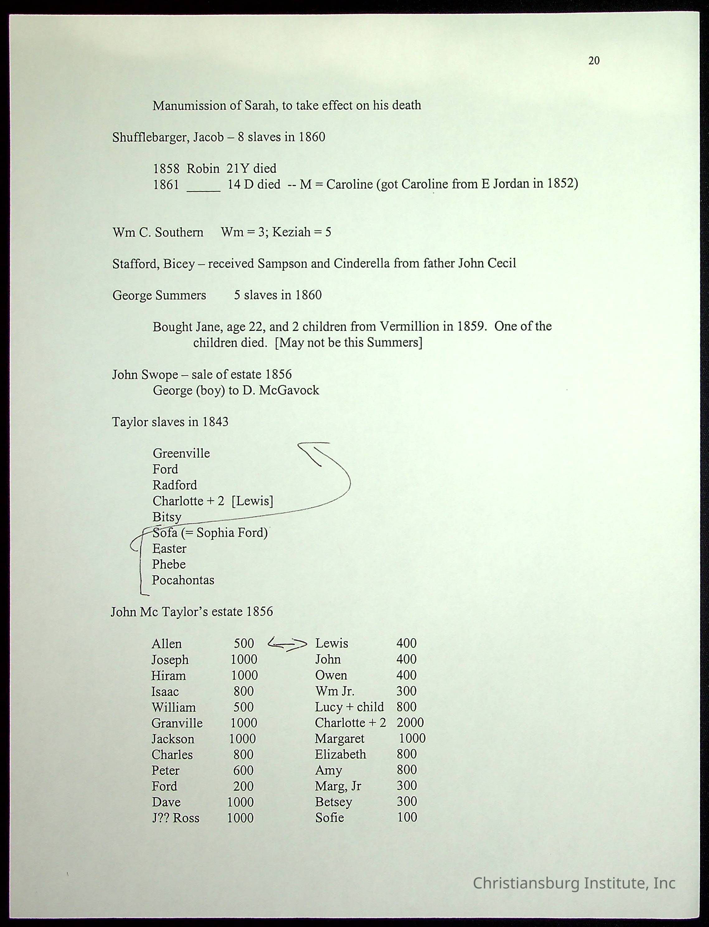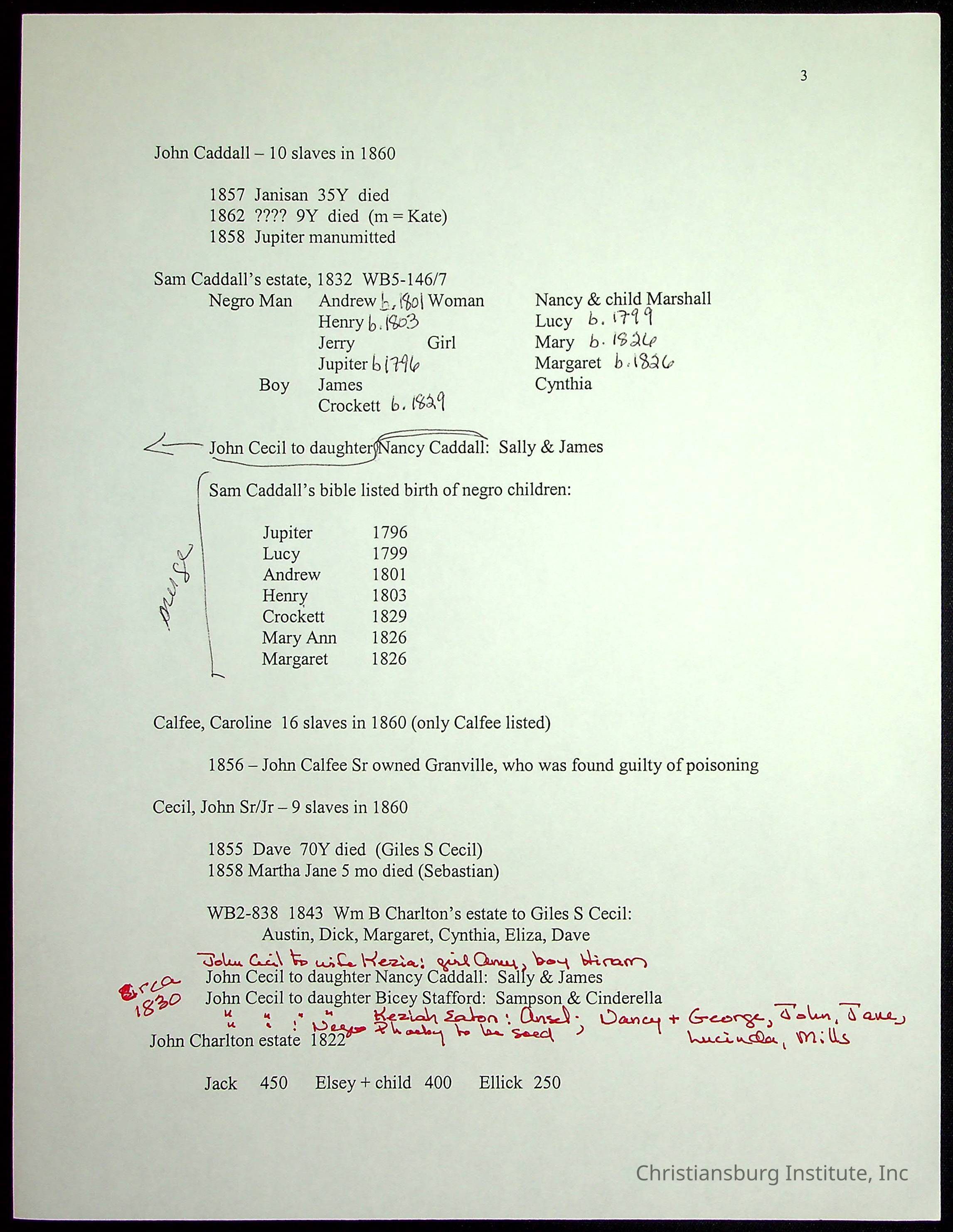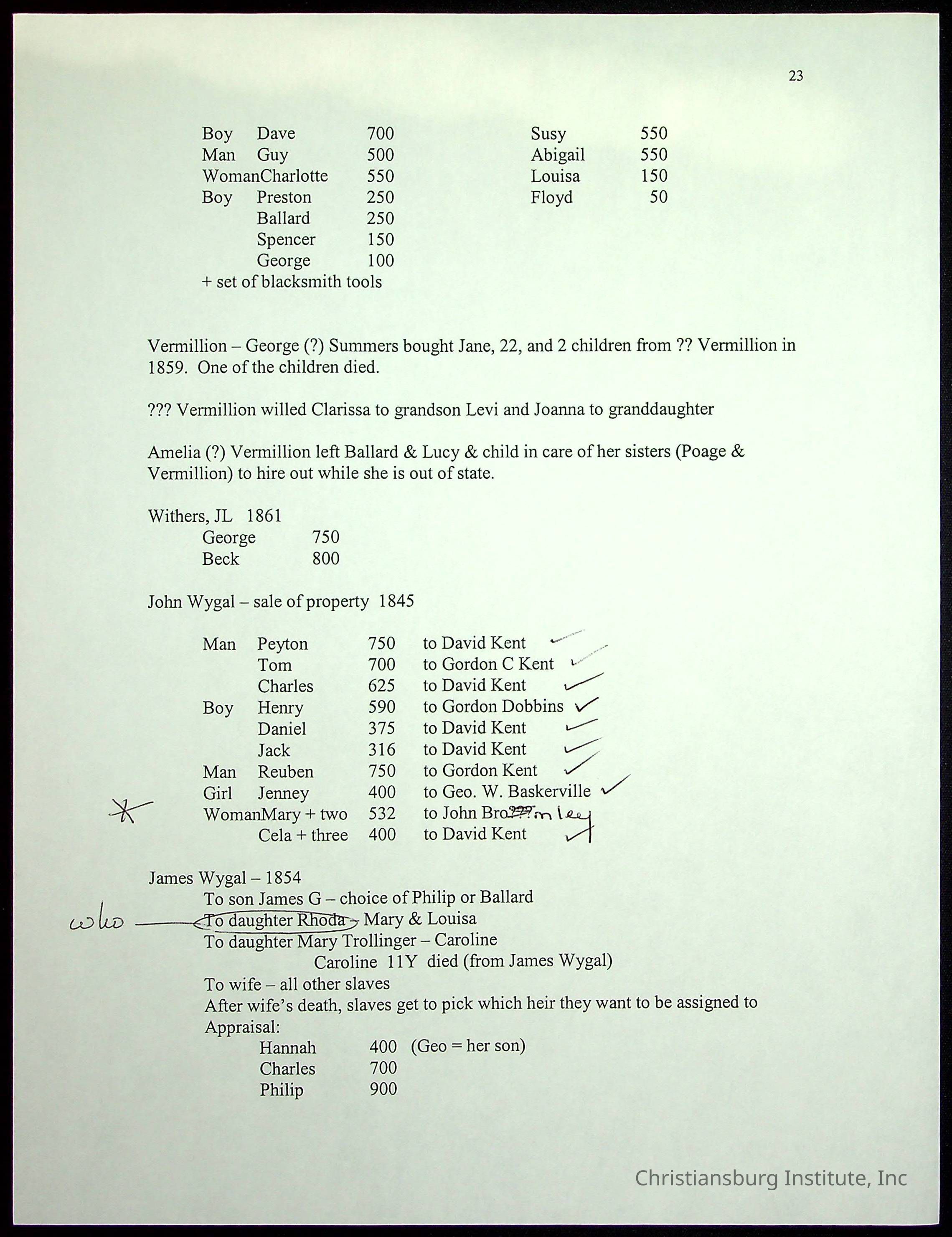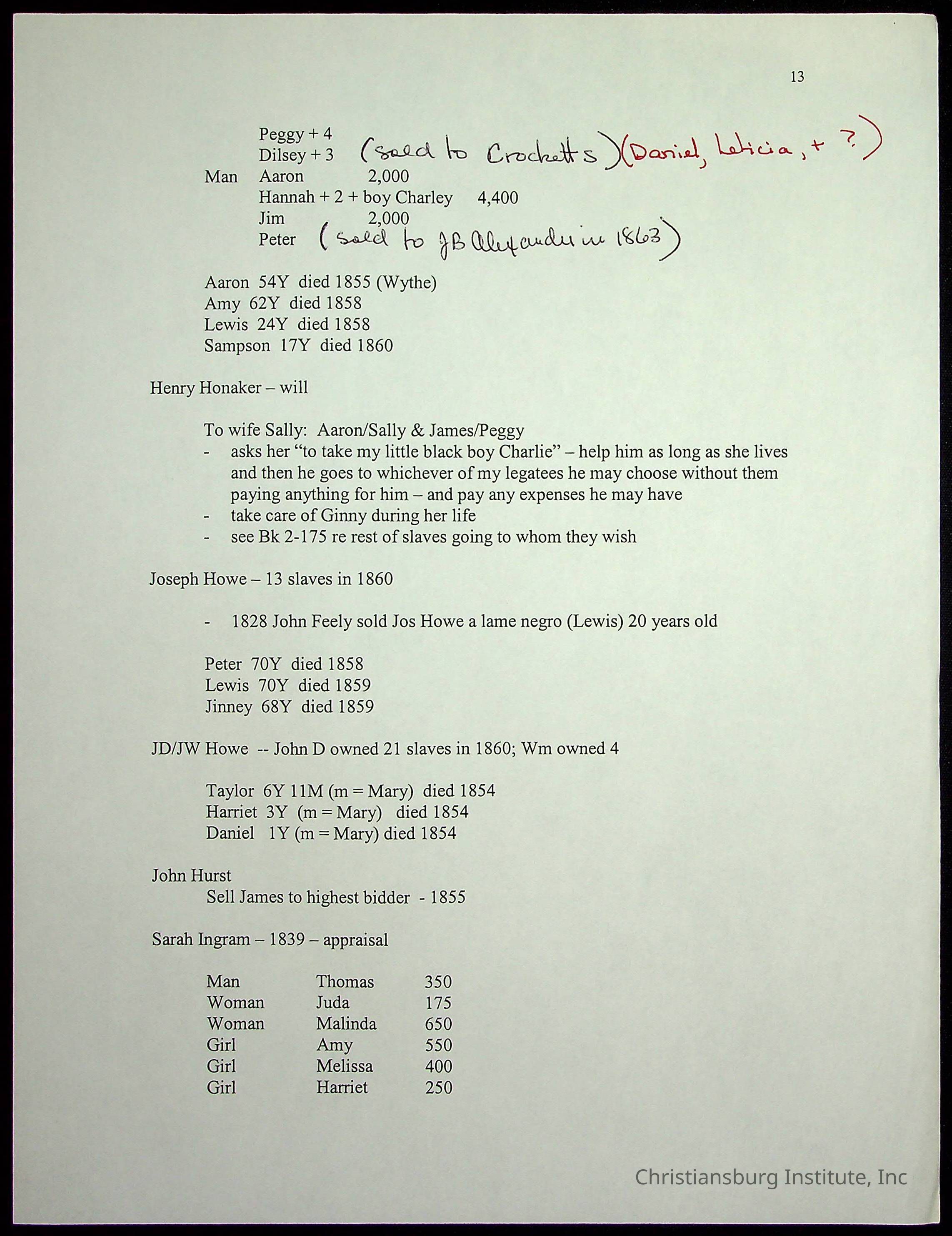 A folder of research materials collected by Radford University professor, Dr Linda Killen. This folder is titled 'Pulaski Slaves/Owners' and includes Killen's research on the enslaved population and their owners from Pulaski County, Virginia. Please note: some of the documents were damaged by fire.