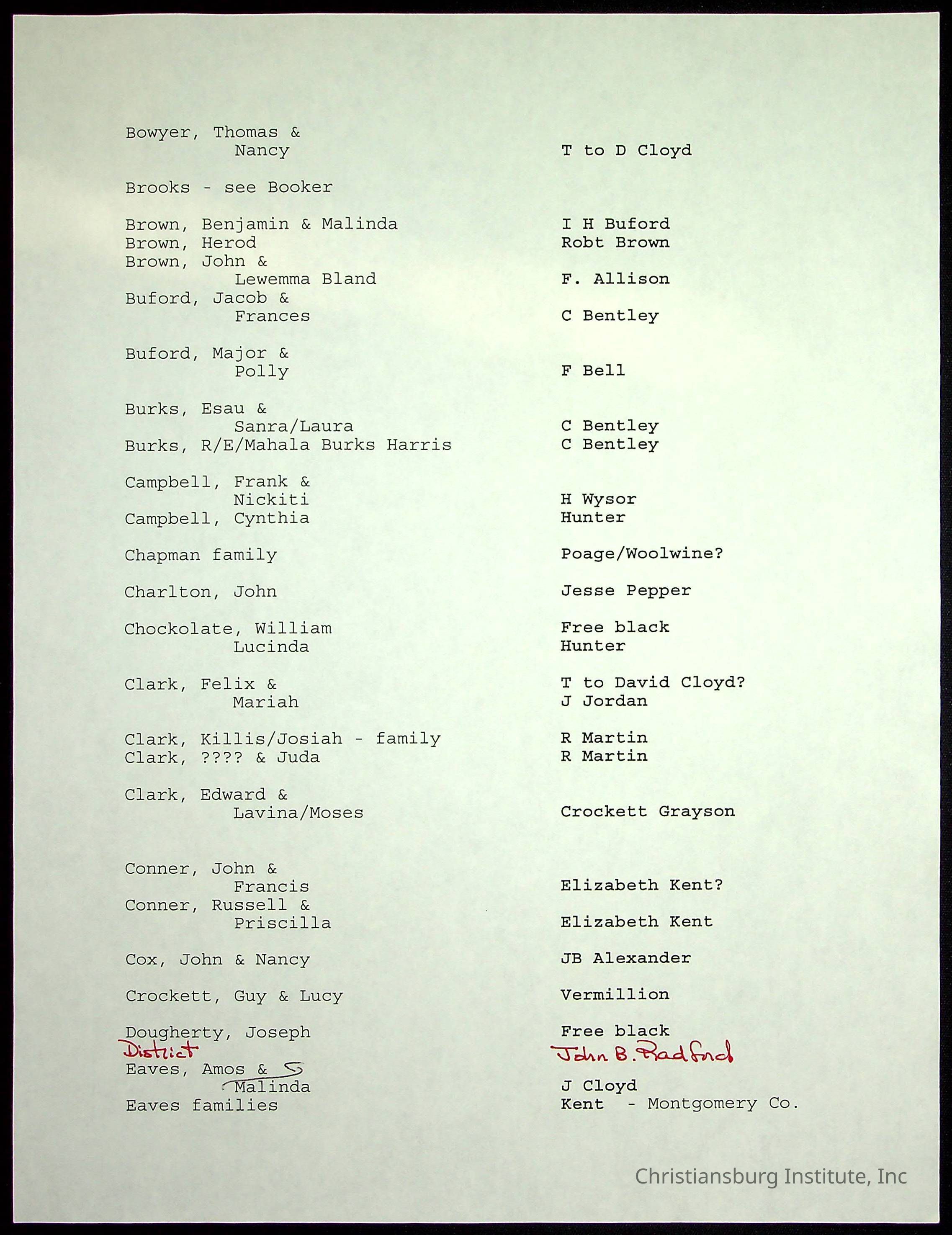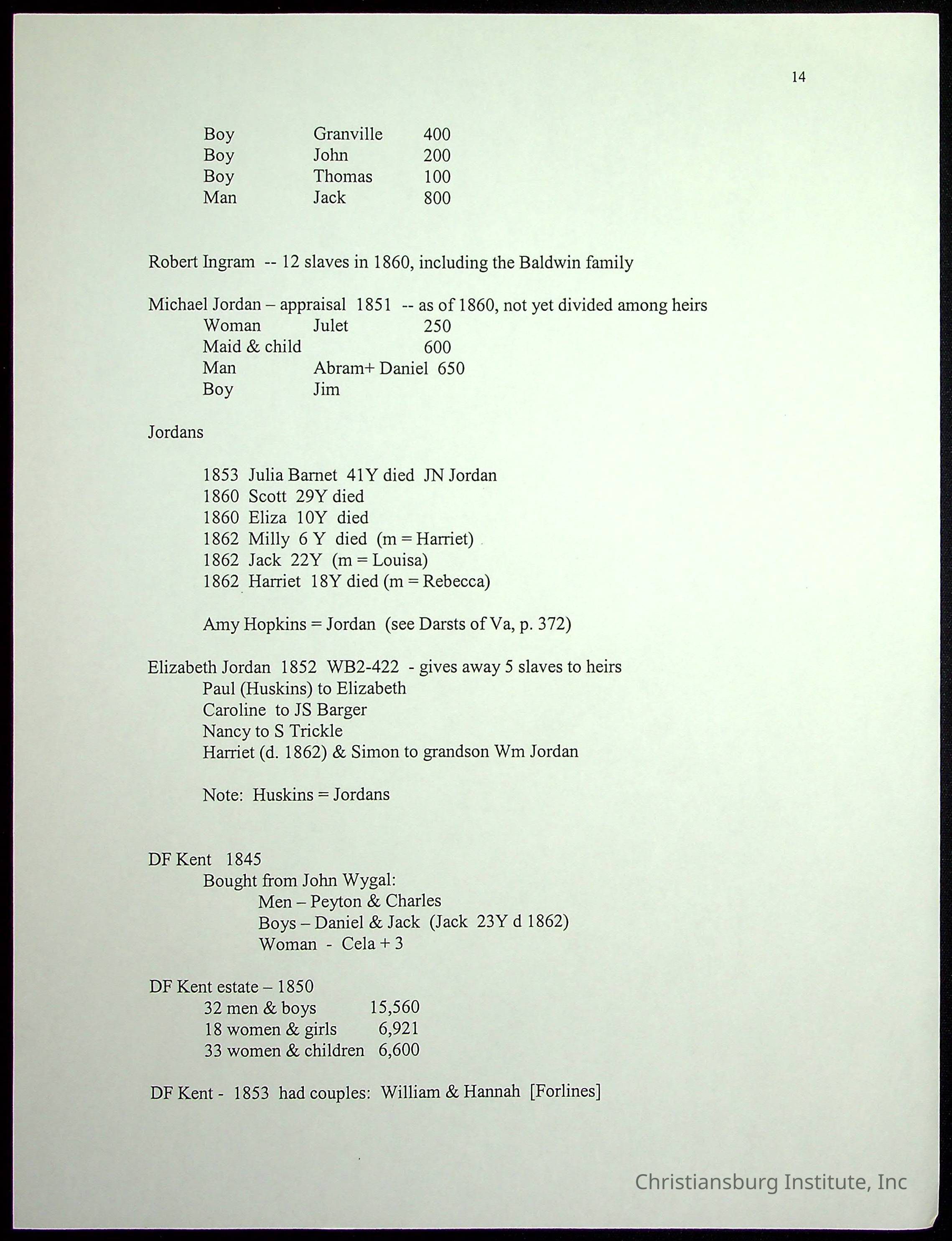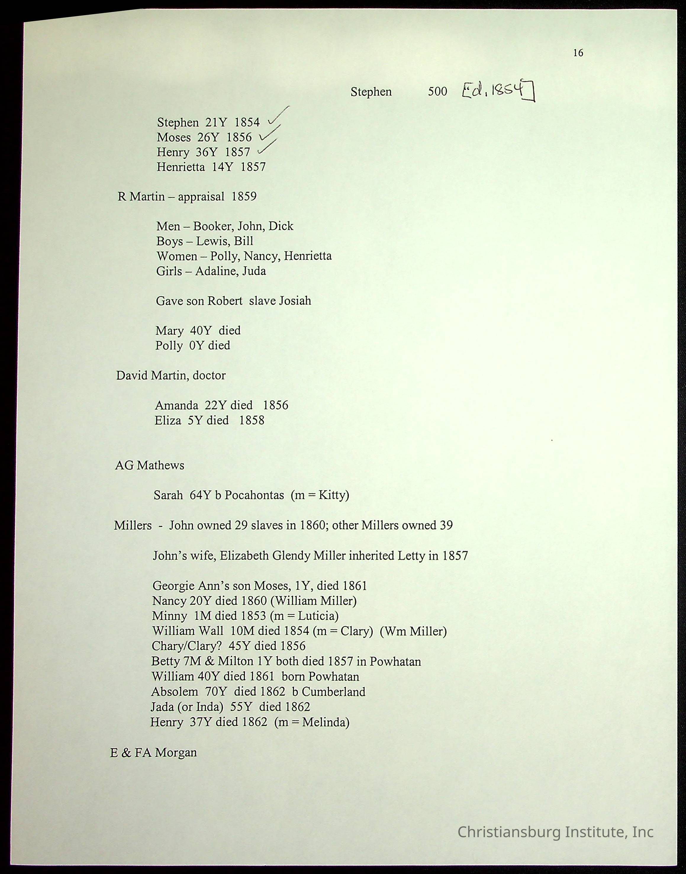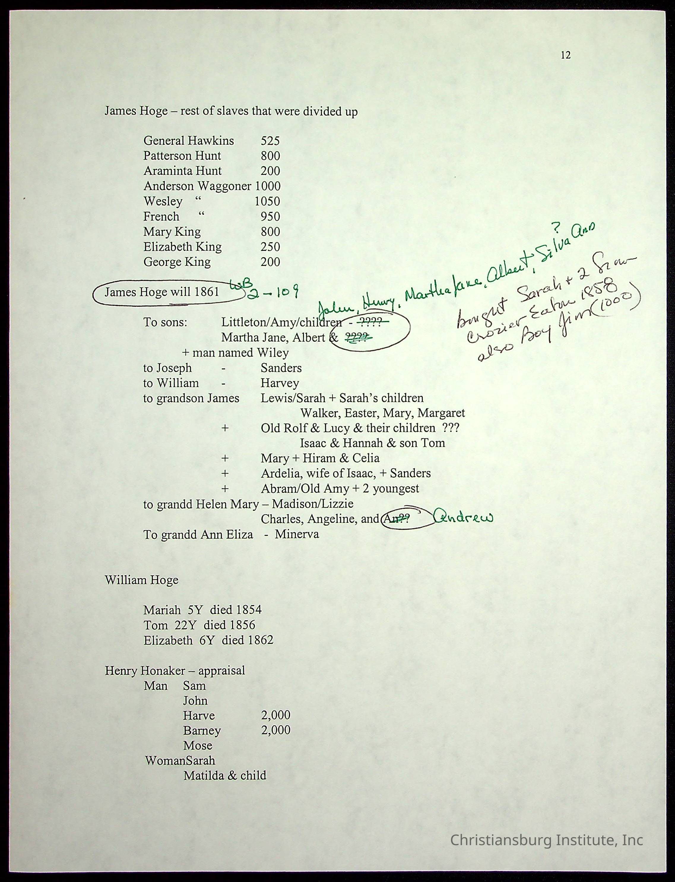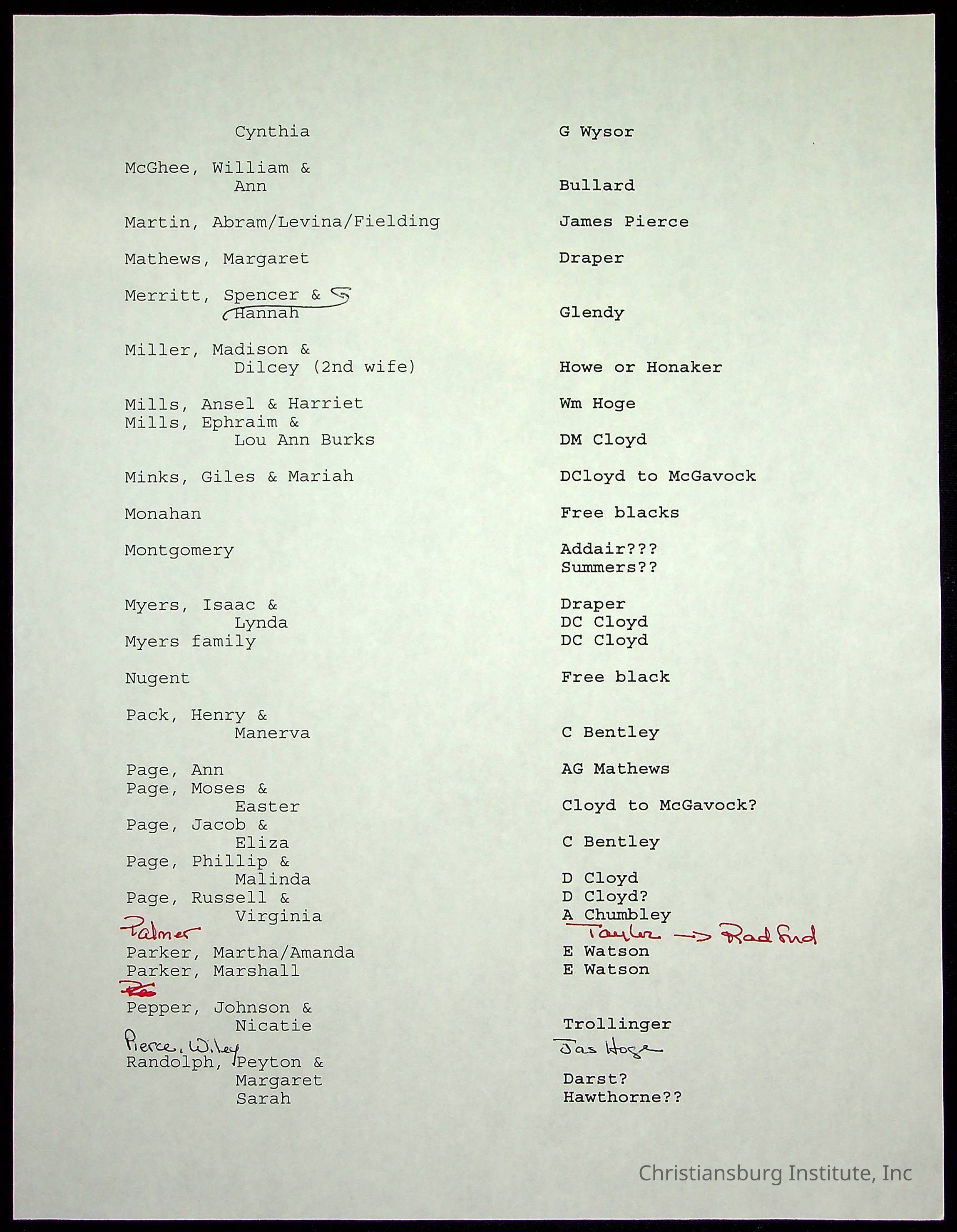 A folder of research materials collected by Radford University professor, Dr Linda Killen. This folder is titled 'Pulaski Slaves/Owners' and includes Killen's research on the enslaved population and their owners from Pulaski County, Virginia. Please note: some of the documents were damaged by fire.