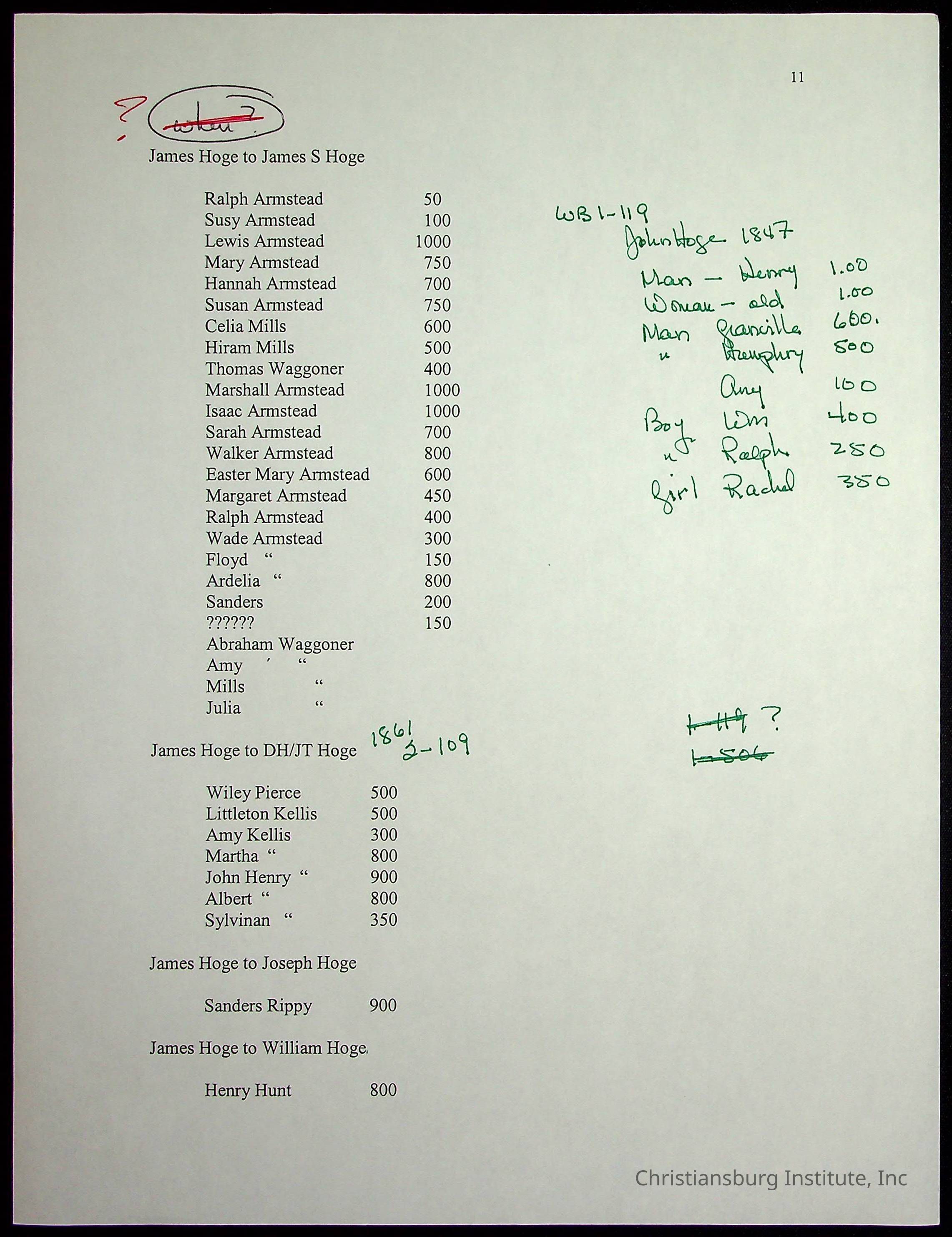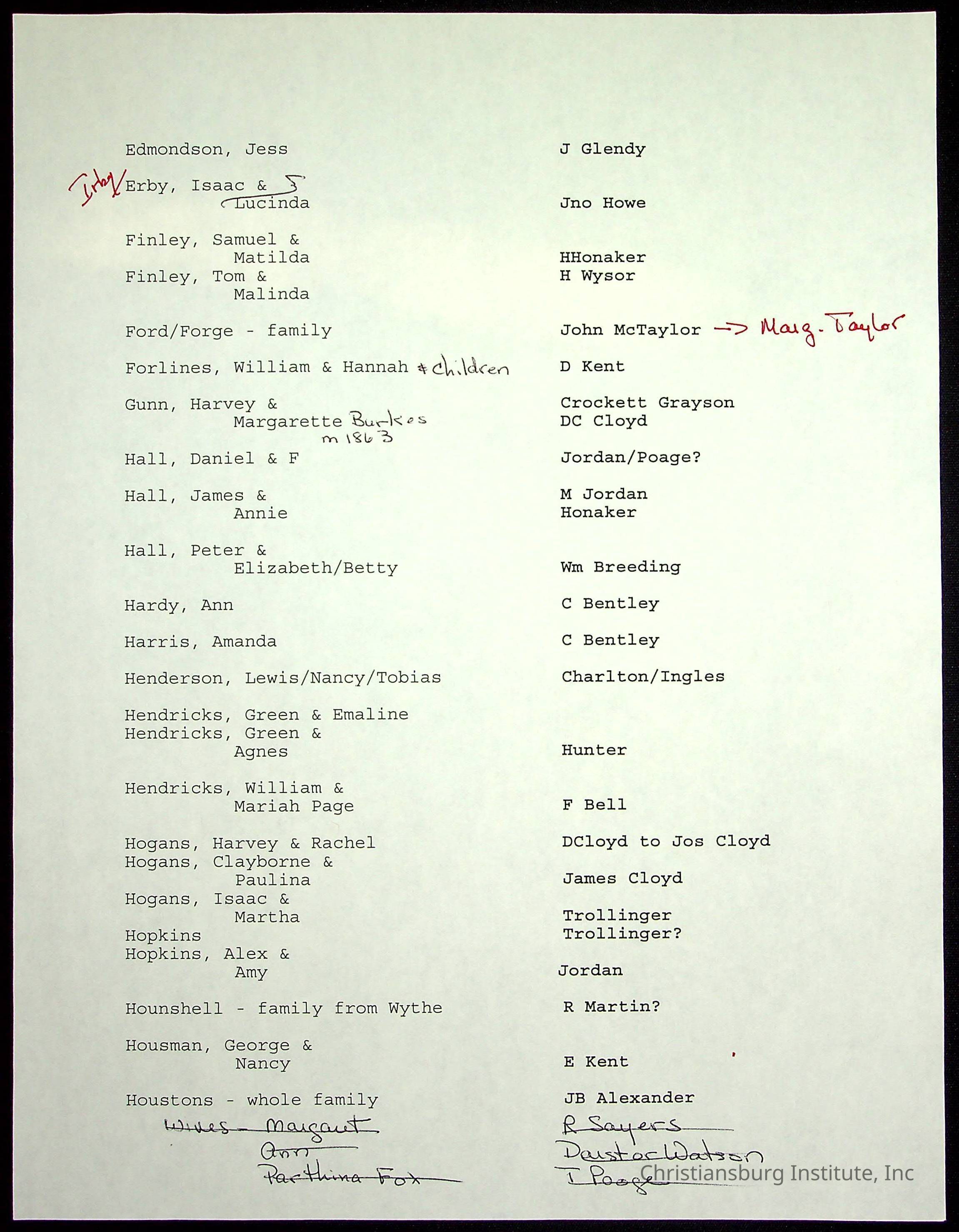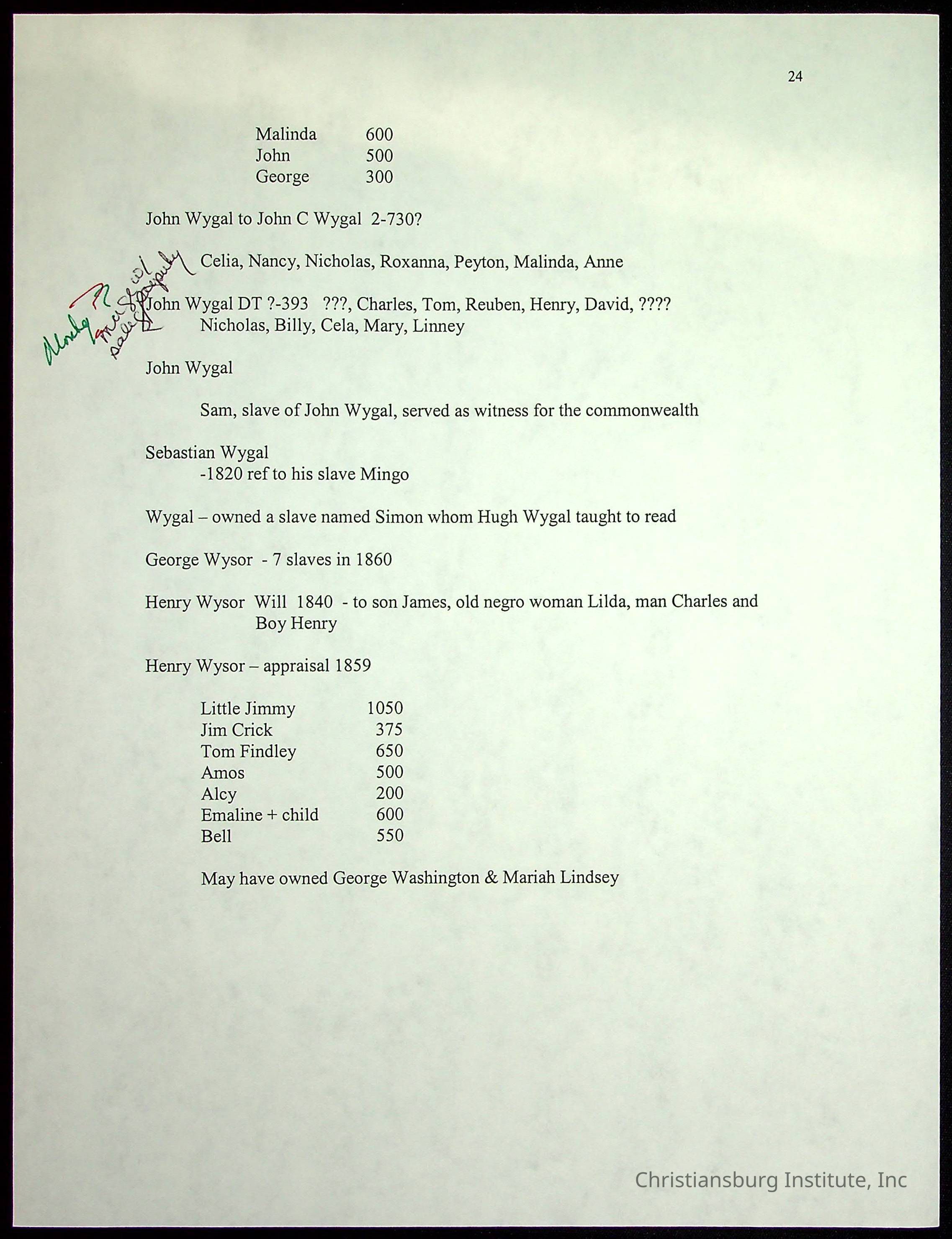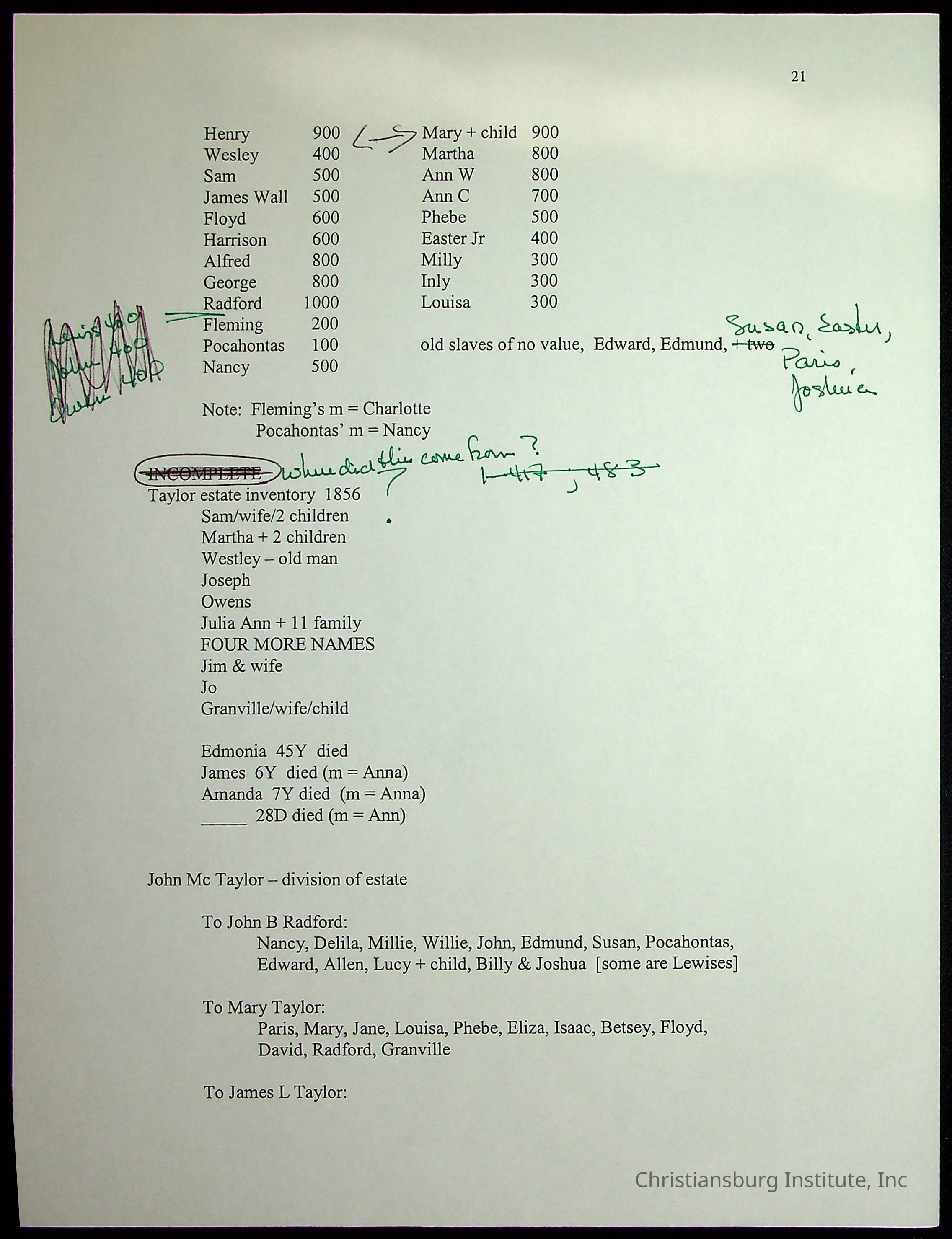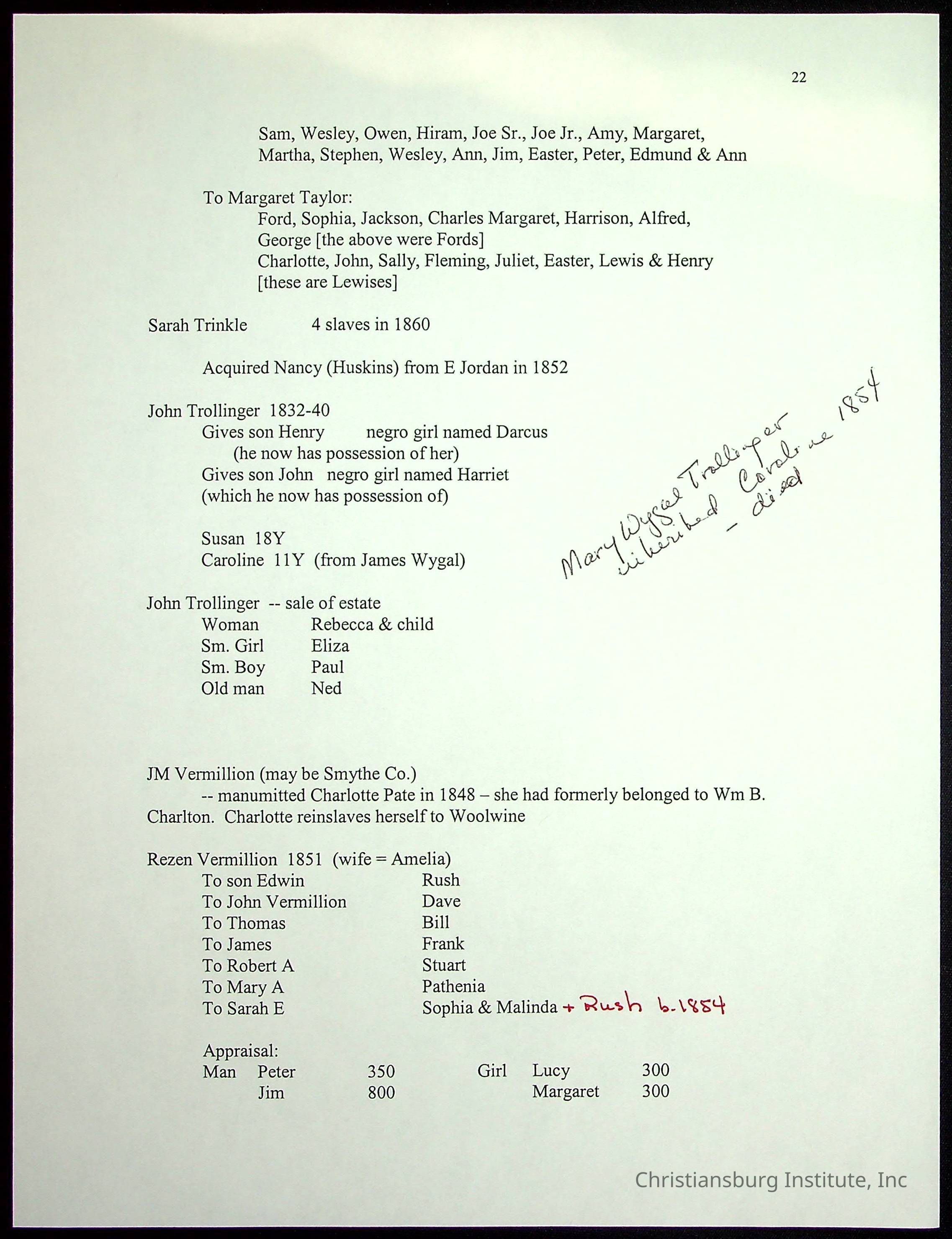 A folder of research materials collected by Radford University professor, Dr Linda Killen. This folder is titled 'Pulaski Slaves/Owners' and includes Killen's research on the enslaved population and their owners from Pulaski County, Virginia. Please note: some of the documents were damaged by fire.