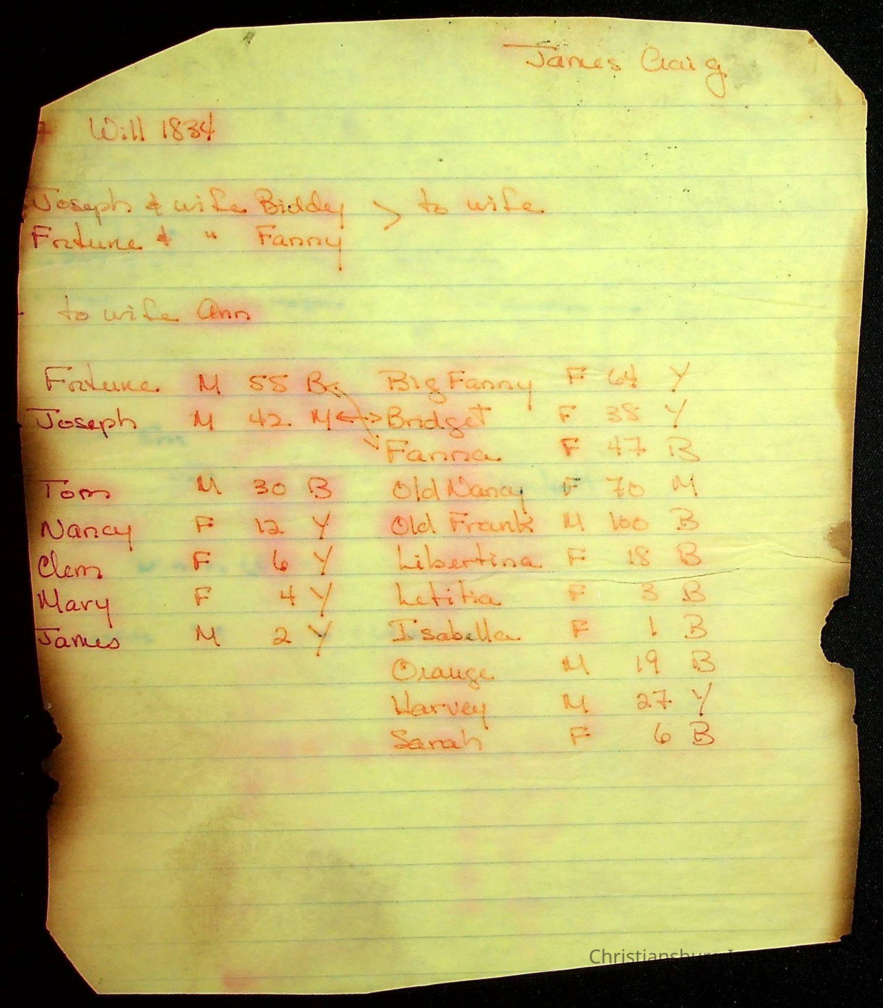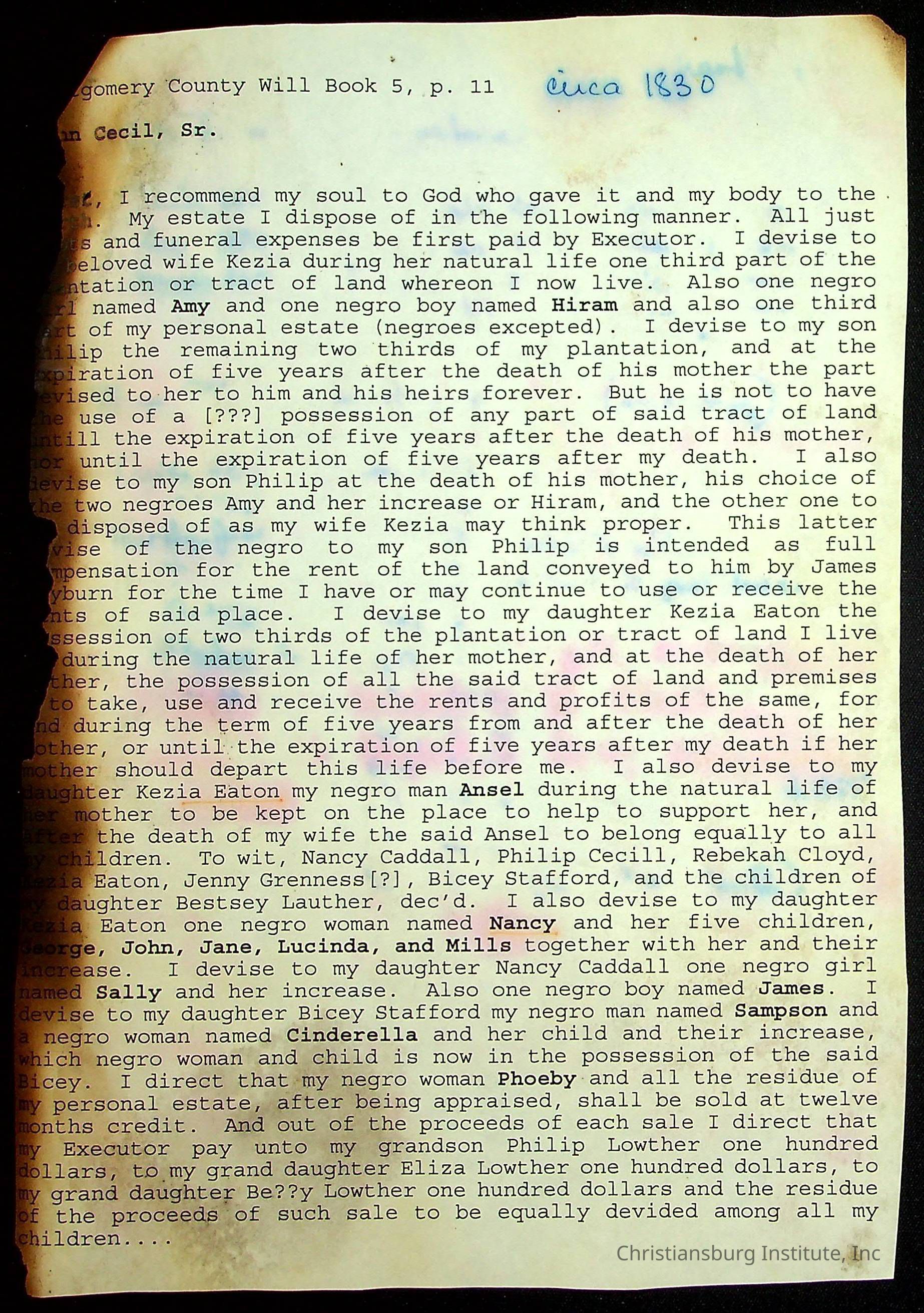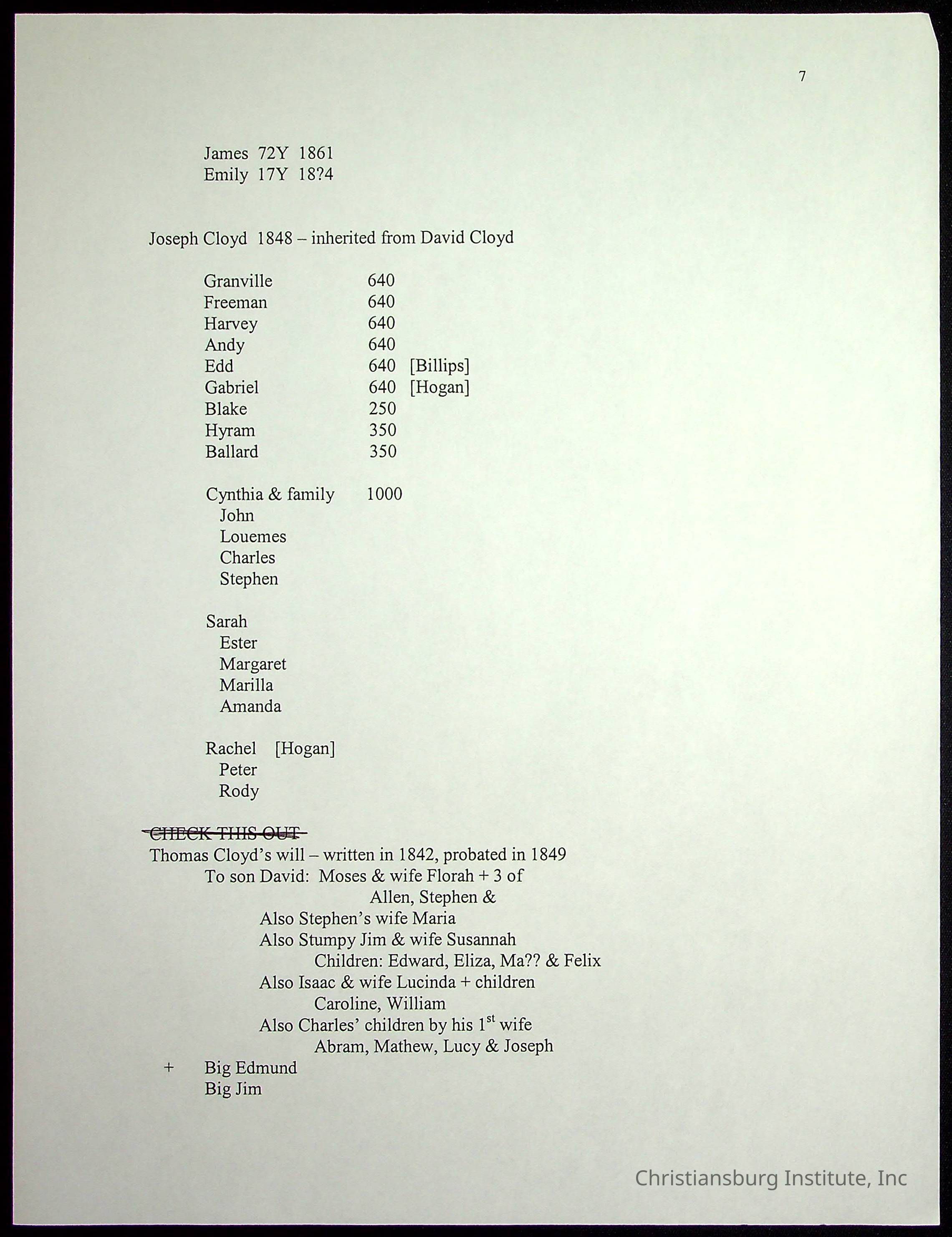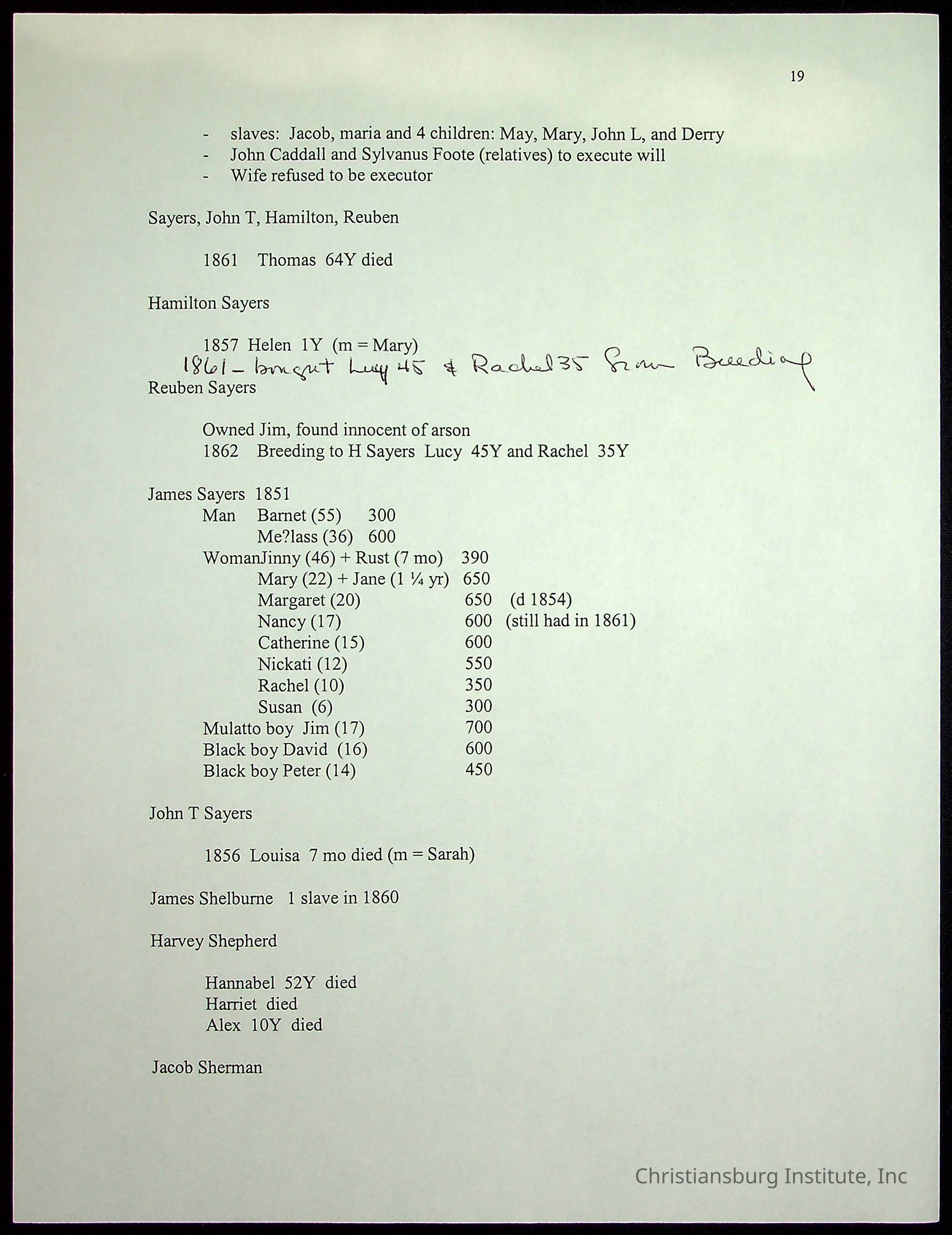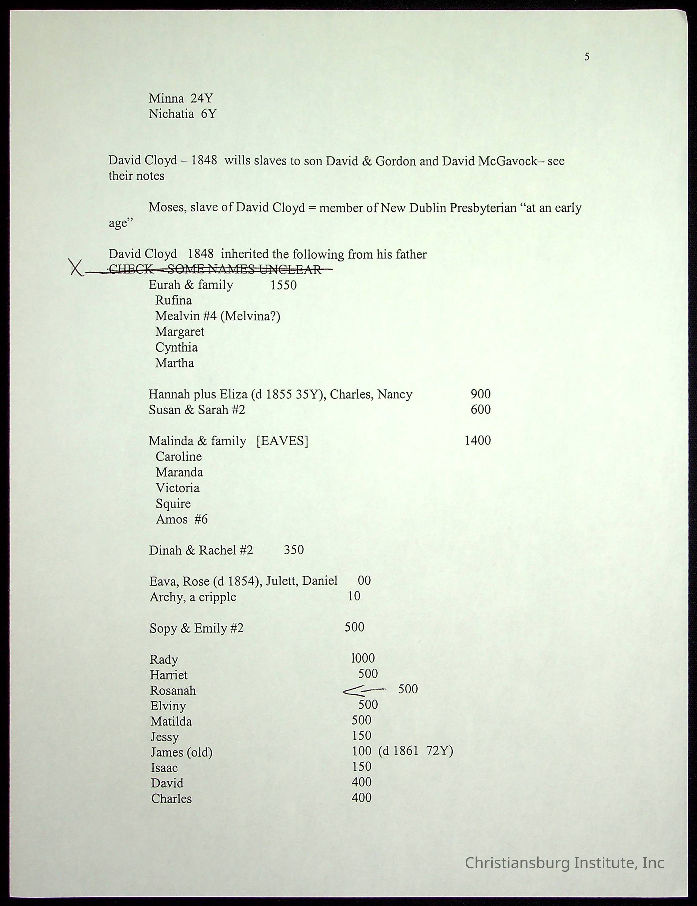 A folder of research materials collected by Radford University professor, Dr Linda Killen. This folder is titled 'Pulaski Slaves/Owners' and includes Killen's research on the enslaved population and their owners from Pulaski County, Virginia. Please note: some of the documents were damaged by fire.
