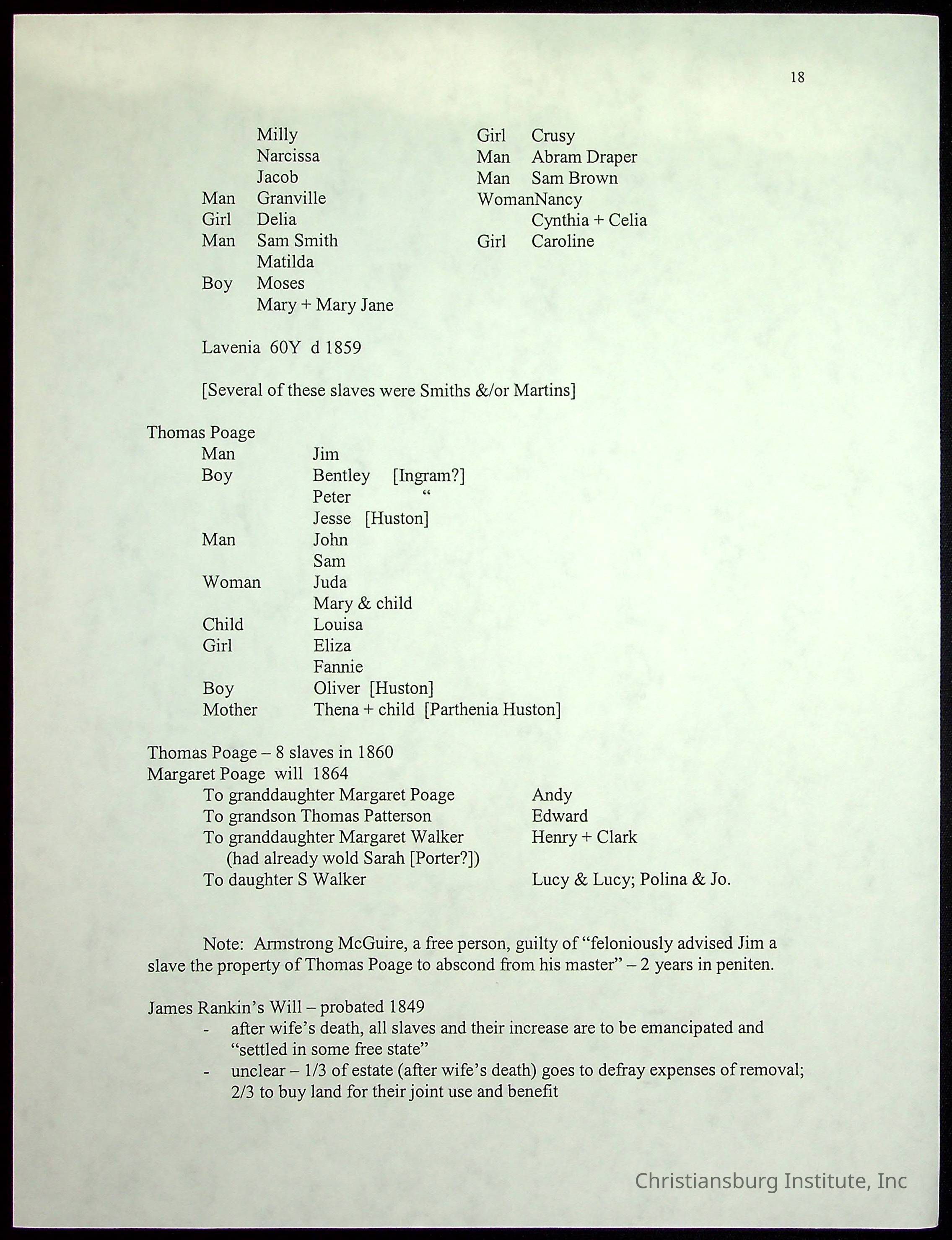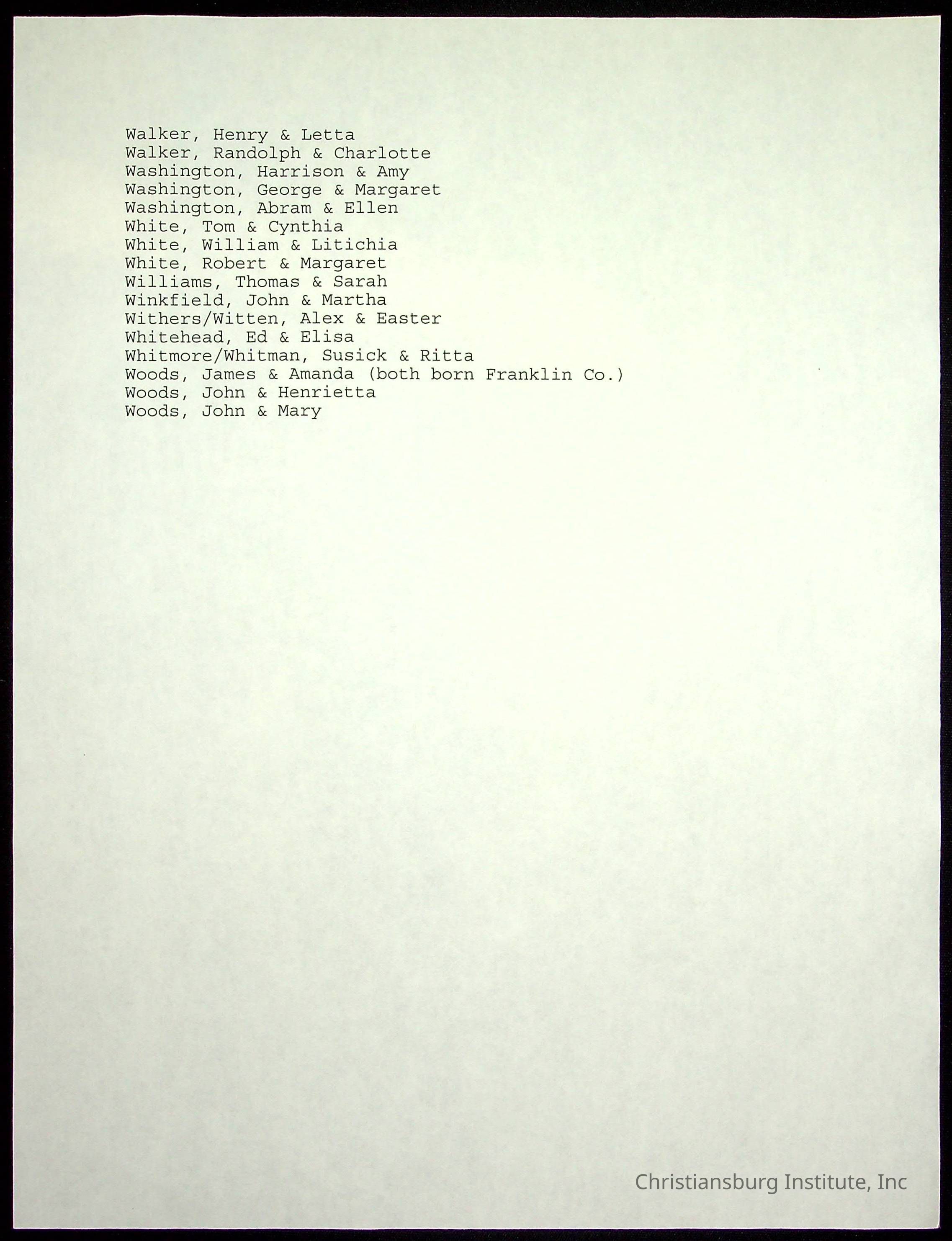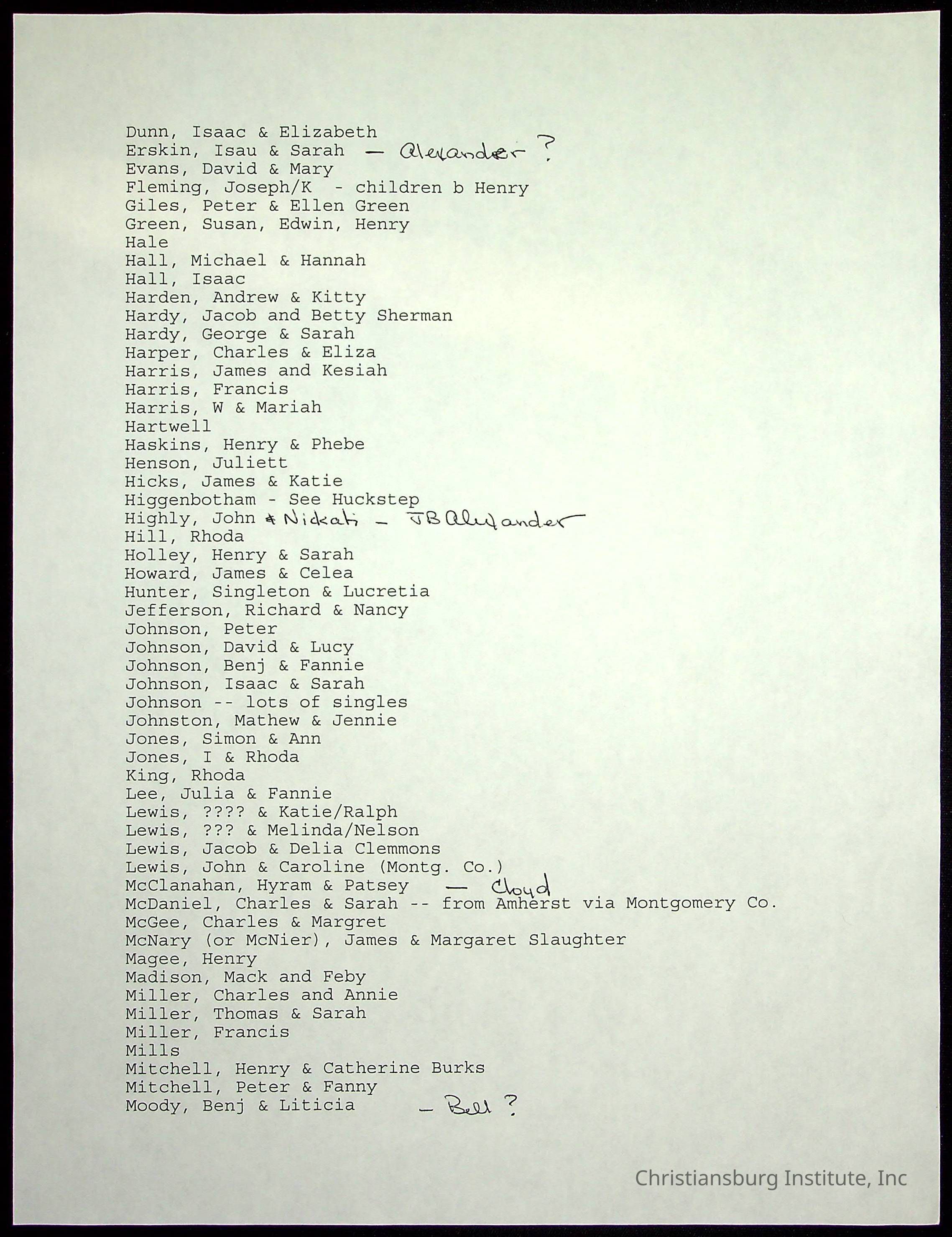 Farm Land, Boom Town, Village: A History of Belspring, Virginia, 1750-1940, The Reports of Charles S. Schaeffer from the Virginia counties of Montgomery and Pulaski, with additional information on the counties of Floyd, Giles, Craig, Wythe, and Roanoke., Ingles Ferry Ledgers (1840s-1880s), These people lived in a pleasant valley, Making their mark: Black Families of New River Depot, 1870-1940., Whartons’ Town New River Depot, 1870-1940., Radford’s Early Black Residents, 1880-1925