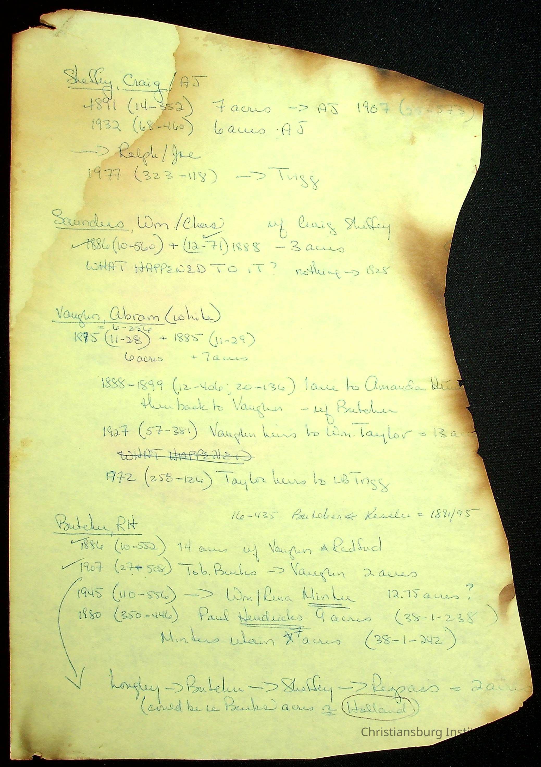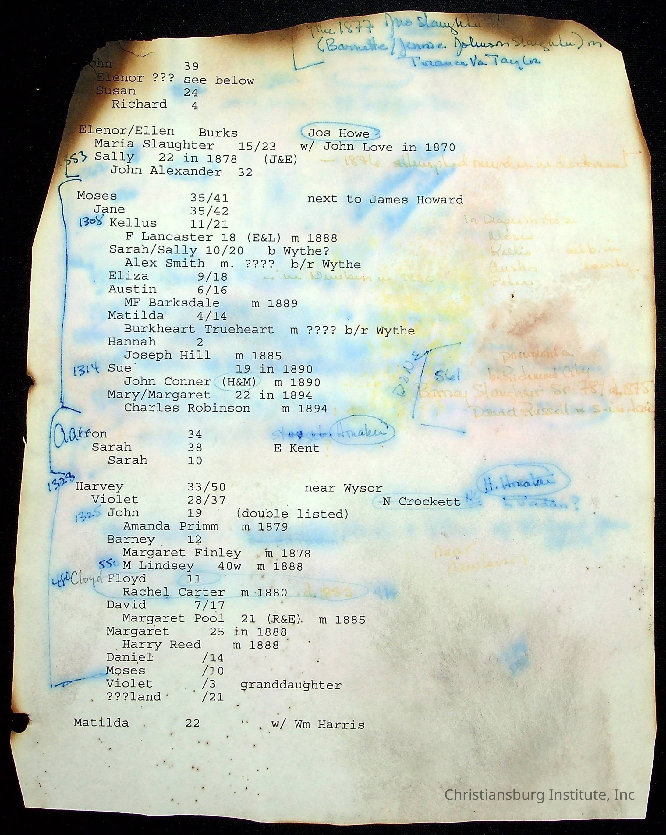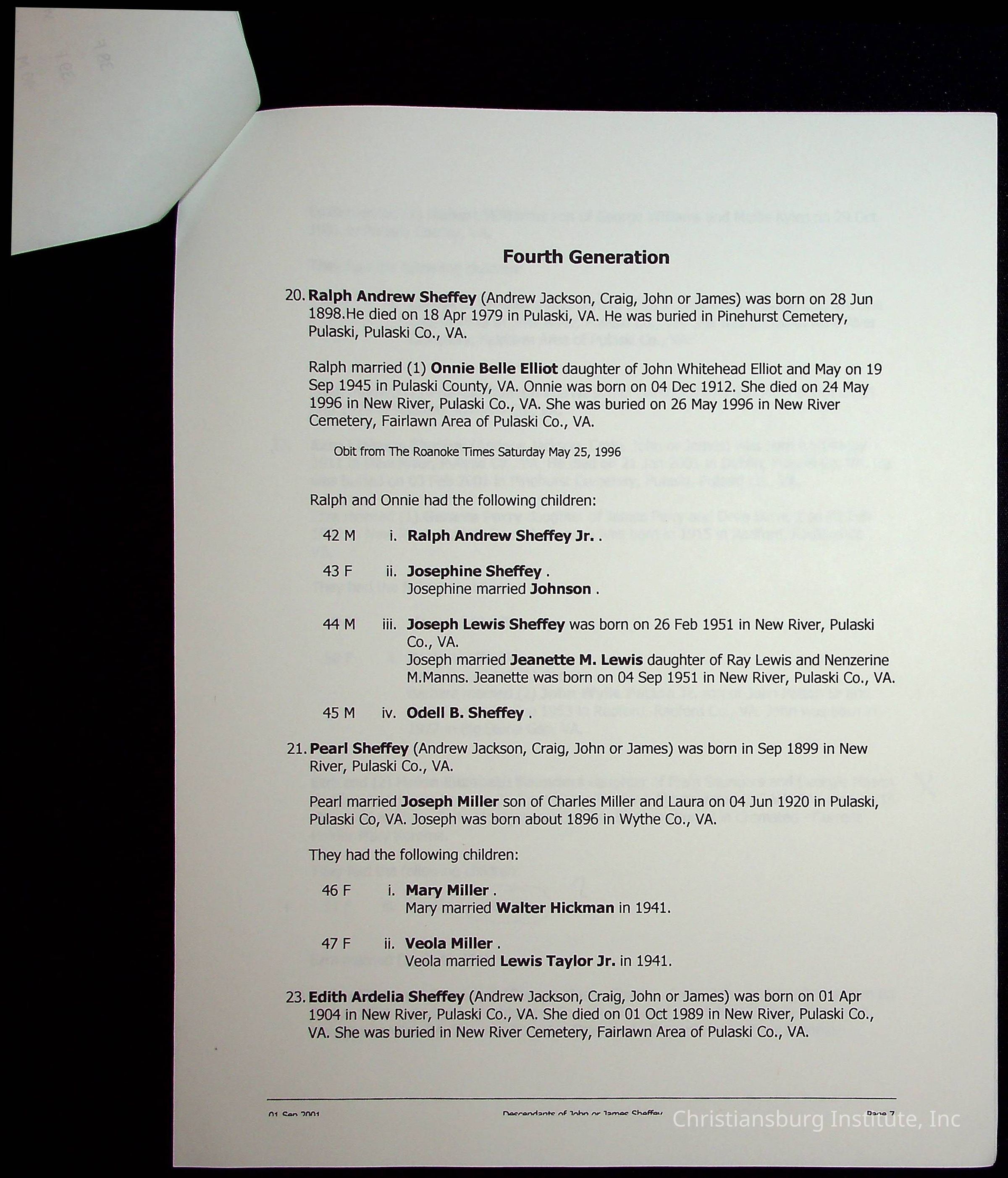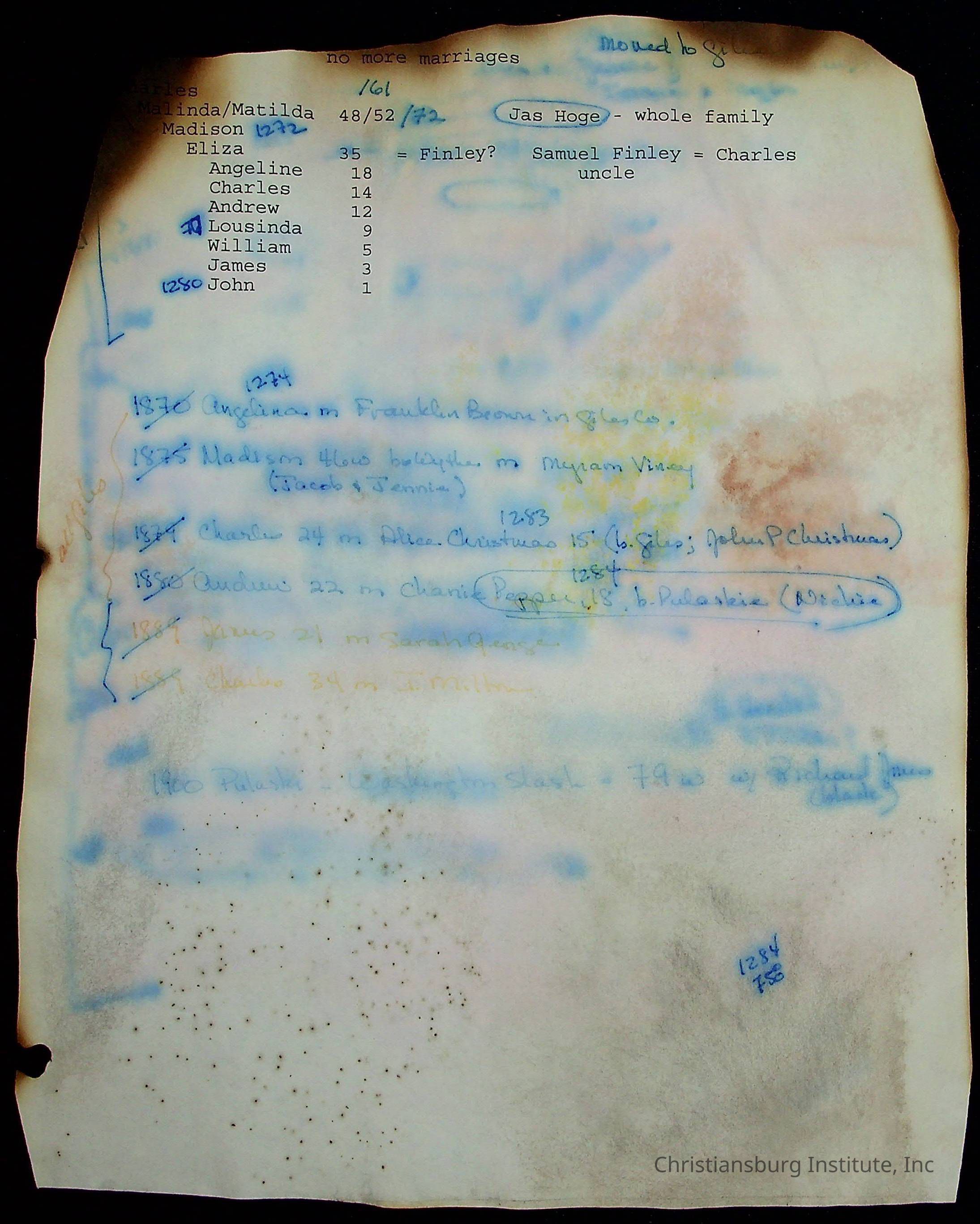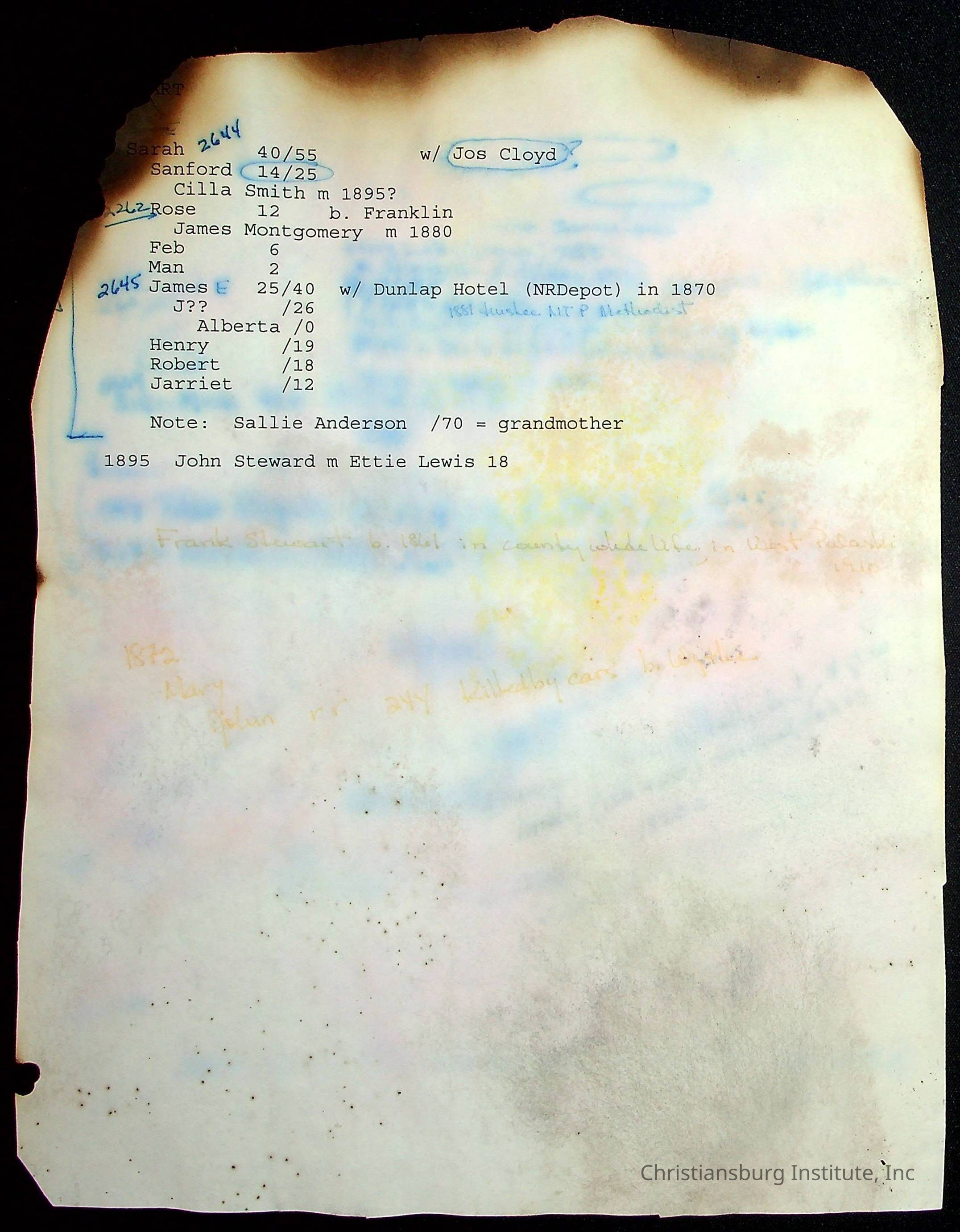 A folder of research materials collected by Radford University professor, Dr Linda Killen. This folder is titled 'R & S & T' and includes Killen's research on the R, S, and T families names of Pulaski County, Virginia. This folder includes genealogy records, marriage licenses, photographs, and census records. Please note: some of the documents have been damaged due to fire.