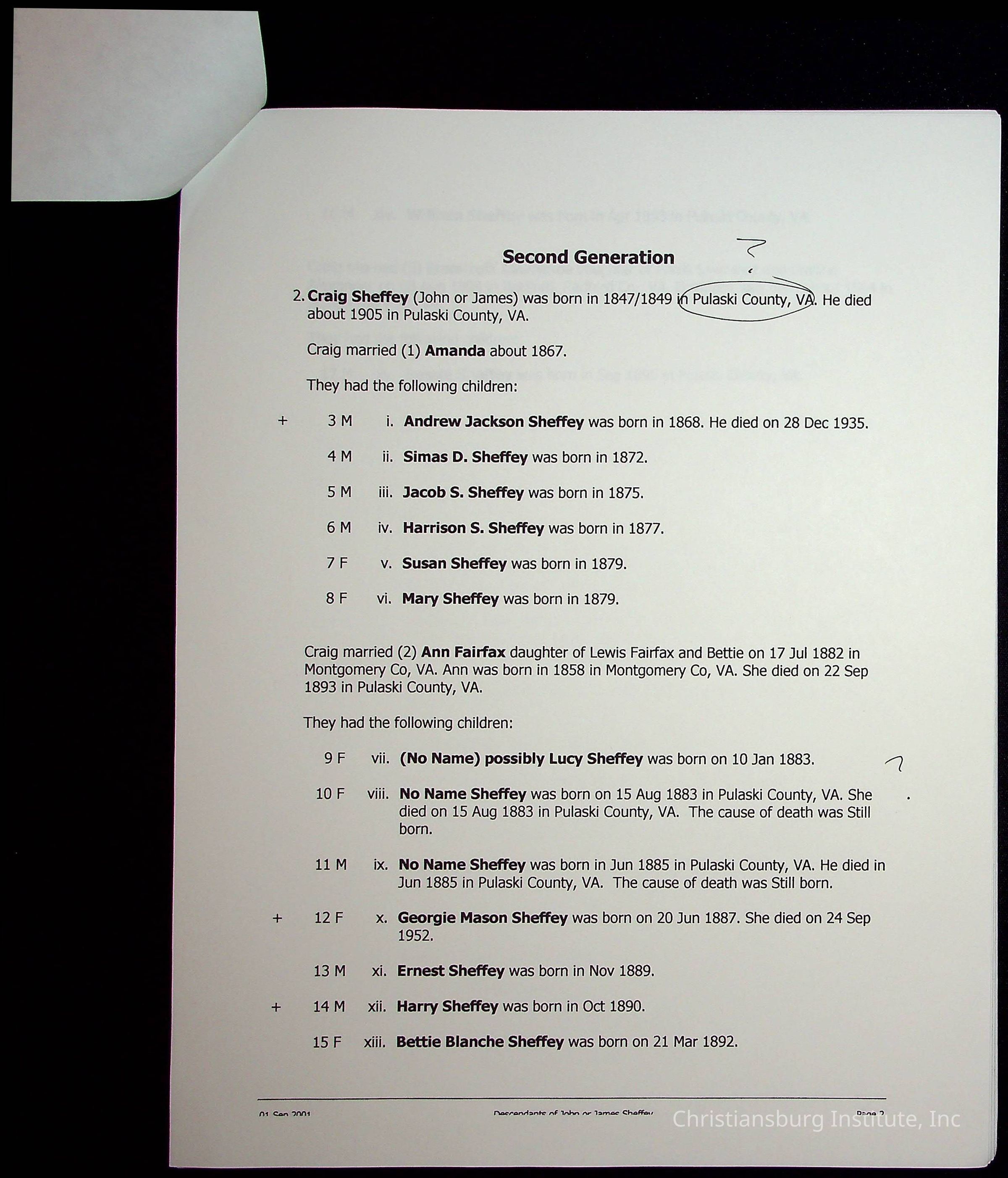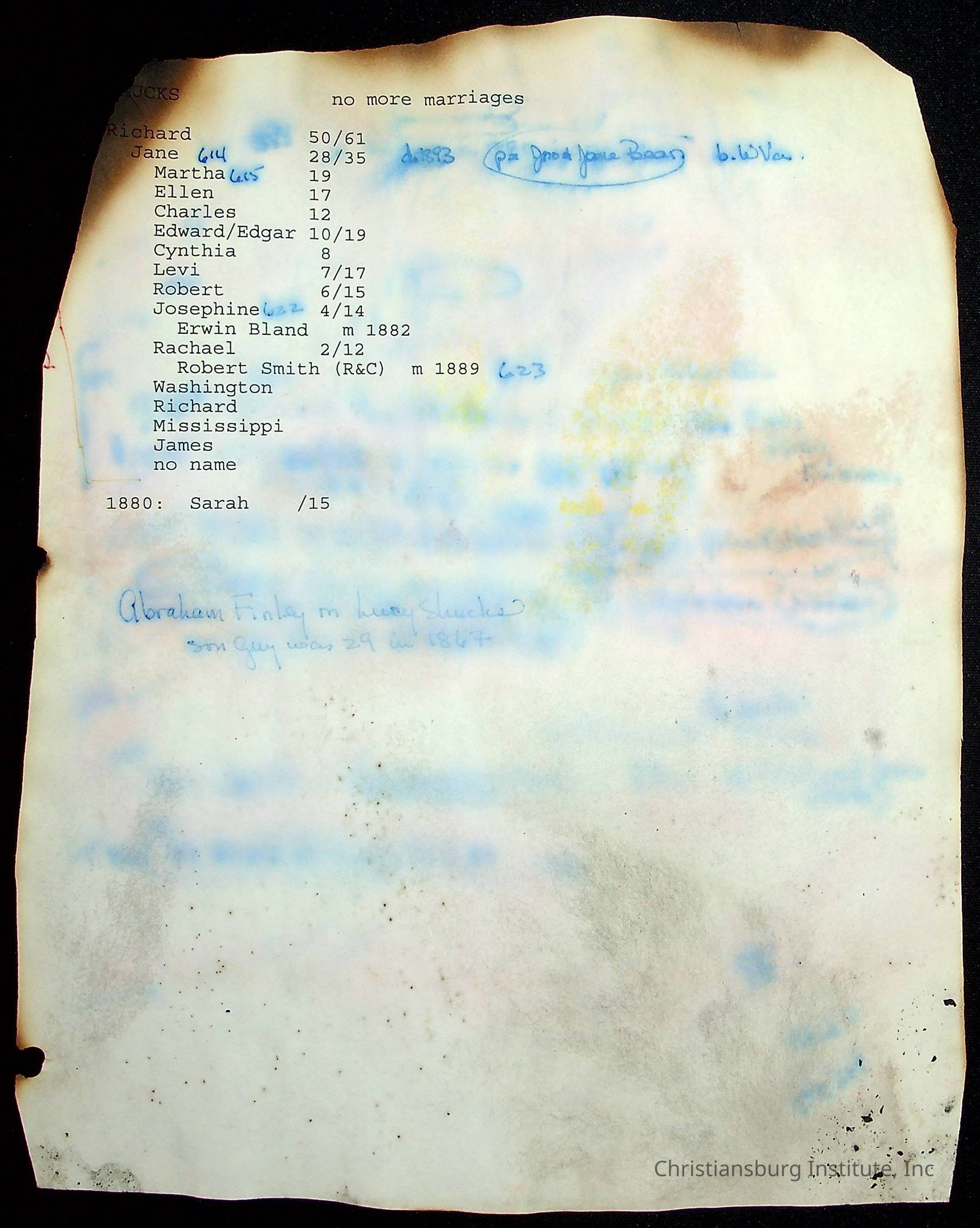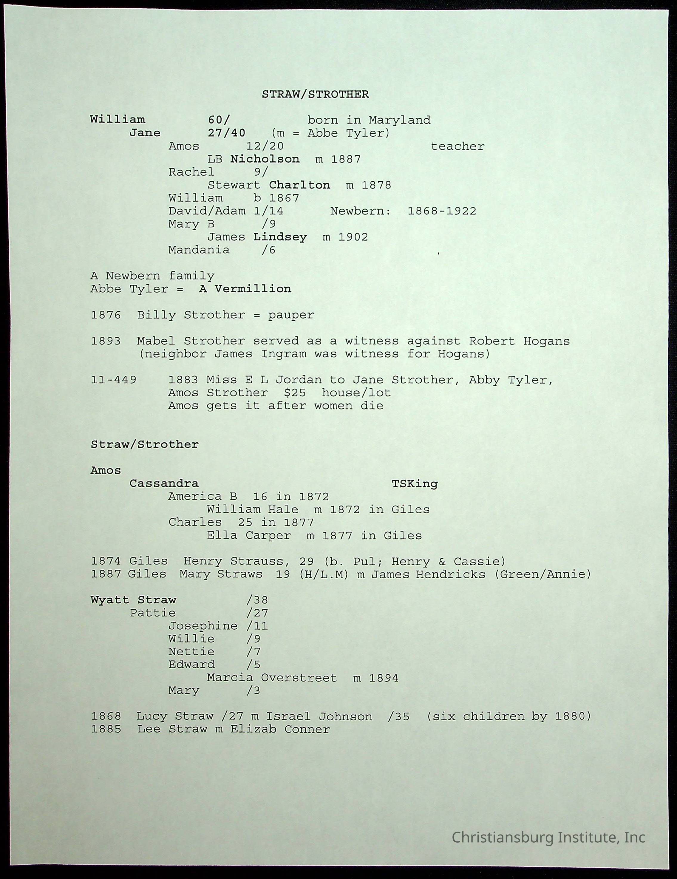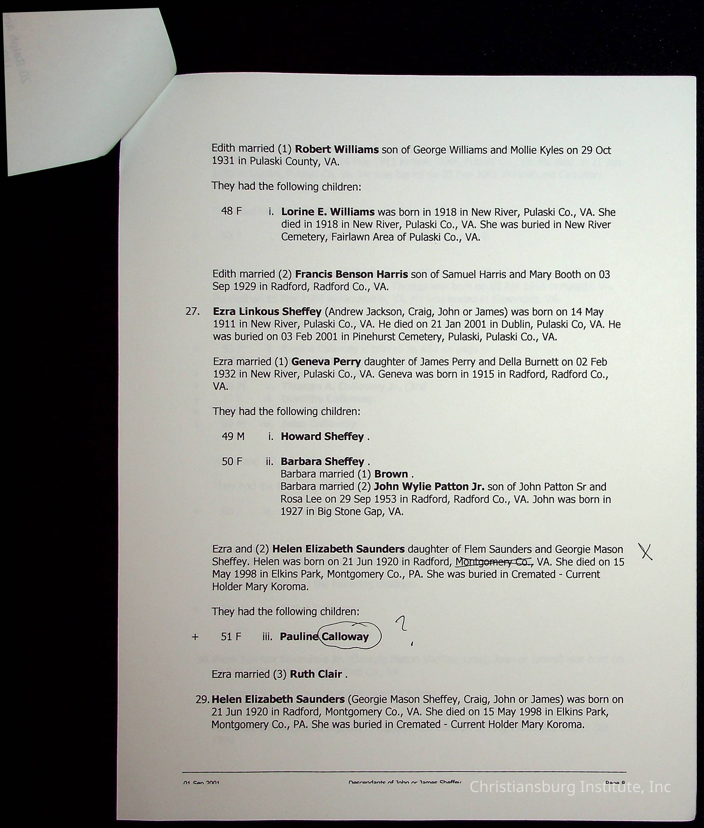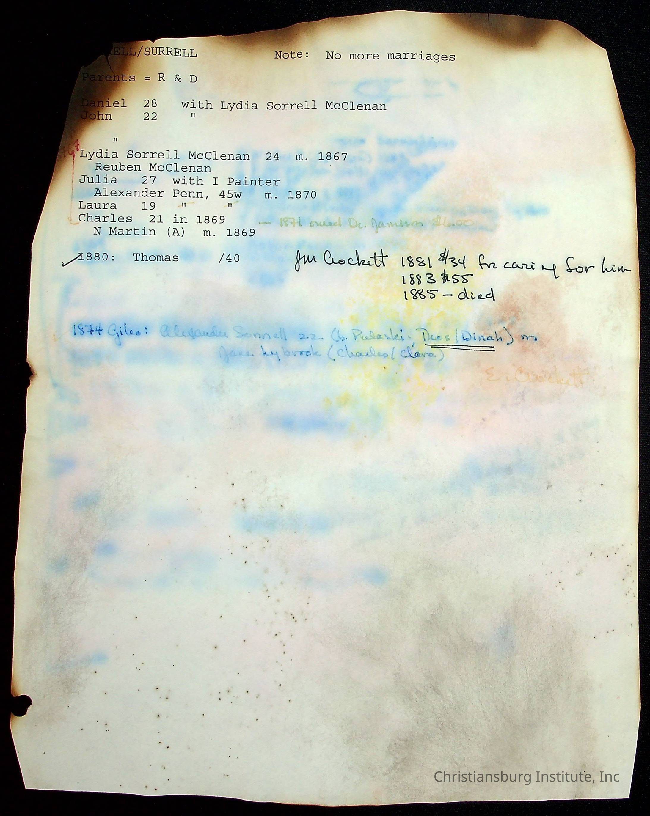 A folder of research materials collected by Radford University professor, Dr Linda Killen. This folder is titled 'R & S & T' and includes Killen's research on the R, S, and T families names of Pulaski County, Virginia. This folder includes genealogy records, marriage licenses, photographs, and census records. Please note: some of the documents have been damaged due to fire.