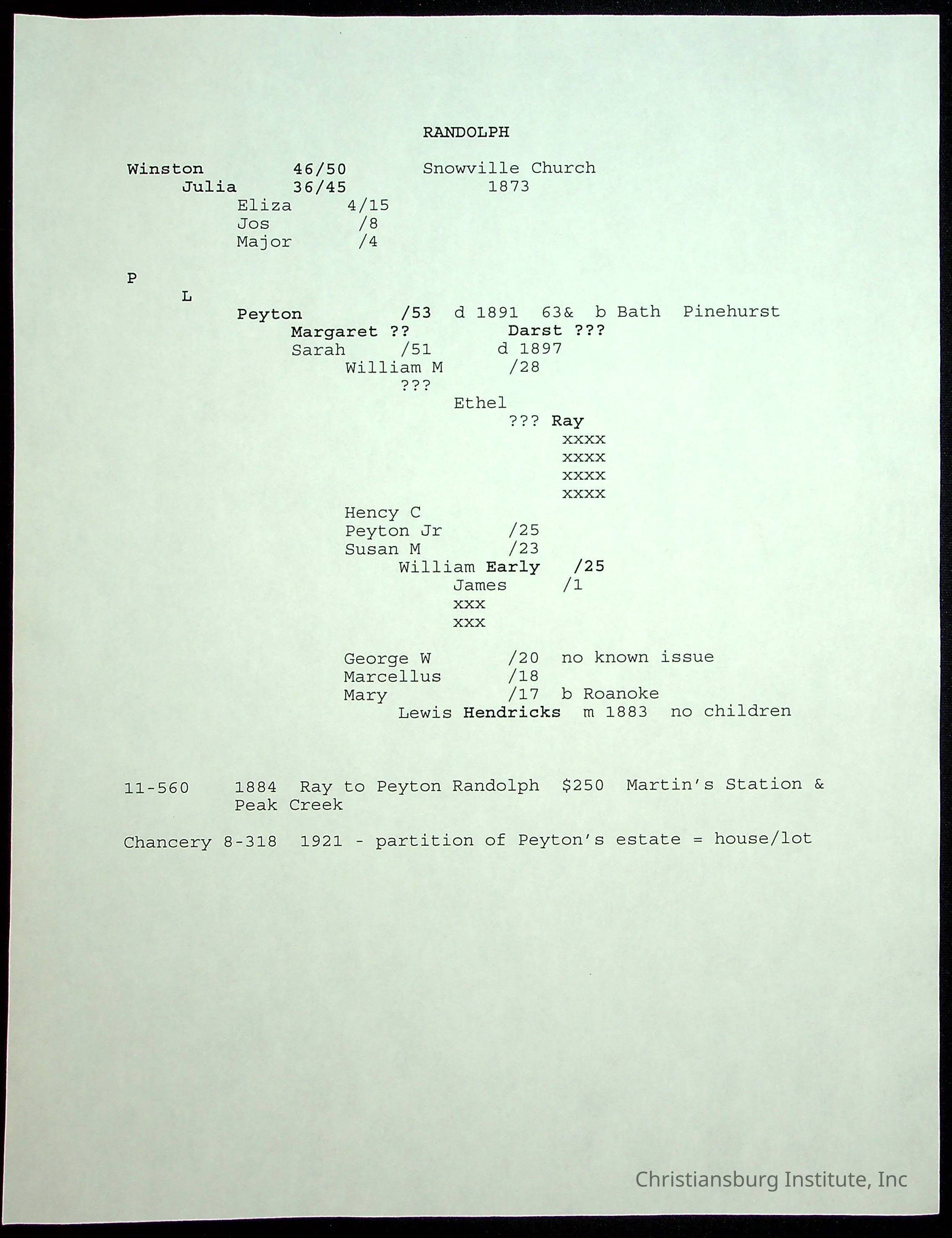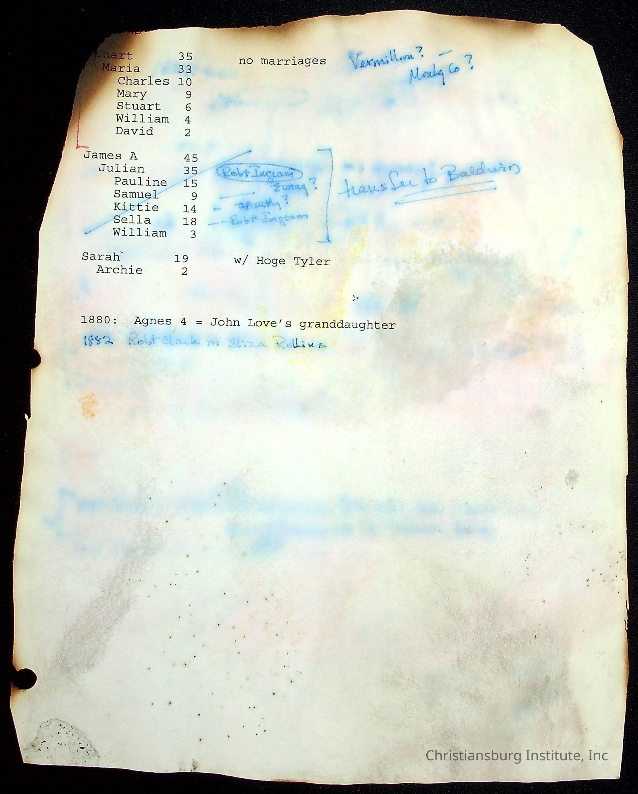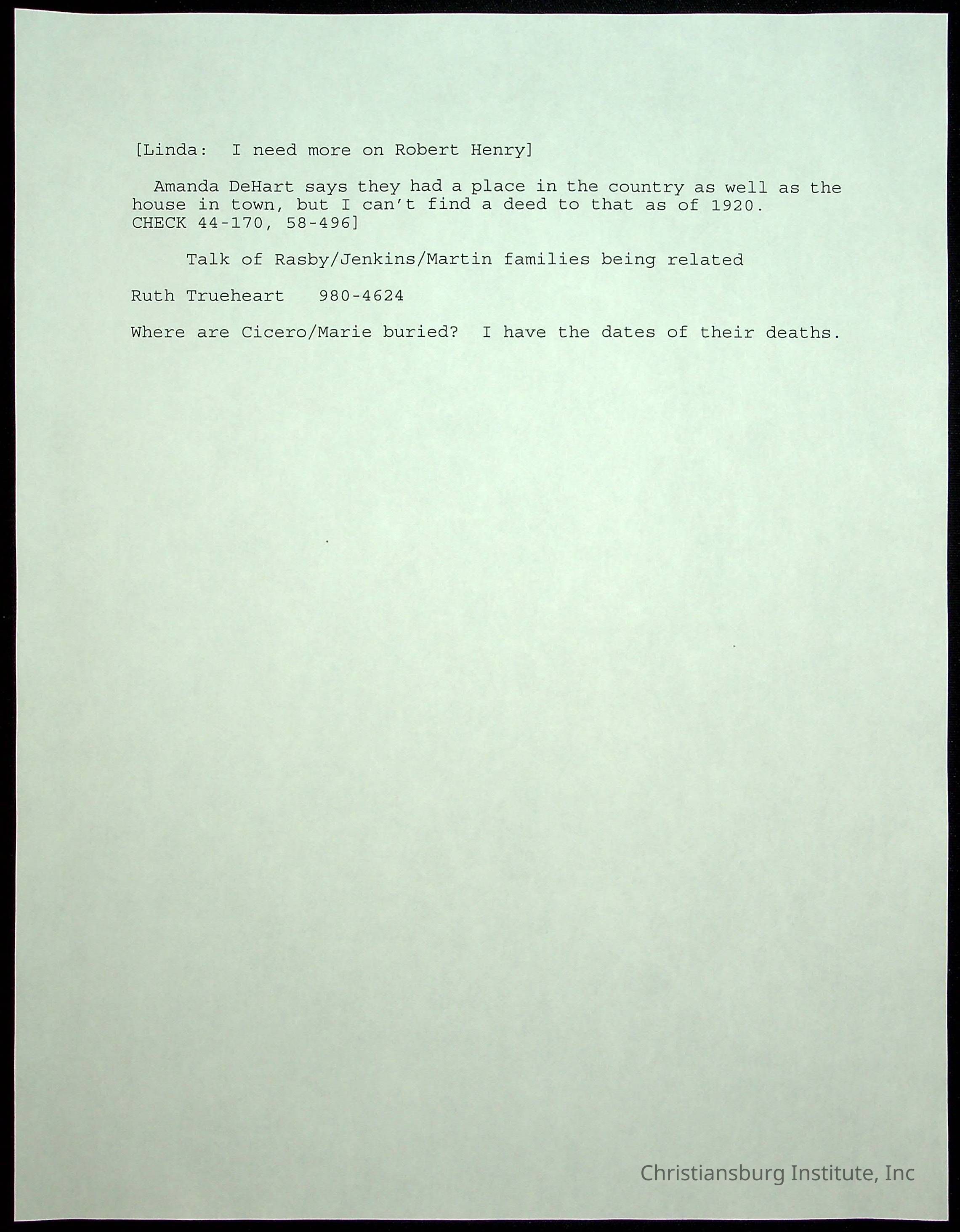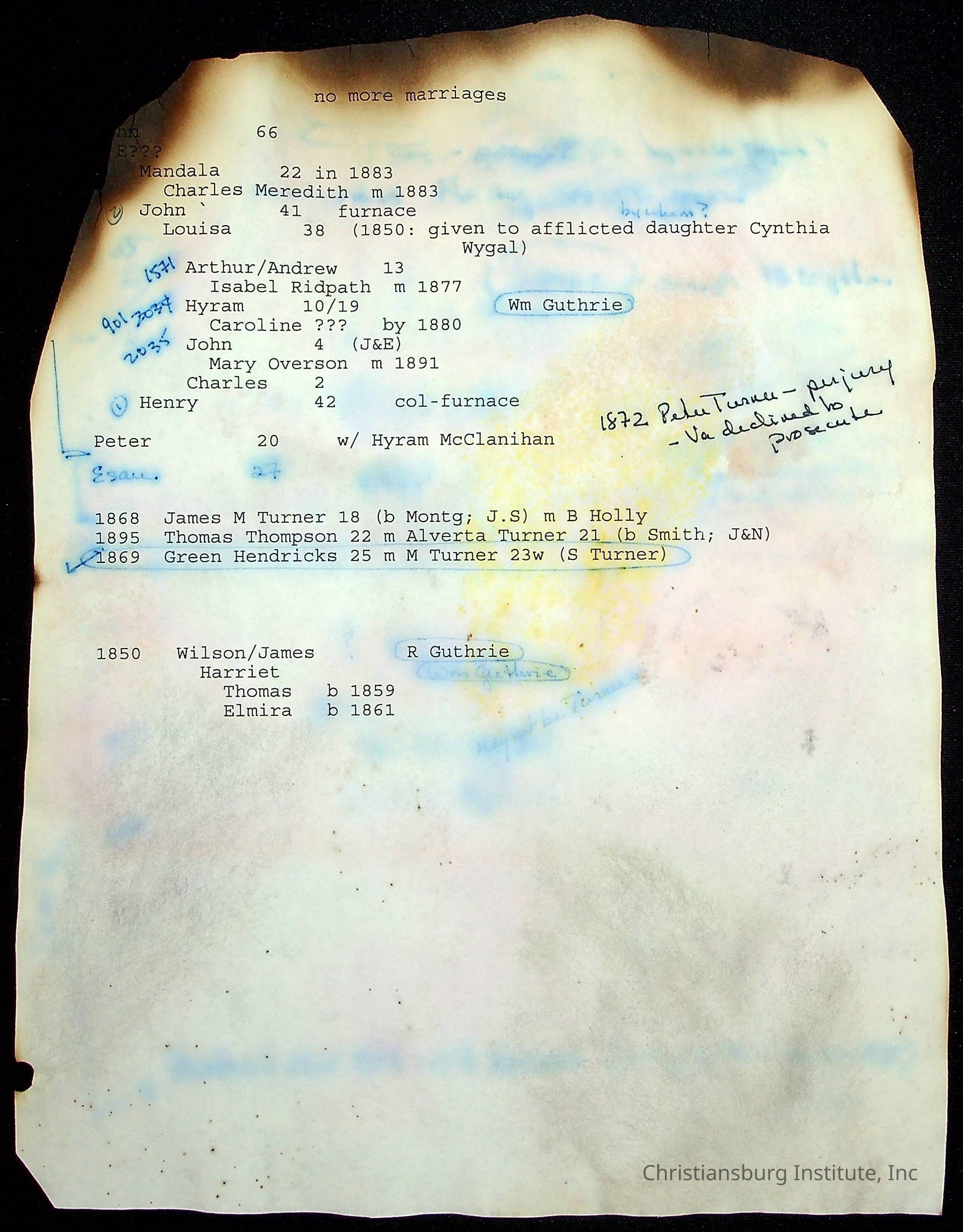 A folder of research materials collected by Radford University professor, Dr Linda Killen. This folder is titled 'R & S & T' and includes Killen's research on the R, S, and T families names of Pulaski County, Virginia. This folder includes genealogy records, marriage licenses, photographs, and census records. Please note: some of the documents have been damaged due to fire.