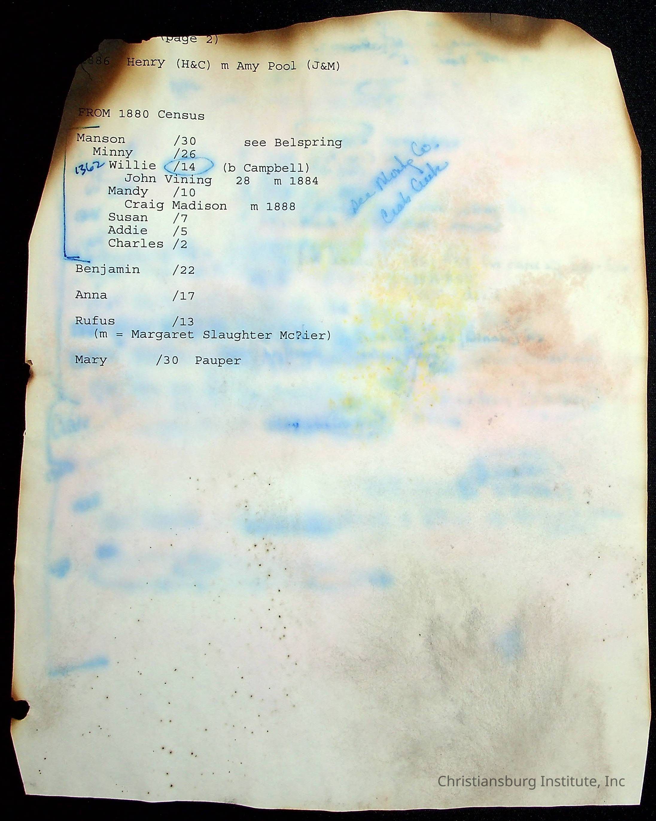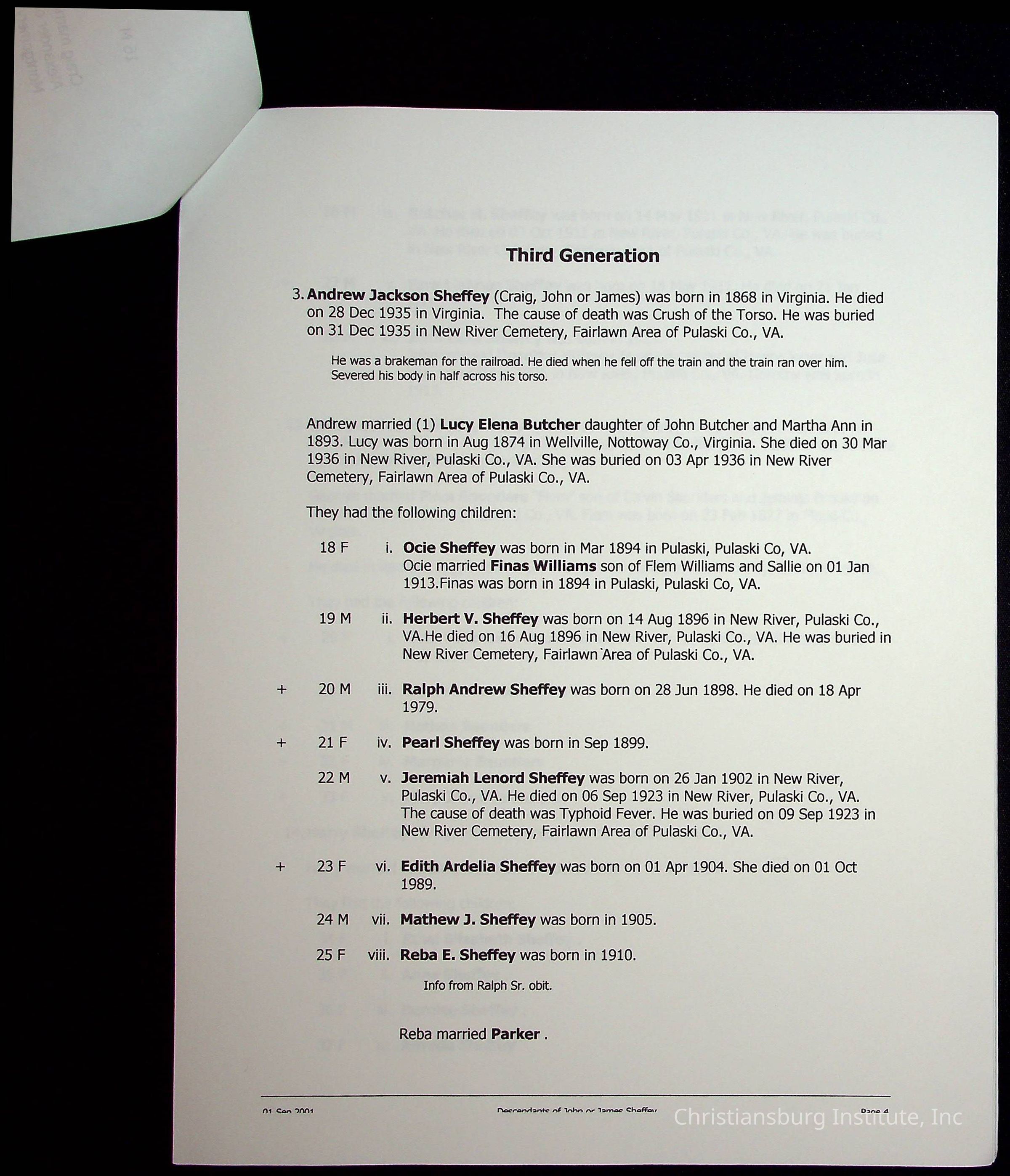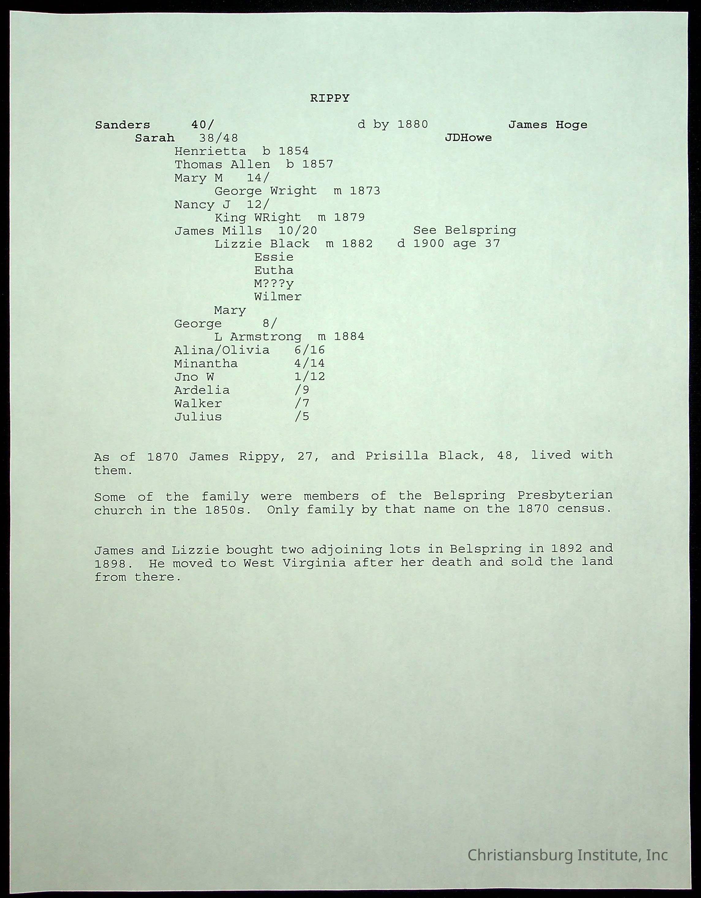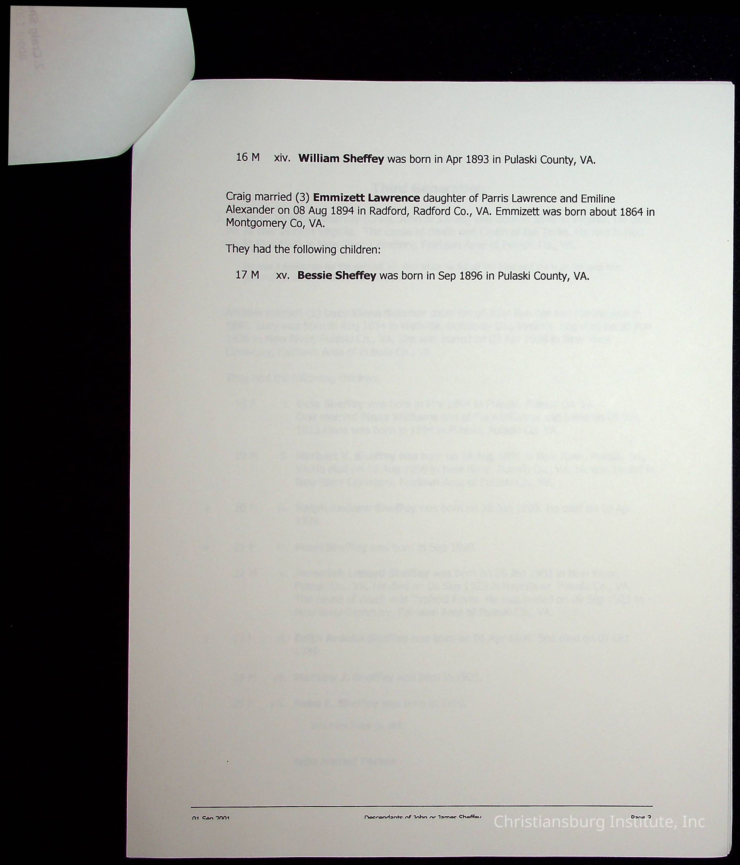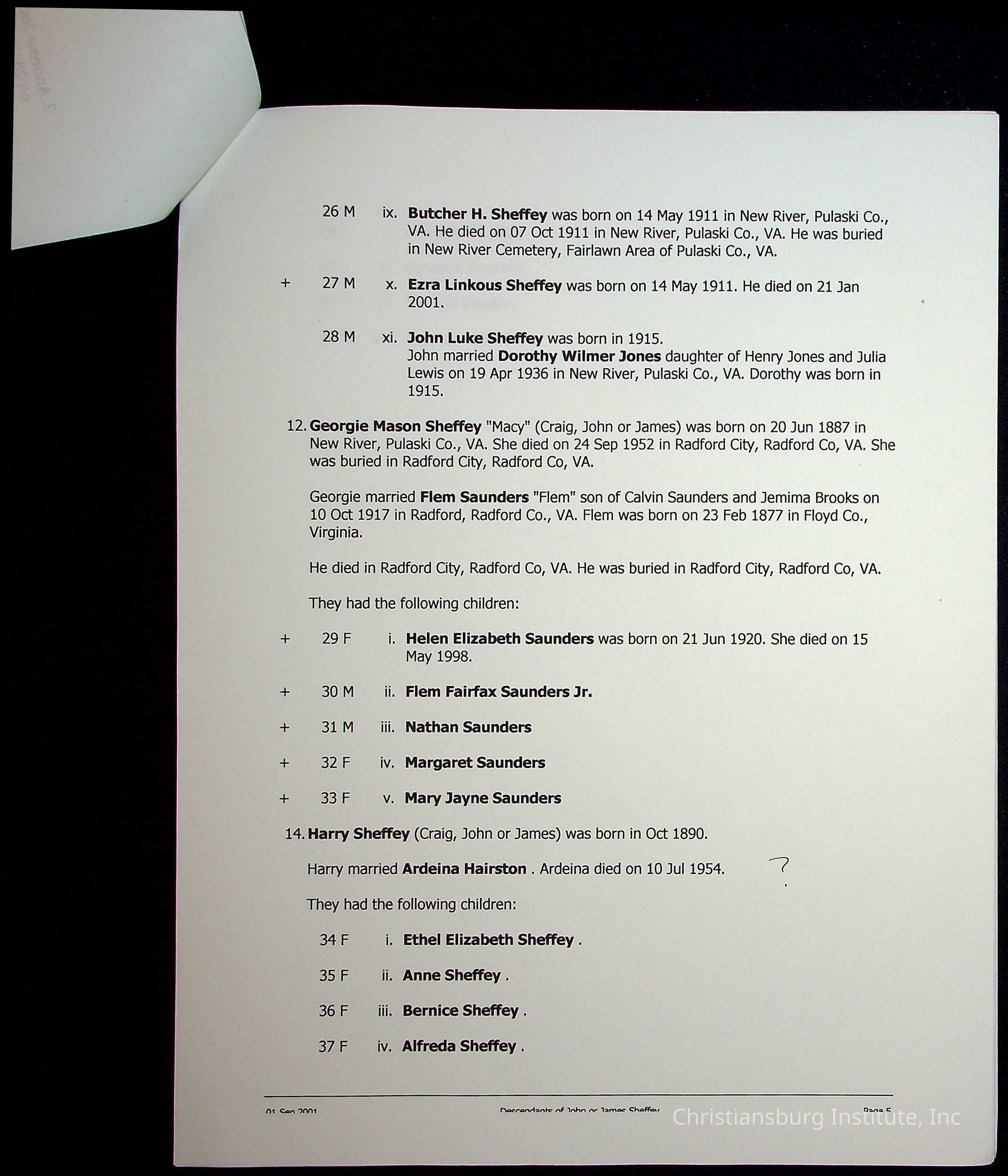 A folder of research materials collected by Radford University professor, Dr Linda Killen. This folder is titled 'R & S & T' and includes Killen's research on the R, S, and T families names of Pulaski County, Virginia. This folder includes genealogy records, marriage licenses, photographs, and census records. Please note: some of the documents have been damaged due to fire.