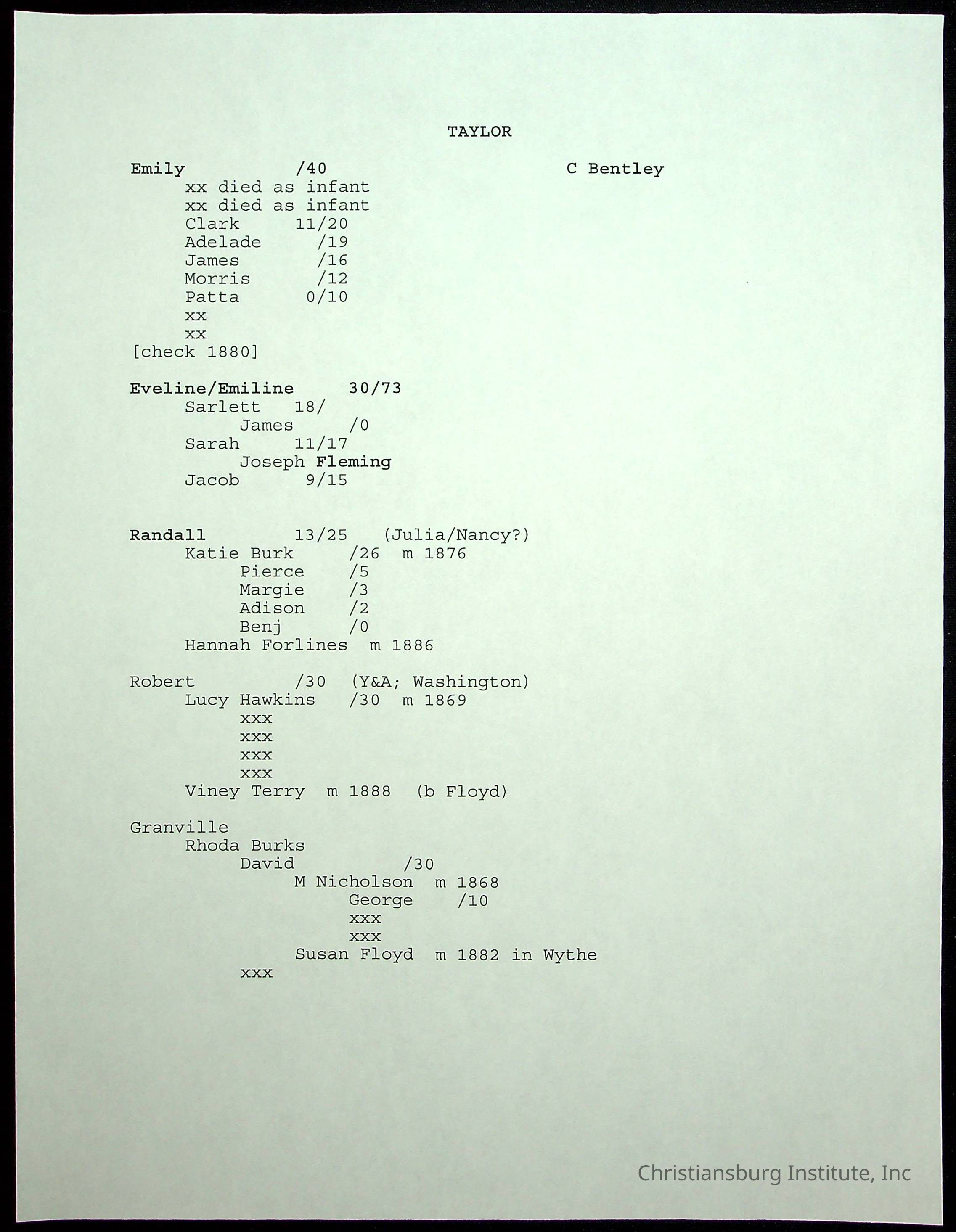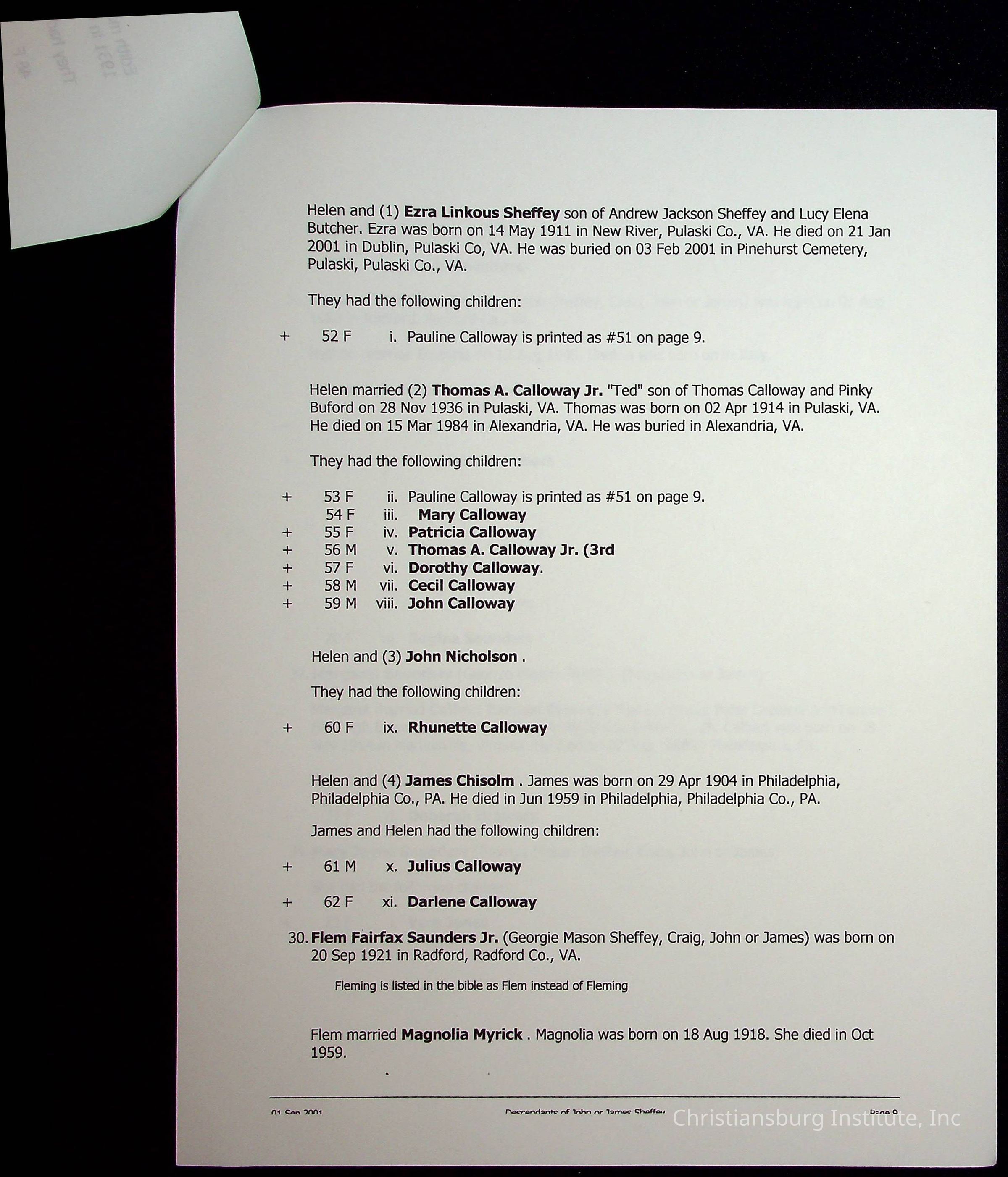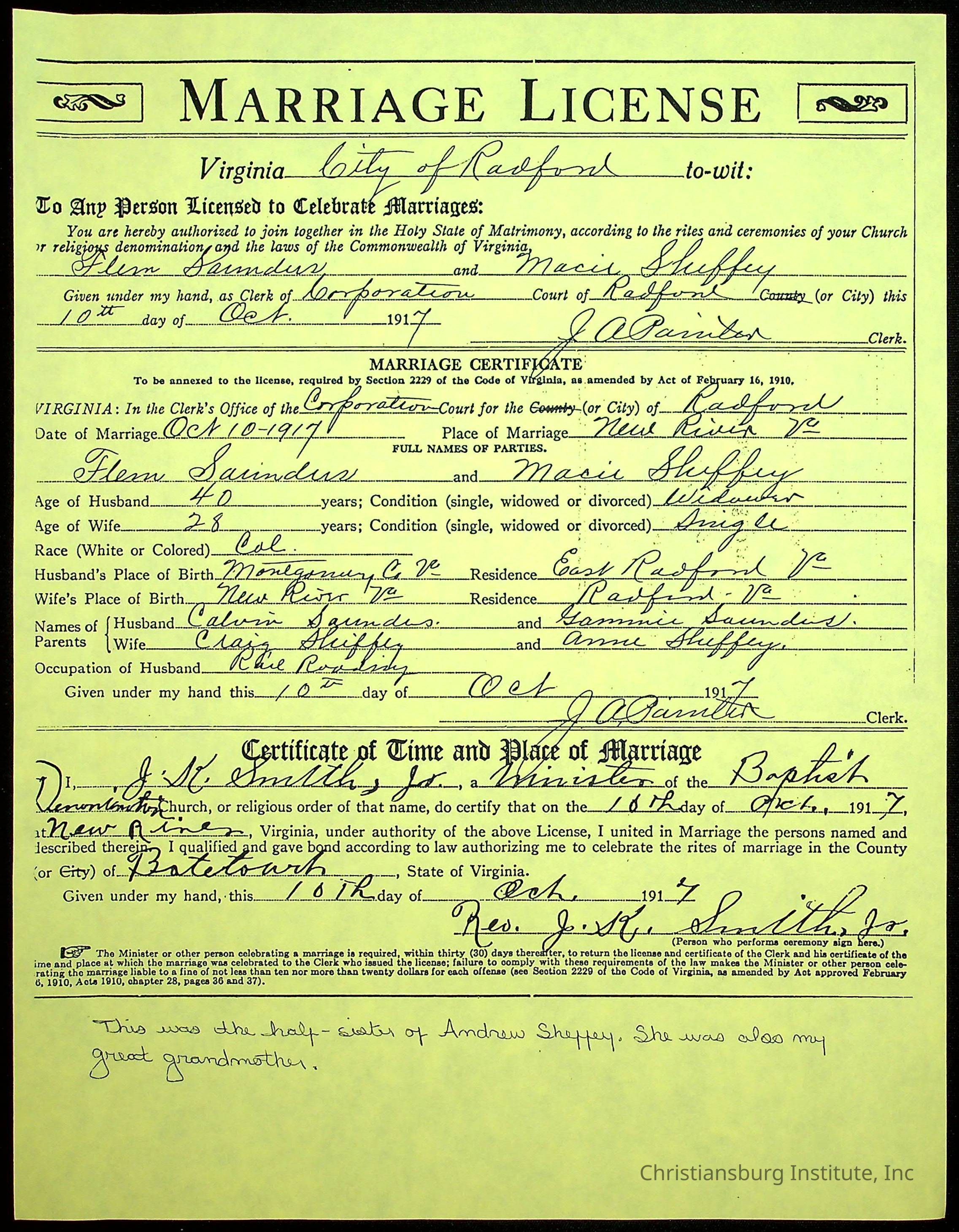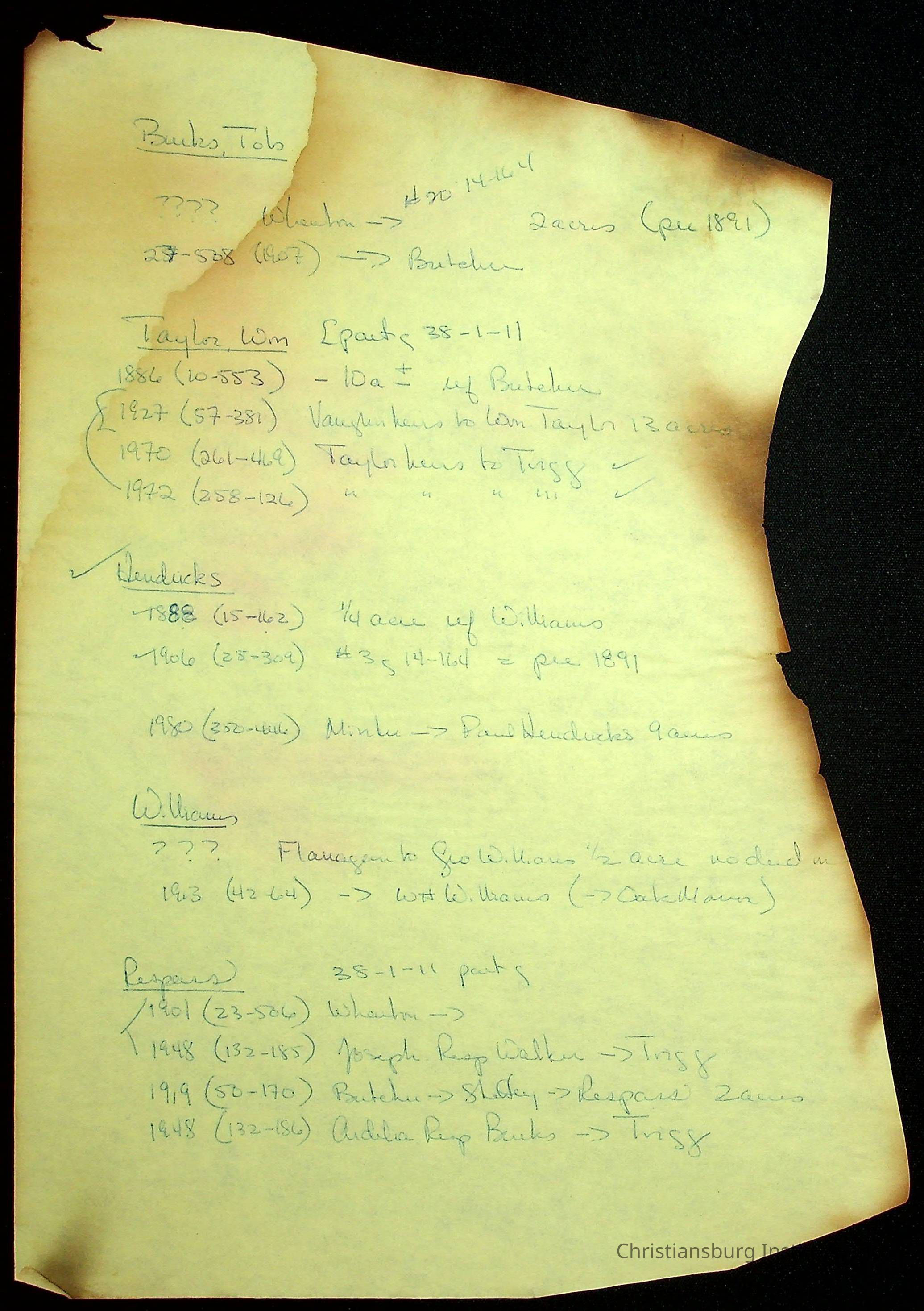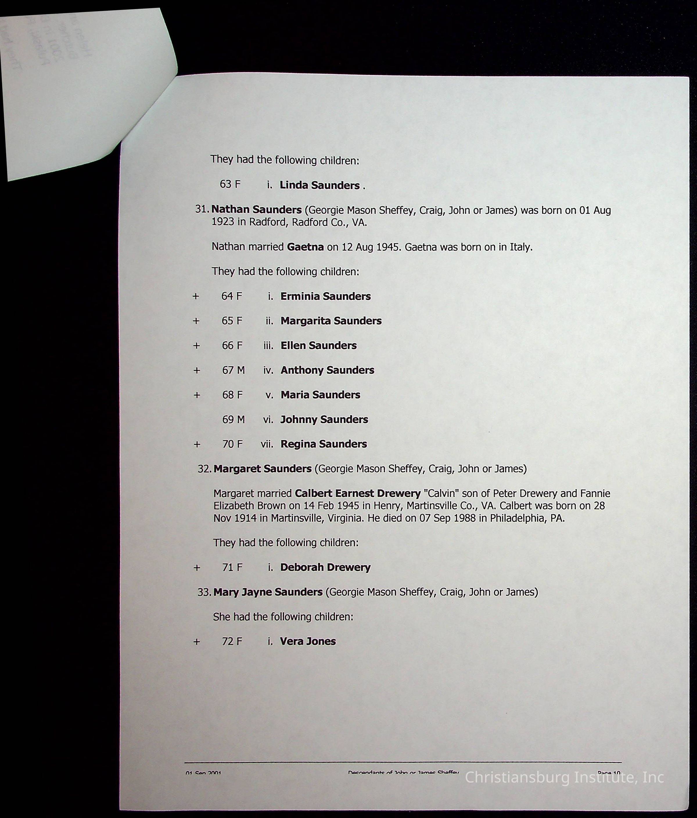 A folder of research materials collected by Radford University professor, Dr Linda Killen. This folder is titled 'R & S & T' and includes Killen's research on the R, S, and T families names of Pulaski County, Virginia. This folder includes genealogy records, marriage licenses, photographs, and census records. Please note: some of the documents have been damaged due to fire.