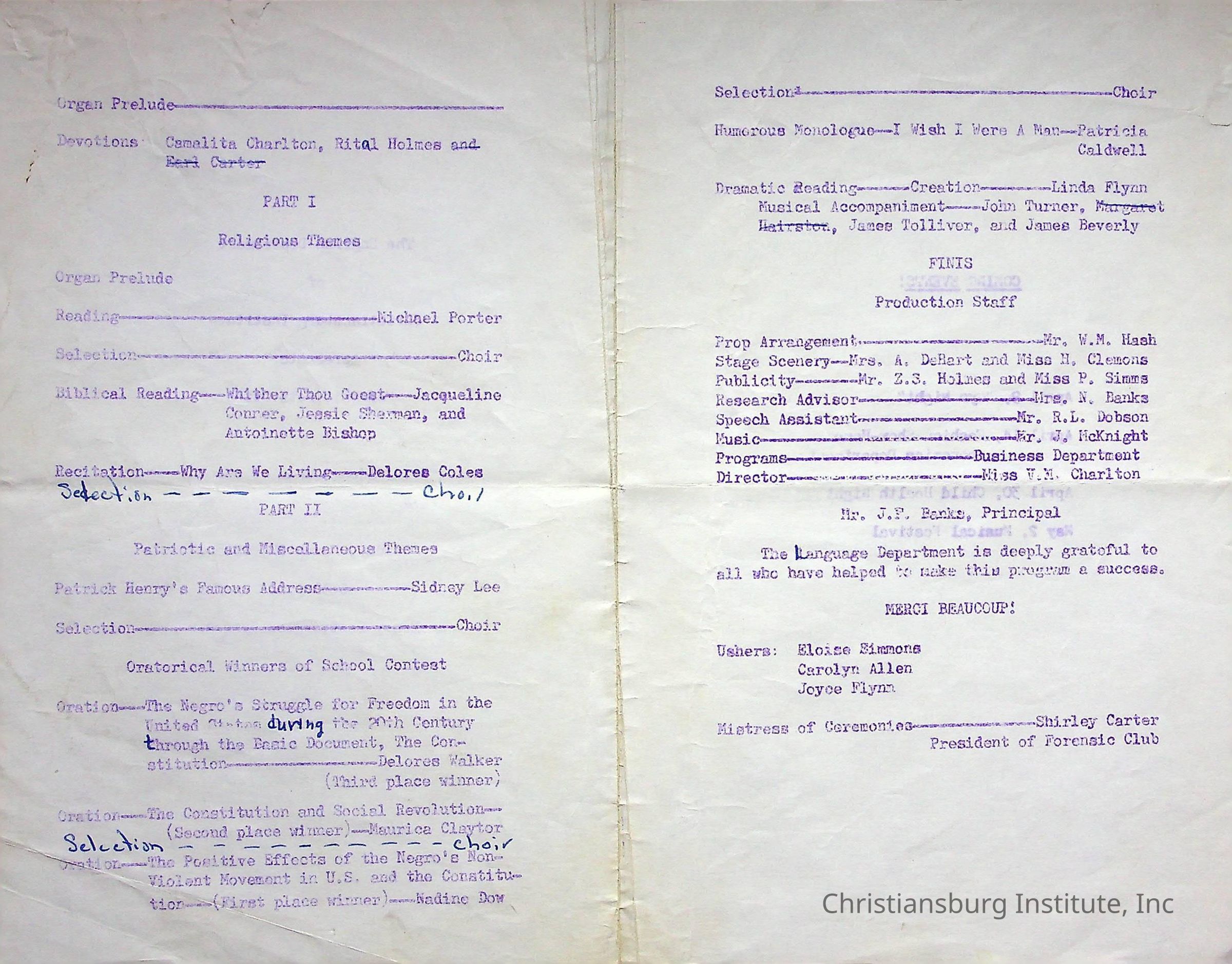 Copyright has been assigned to Christiansburg Institute Museum & Archives by Evelyn Young. For permission to publish materials created by the donor, contact CIMA@christiansburginstitute.com. Materials not created by Evelyn Young may still be under copyright.