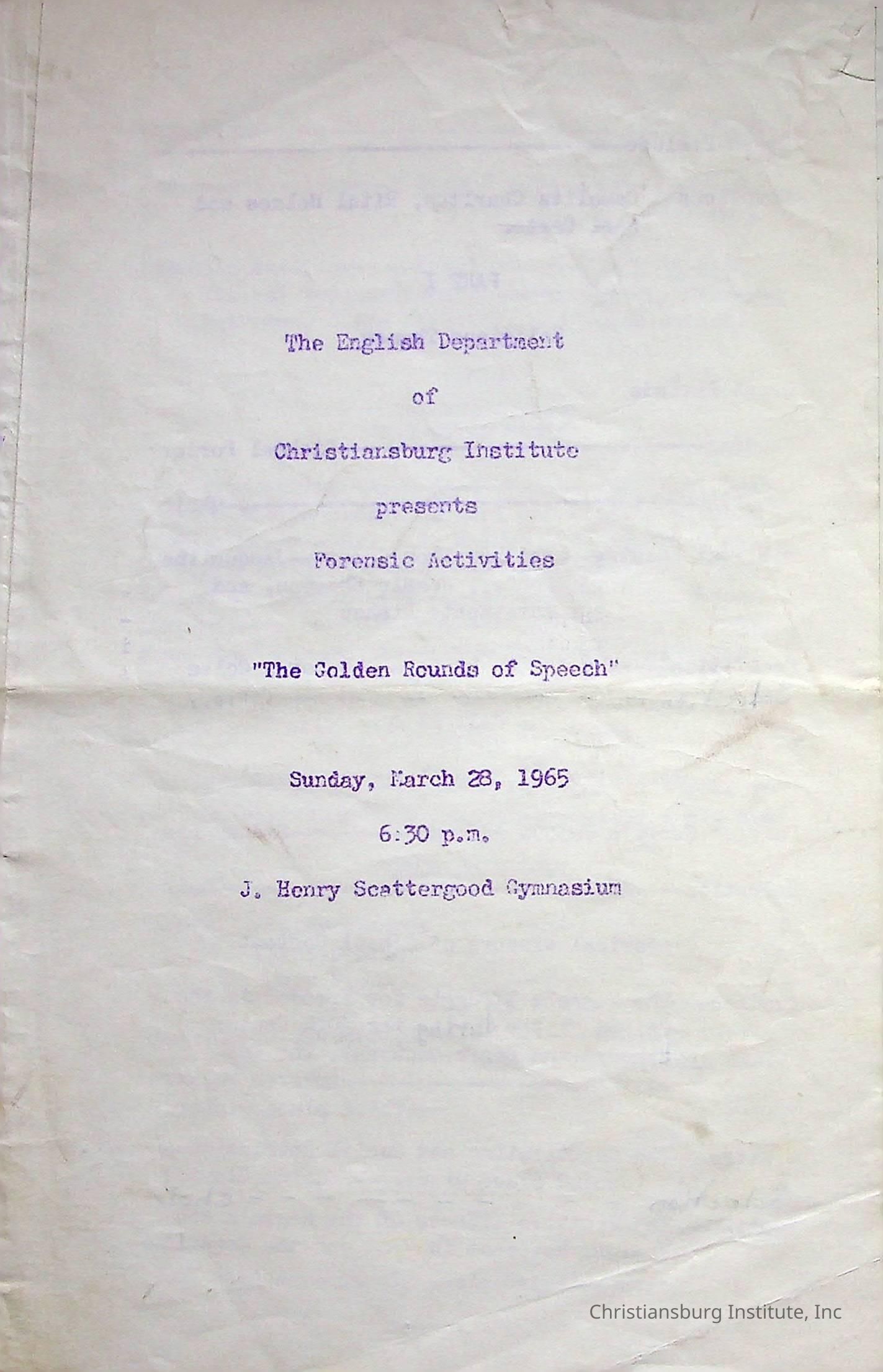 A program for Forensic Activities "The Golden Rounds of Speech" that took place at Christiansburg Institute on Sunday, March 28th, 1965 at 6:30pm in the J. Henry Scattergood Gymnasium.Collection