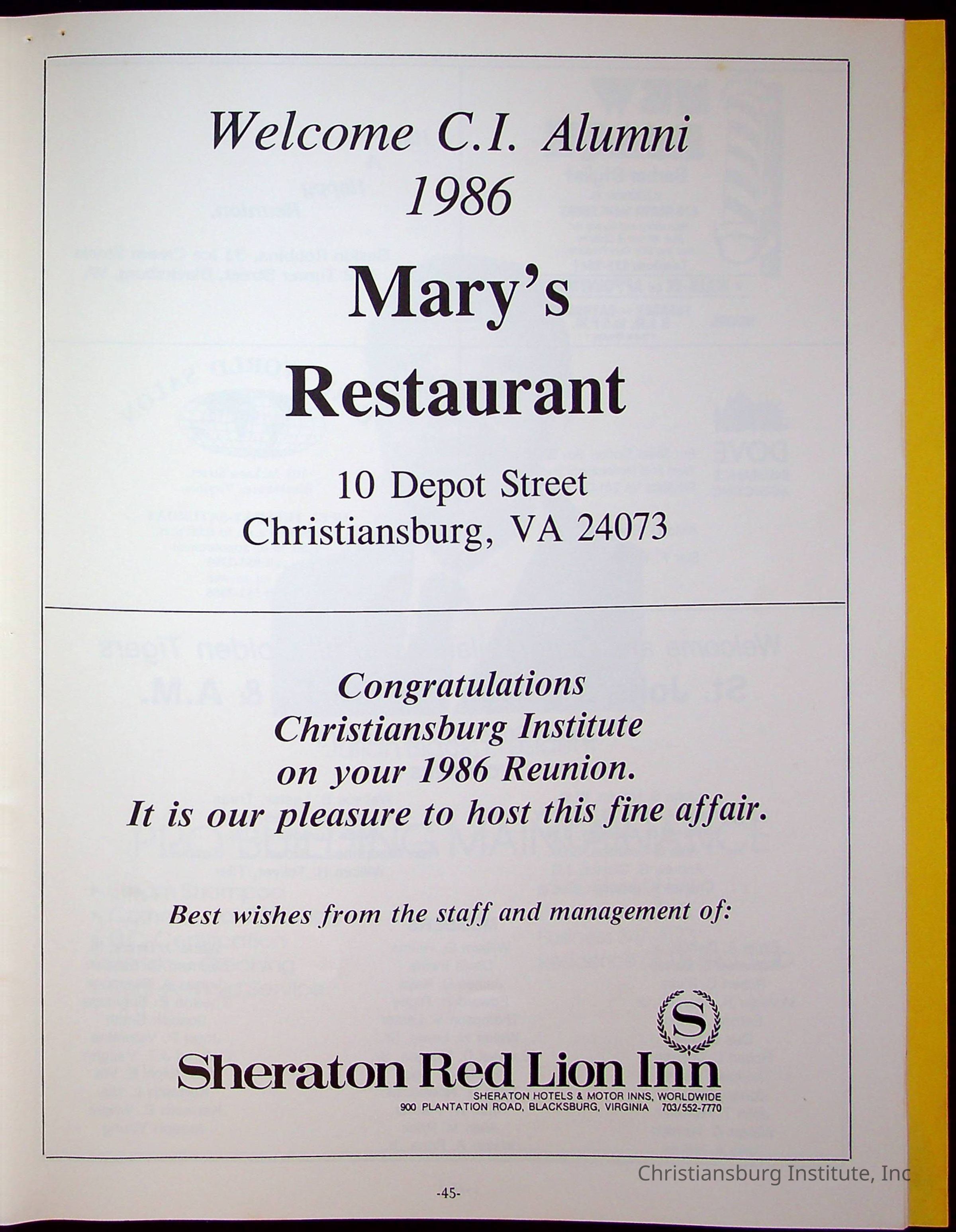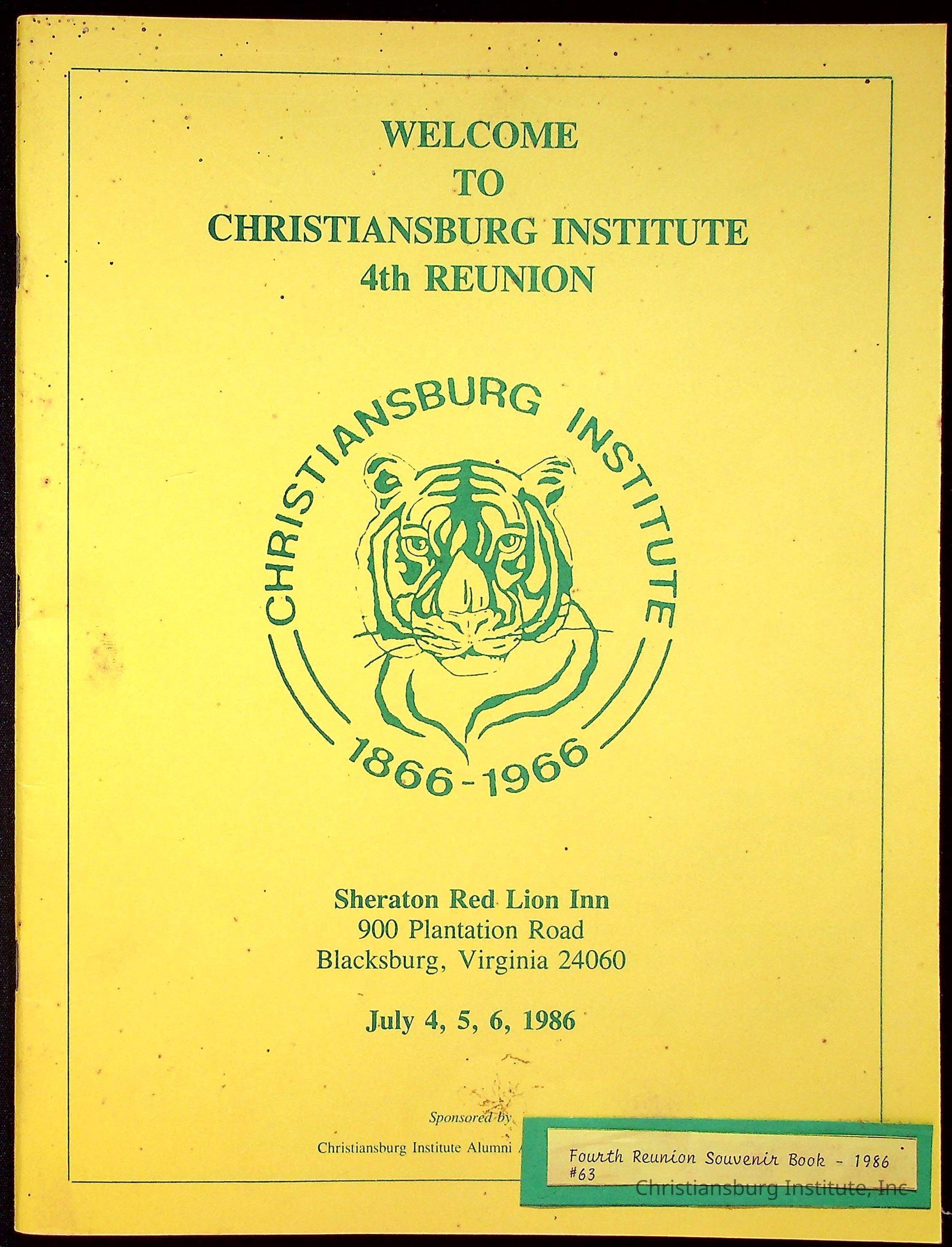The official program booklet for the fourth Christiansburg Institute reunion on July 4th-6th 1986 that took place at the Sheraton Red Lion Inn in Blacksburg, Virginia.Collection