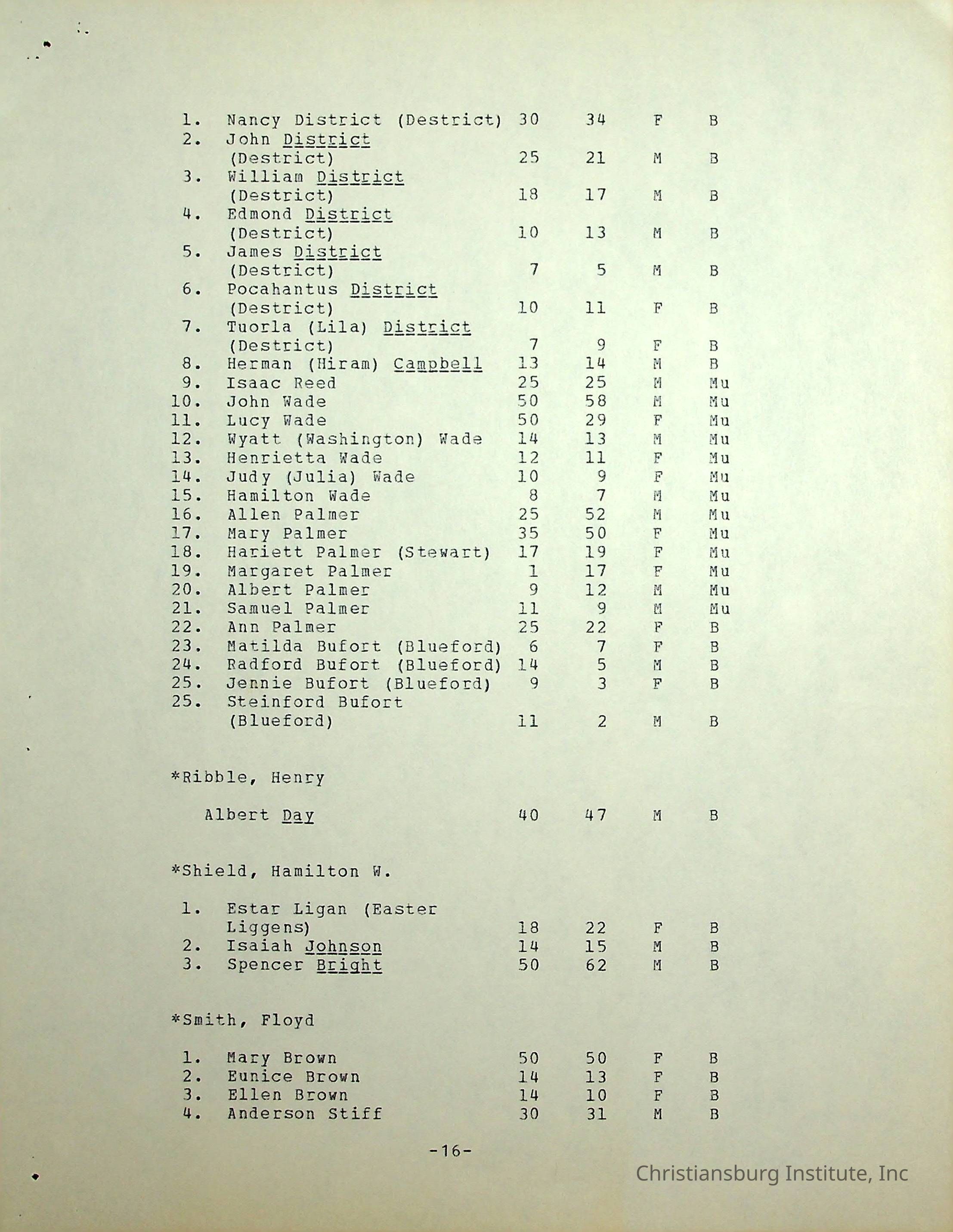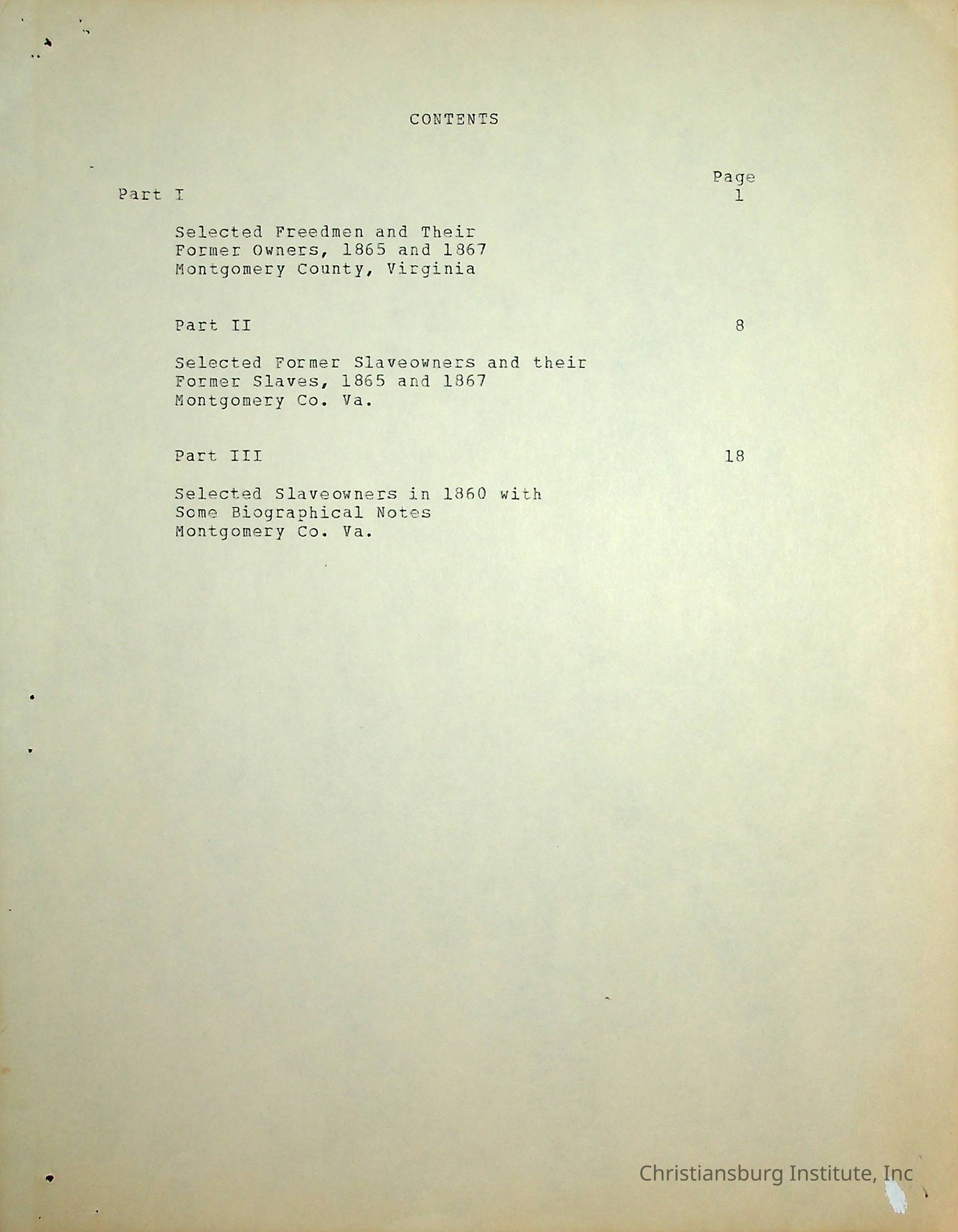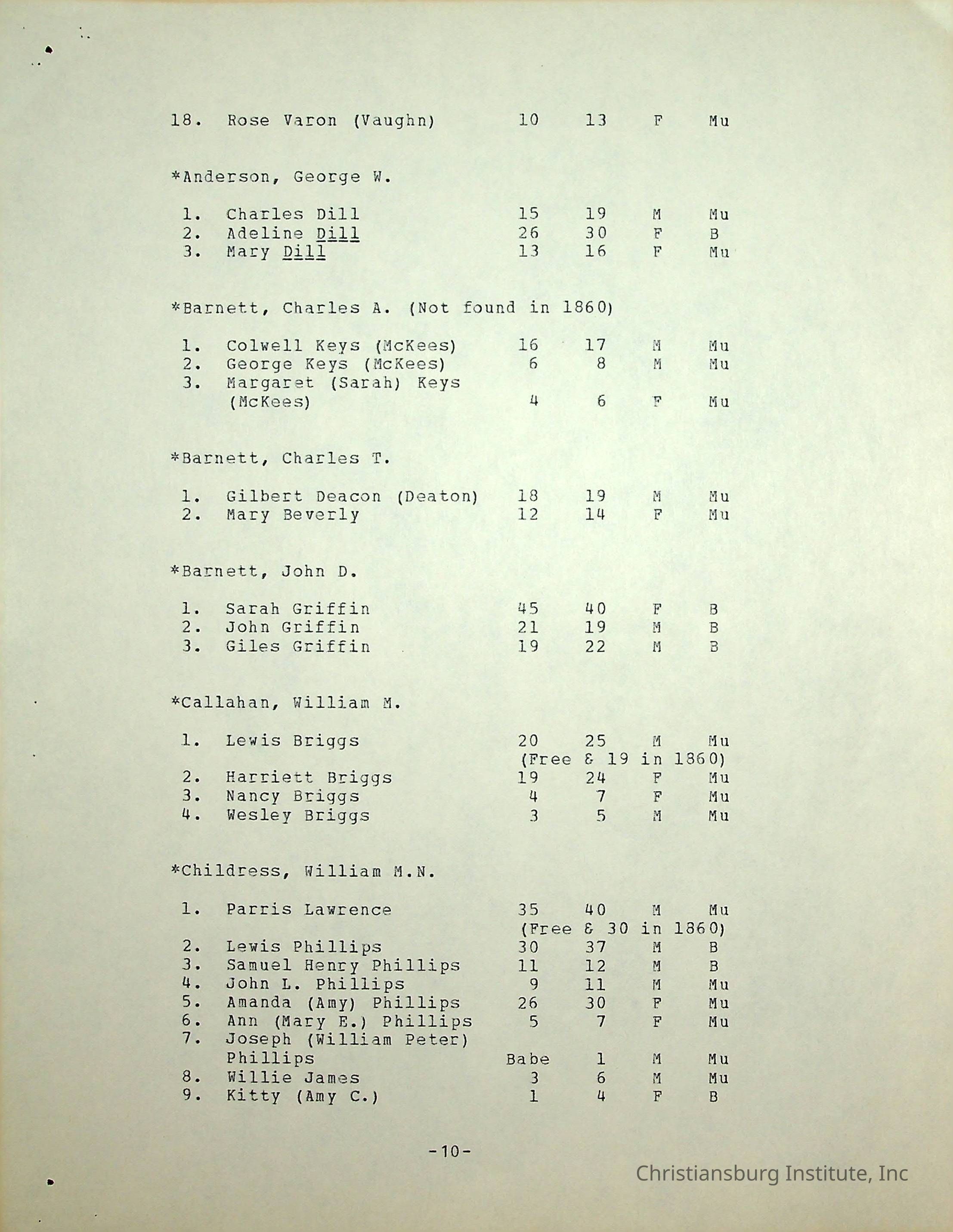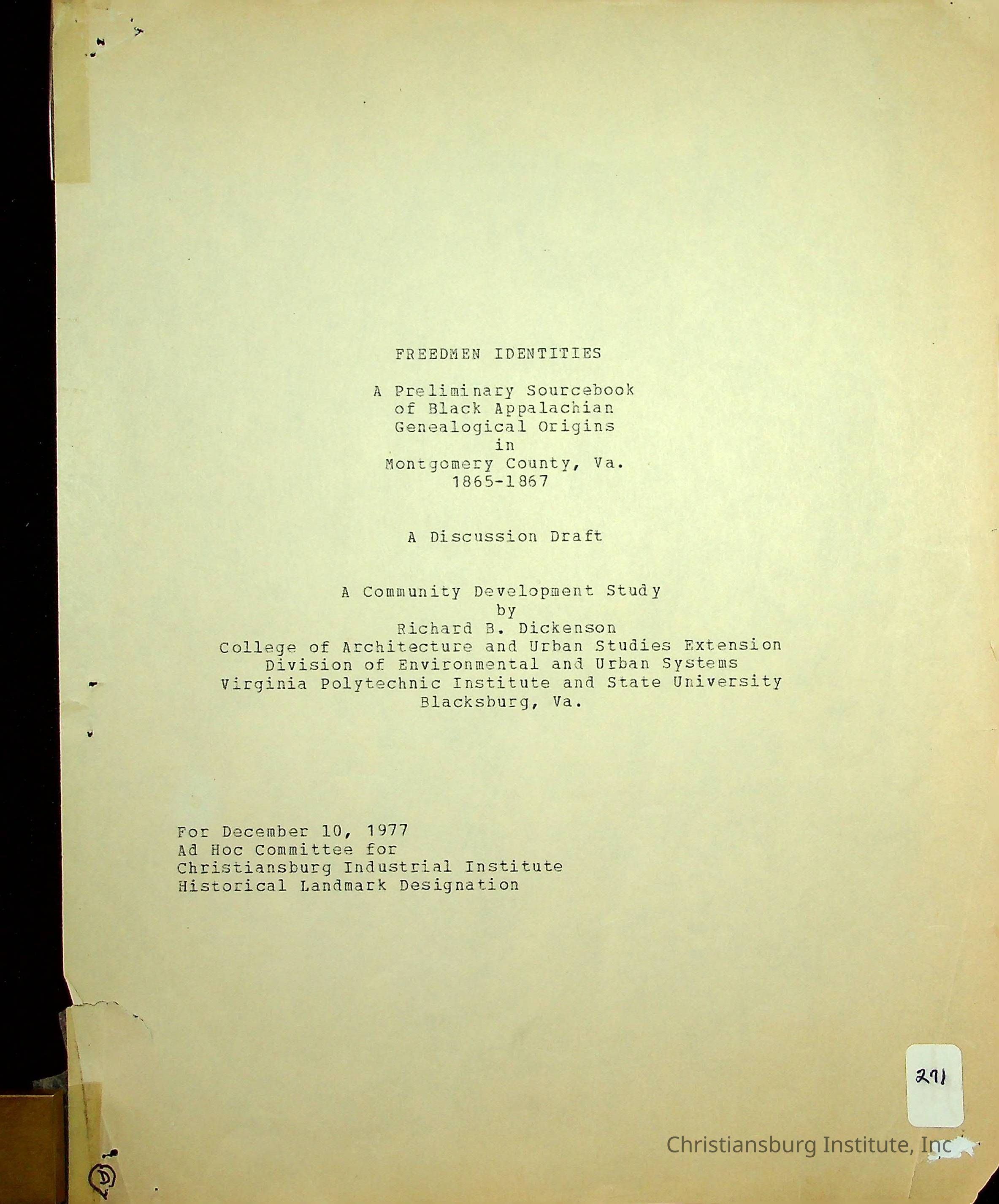 The "Freedmen Identifiers," a discussion draft of a community development study by Richard B. Dickenson for the Ad Hoc Committee for Christiansburg Industrial Institute Historical Landmark Designation, dated December 10th, 1977. This paper contains names, ages, and owners of enslaved peoples in Montgomery County, Virginia from the 1860s.Collection