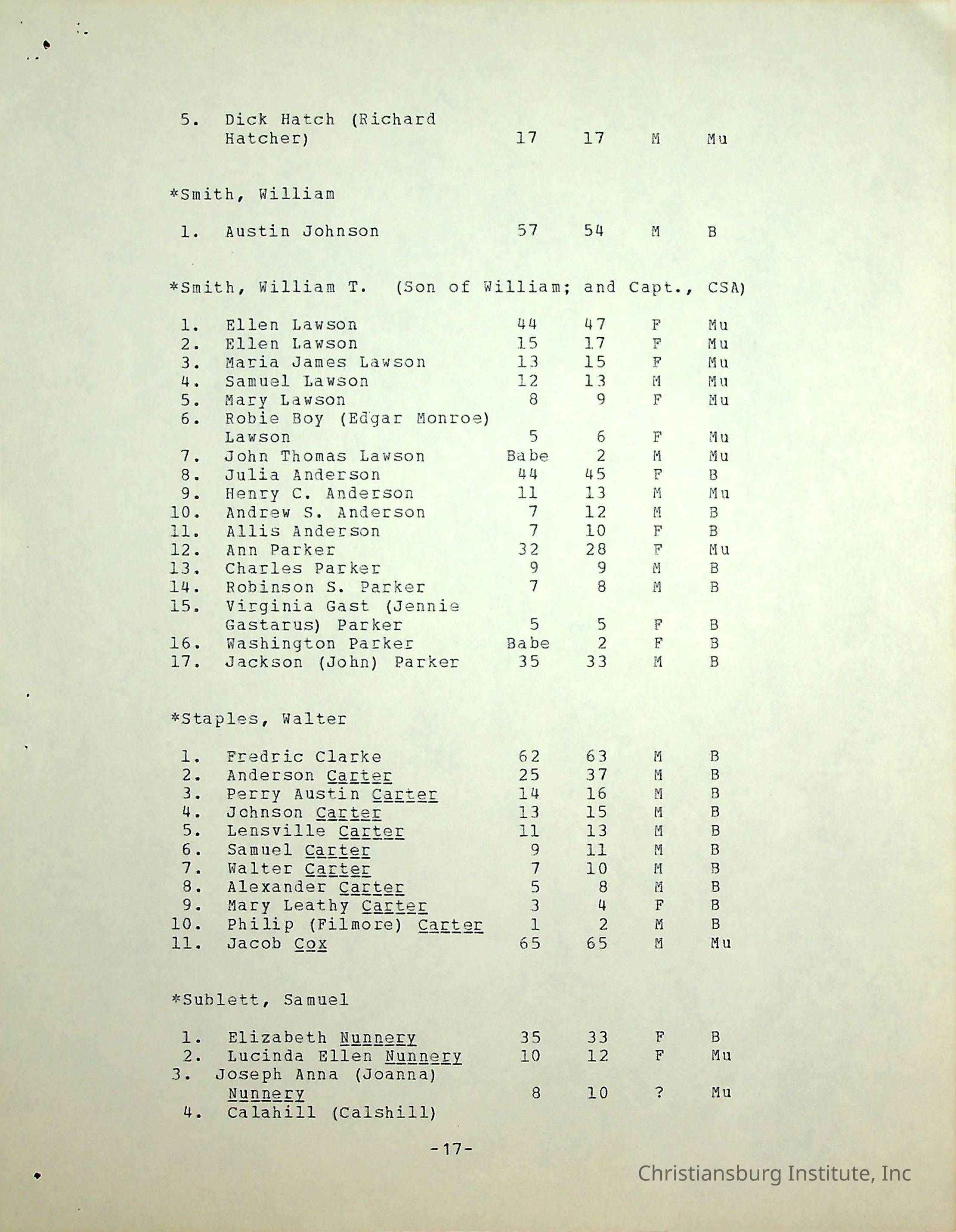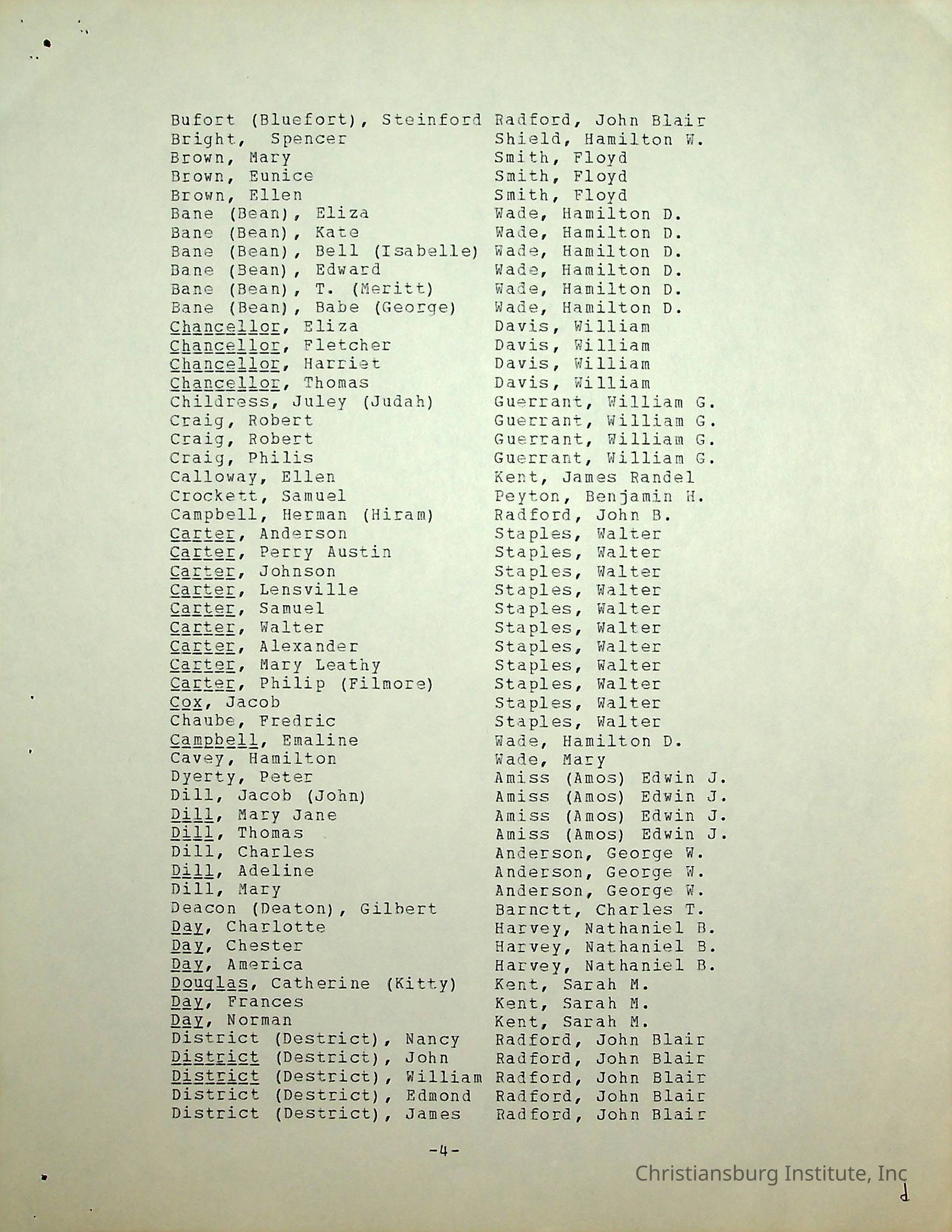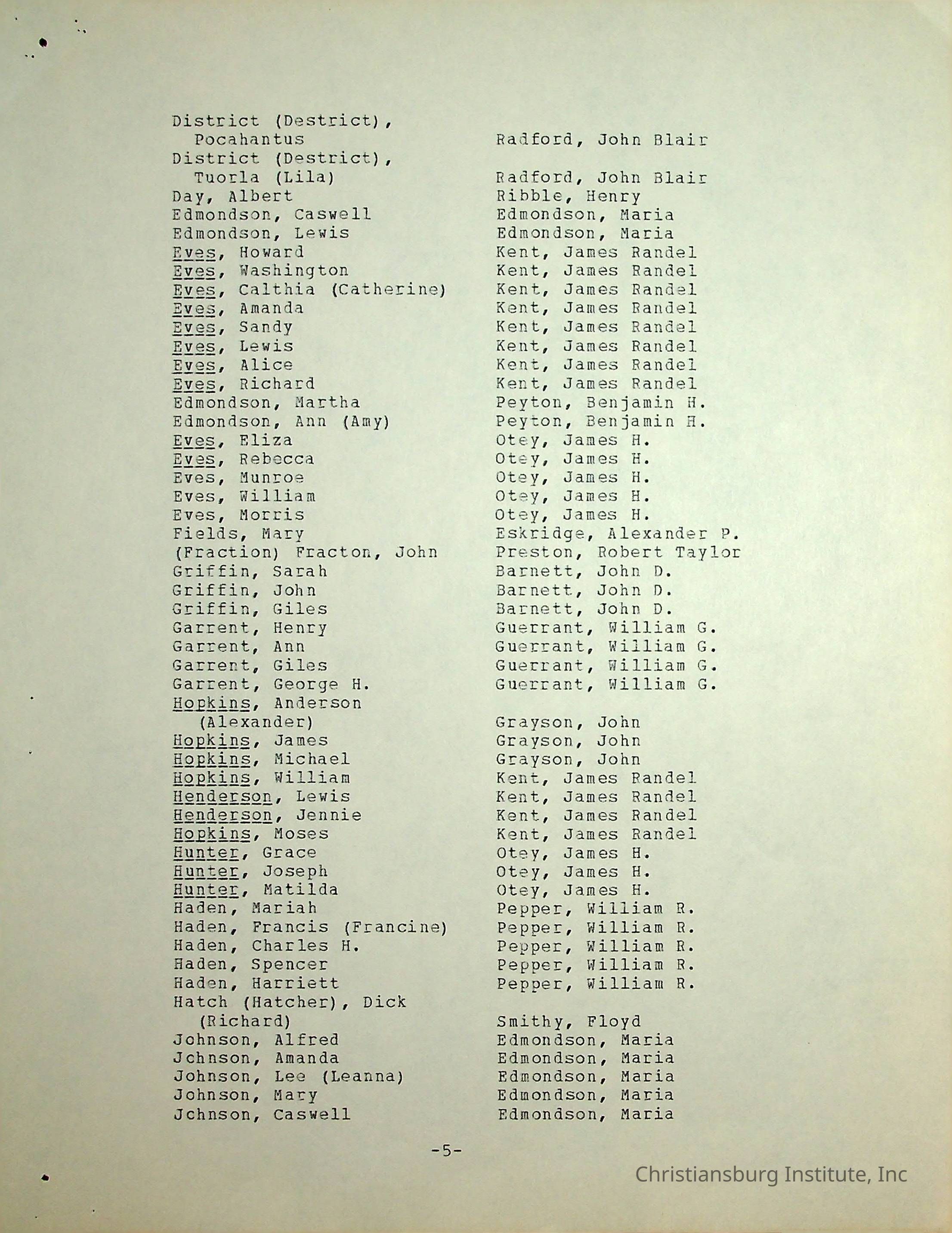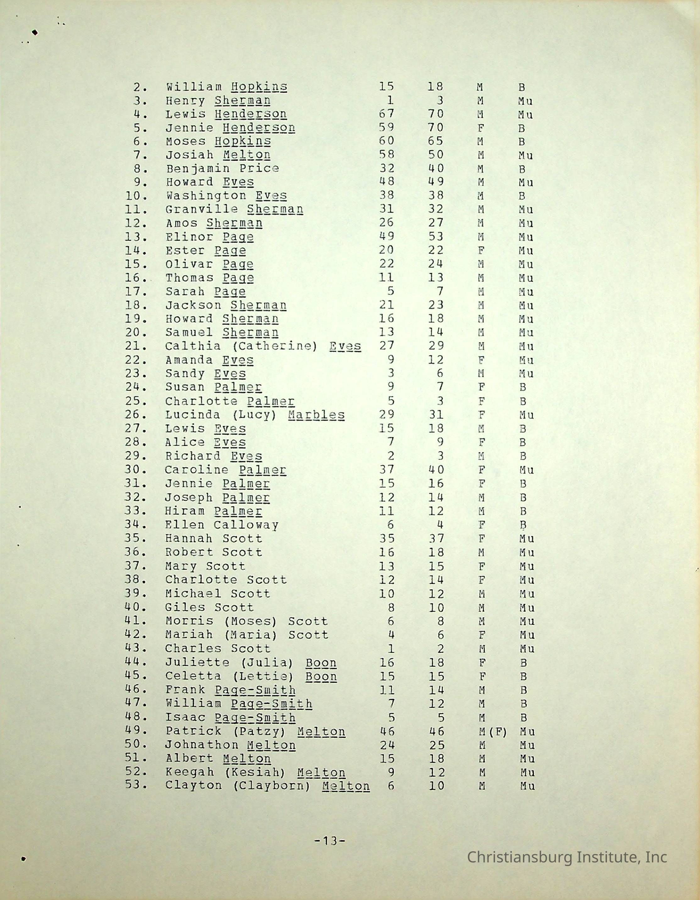 The "Freedmen Identifiers," a discussion draft of a community development study by Richard B. Dickenson for the Ad Hoc Committee for Christiansburg Industrial Institute Historical Landmark Designation, dated December 10th, 1977. This paper contains names, ages, and owners of enslaved peoples in Montgomery County, Virginia from the 1860s.Collection