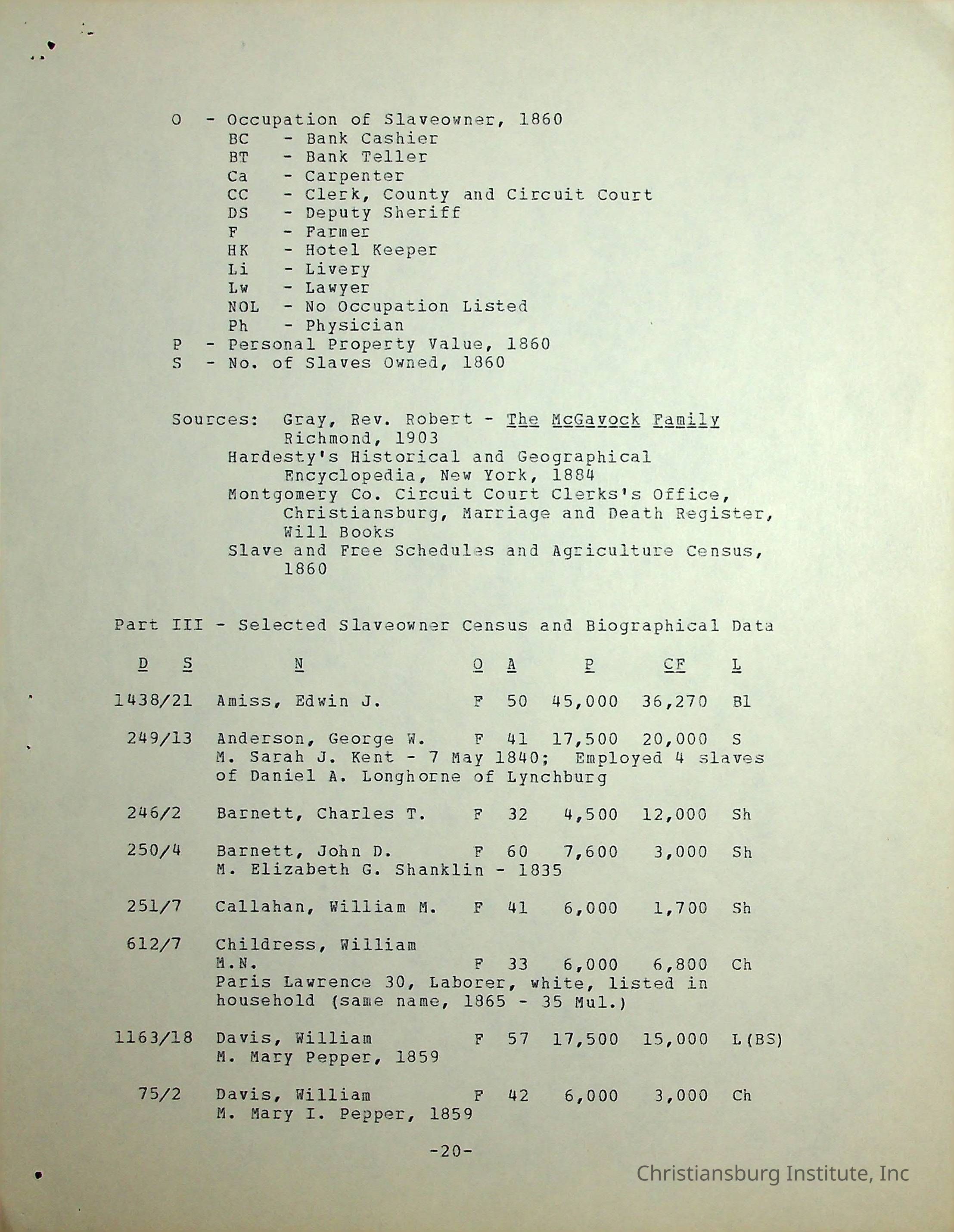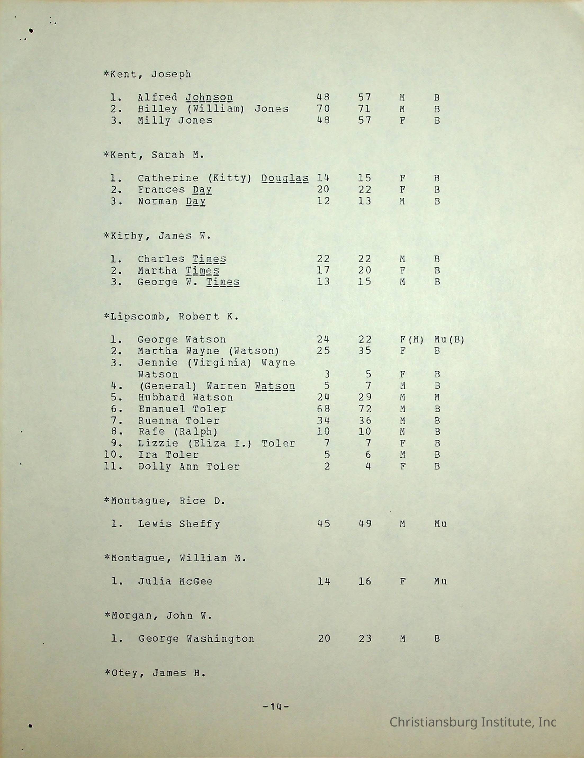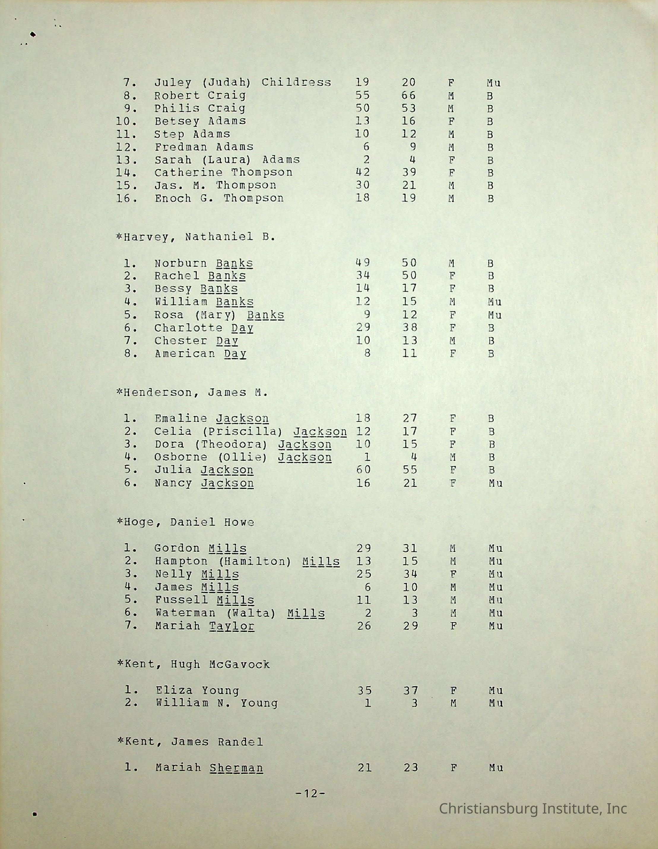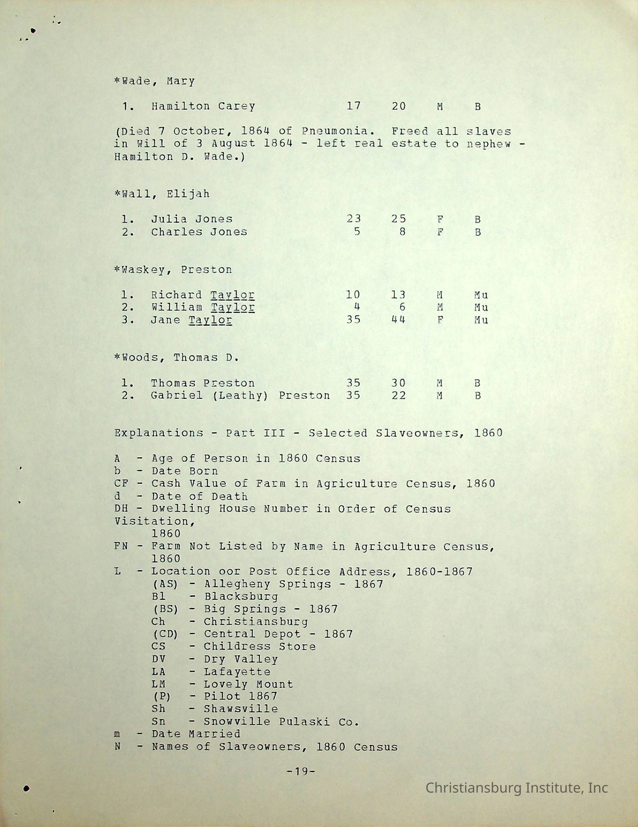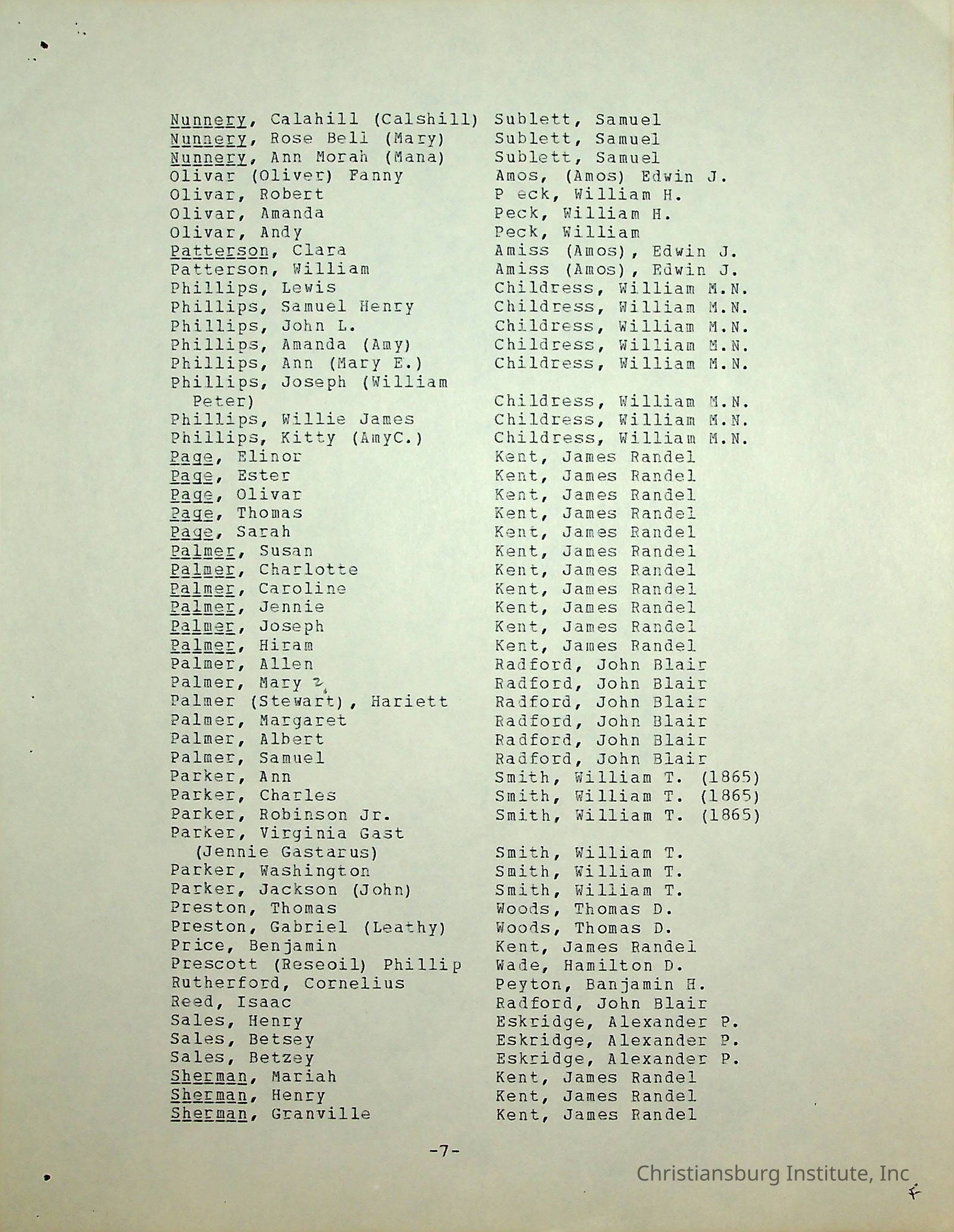 The "Freedmen Identifiers," a discussion draft of a community development study by Richard B. Dickenson for the Ad Hoc Committee for Christiansburg Industrial Institute Historical Landmark Designation, dated December 10th, 1977. This paper contains names, ages, and owners of enslaved peoples in Montgomery County, Virginia from the 1860s.Collection