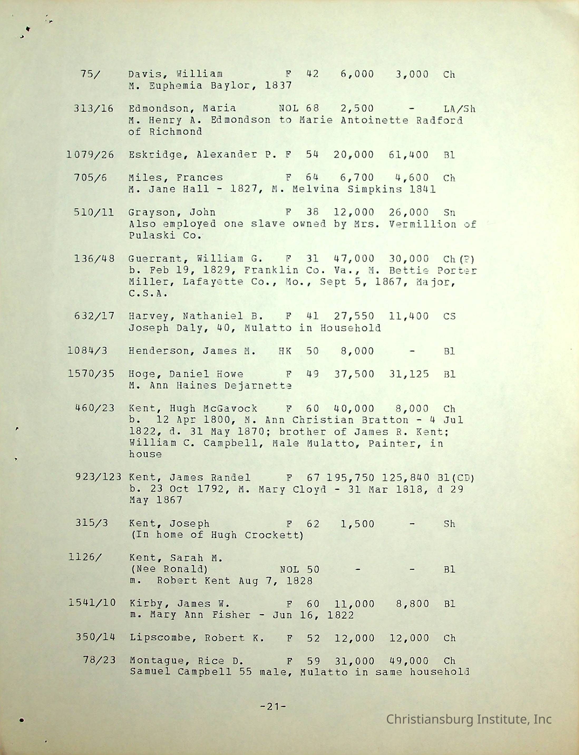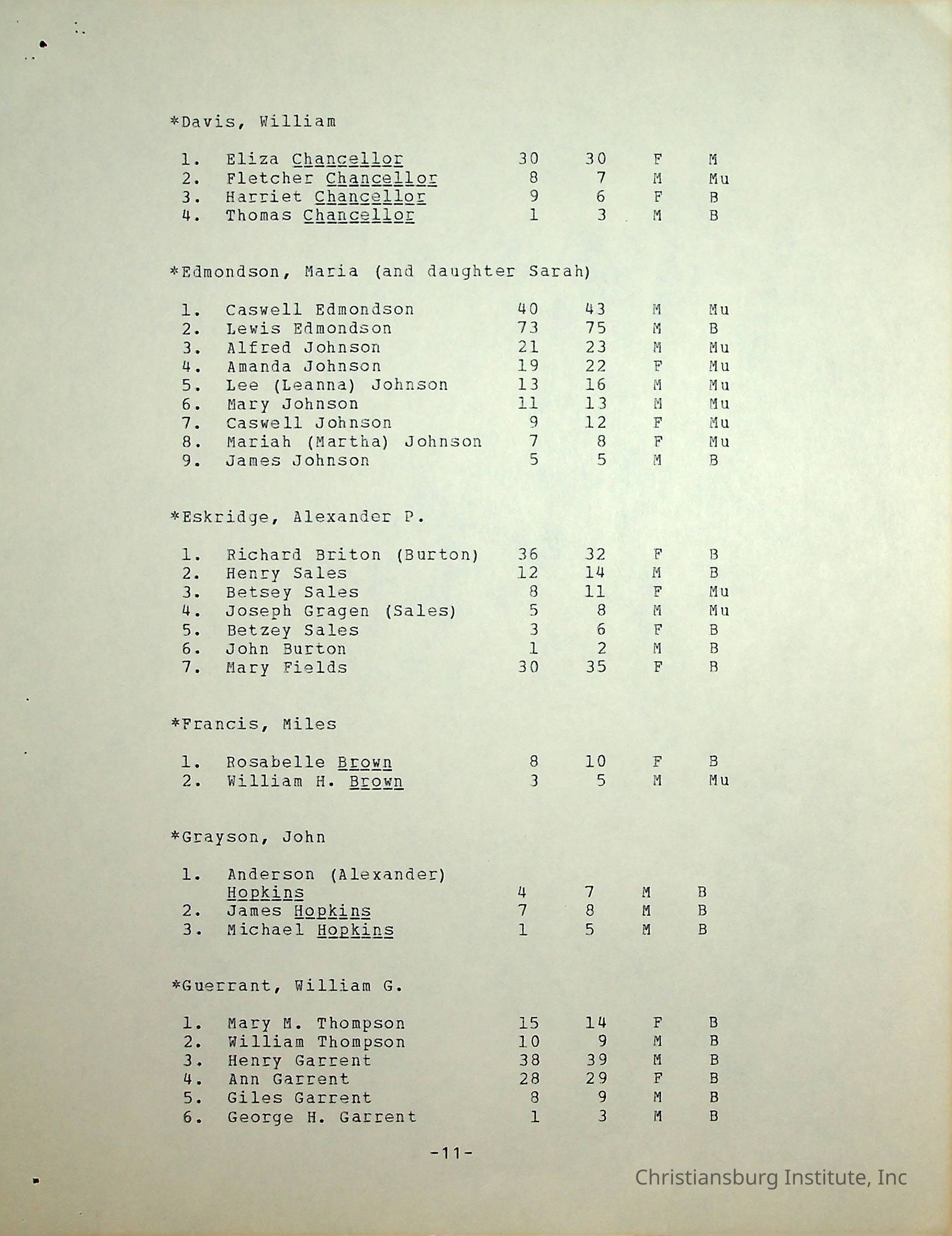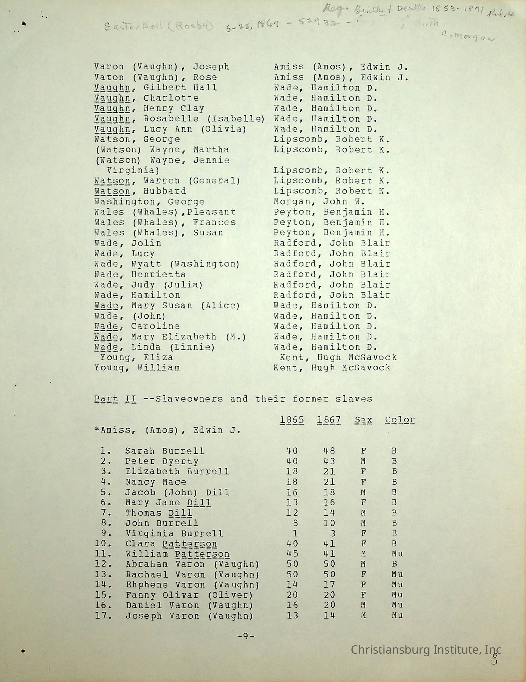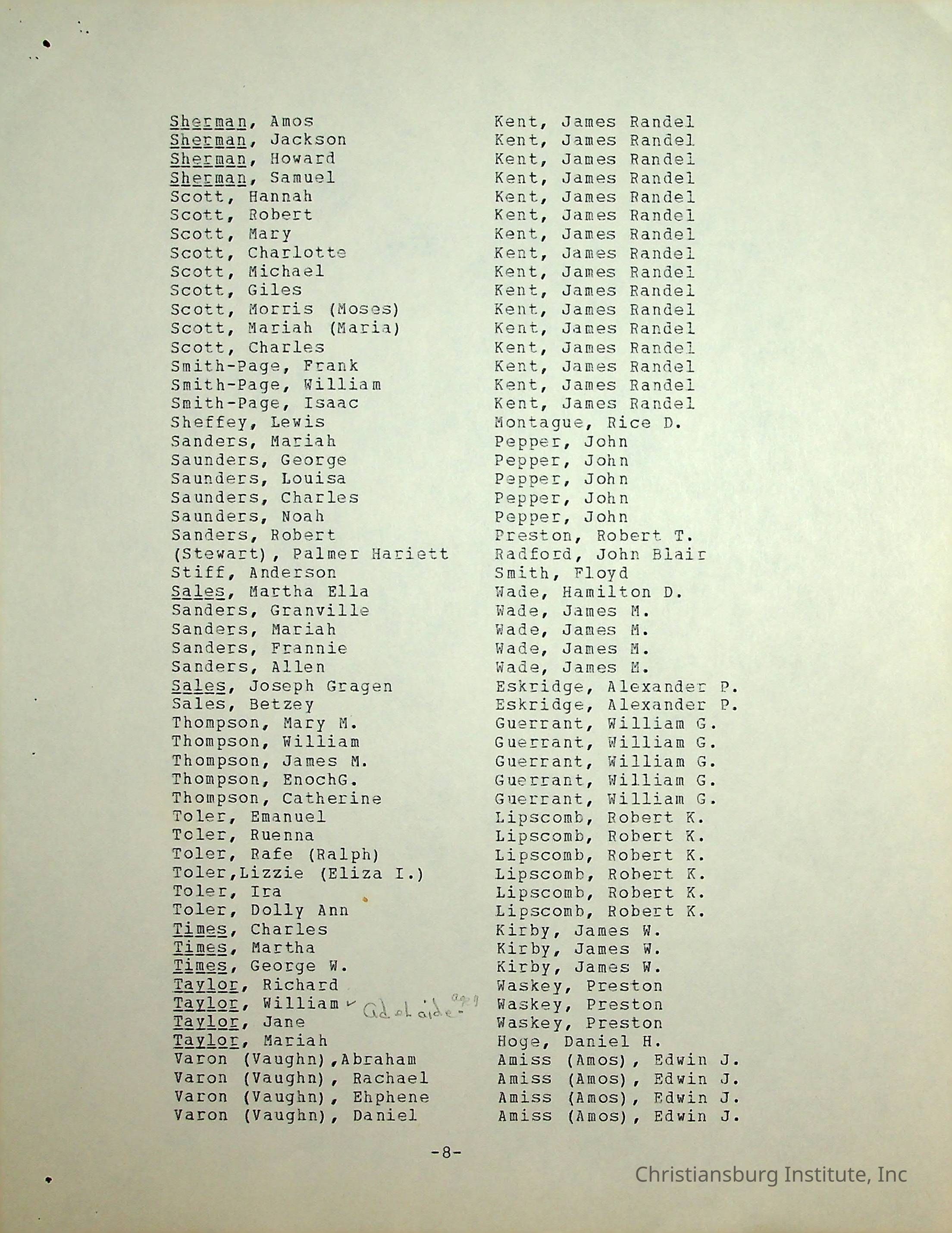 The "Freedmen Identifiers," a discussion draft of a community development study by Richard B. Dickenson for the Ad Hoc Committee for Christiansburg Industrial Institute Historical Landmark Designation, dated December 10th, 1977. This paper contains names, ages, and owners of enslaved peoples in Montgomery County, Virginia from the 1860s.Collection