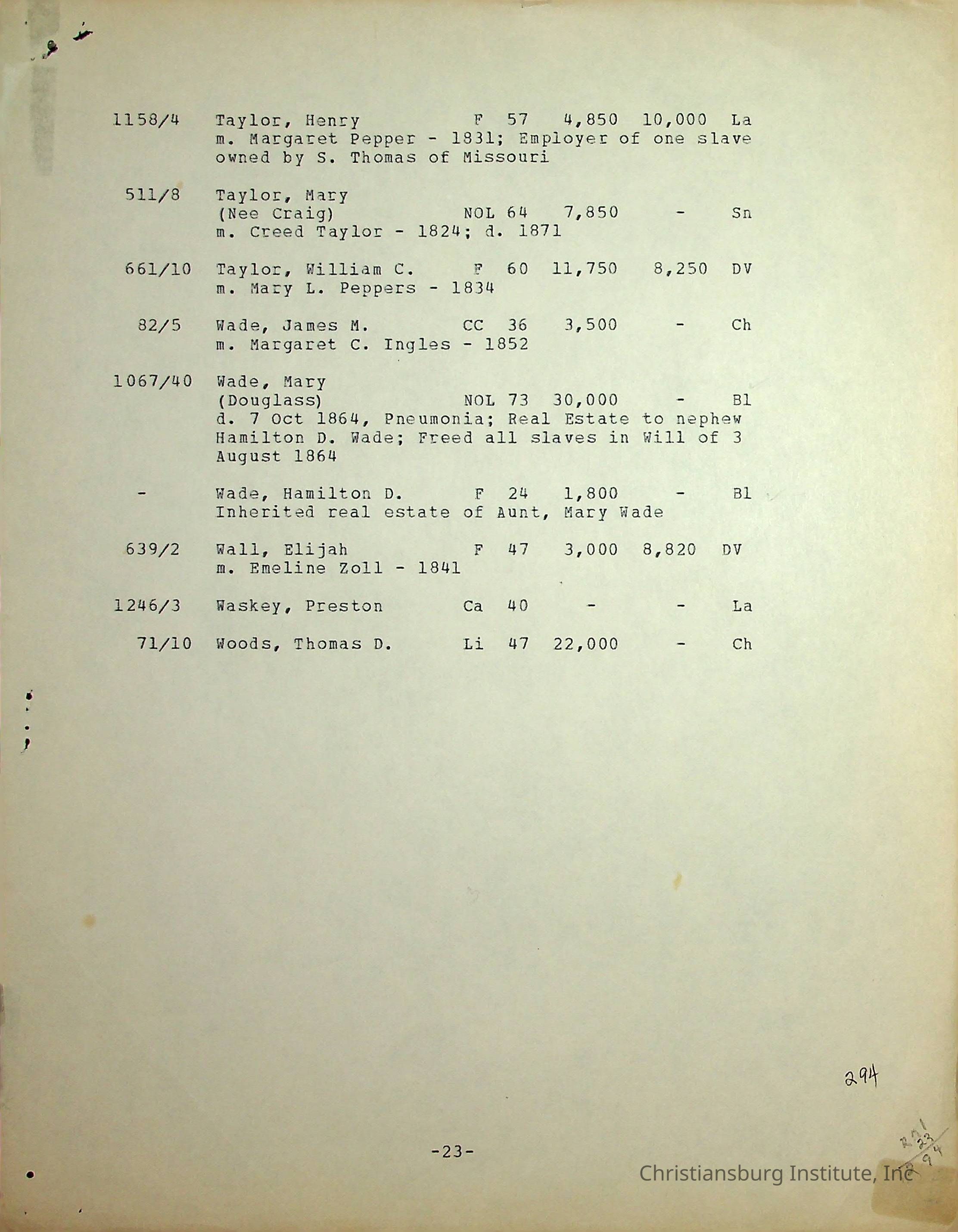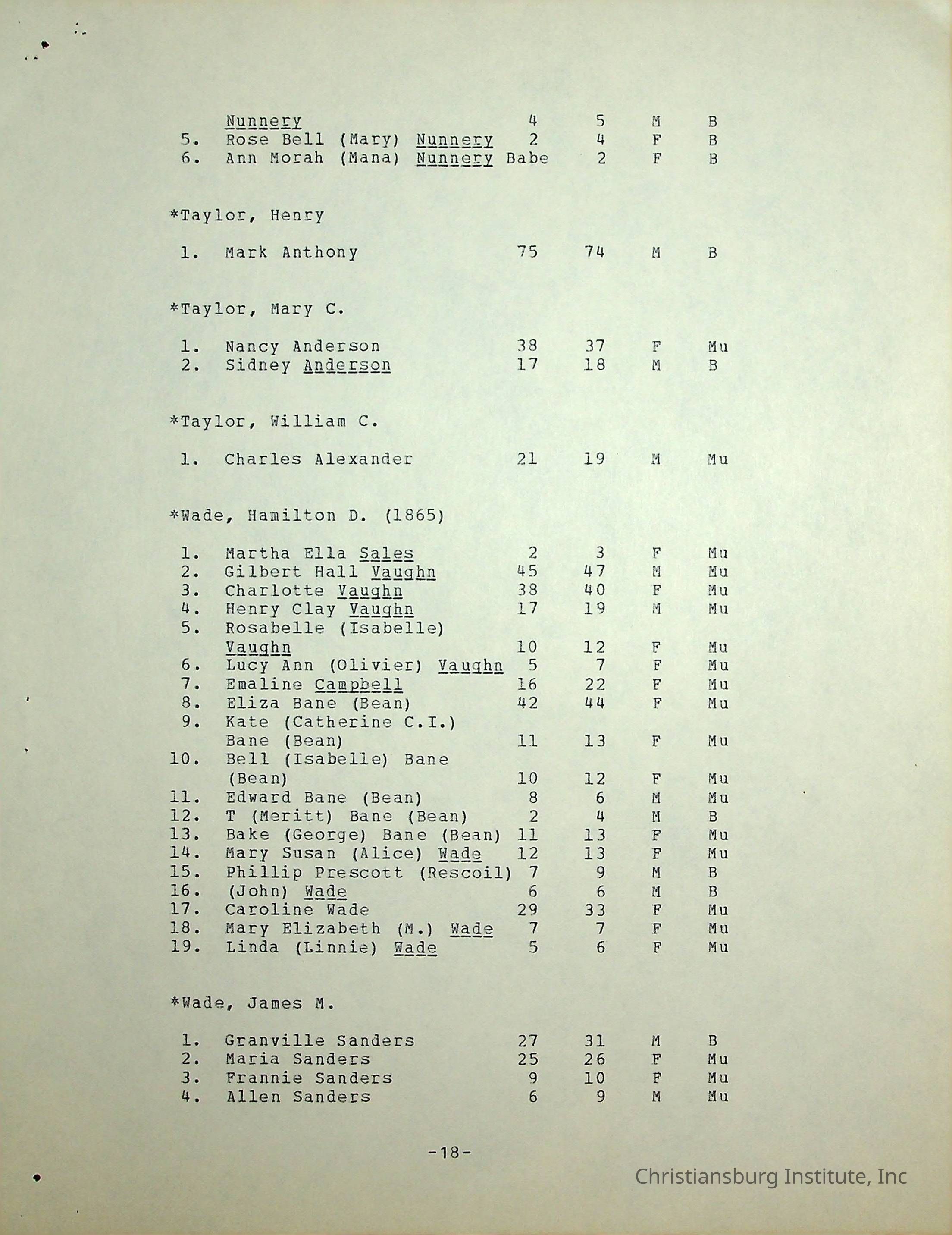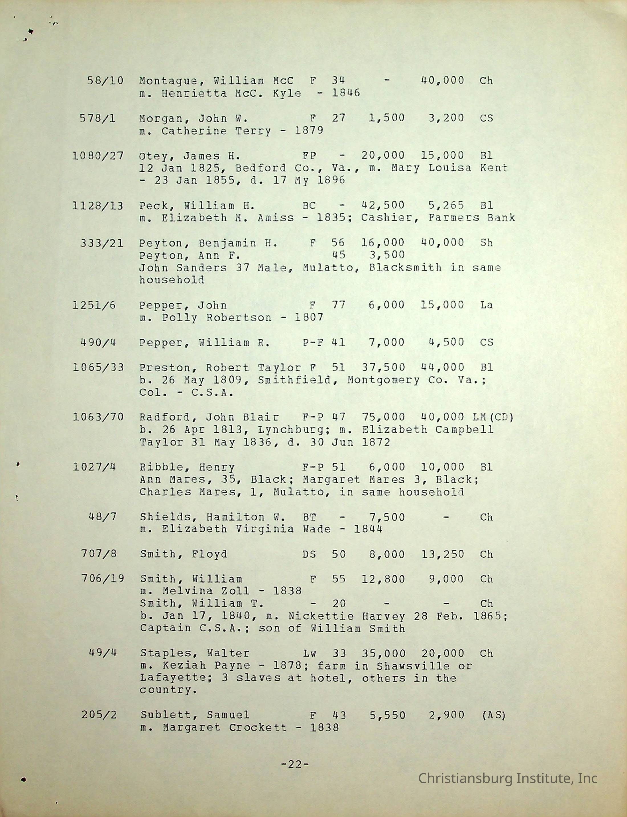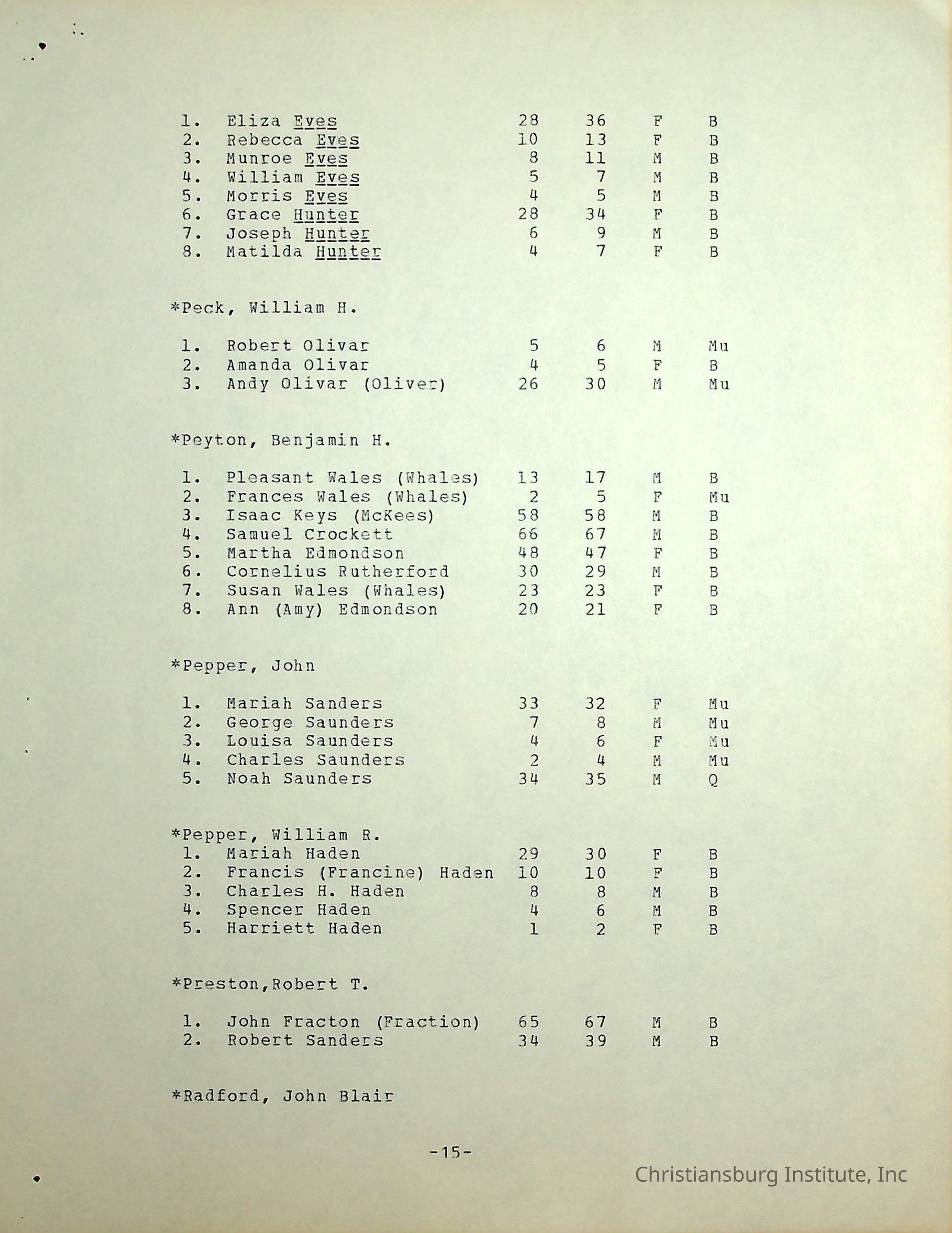The "Freedmen Identifiers," a discussion draft of a community development study by Richard B. Dickenson for the Ad Hoc Committee for Christiansburg Industrial Institute Historical Landmark Designation, dated December 10th, 1977. This paper contains names, ages, and owners of enslaved peoples in Montgomery County, Virginia from the 1860s.Collection
