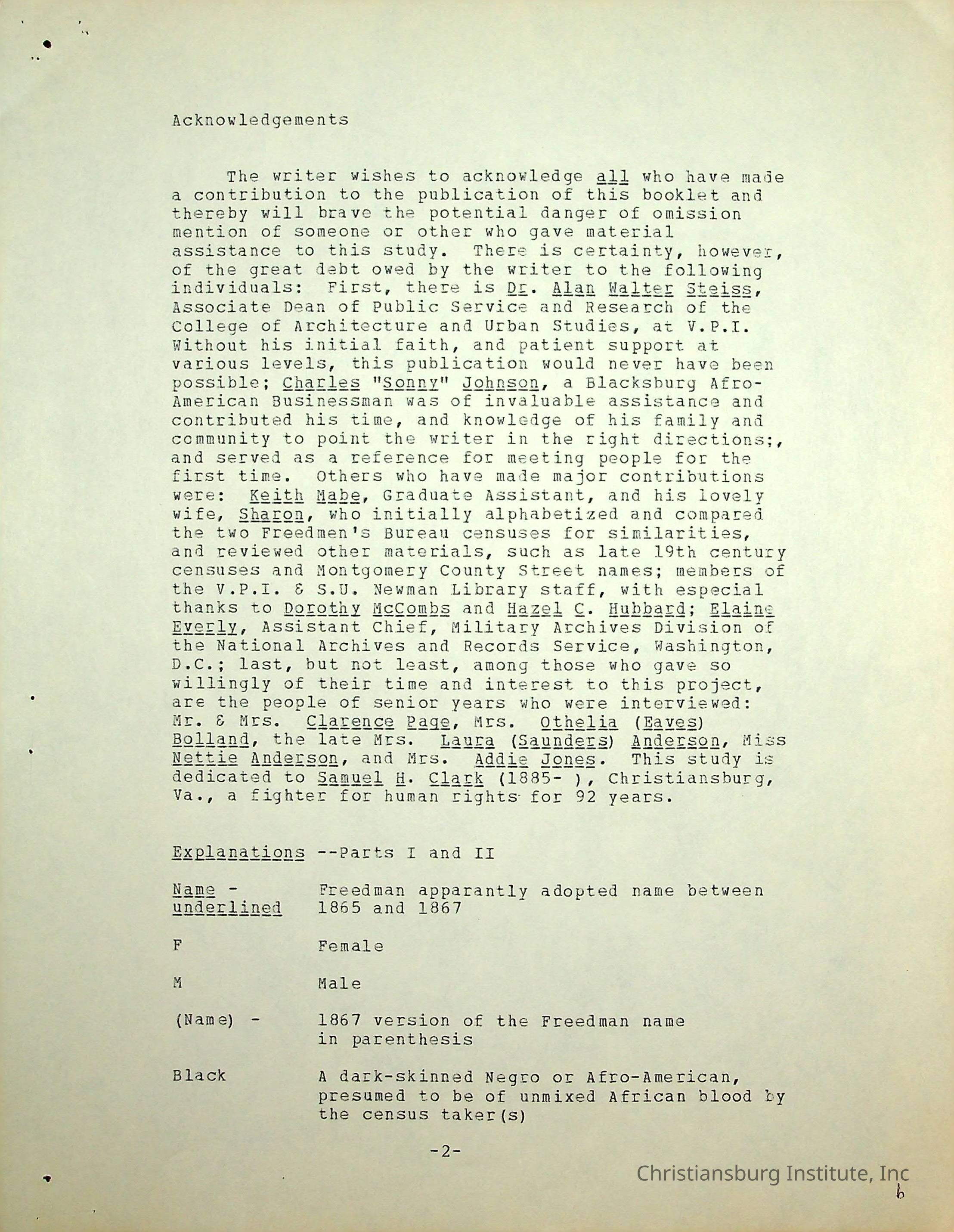 "Freedmen Identifiers," Ad Hoc Committee for Christiansburg Industrial Institute Historical Landmark Designation, Linda Killen 1977Description