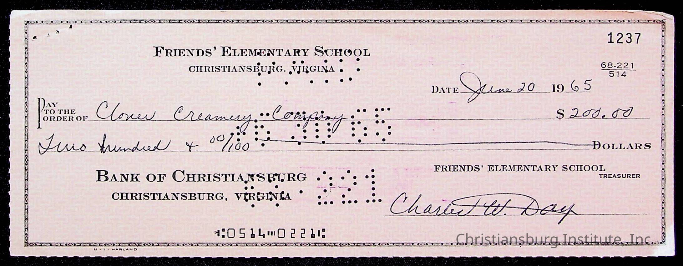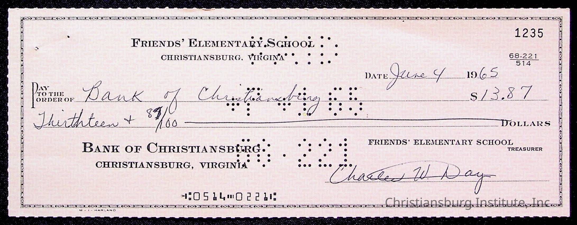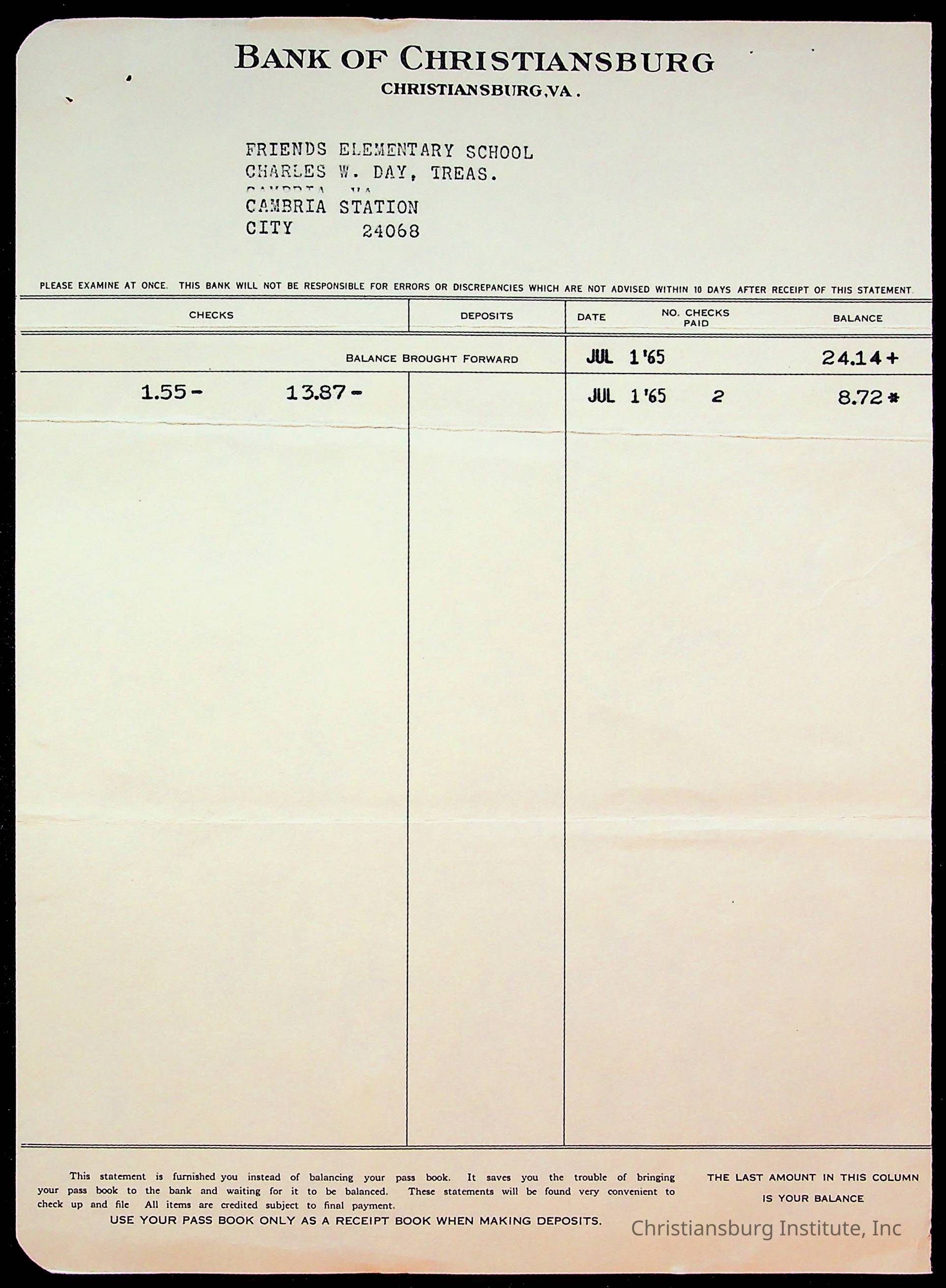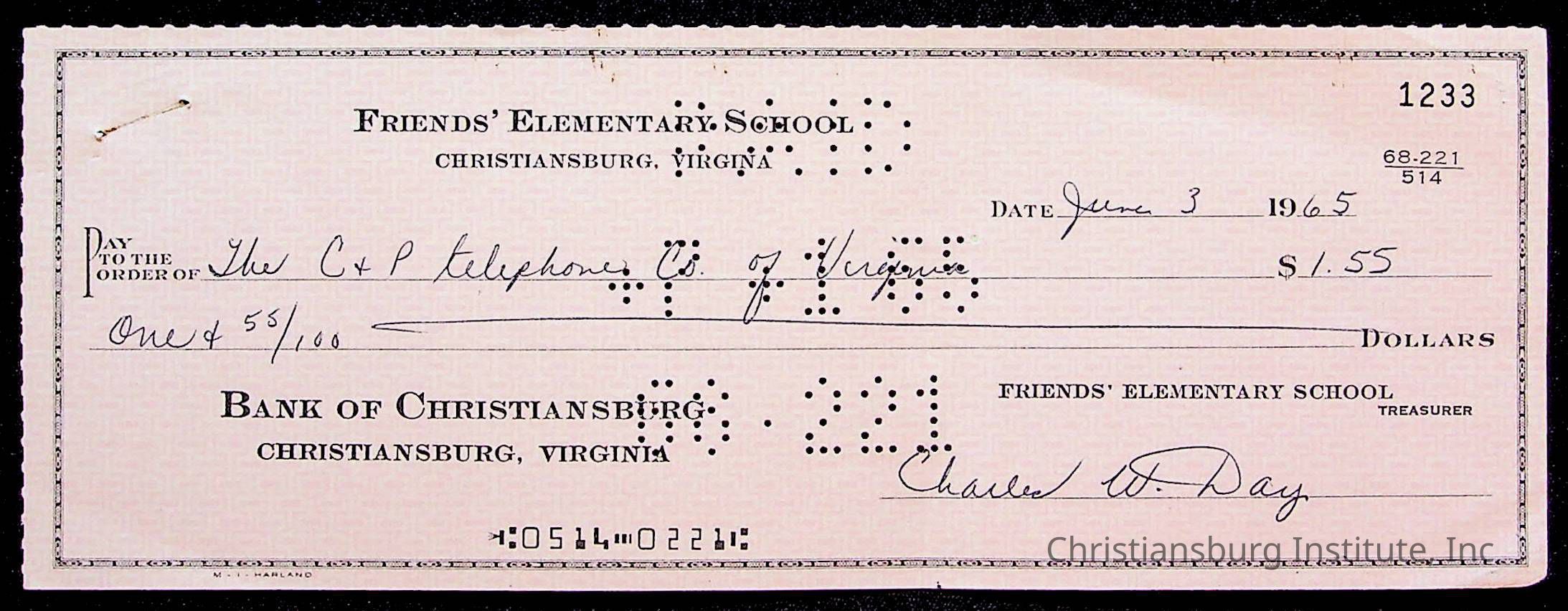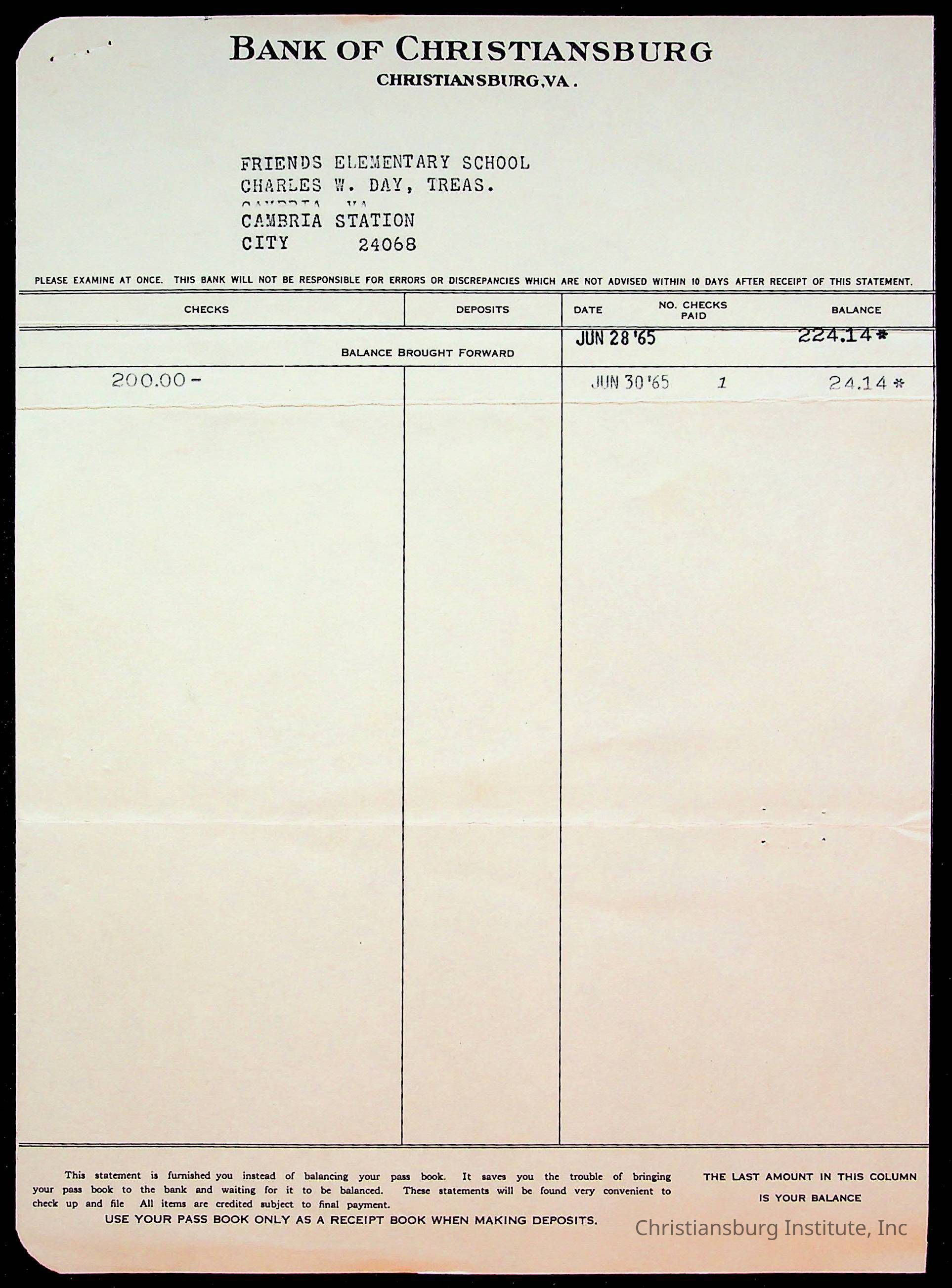 An archive of various financial documents including; bills, receipts, checks, and ledgers from Friends Elementary School, dated 1965.Collection